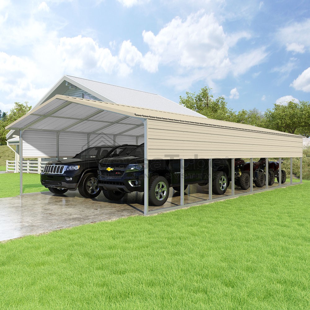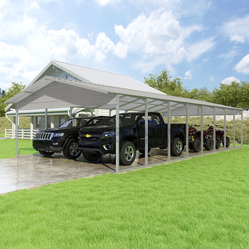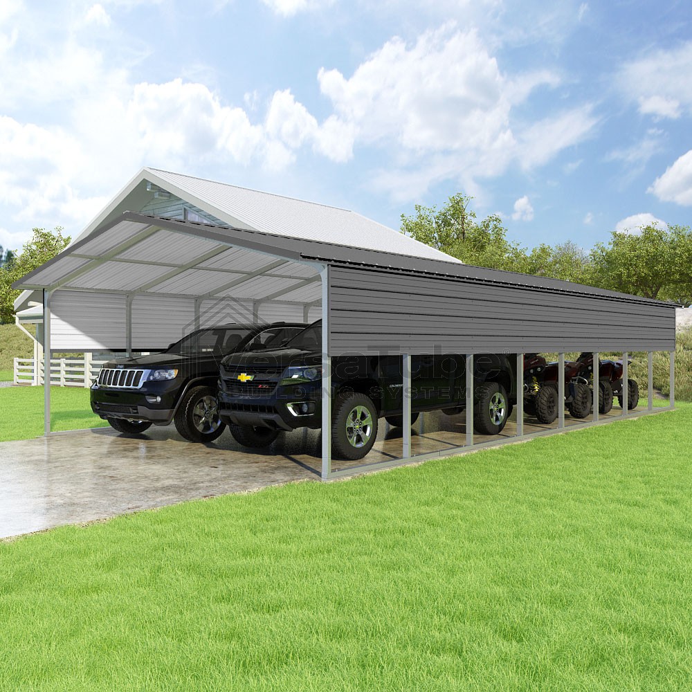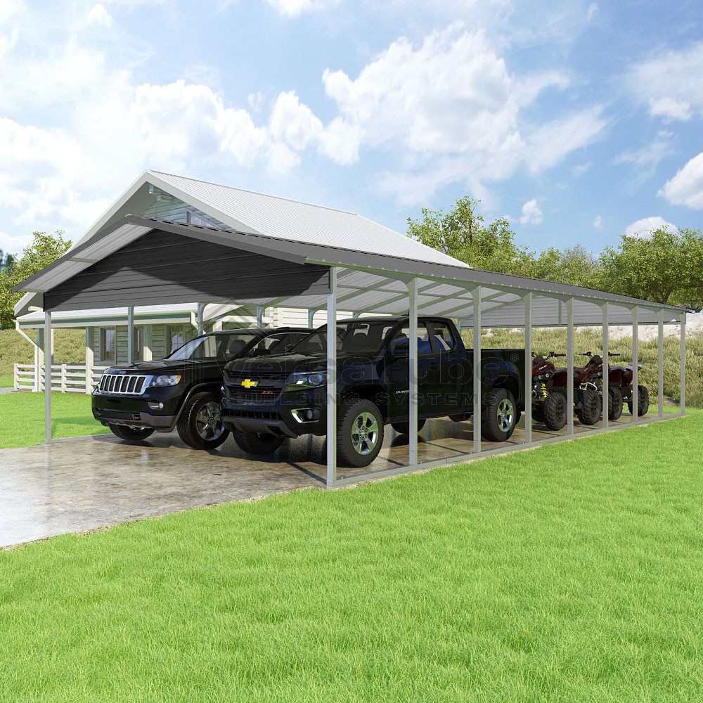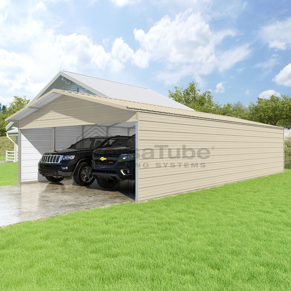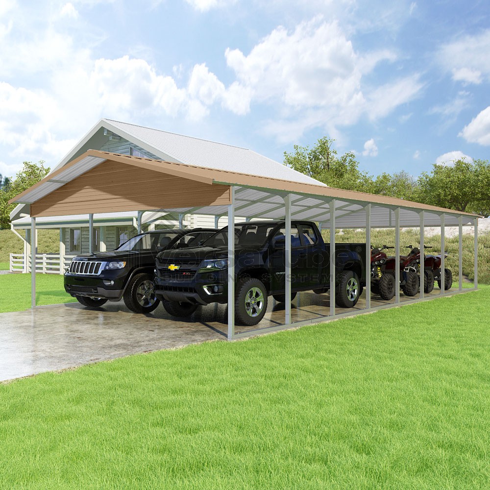 Pinnacle Series DIY carport kit features vertical sheet metal roof panels with ridge cap, gable and eave trim for an A-frame roof style and extended coverage on both ends.