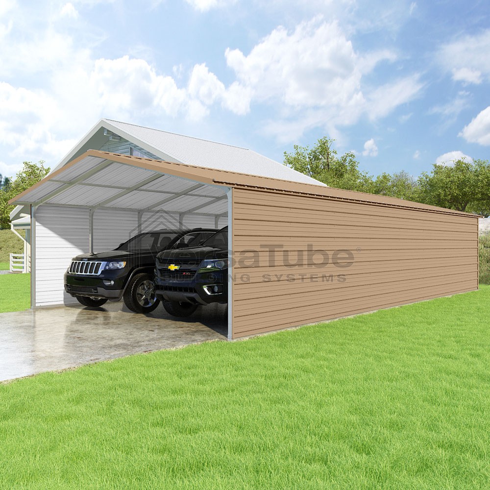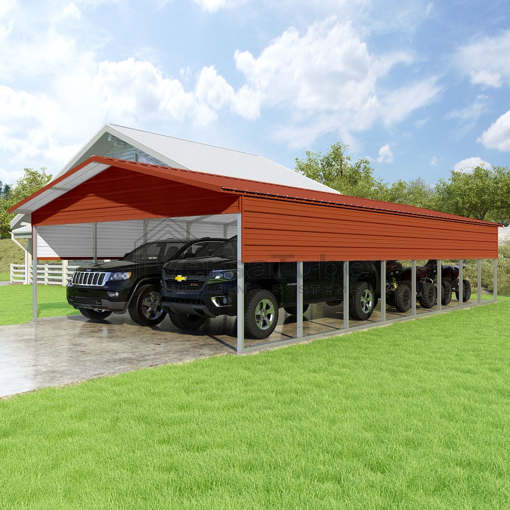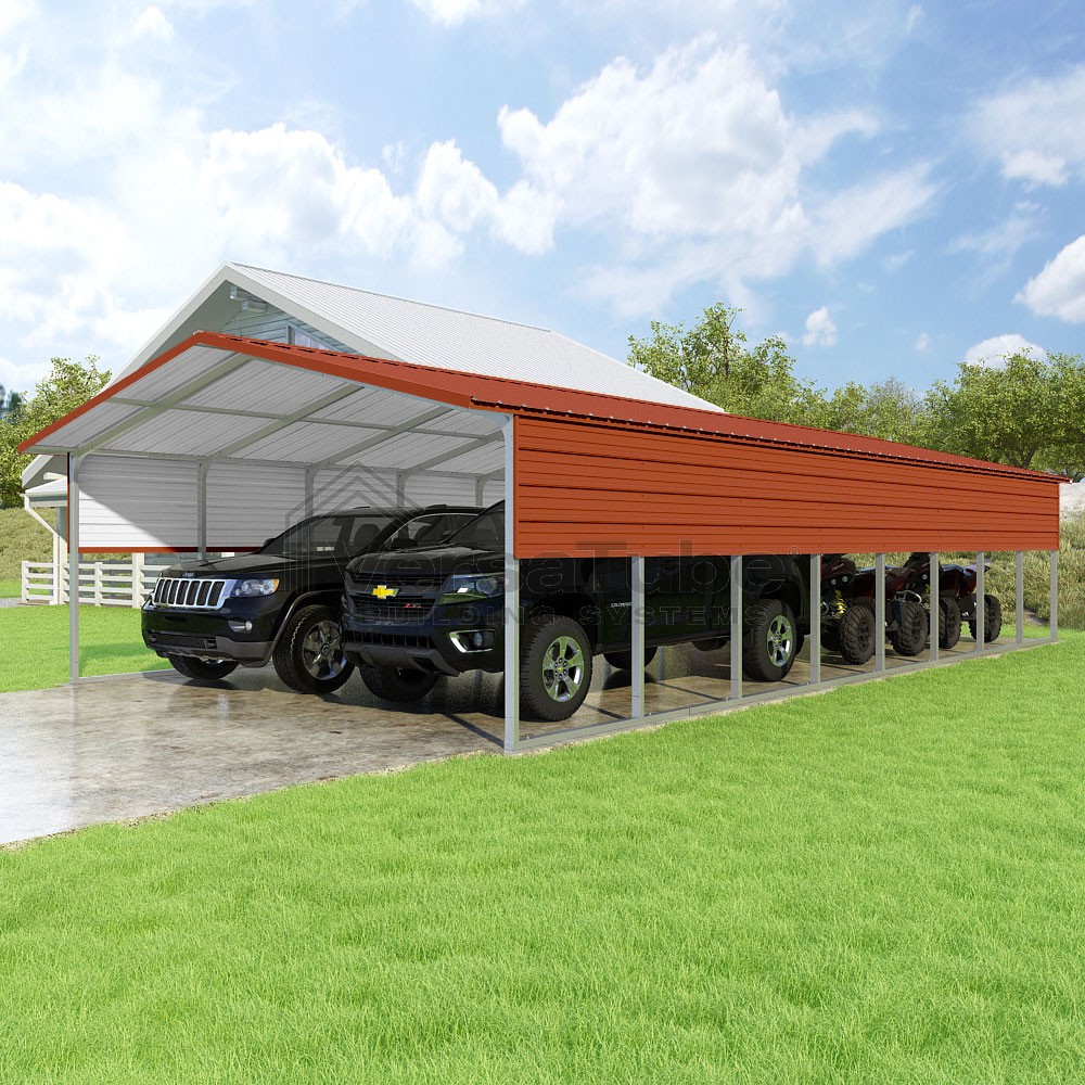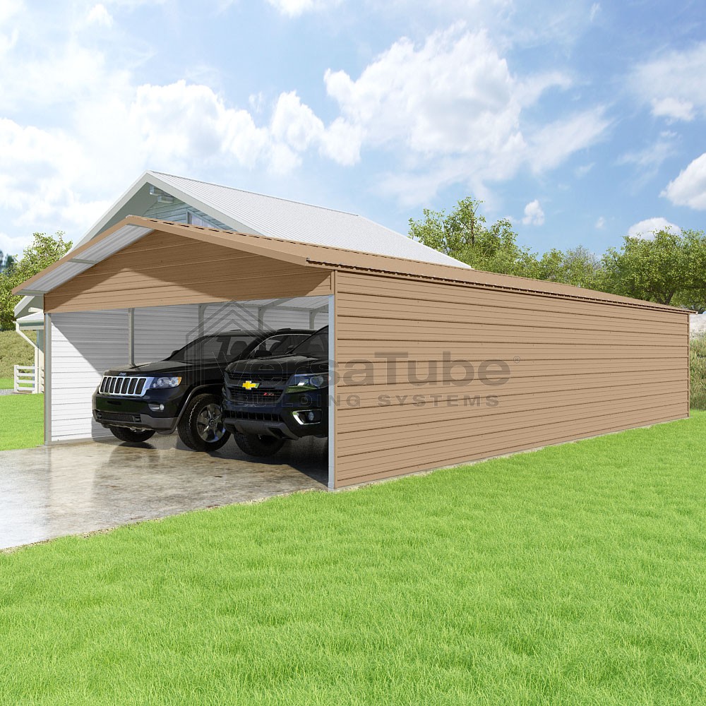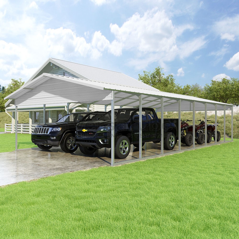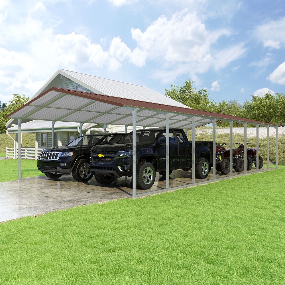 Pinnacle Series DIY carport kit features vertical sheet metal roof panels with ridge cap, gable and eave trim for an A-frame roof style and extended coverage on both ends.