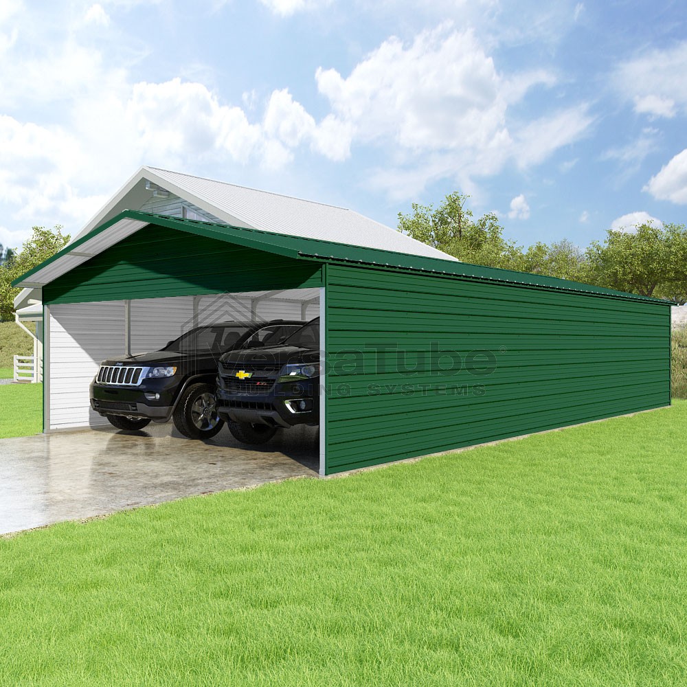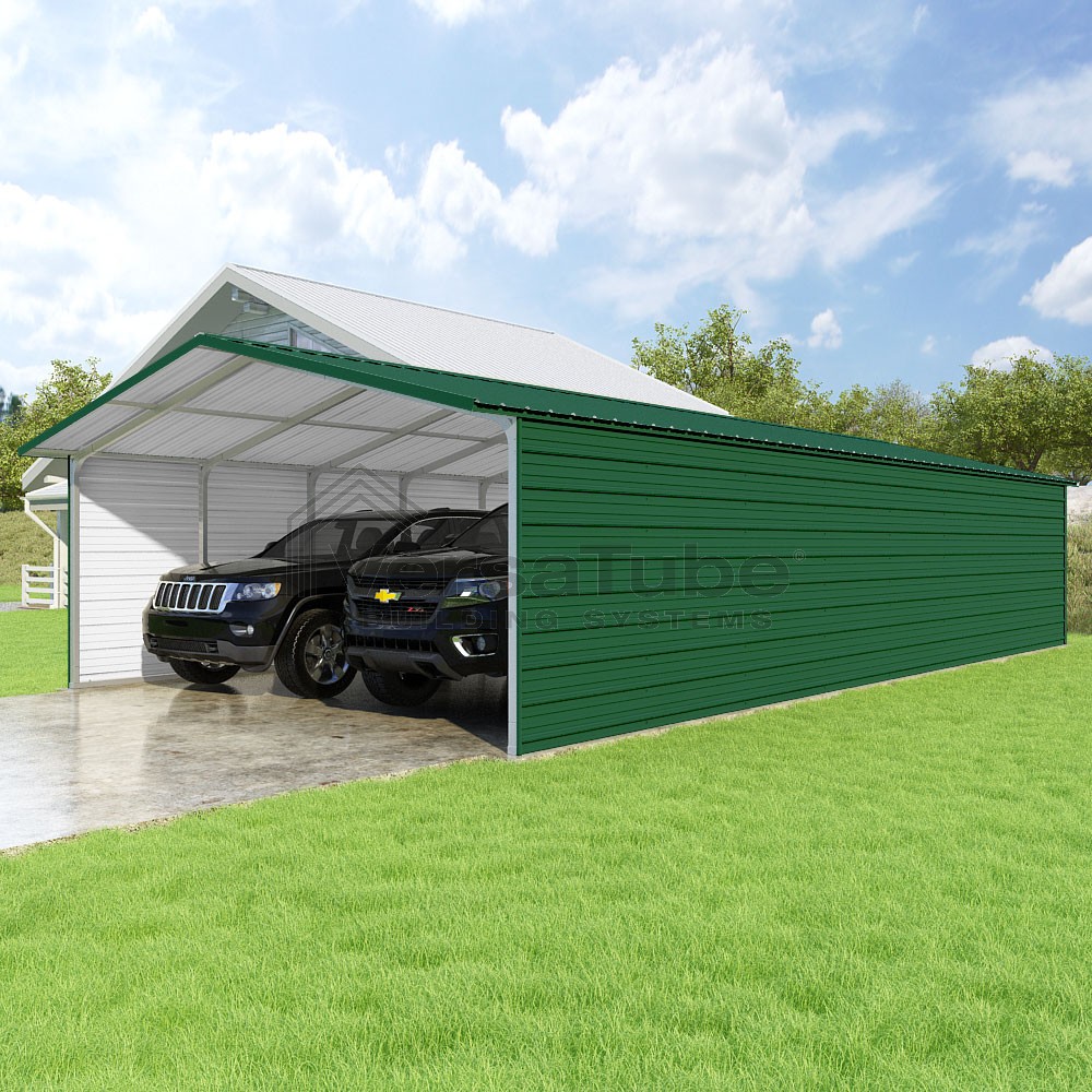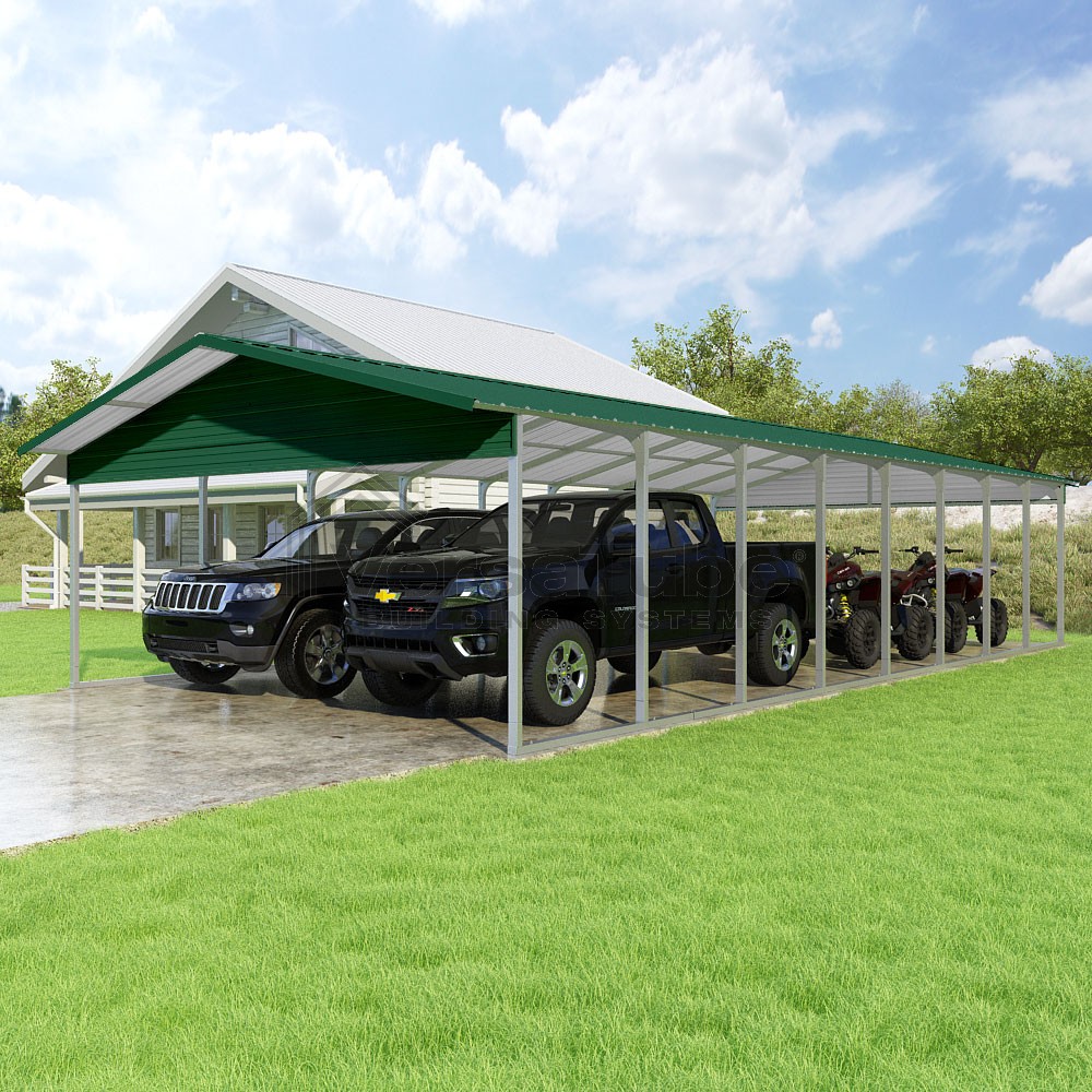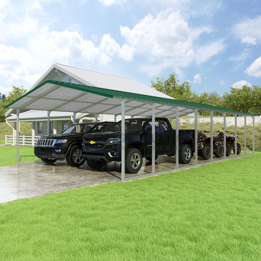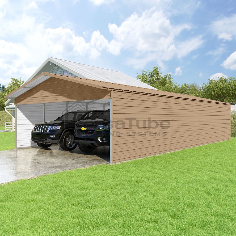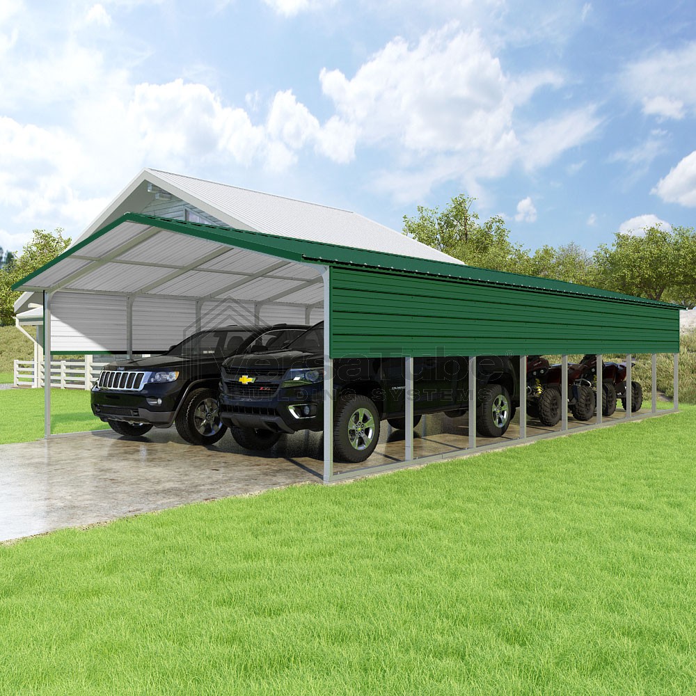 Pinnacle Series DIY carport kit features vertical sheet metal roof panels with ridge cap, gable and eave trim for an A-frame roof style and extended coverage on both ends.