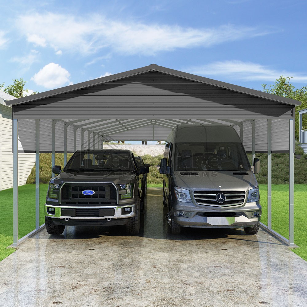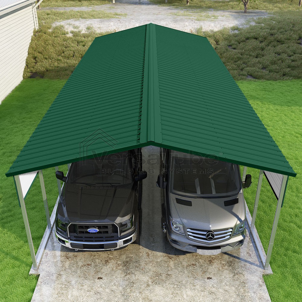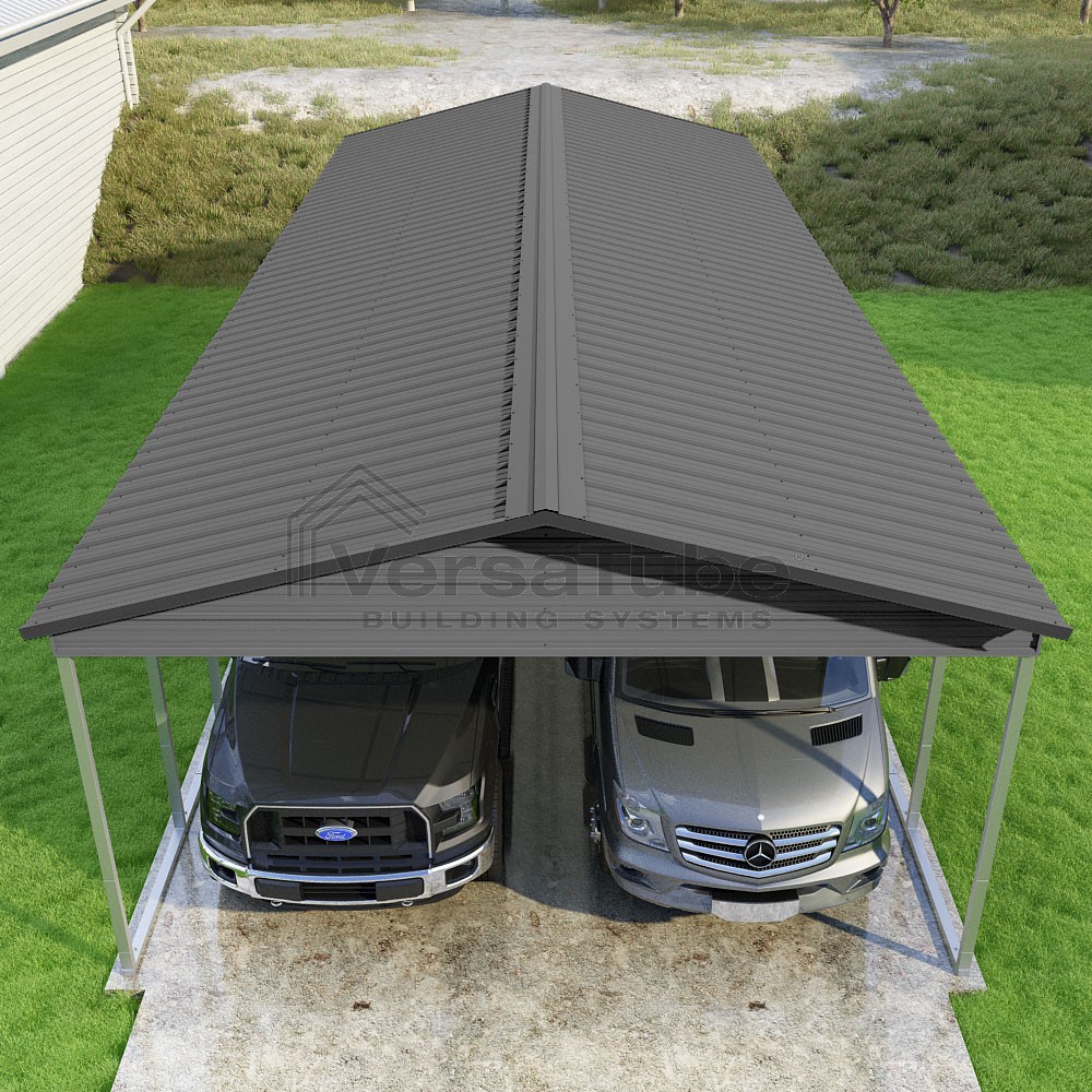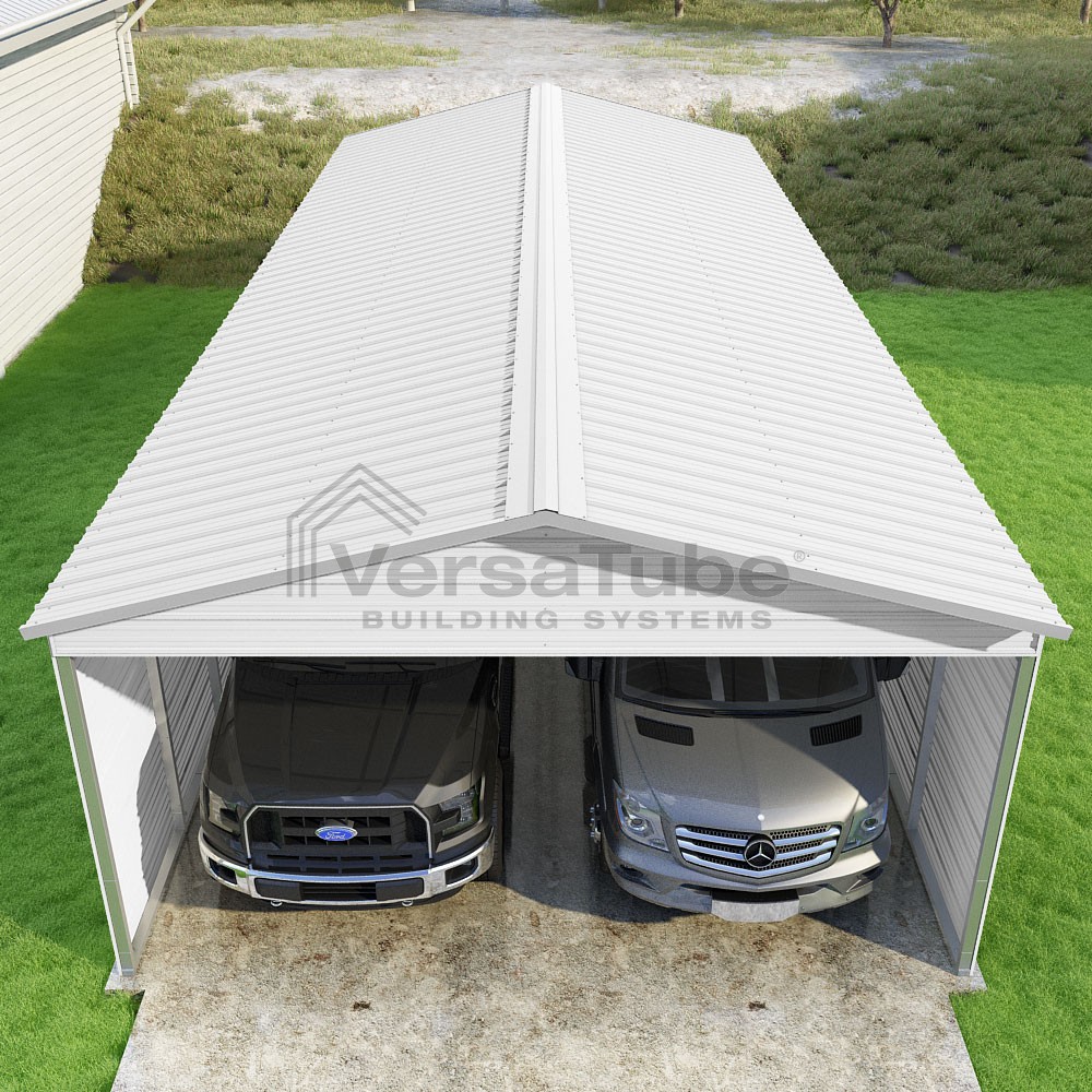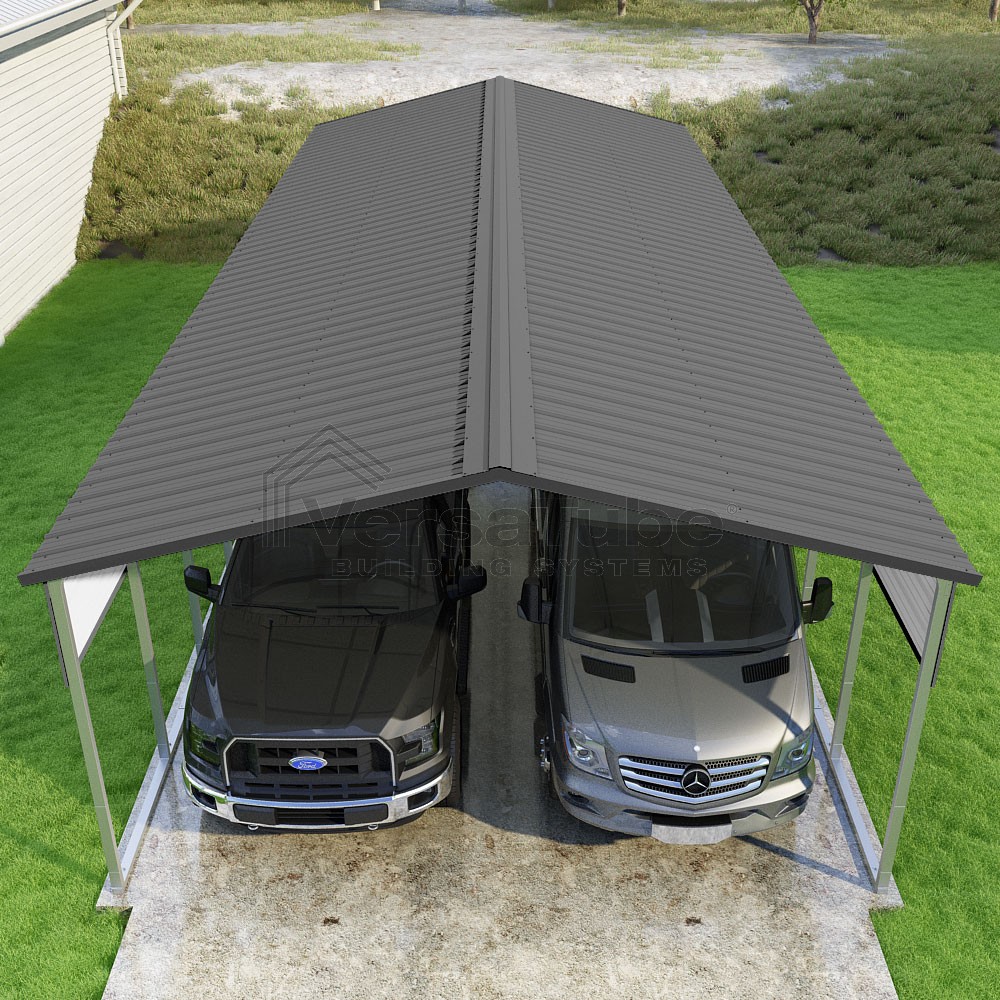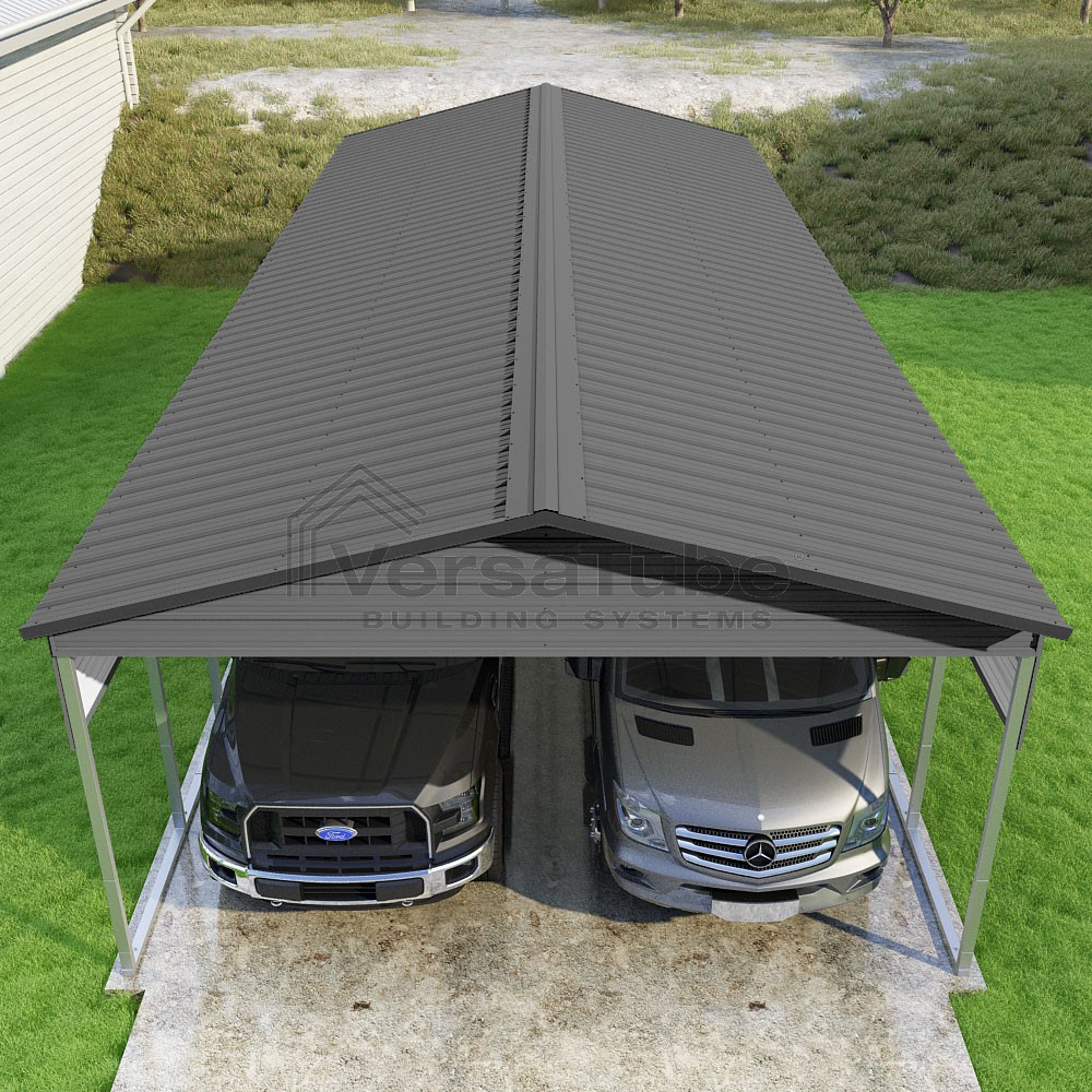 Pinnacle Series DIY carport kit features vertical sheet metal roof panels with ridge cap, gable and eave trim for an A-frame roof style and extended coverage on both ends.
