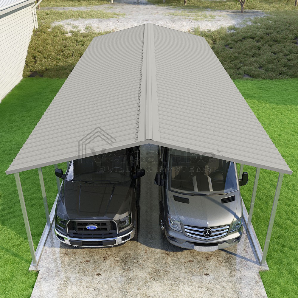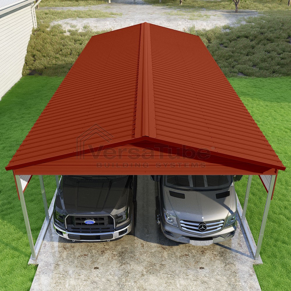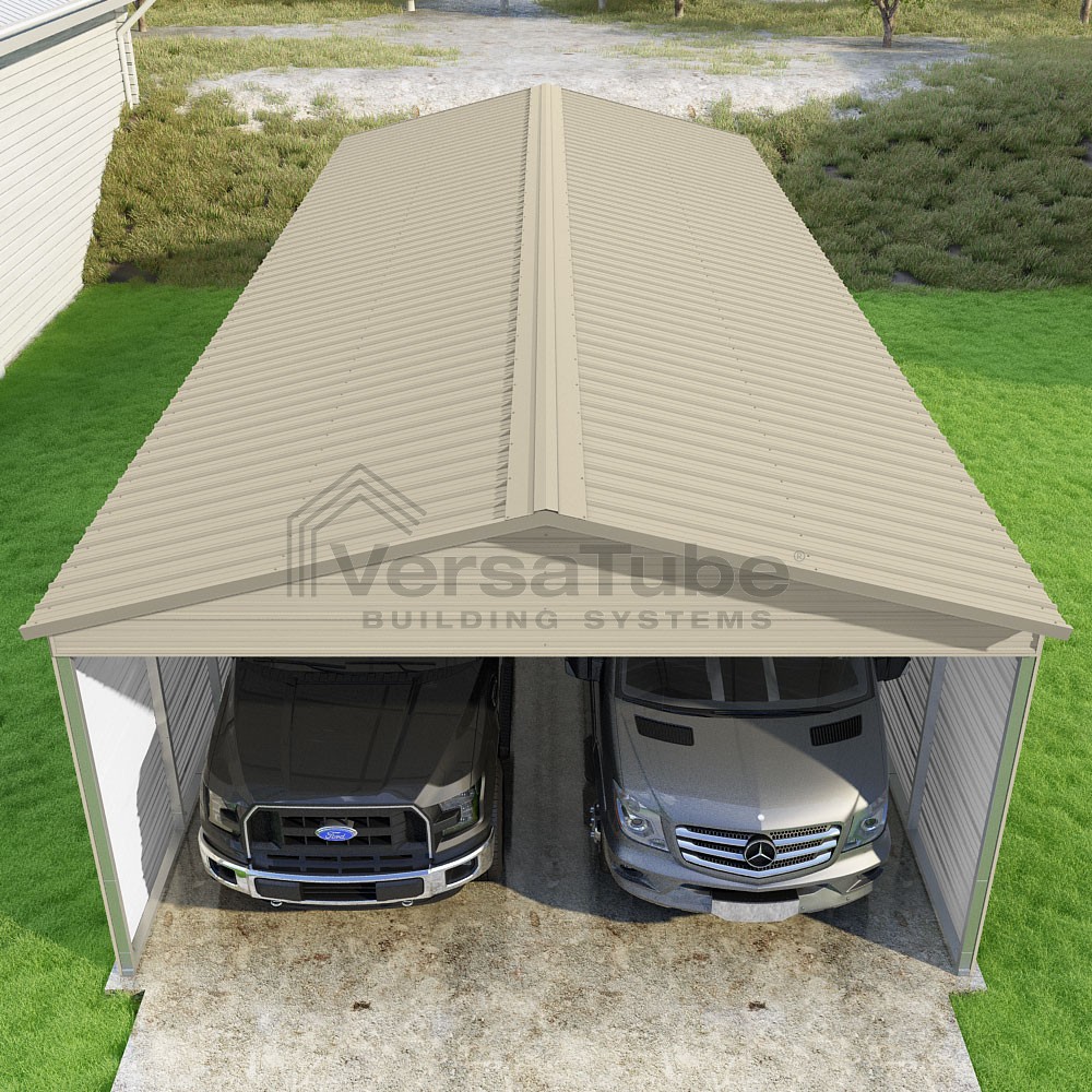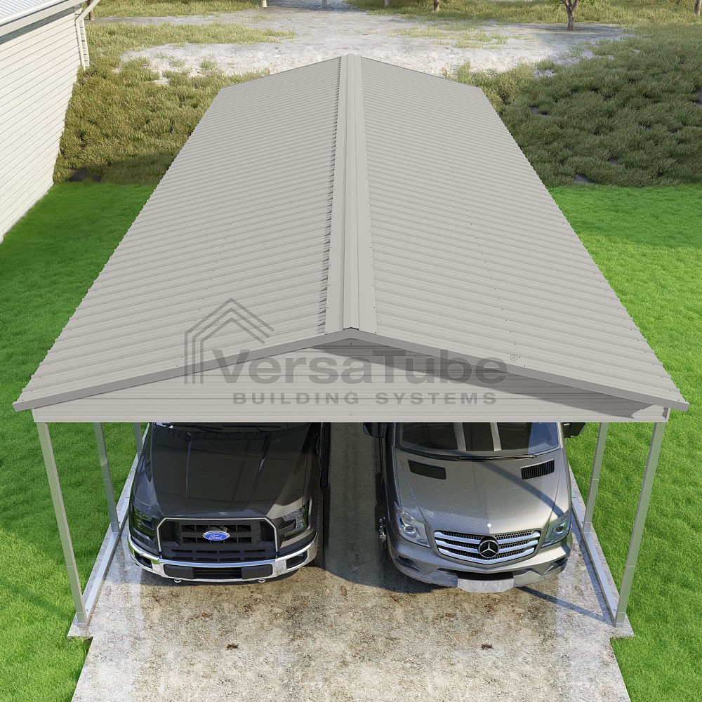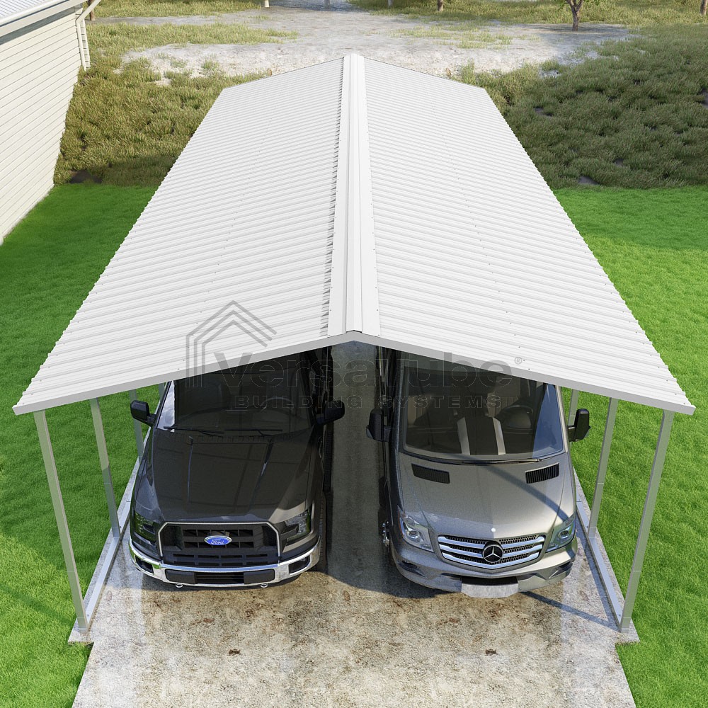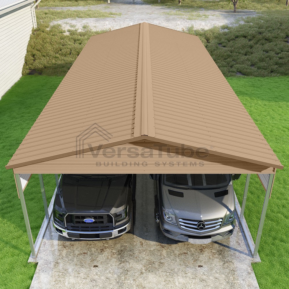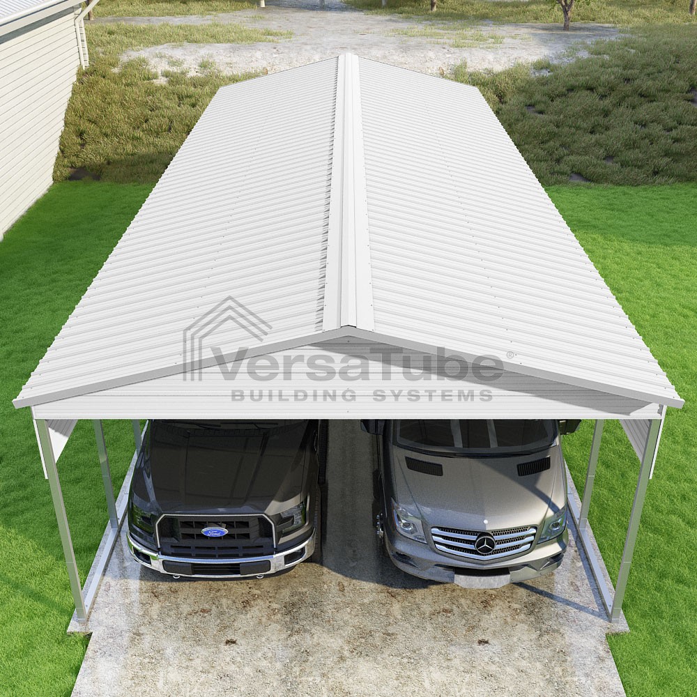 Pinnacle Series DIY carport kit features vertical sheet metal roof panels with ridge cap, gable and eave trim for an A-frame roof style and extended coverage on both ends.