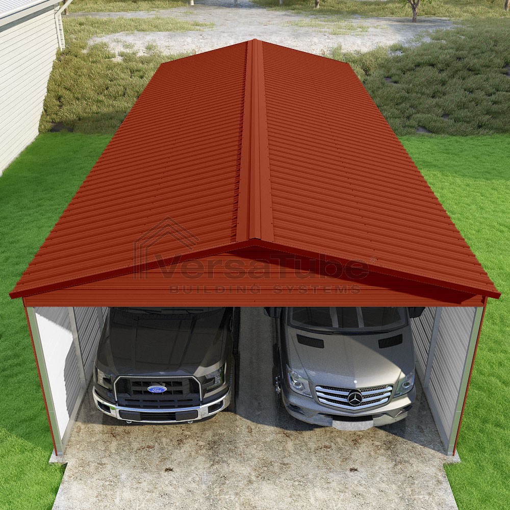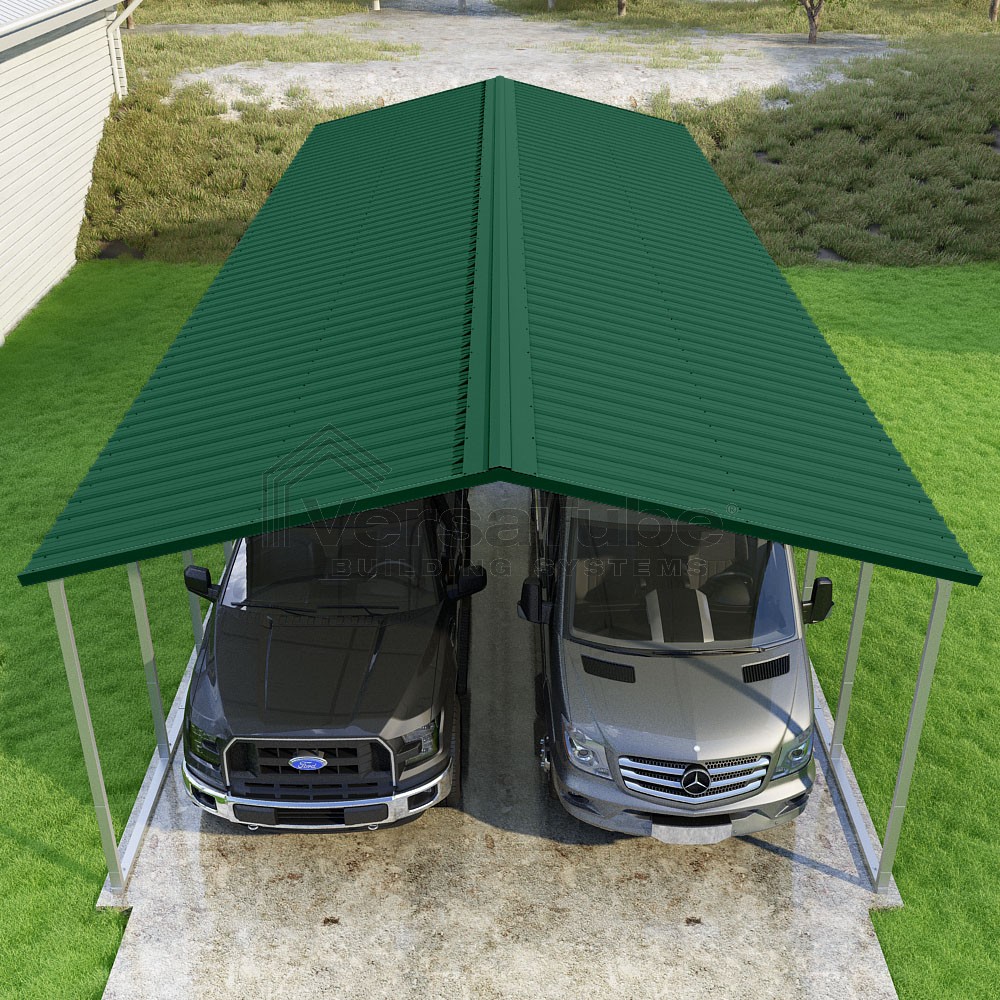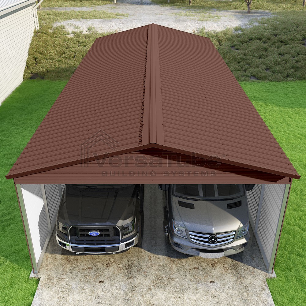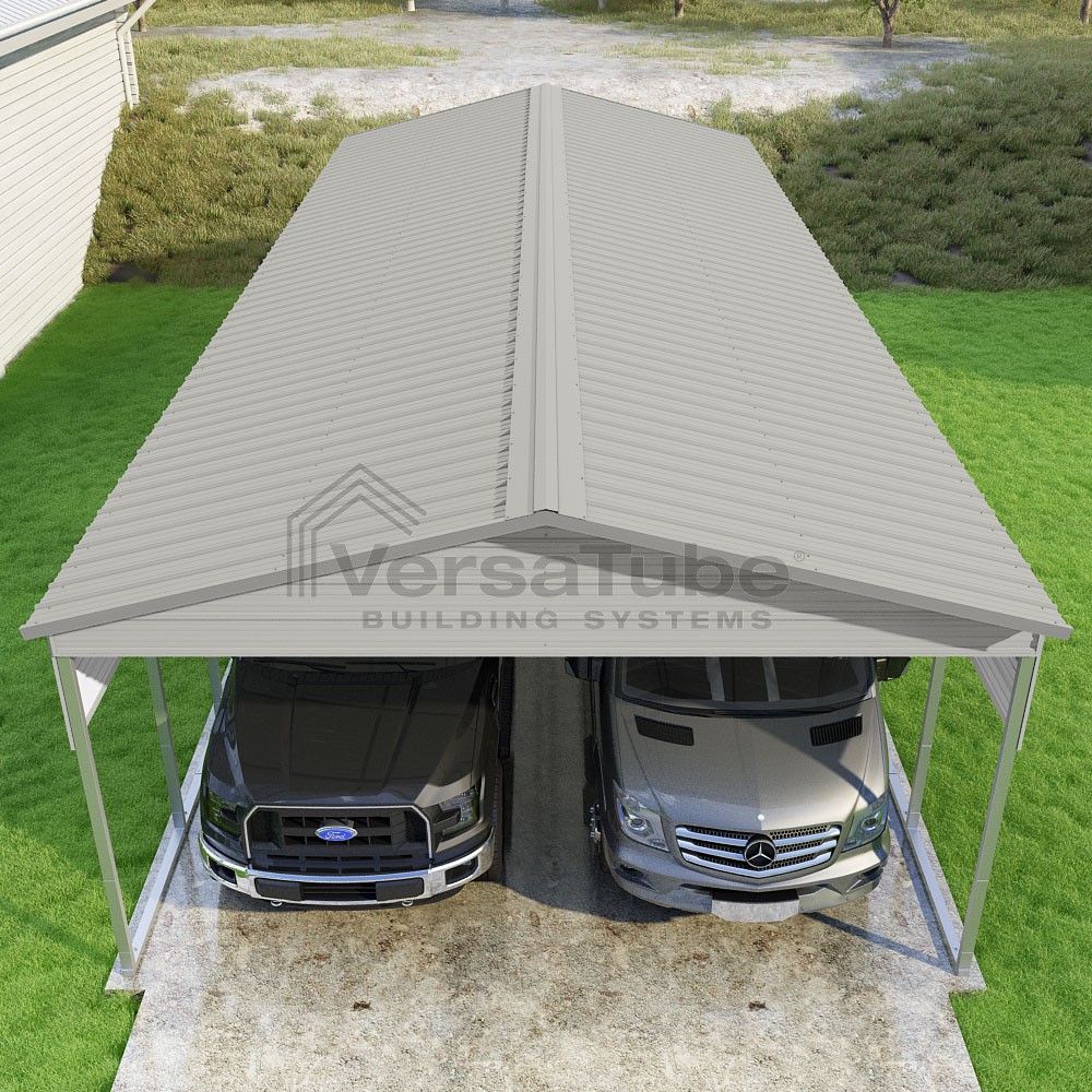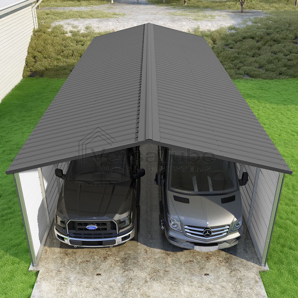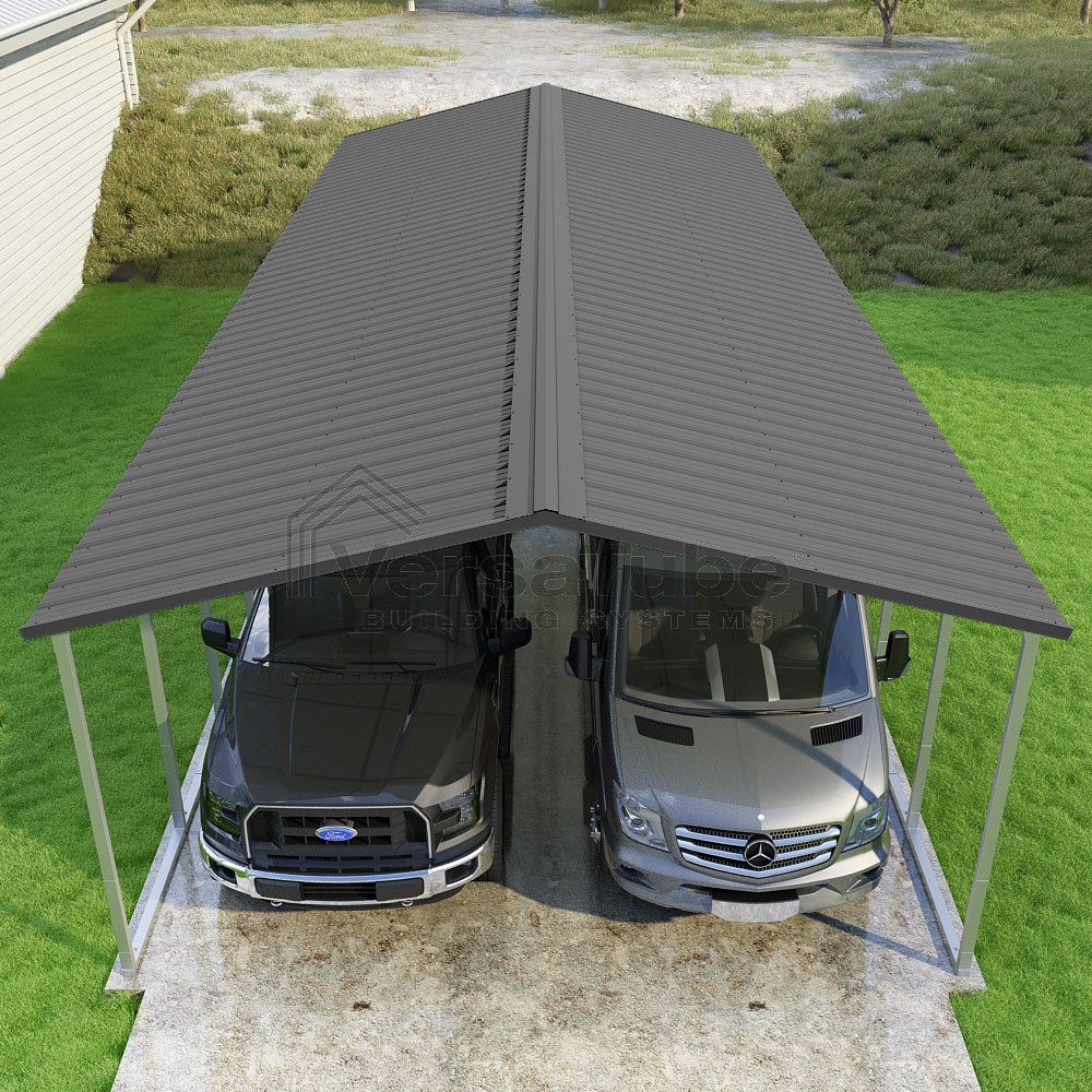 Pinnacle Series DIY carport kit features vertical sheet metal roof panels with ridge cap, gable and eave trim for an A-frame roof style and extended coverage on both ends.