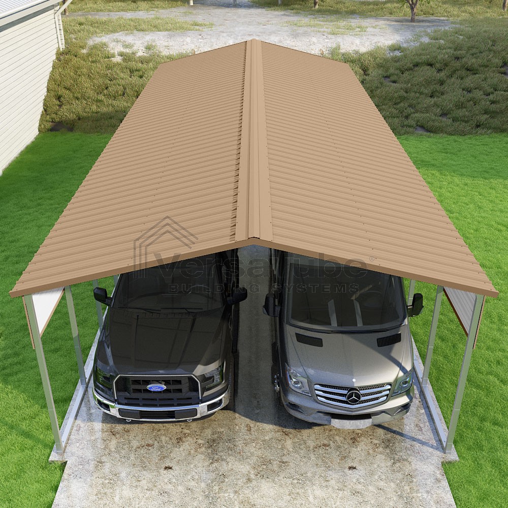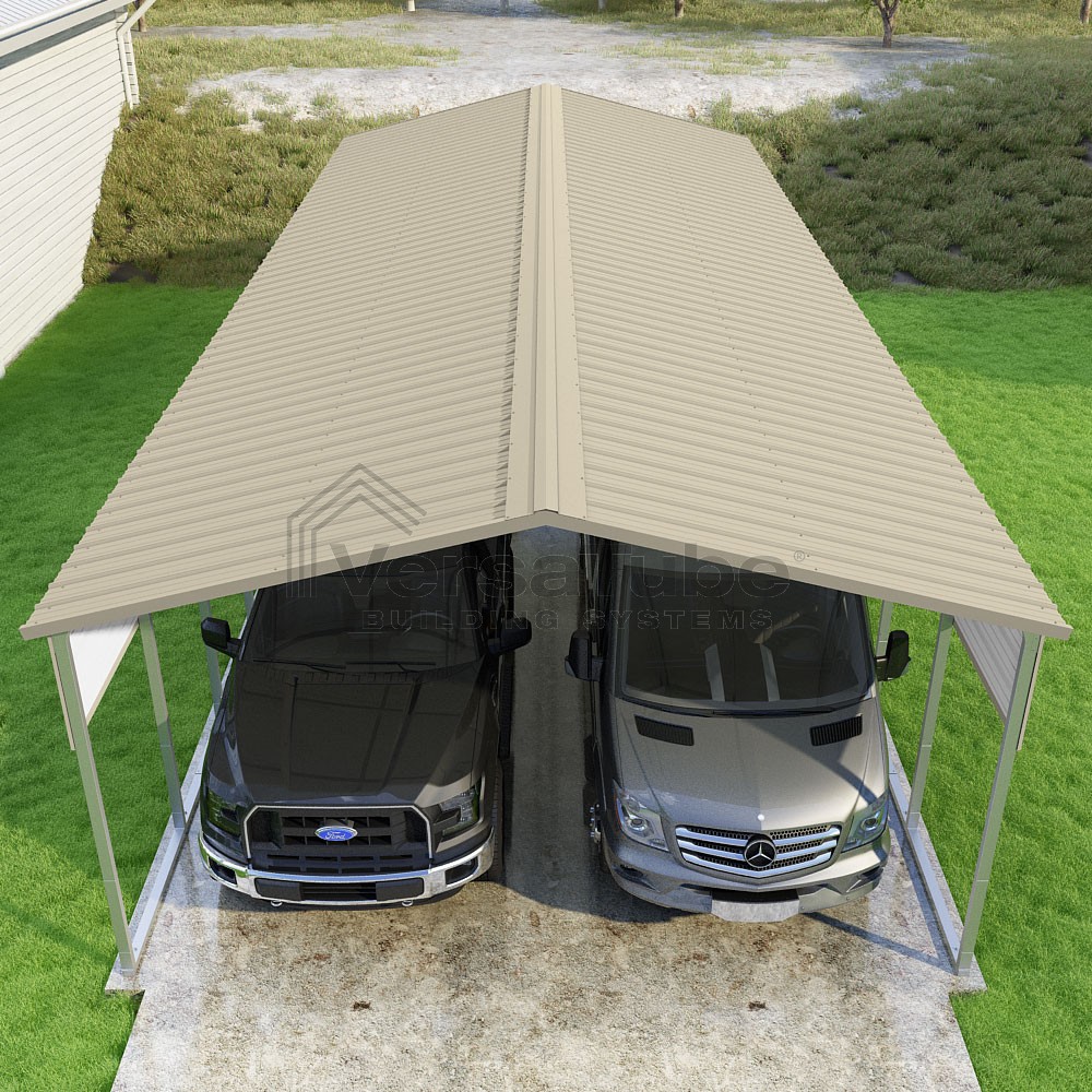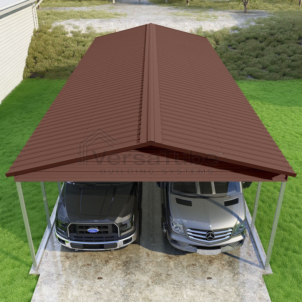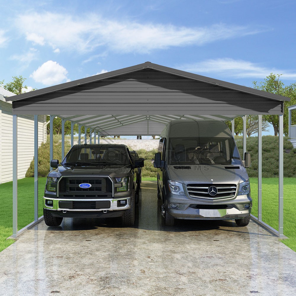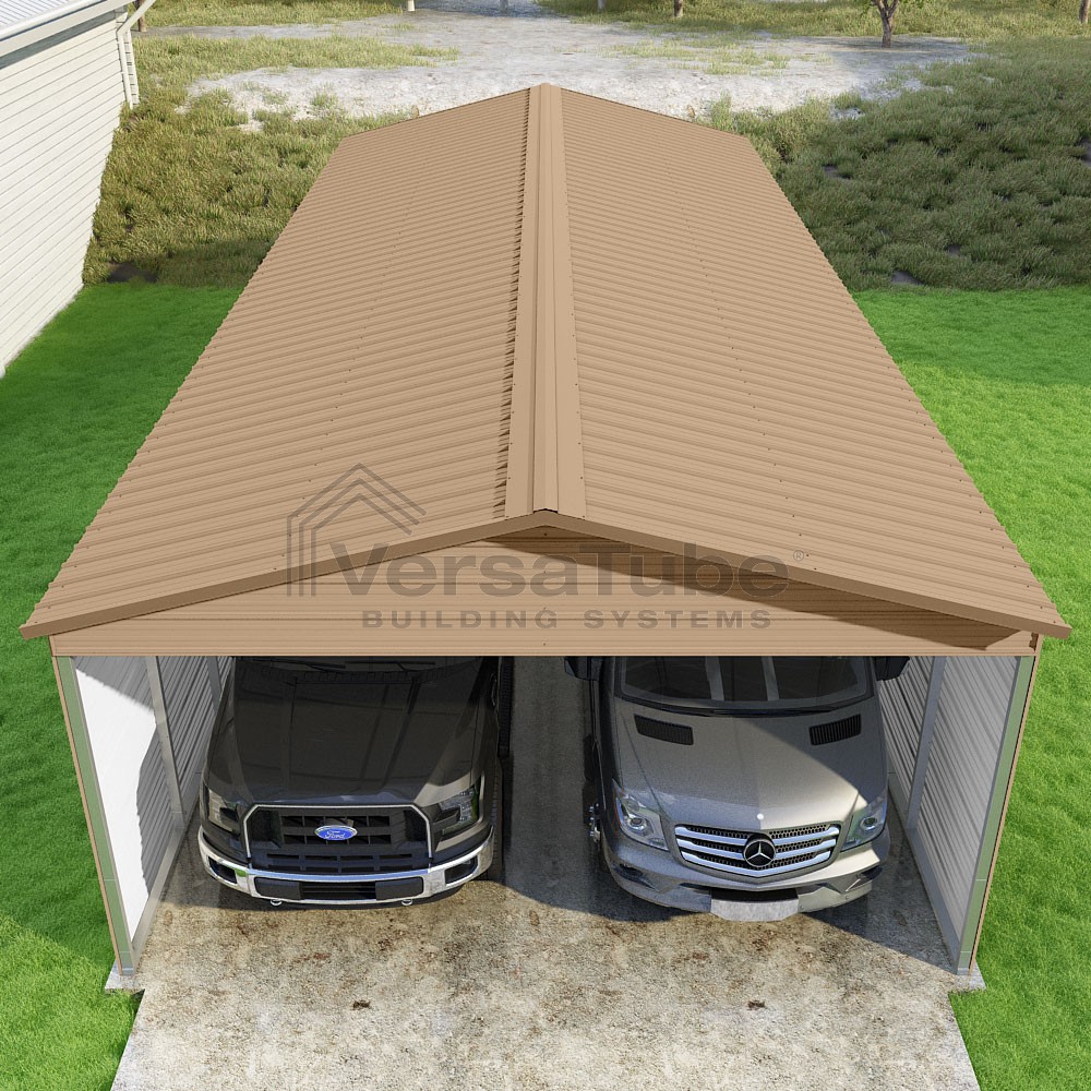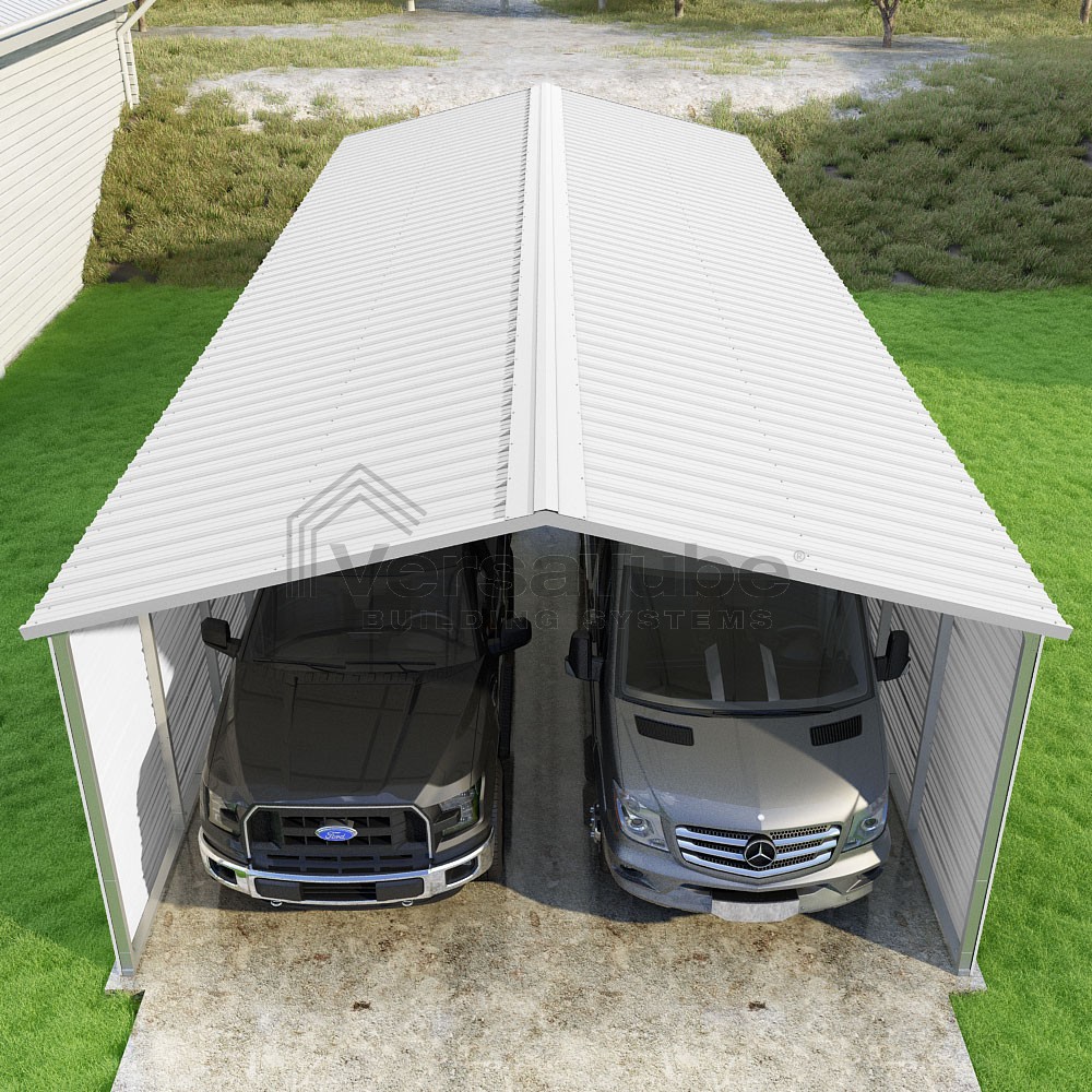 Pinnacle Series DIY carport kit features vertical sheet metal roof panels with ridge cap, gable and eave trim for an A-frame roof style and extended coverage on both ends.
