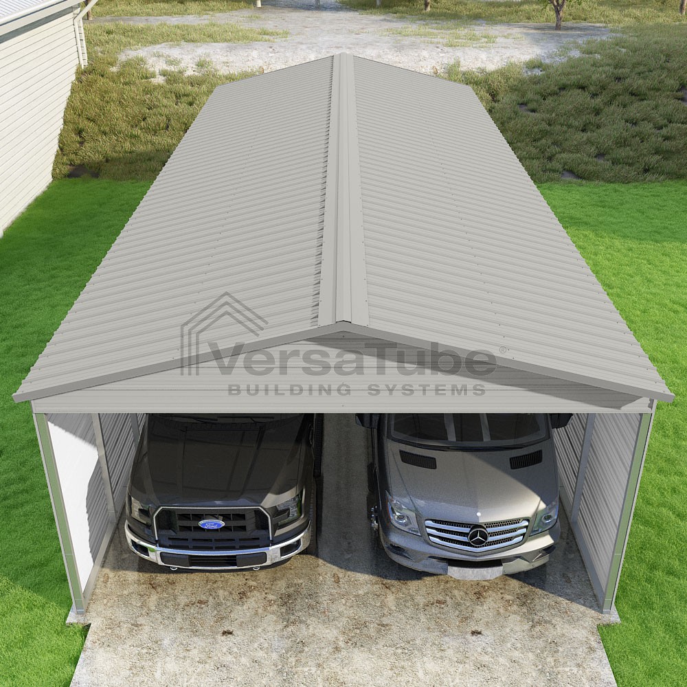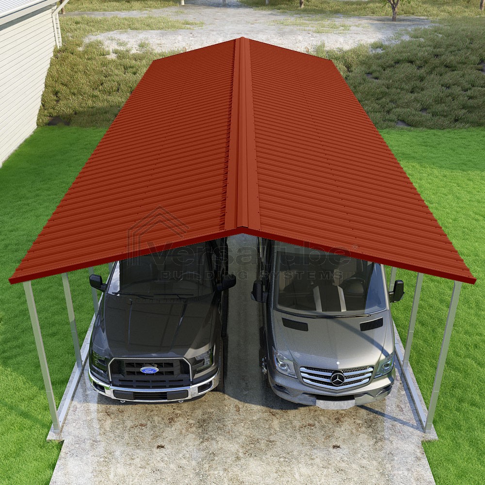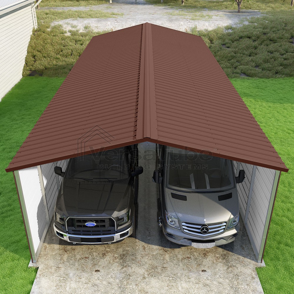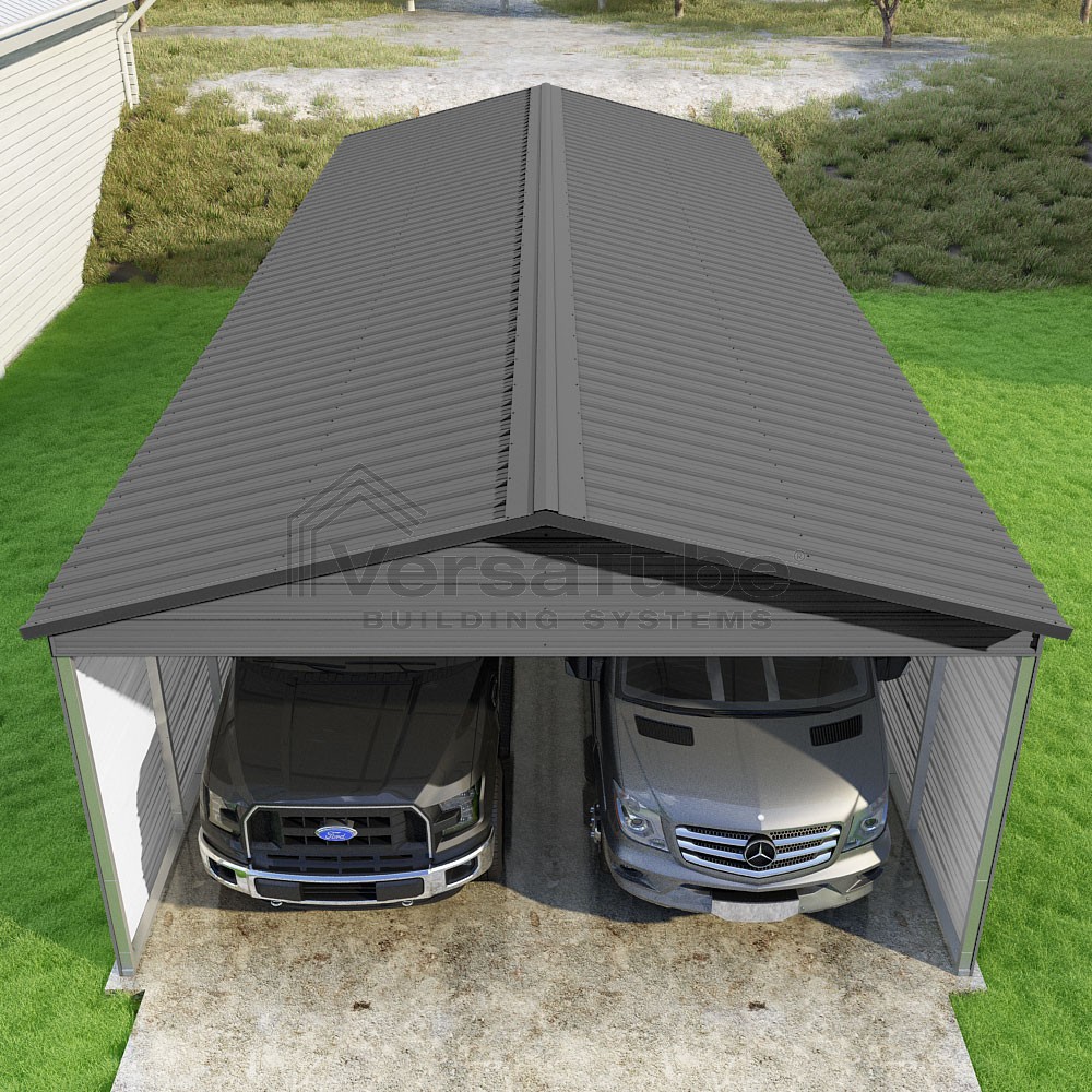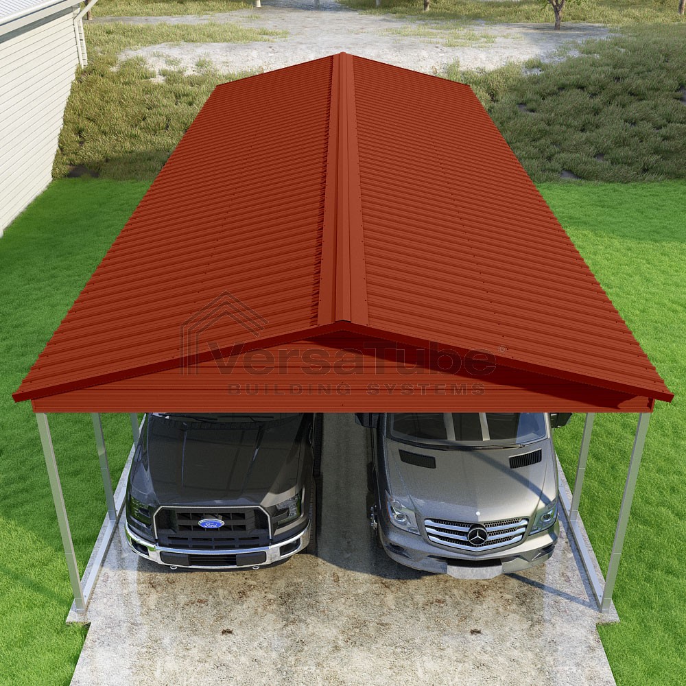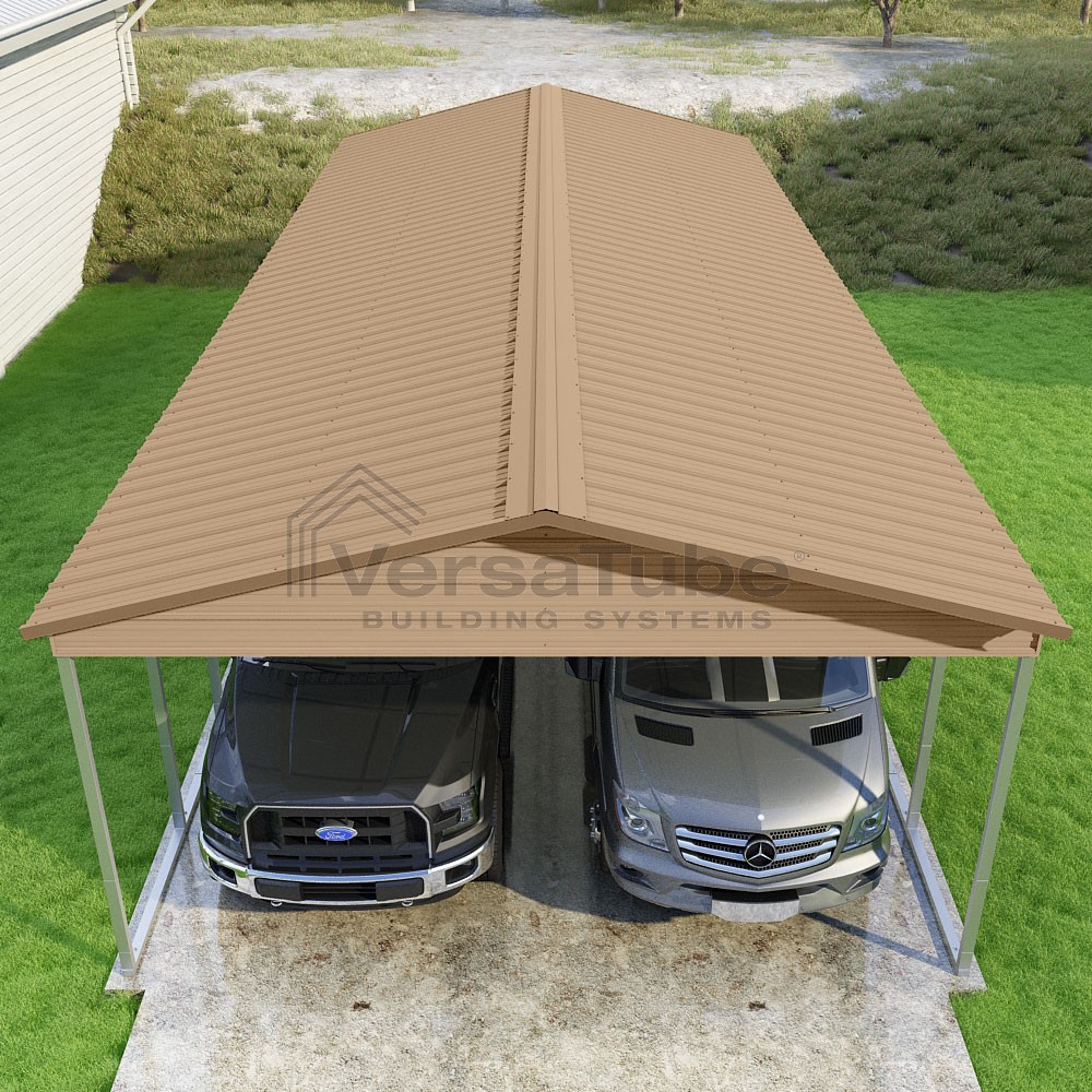 Pinnacle Series DIY carport kit features vertical sheet metal roof panels with ridge cap, gable and eave trim for an A-frame roof style and extended coverage on both ends.