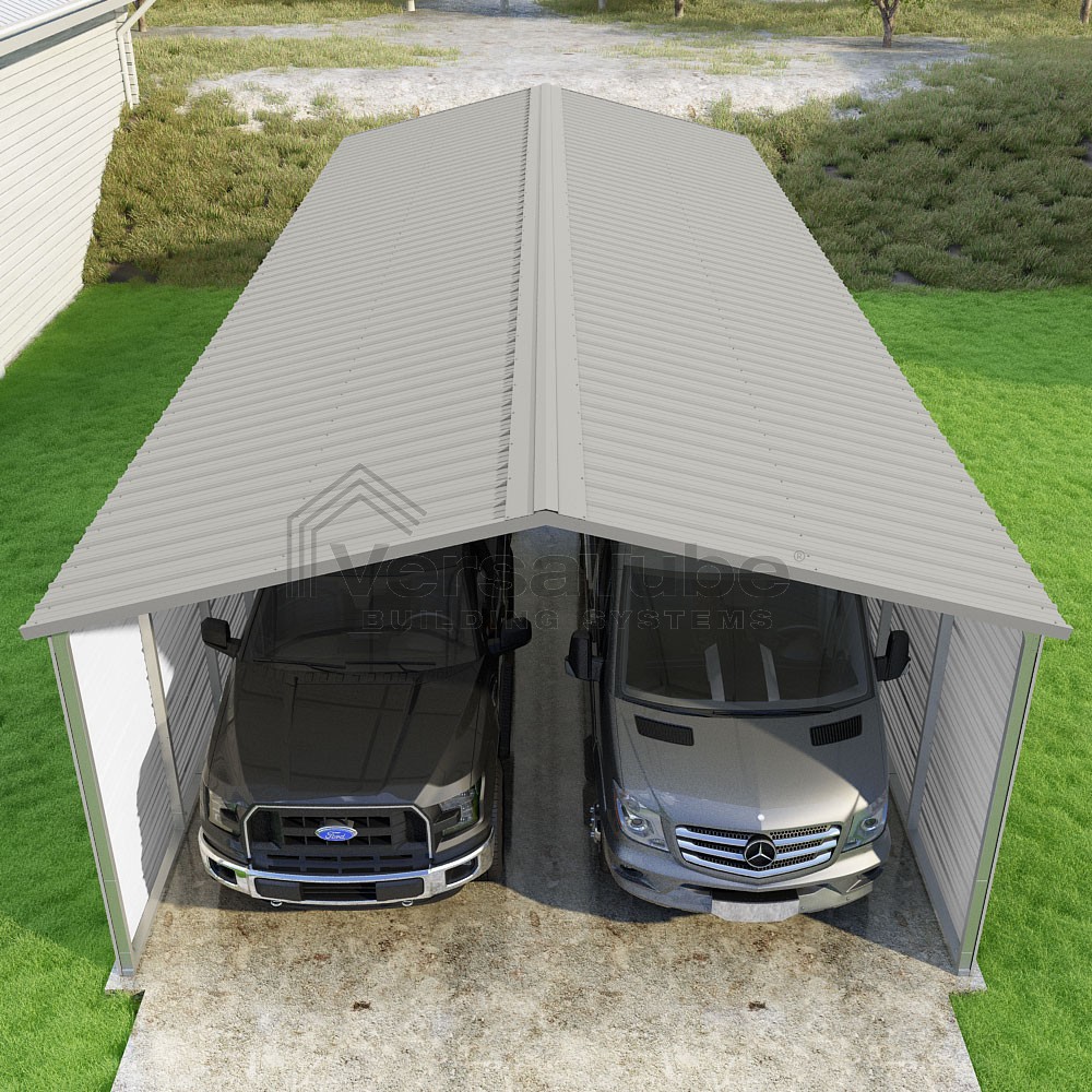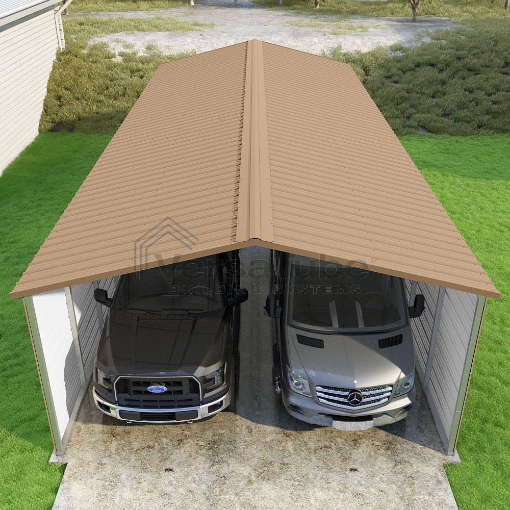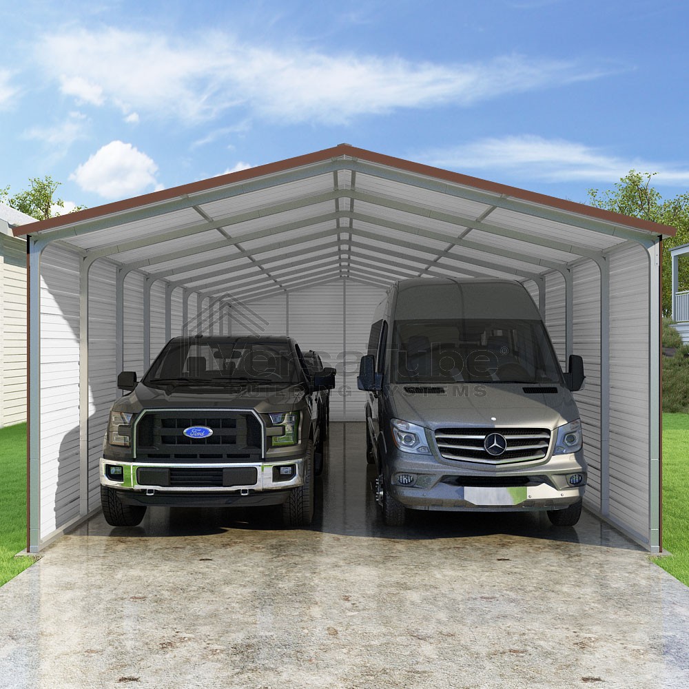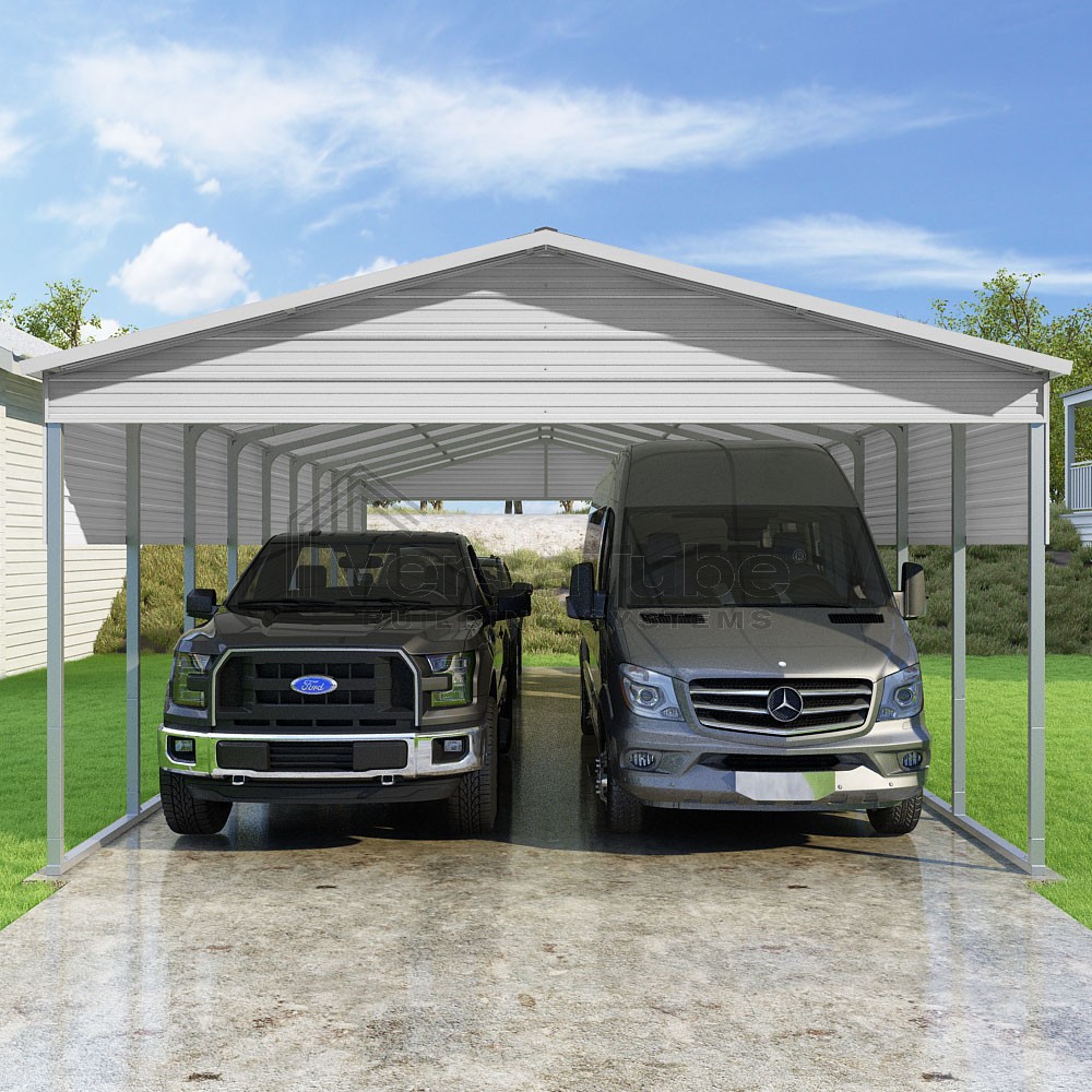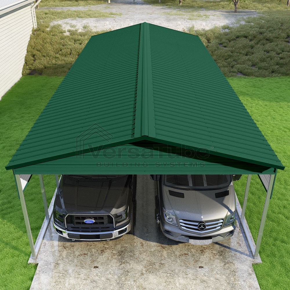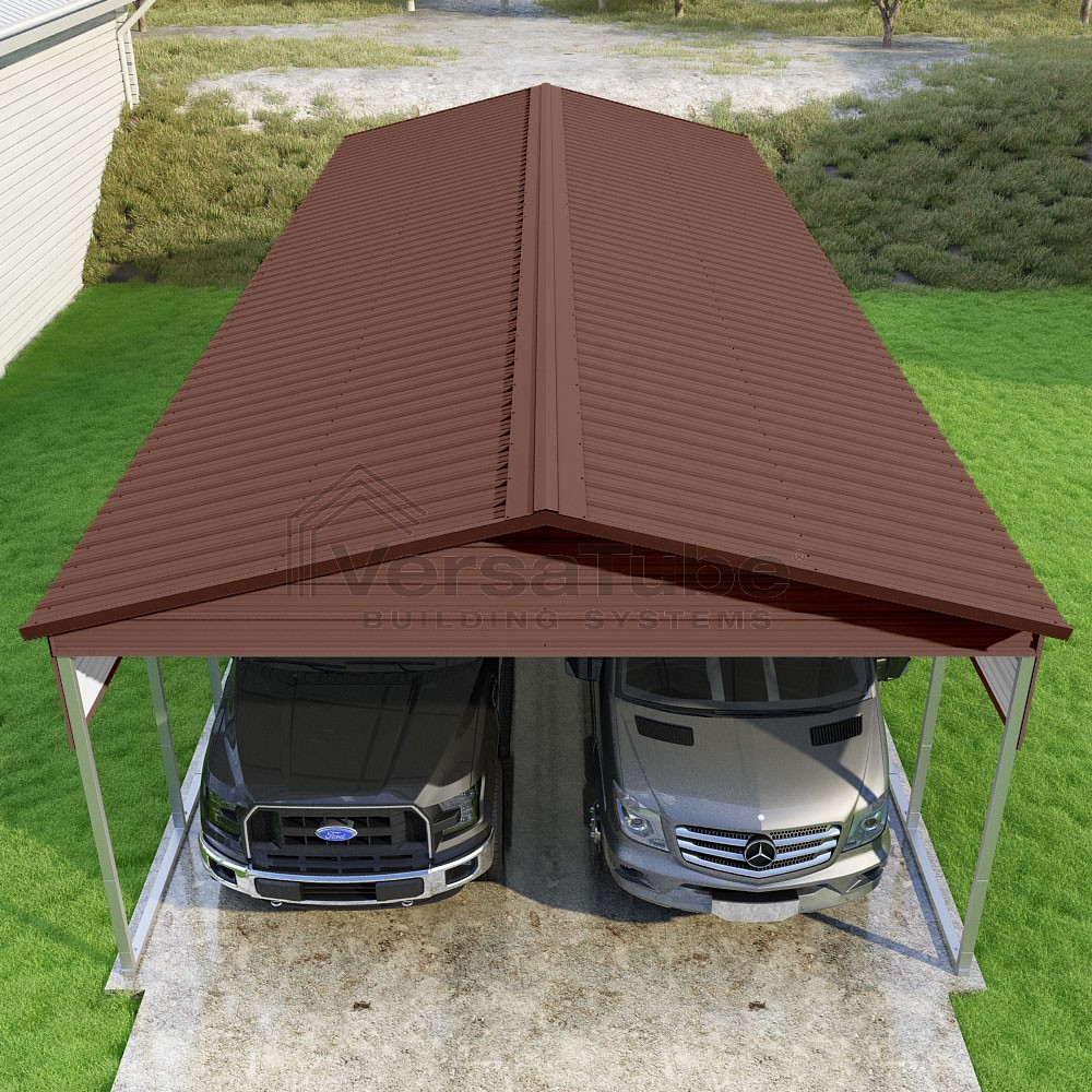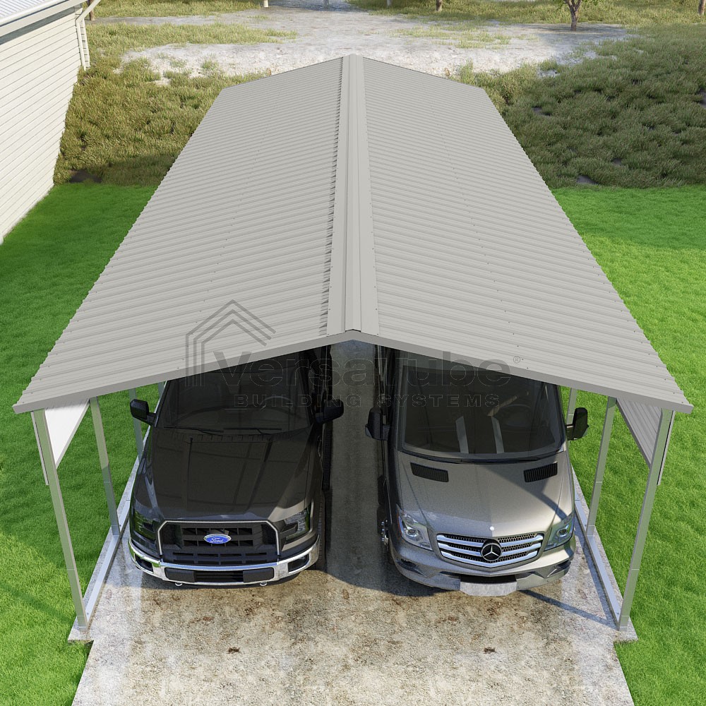 Pinnacle Series DIY carport kit features vertical sheet metal roof panels with ridge cap, gable and eave trim for an A-frame roof style and extended coverage on both ends.