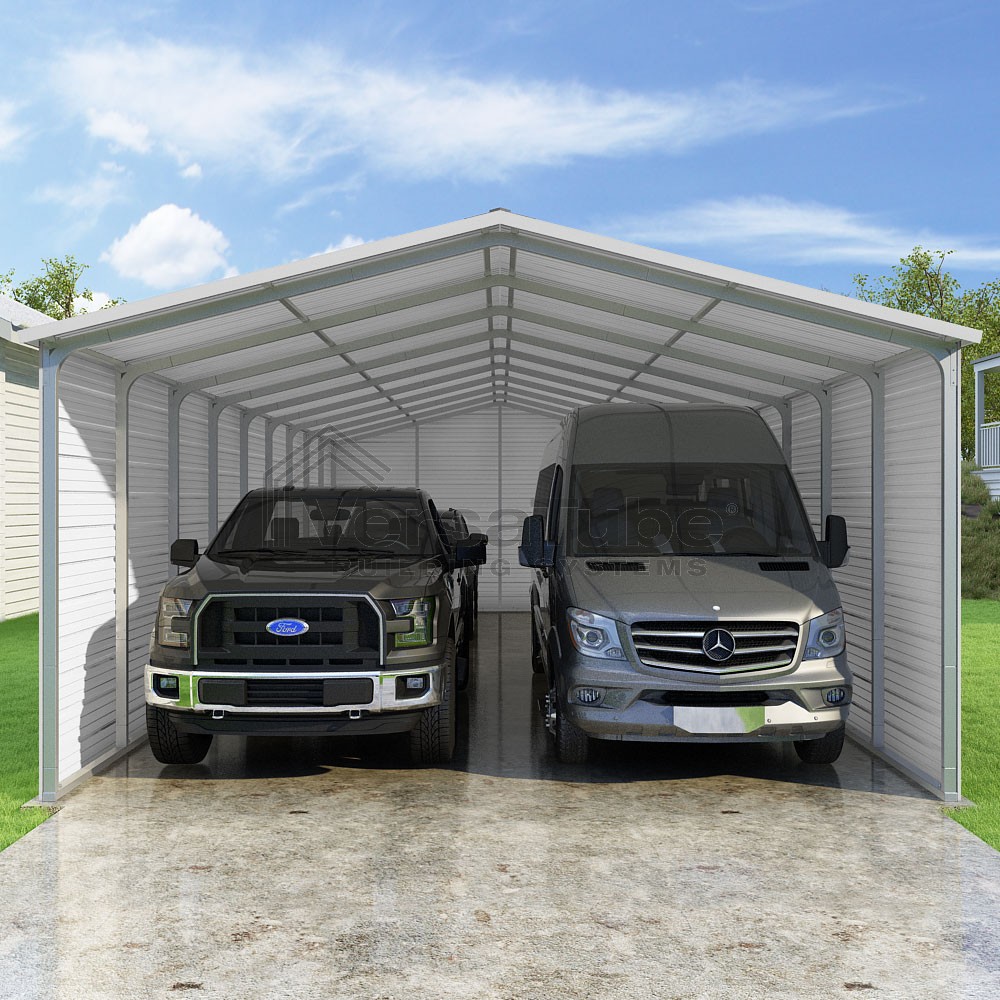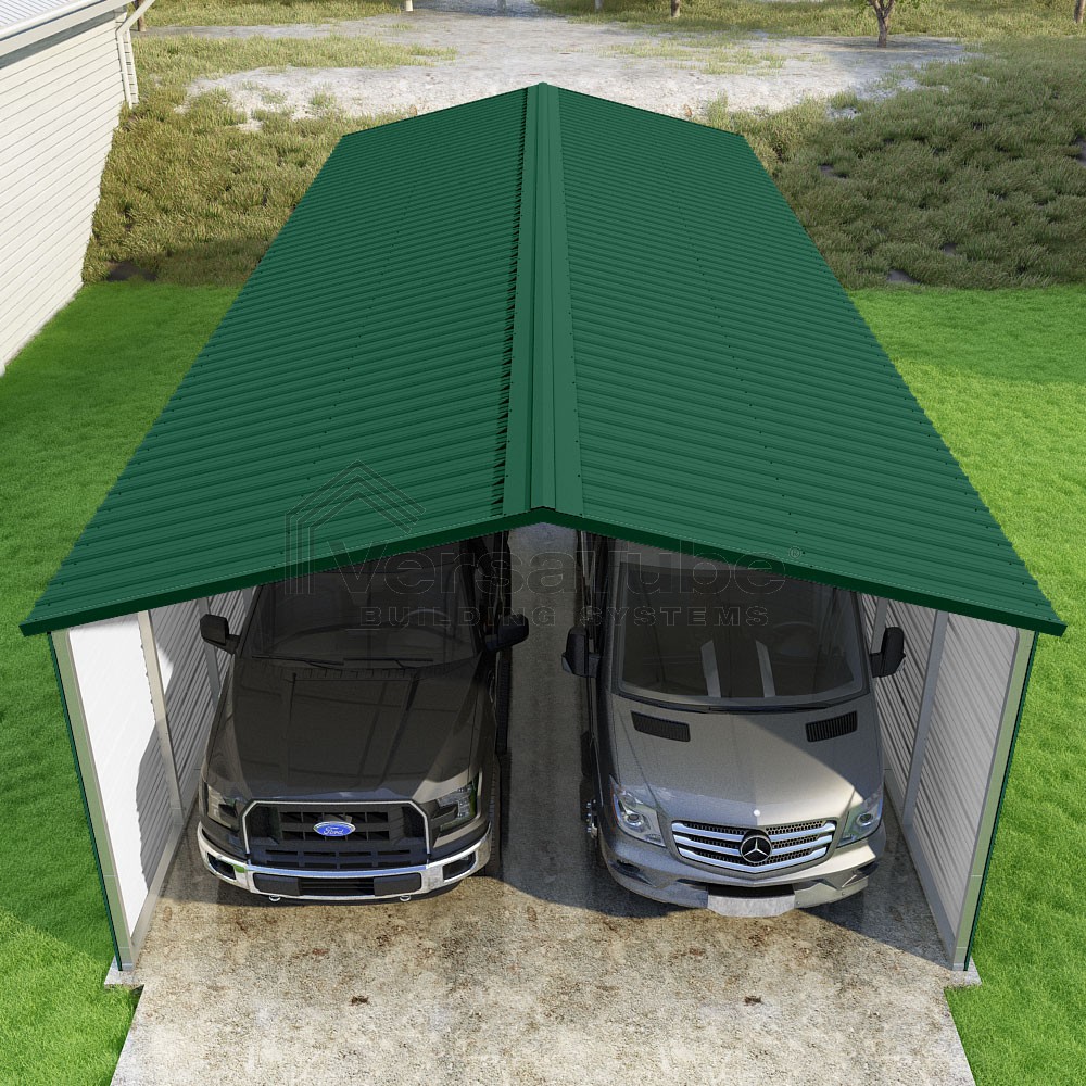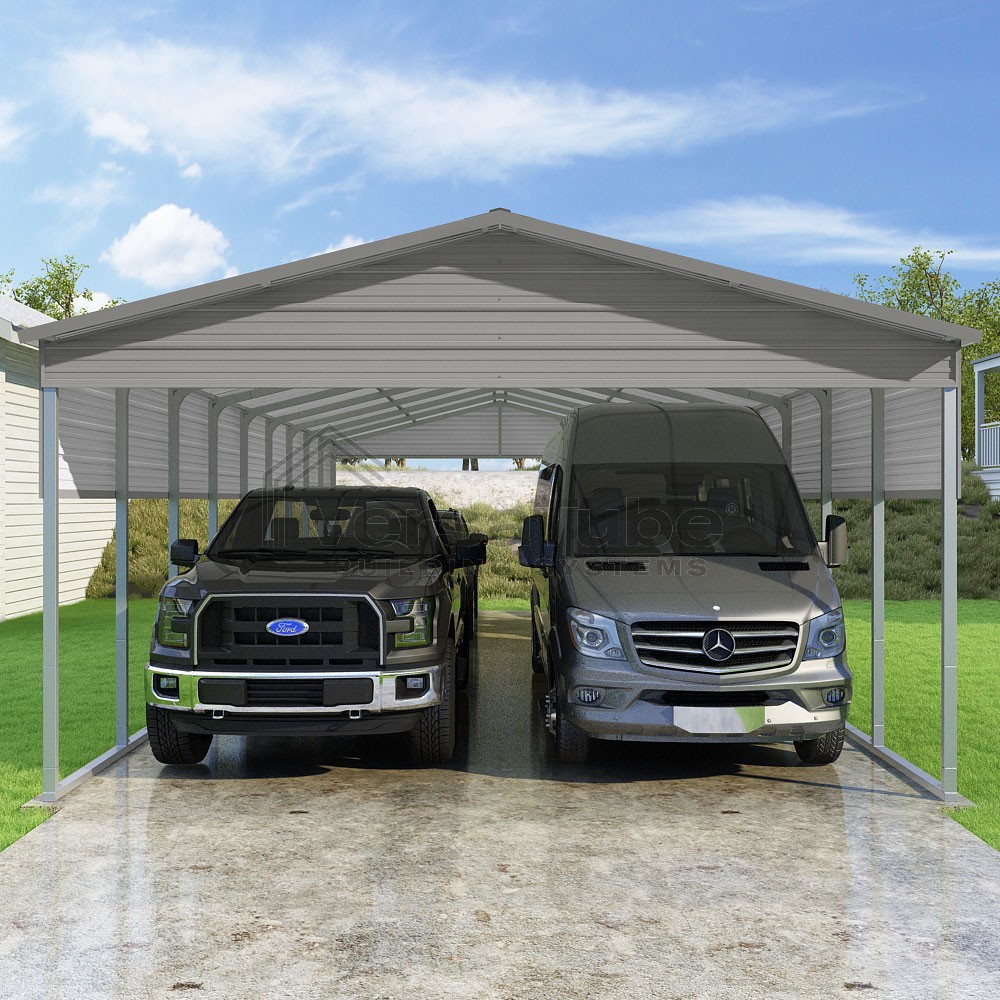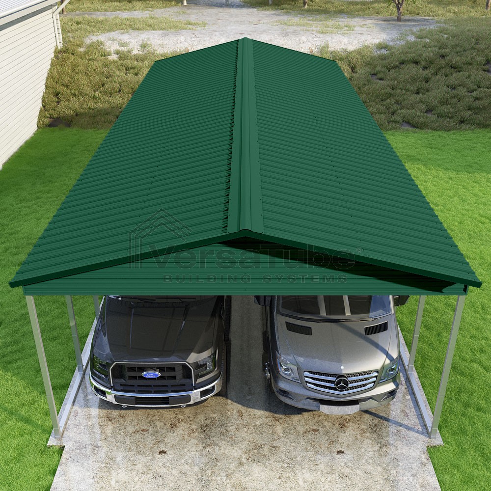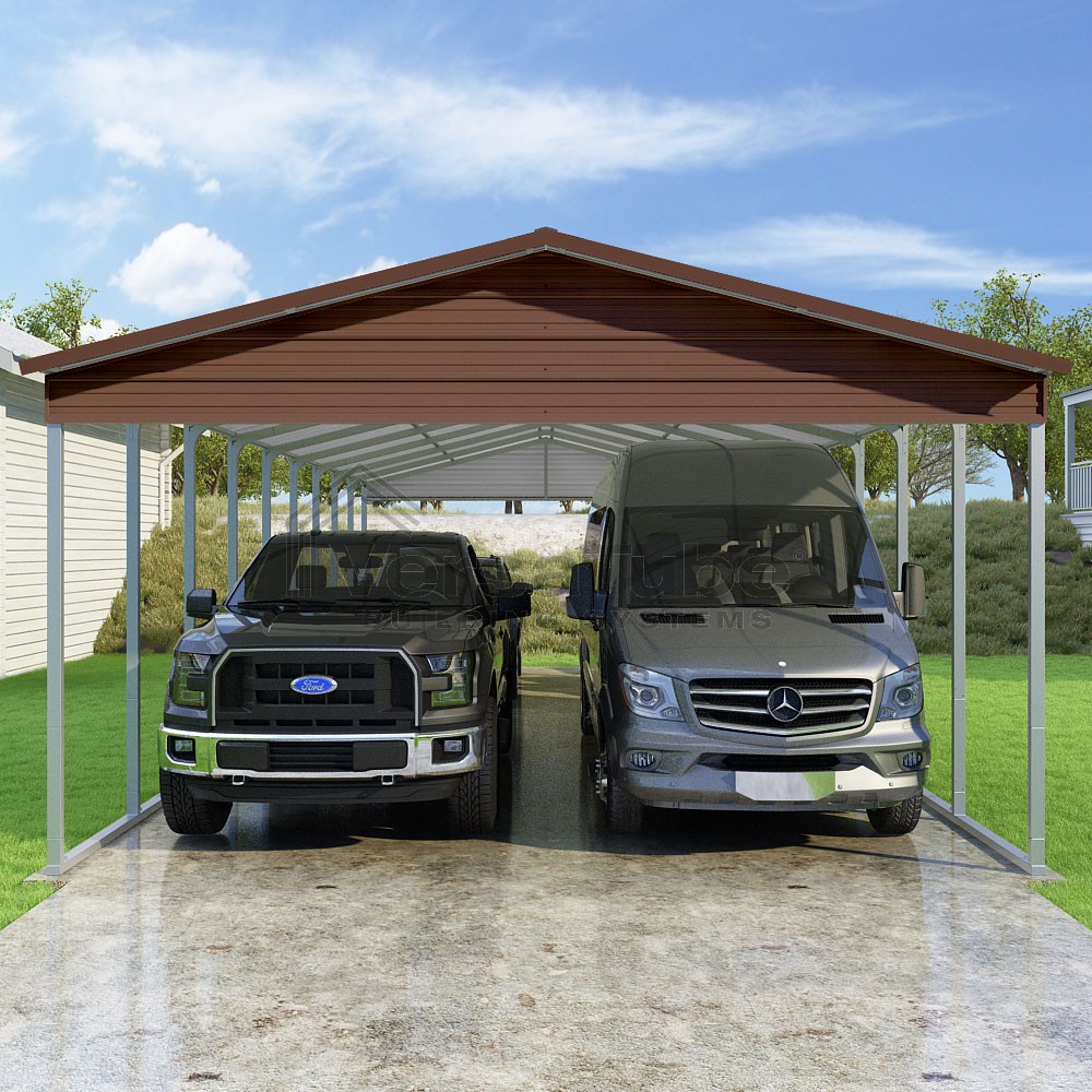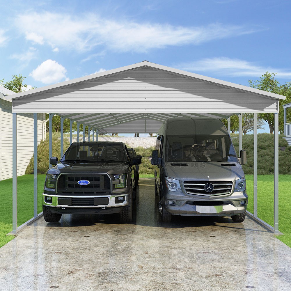 Pinnacle Series DIY carport kit features vertical sheet metal roof panels with ridge cap, gable and eave trim for an A-frame roof style and extended coverage on both ends.
