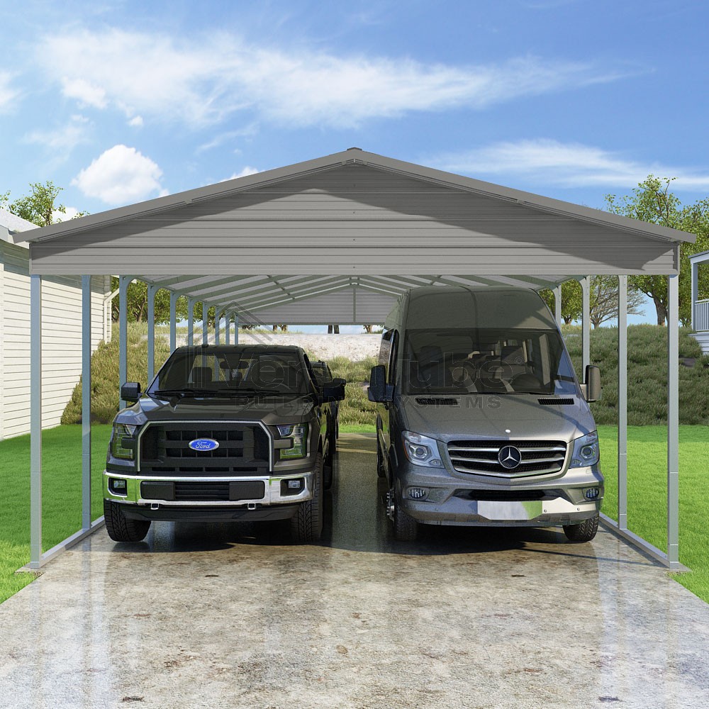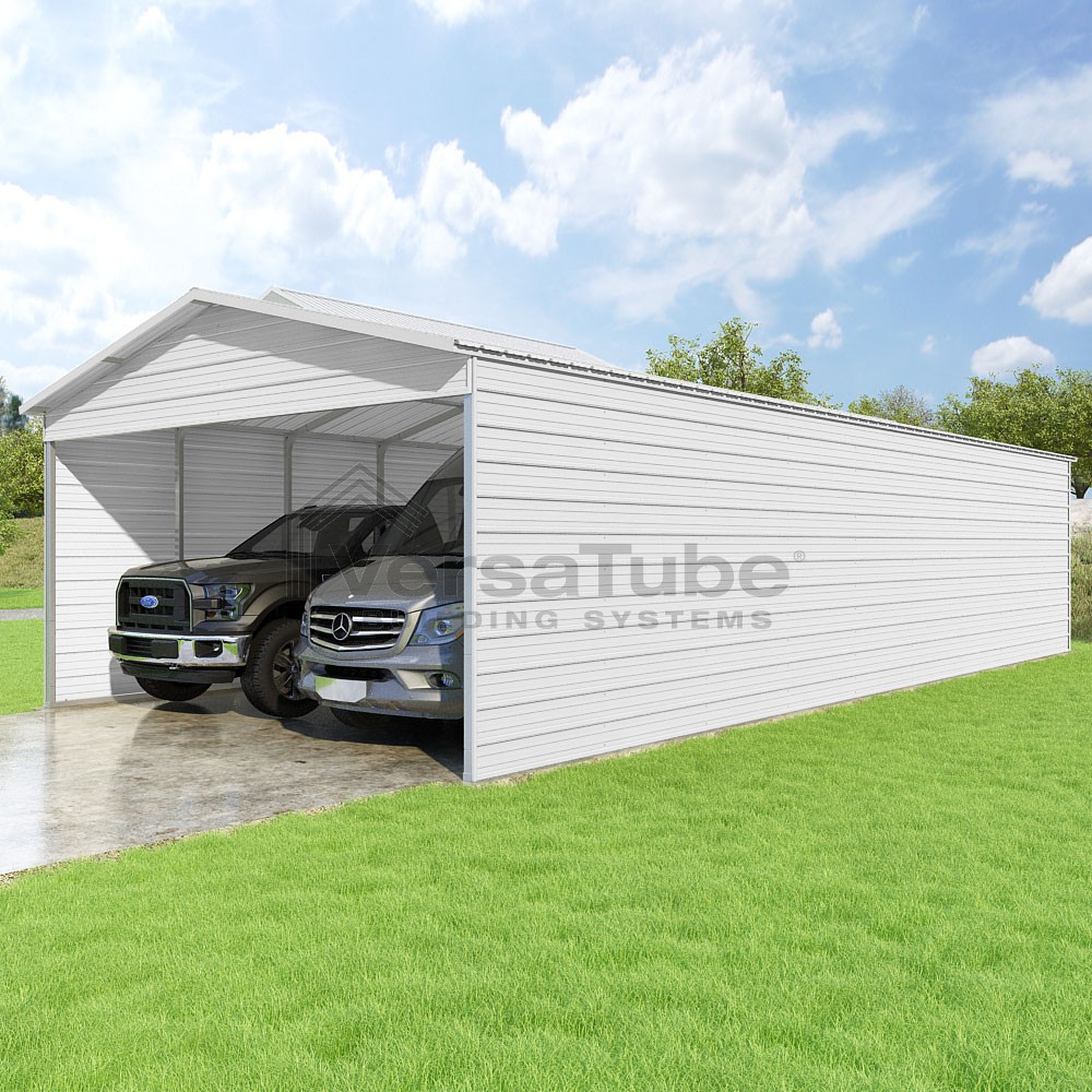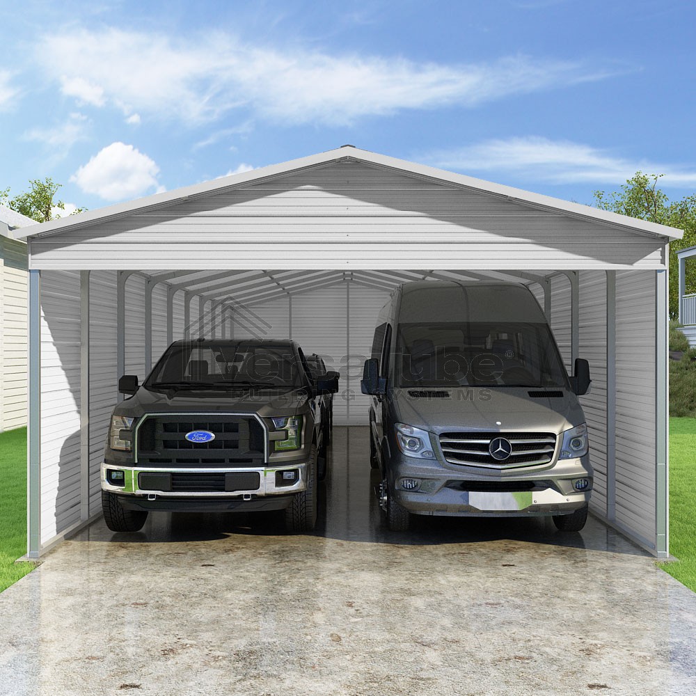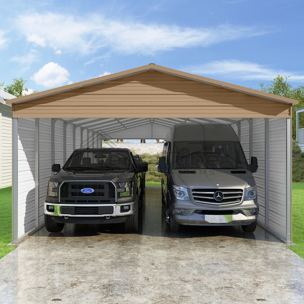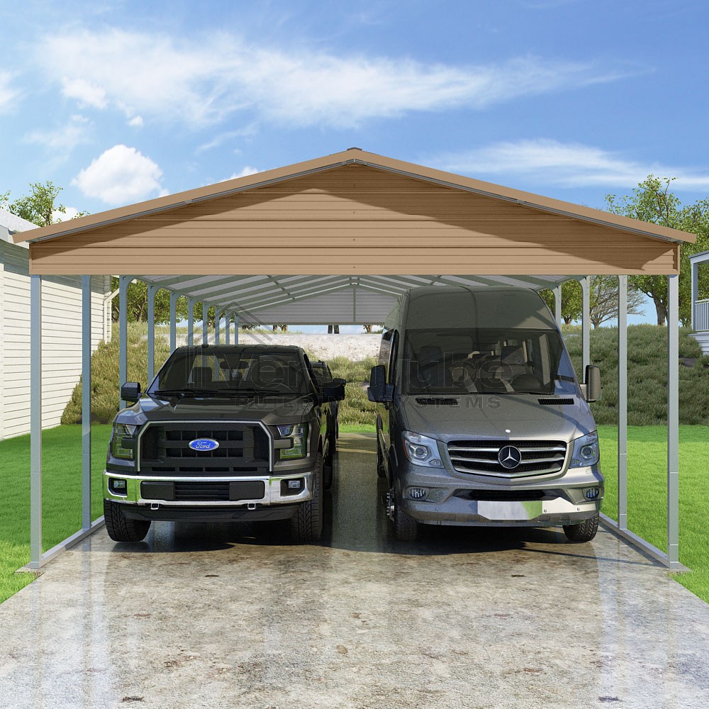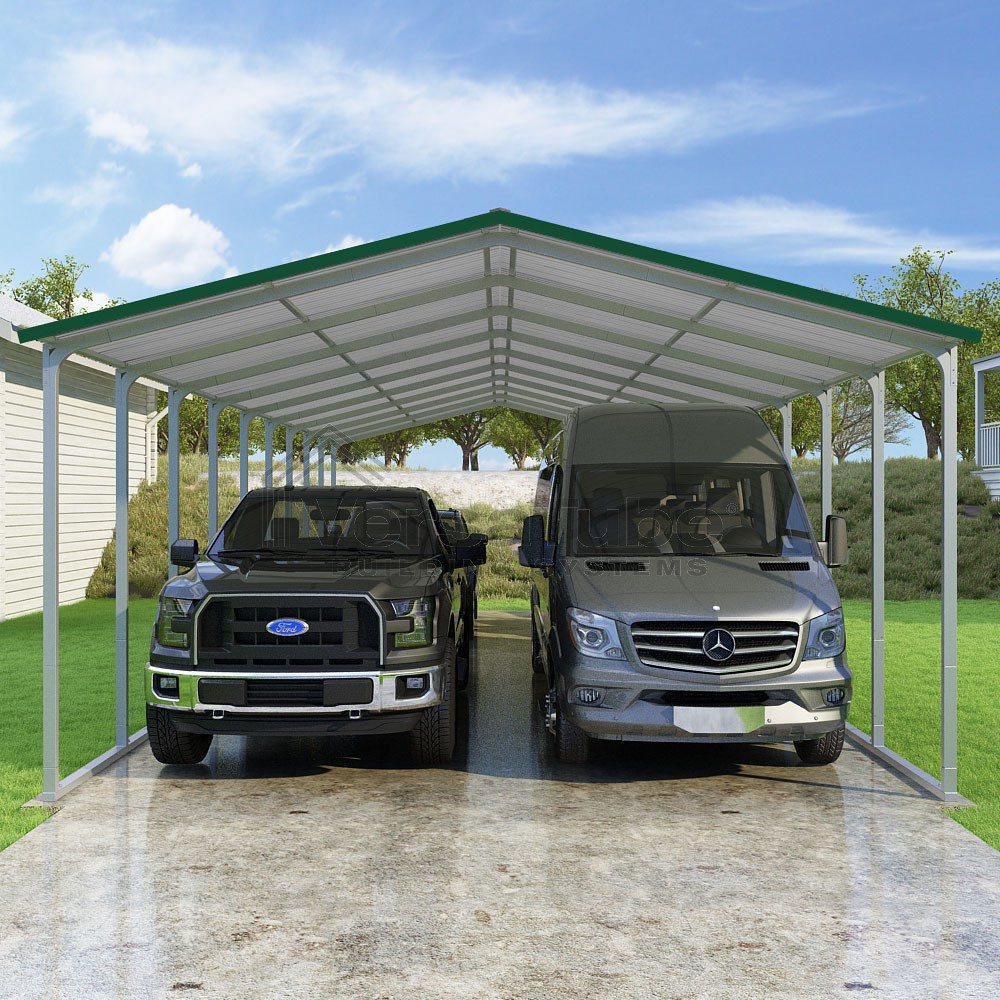 Pinnacle Series DIY carport kit features vertical sheet metal roof panels with ridge cap, gable and eave trim for an A-frame roof style and extended coverage on both ends.