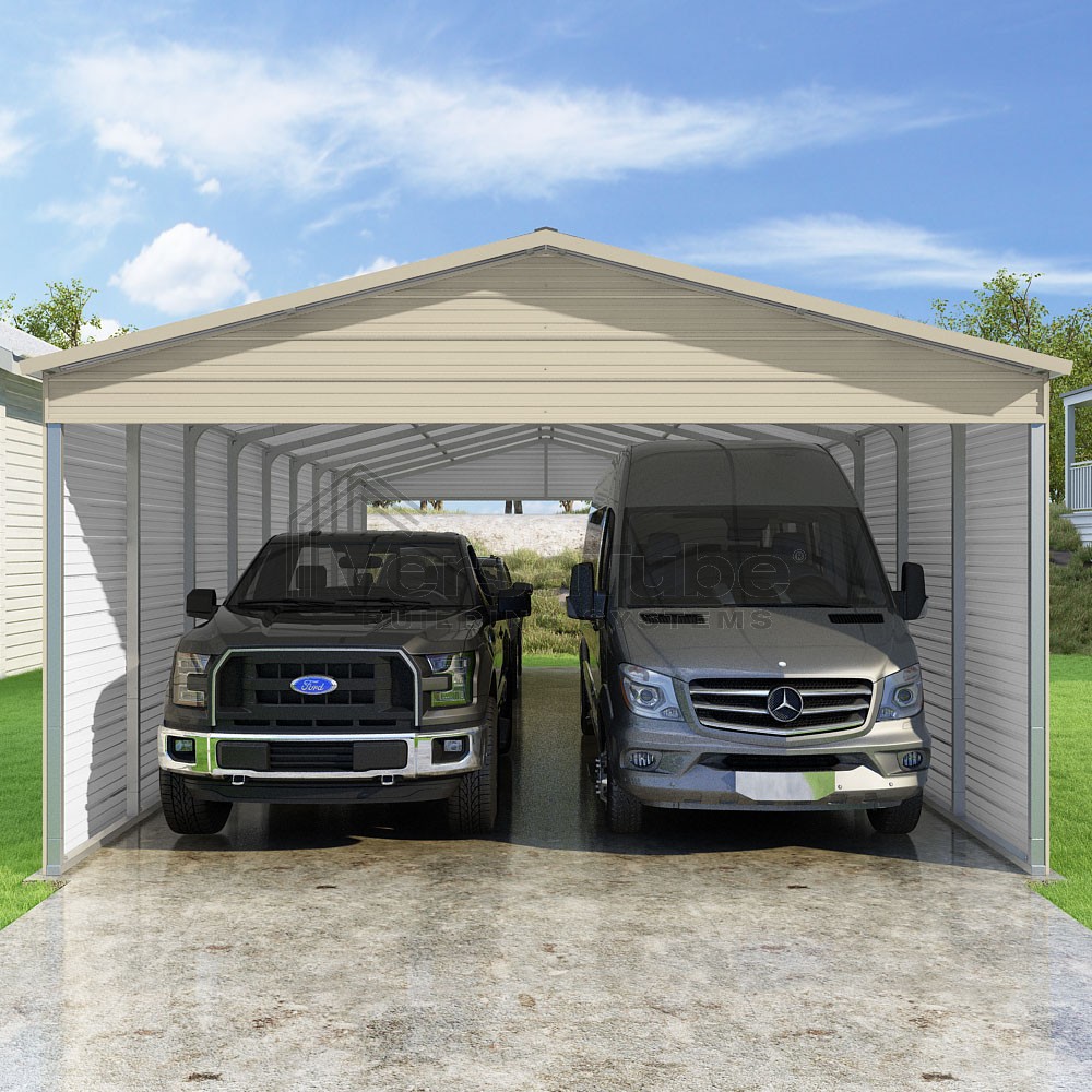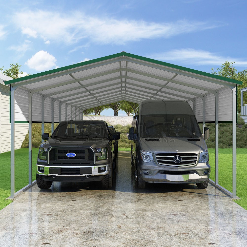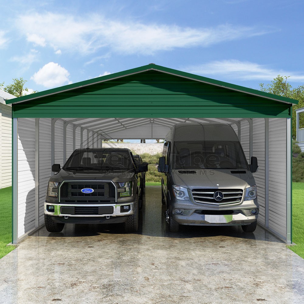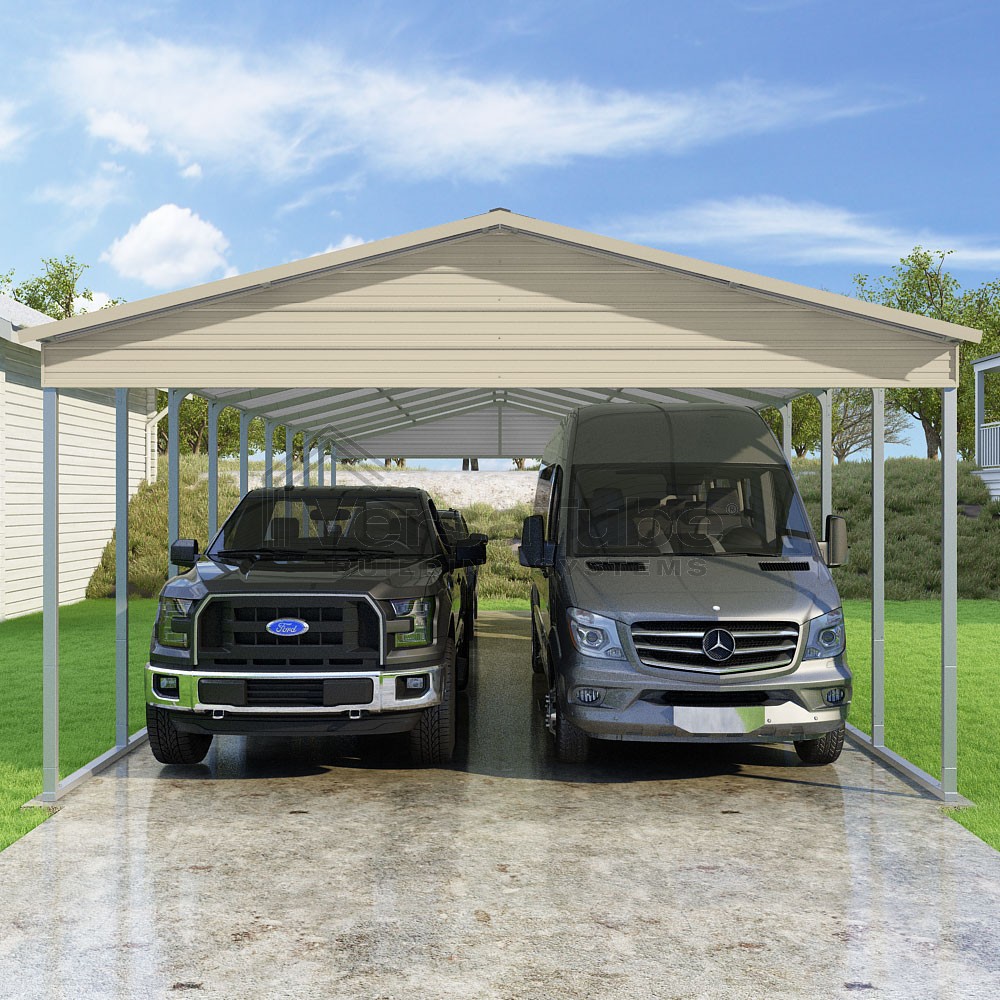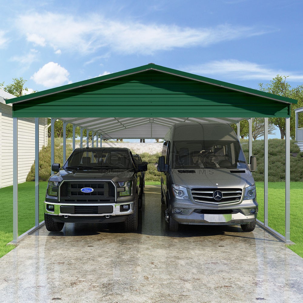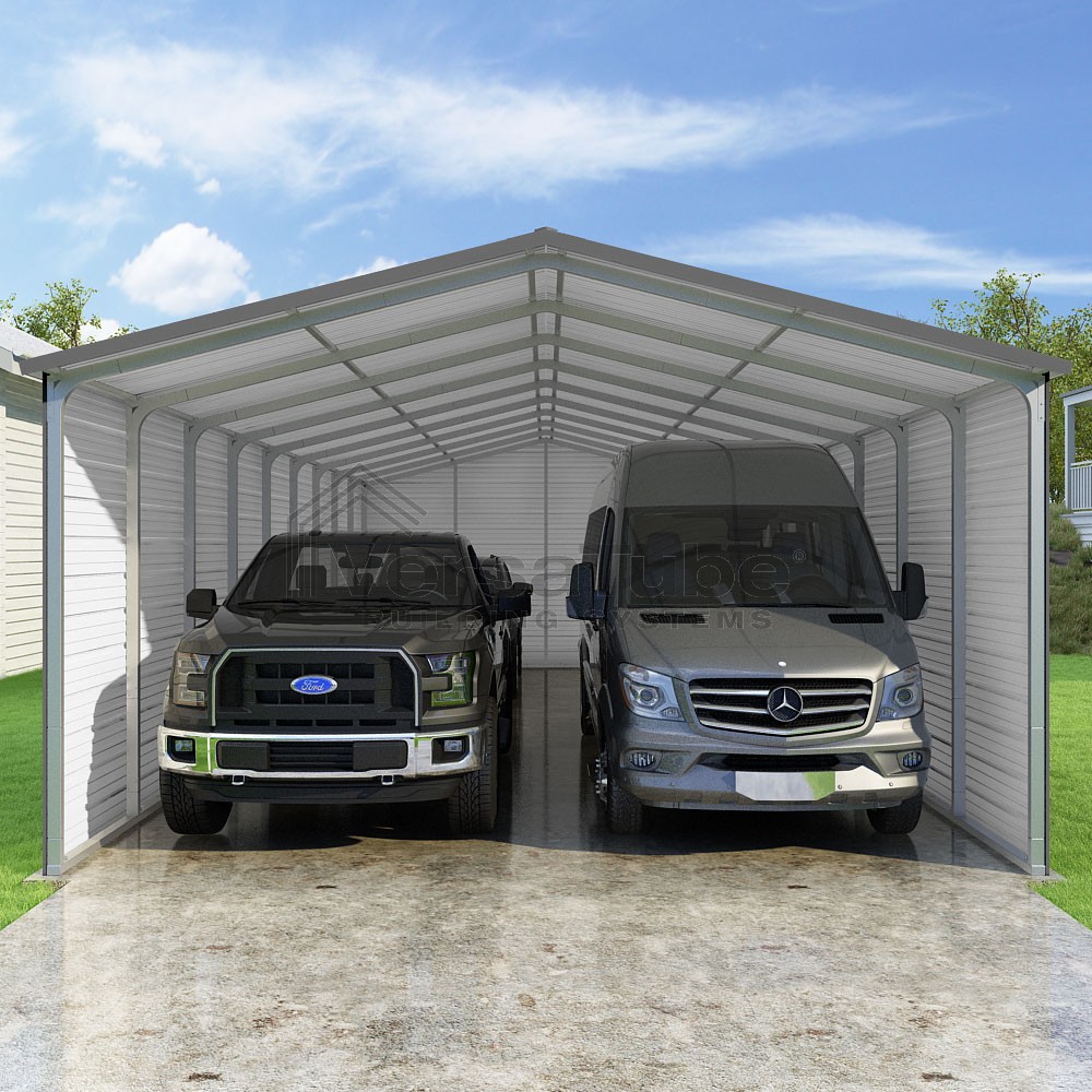 Pinnacle Series DIY carport kit features vertical sheet metal roof panels with ridge cap, gable and eave trim for an A-frame roof style and extended coverage on both ends.