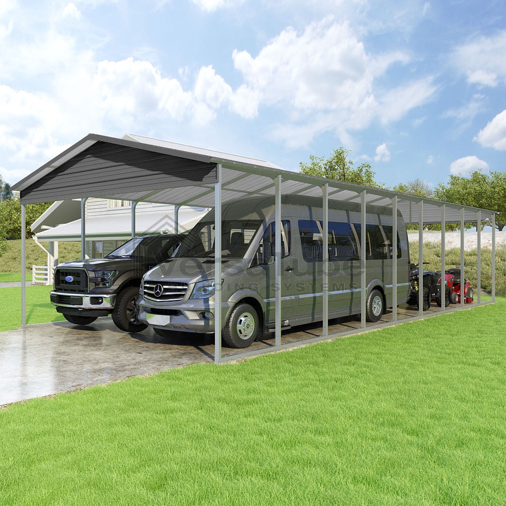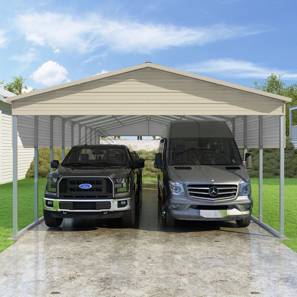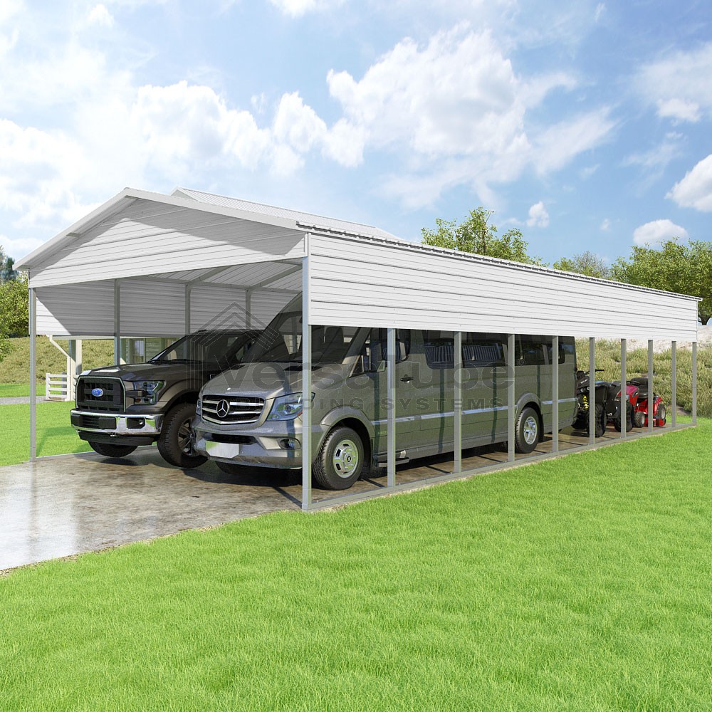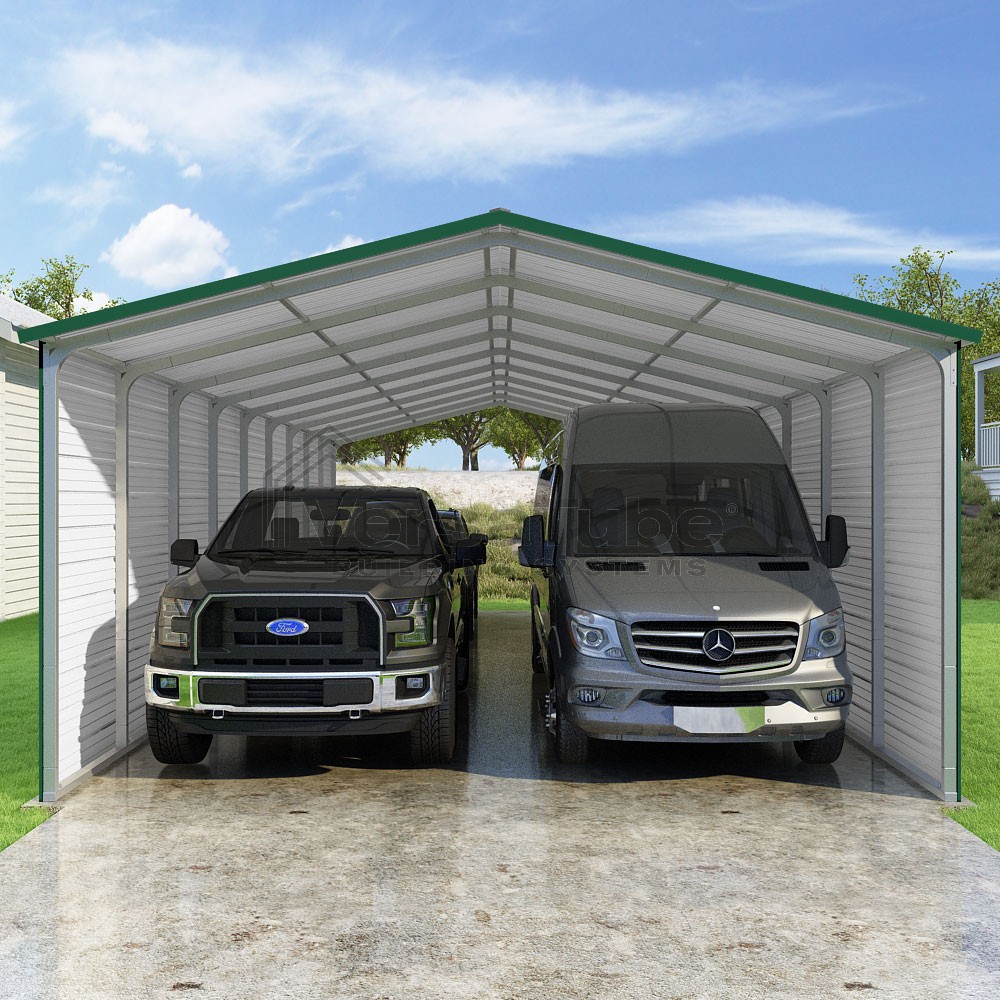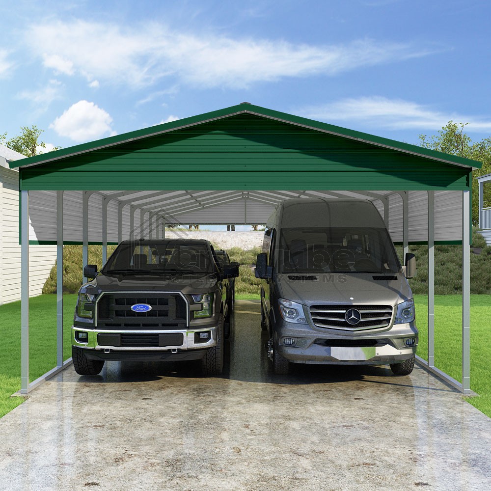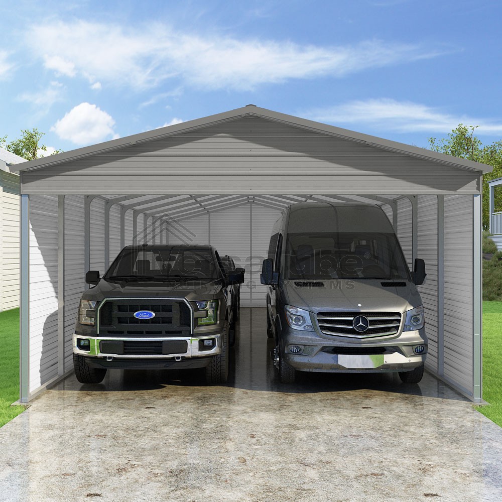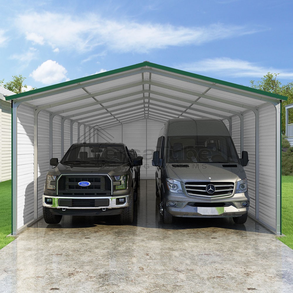 Pinnacle Series DIY carport kit features vertical sheet metal roof panels with ridge cap, gable and eave trim for an A-frame roof style and extended coverage on both ends.