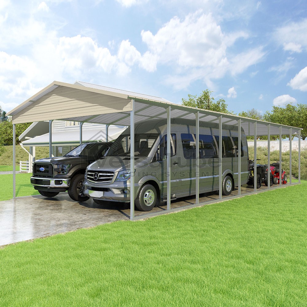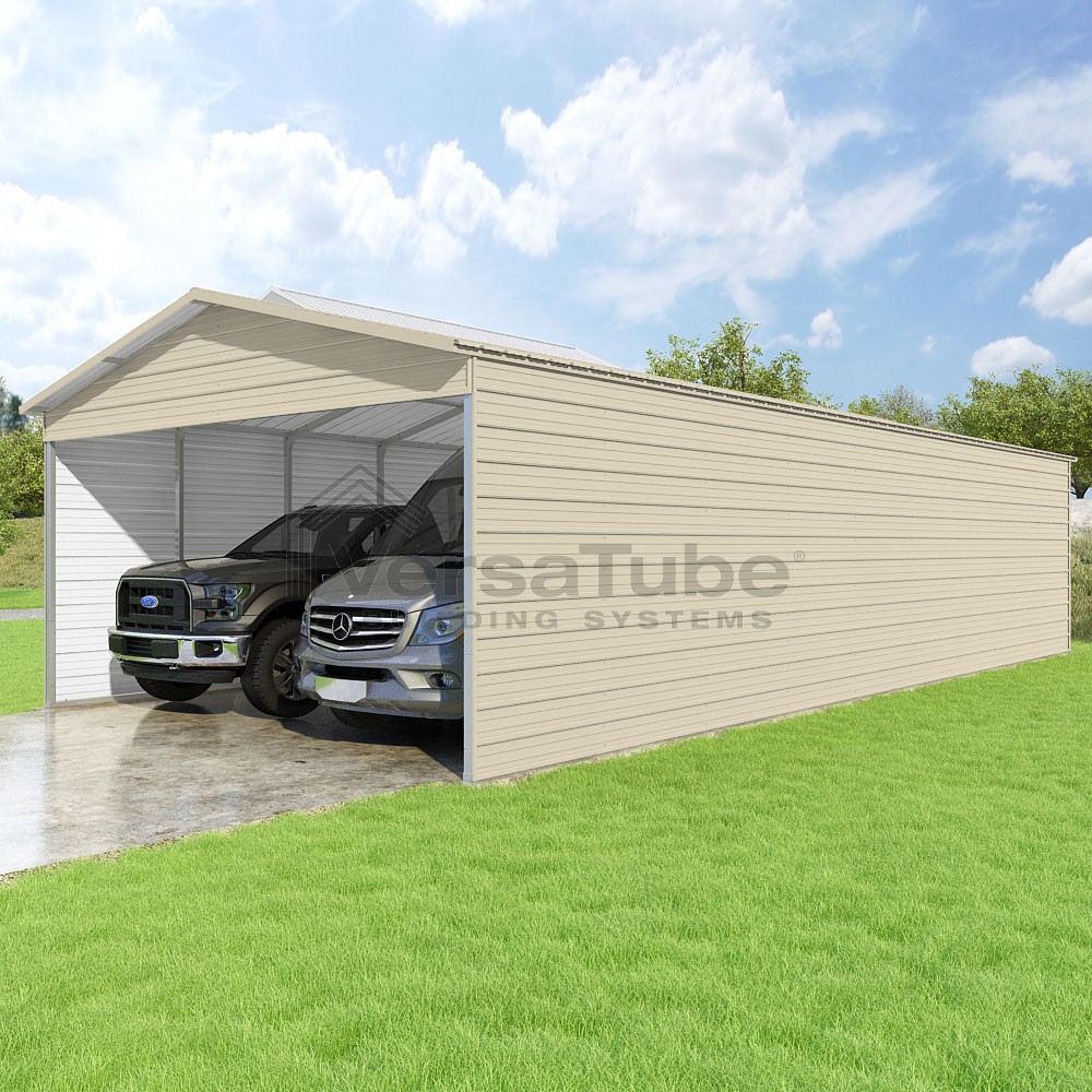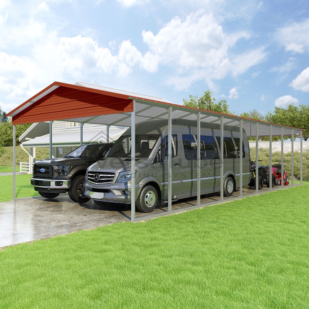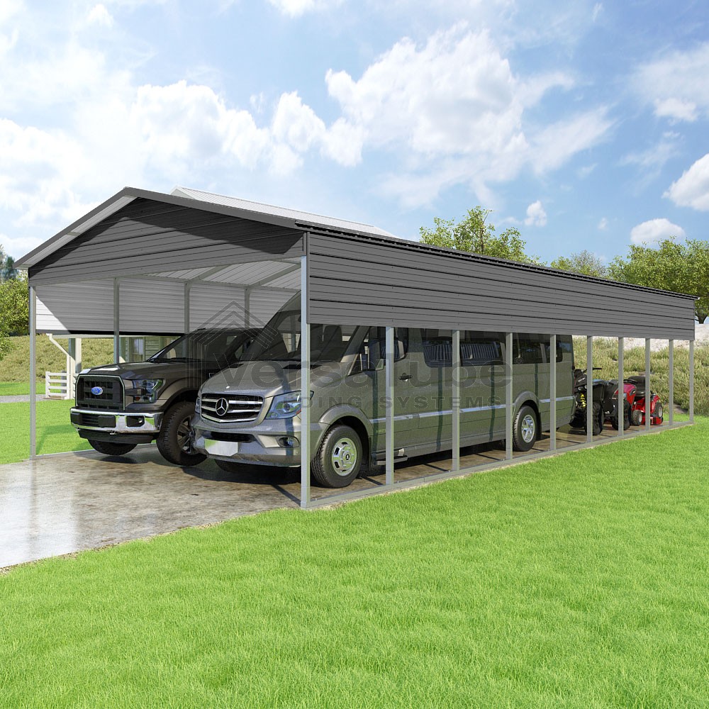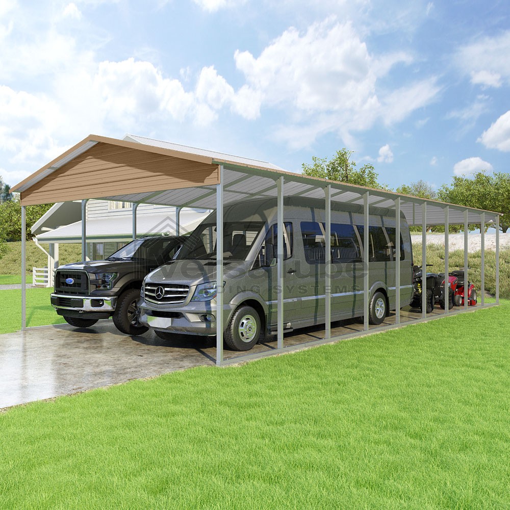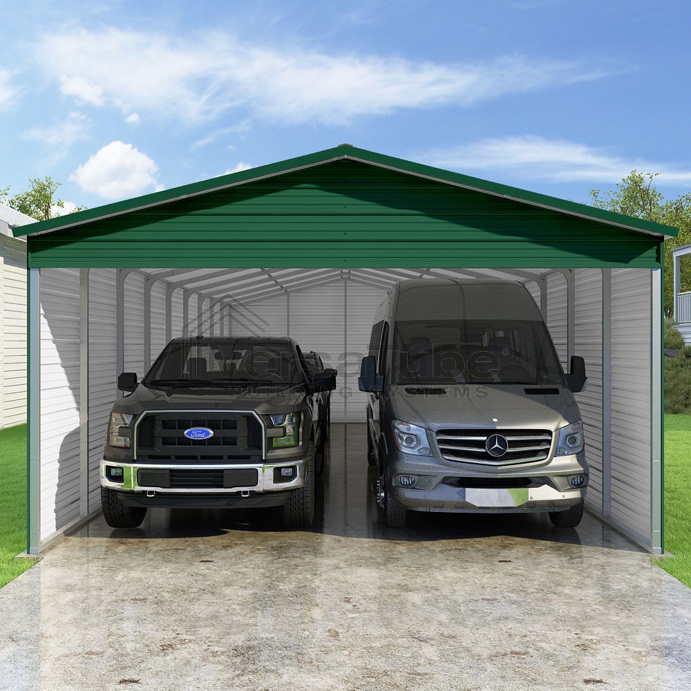 Pinnacle Series DIY carport kit features vertical sheet metal roof panels with ridge cap, gable and eave trim for an A-frame roof style and extended coverage on both ends.