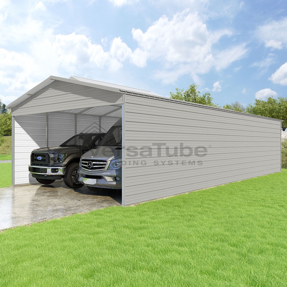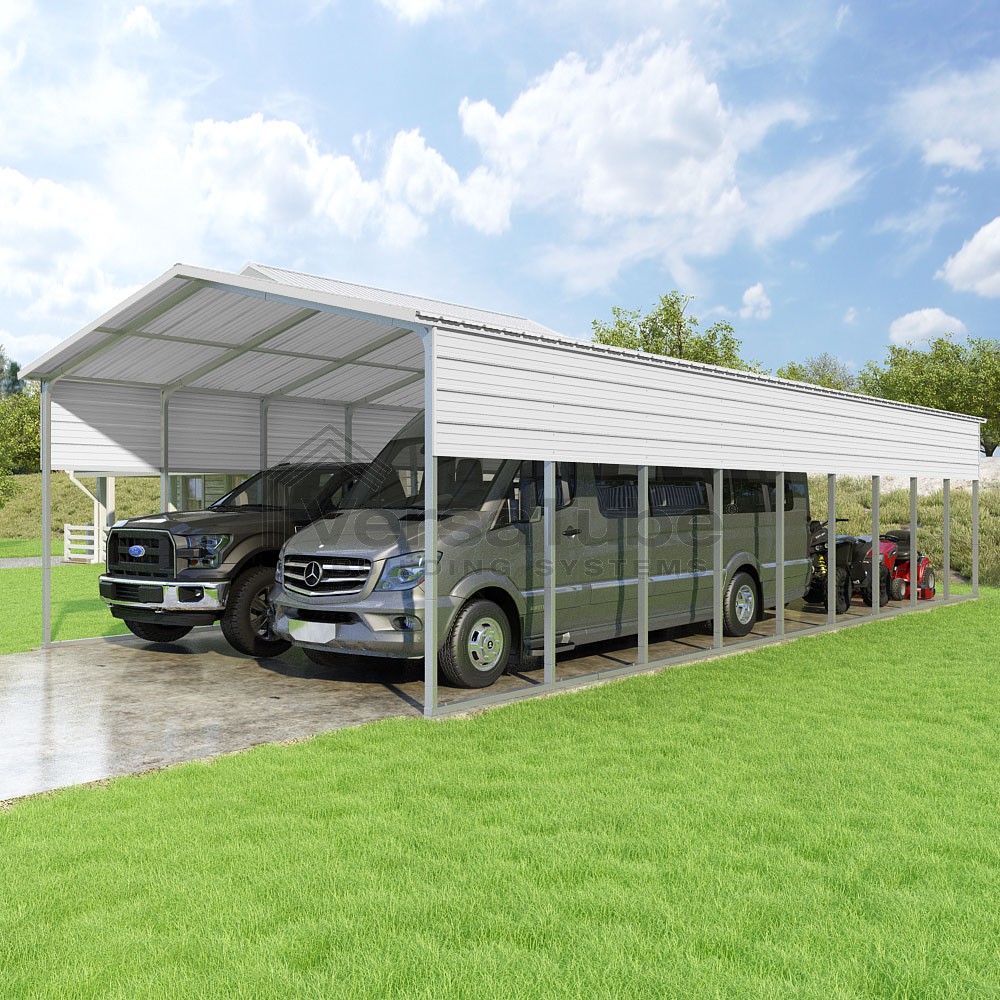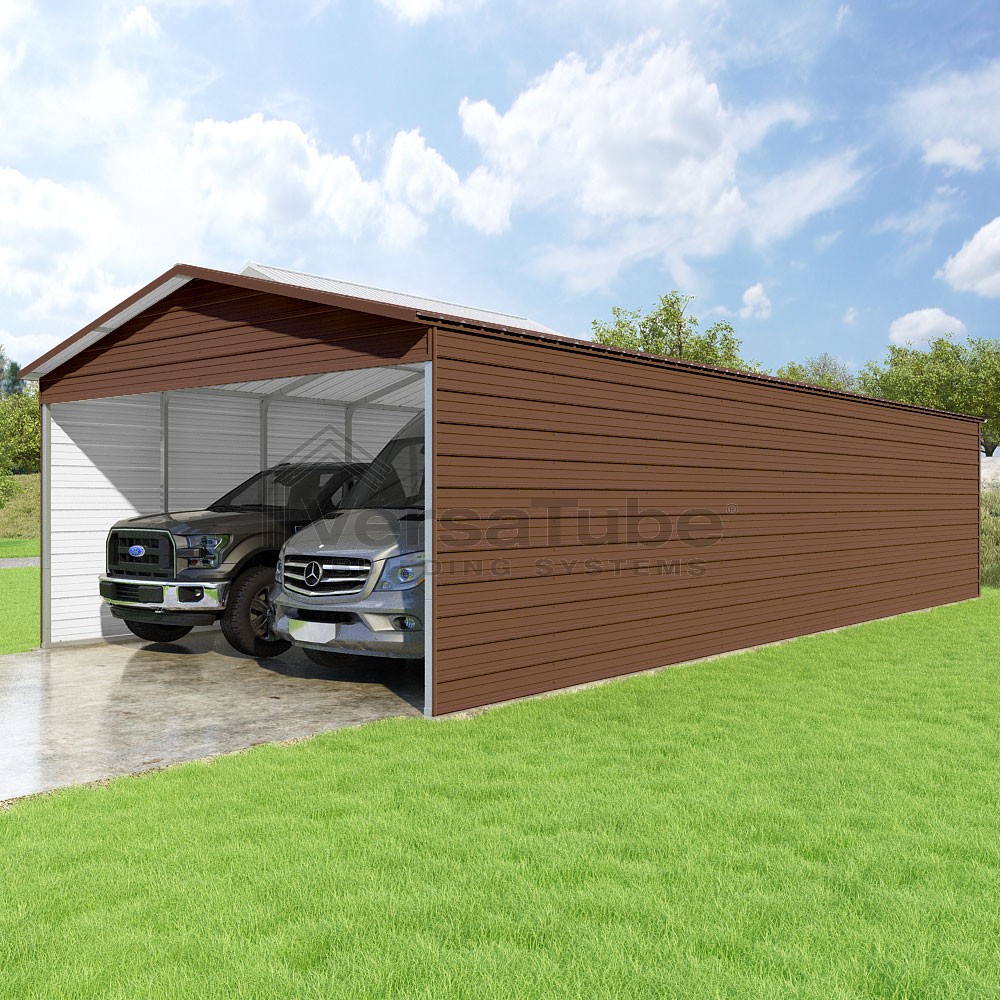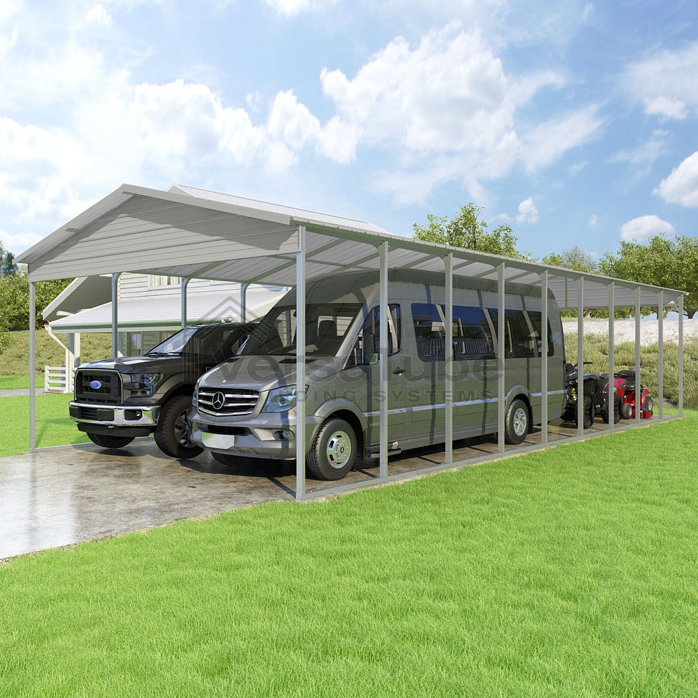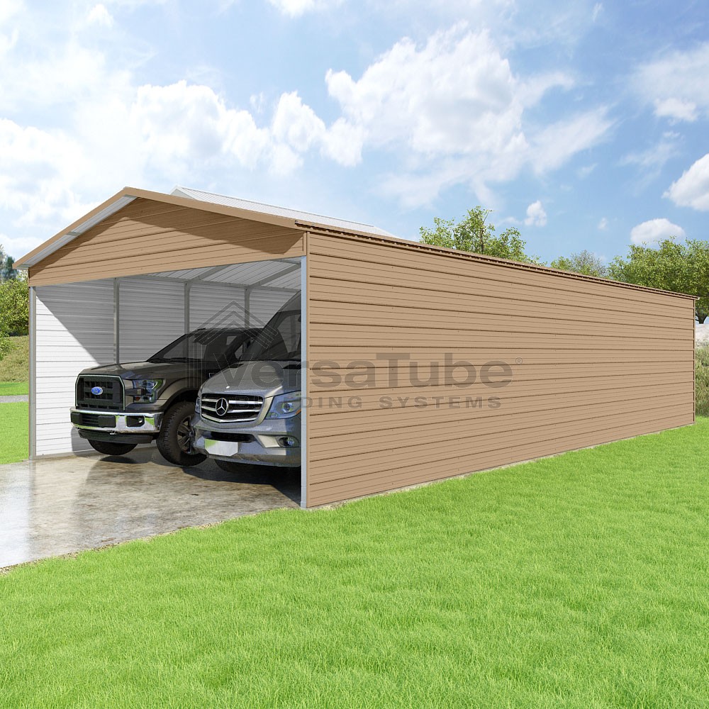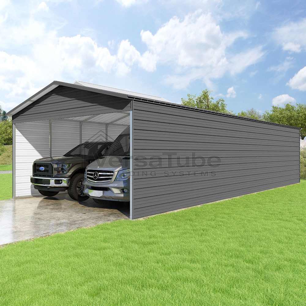 Pinnacle Series DIY carport kit features vertical sheet metal roof panels with ridge cap, gable and eave trim for an A-frame roof style and extended coverage on both ends.