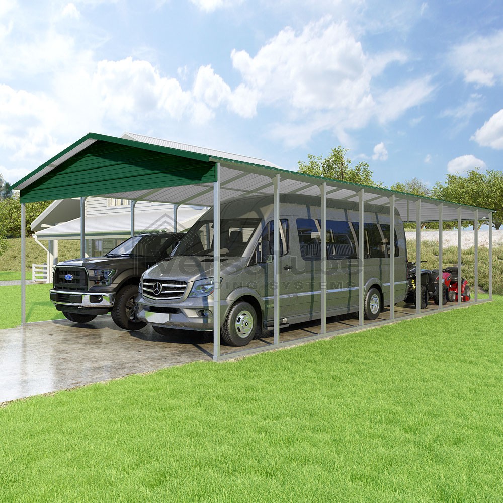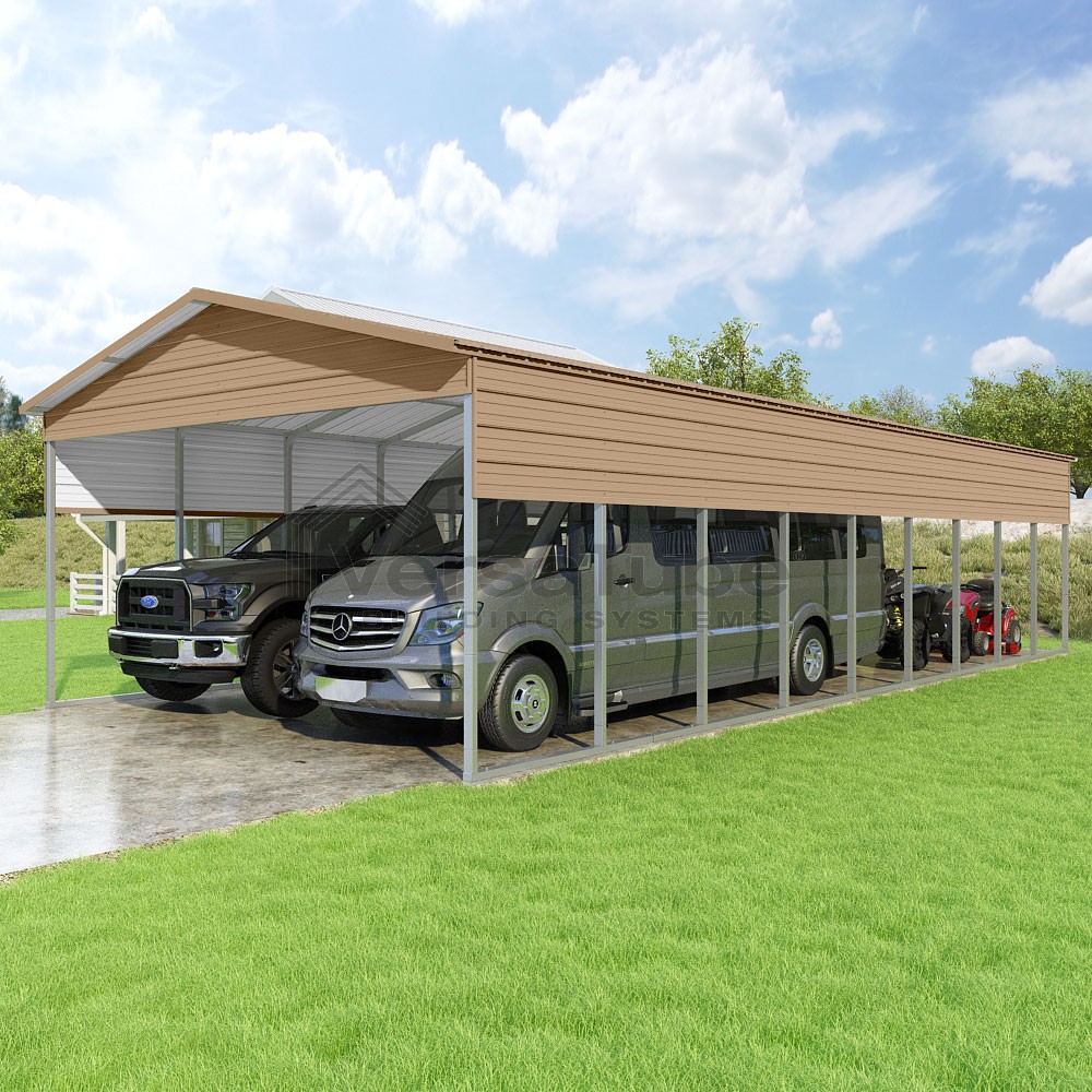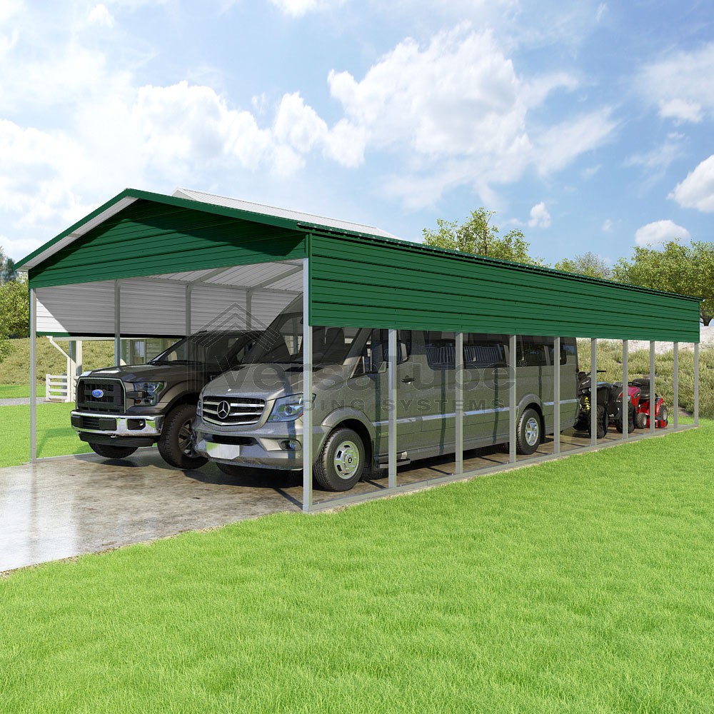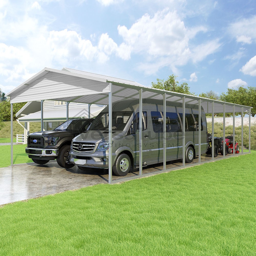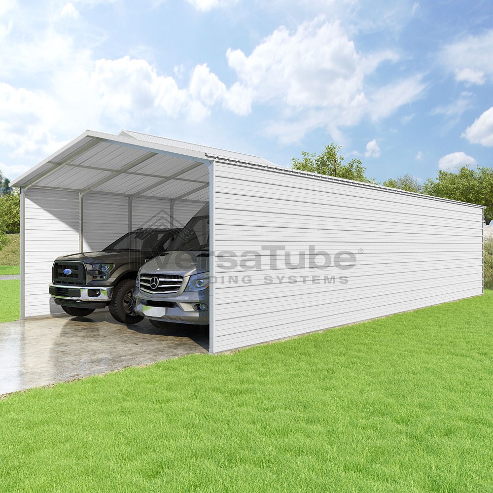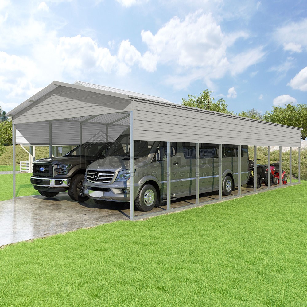 Pinnacle Series DIY carport kit features vertical sheet metal roof panels with ridge cap, gable and eave trim for an A-frame roof style and extended coverage on both ends.
