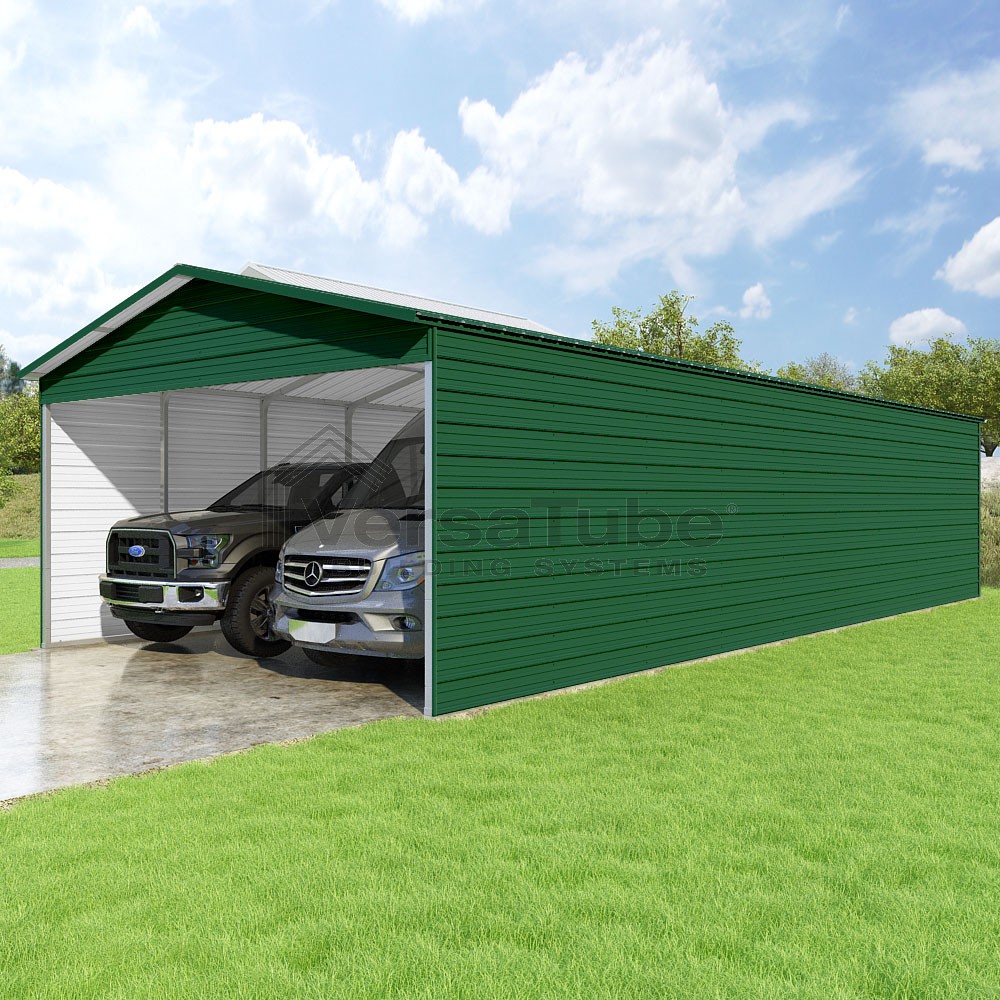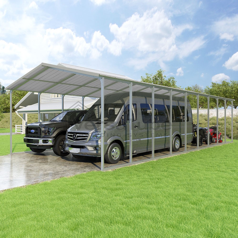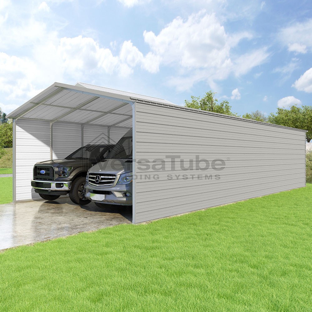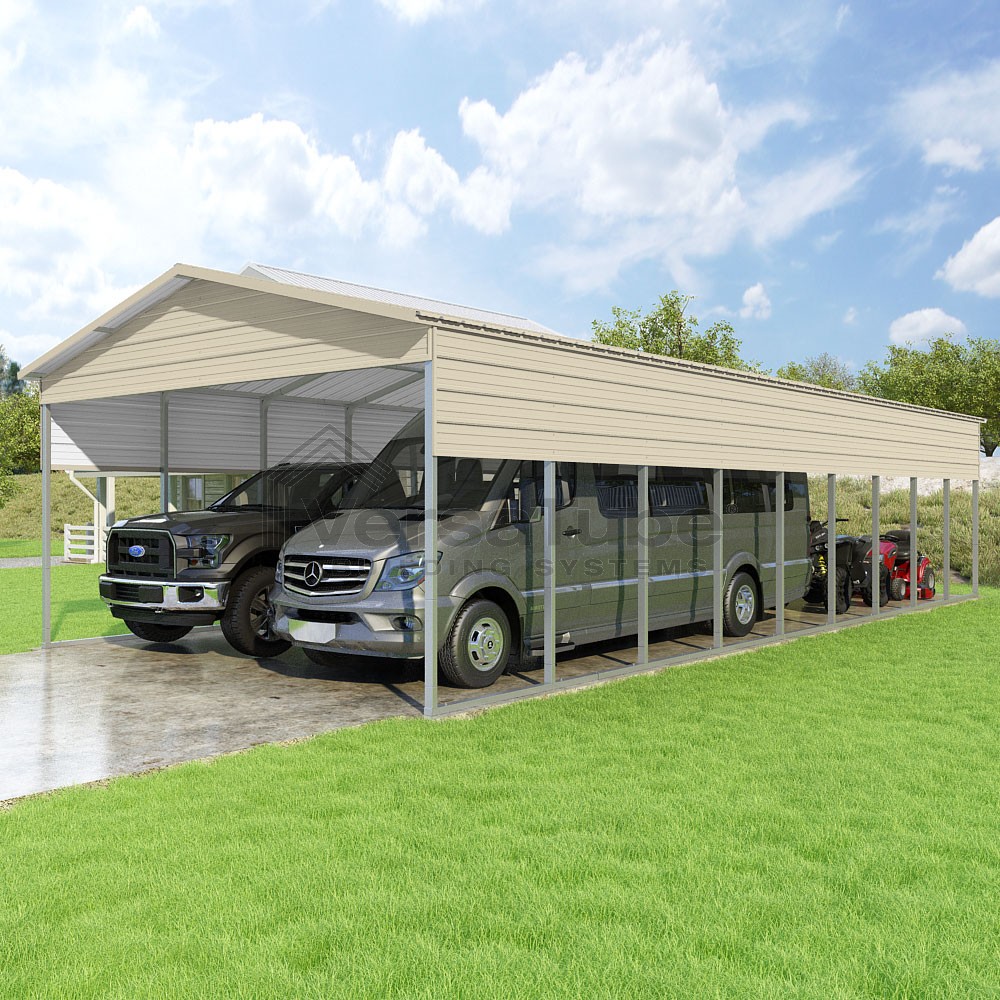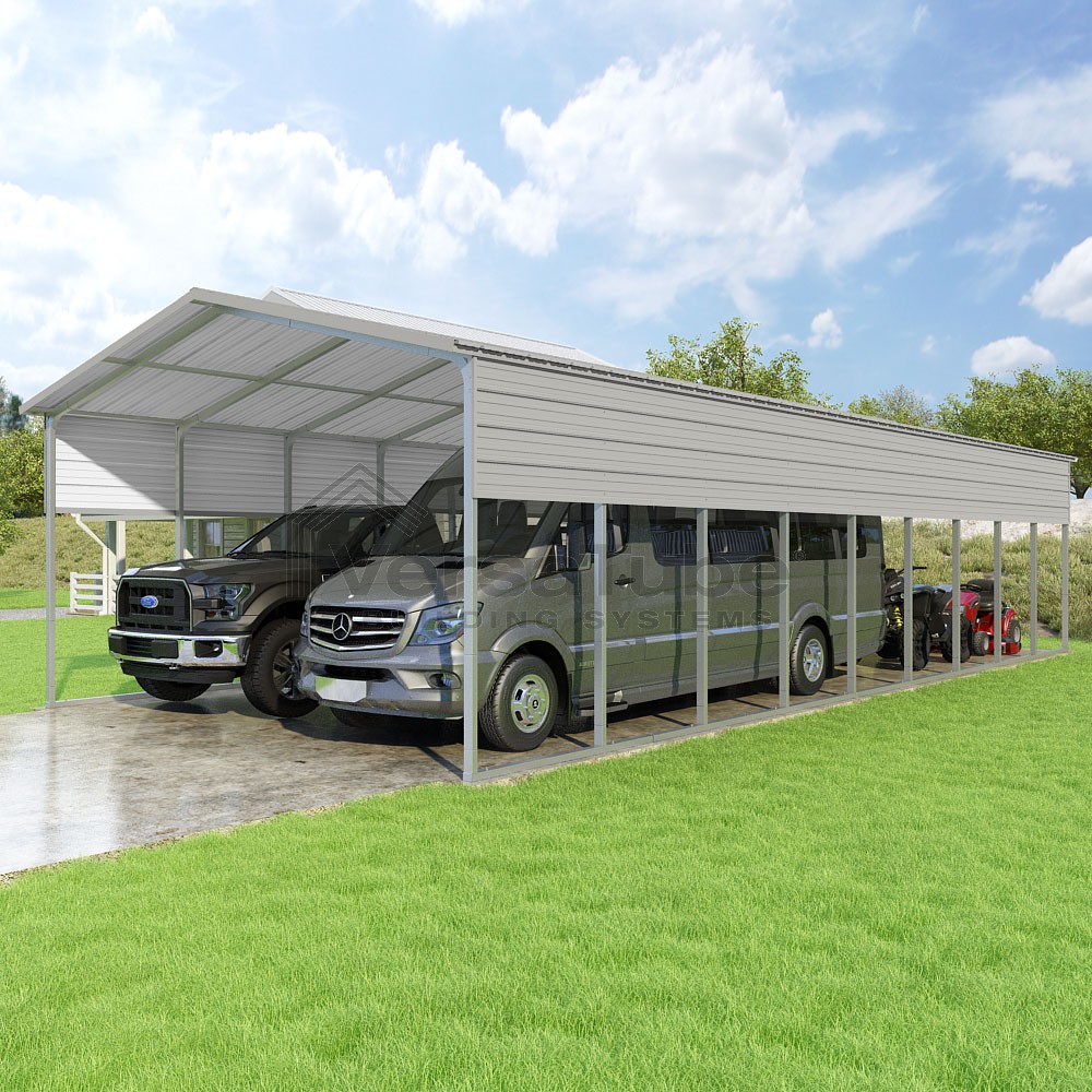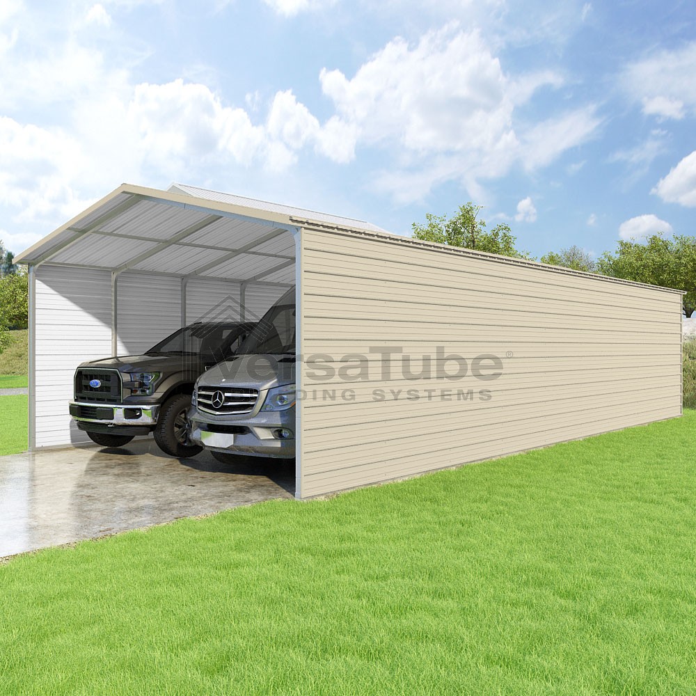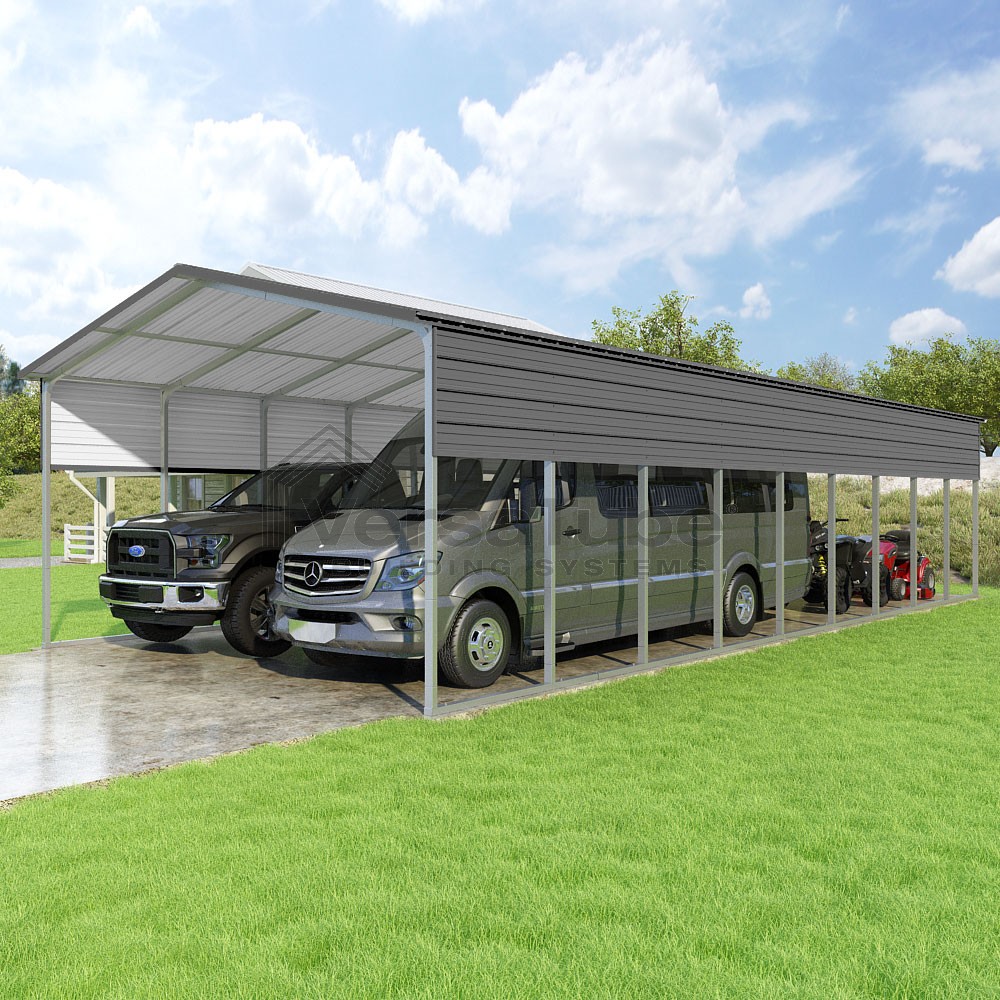 Pinnacle Series DIY carport kit features vertical sheet metal roof panels with ridge cap, gable and eave trim for an A-frame roof style and extended coverage on both ends.