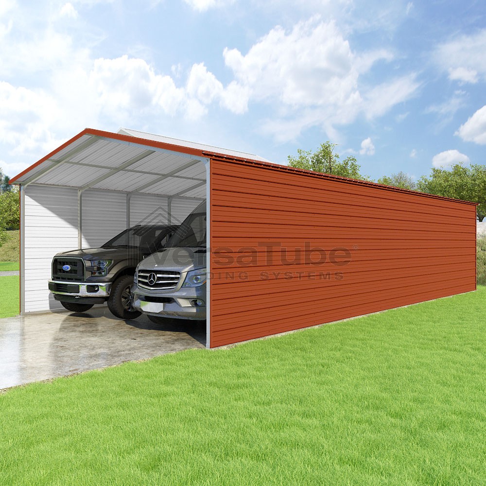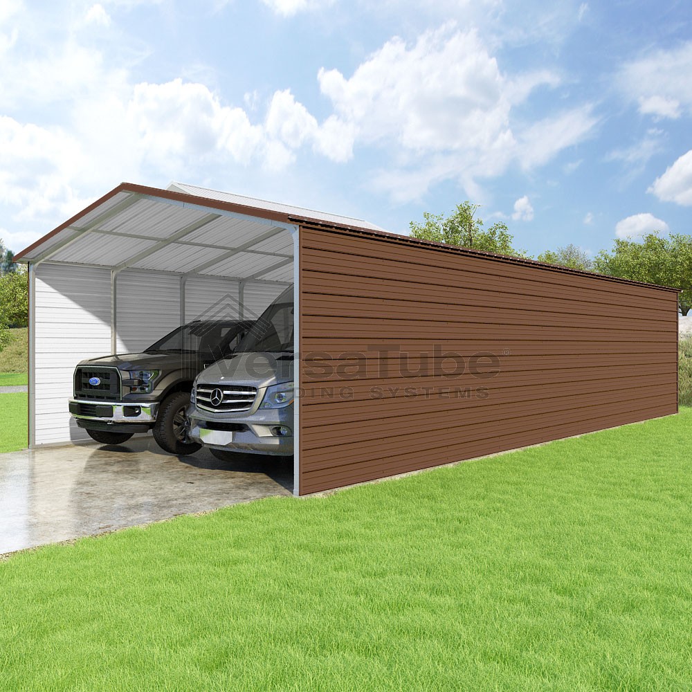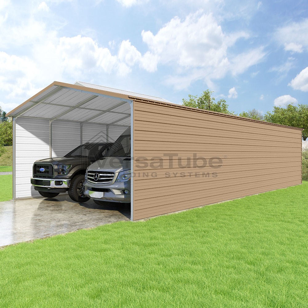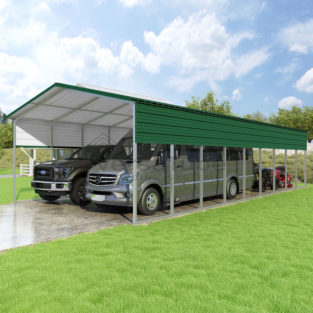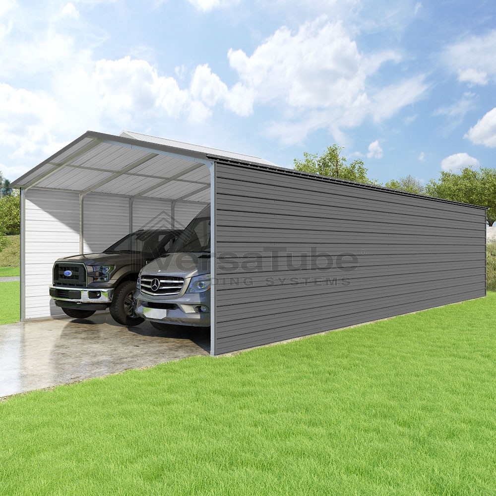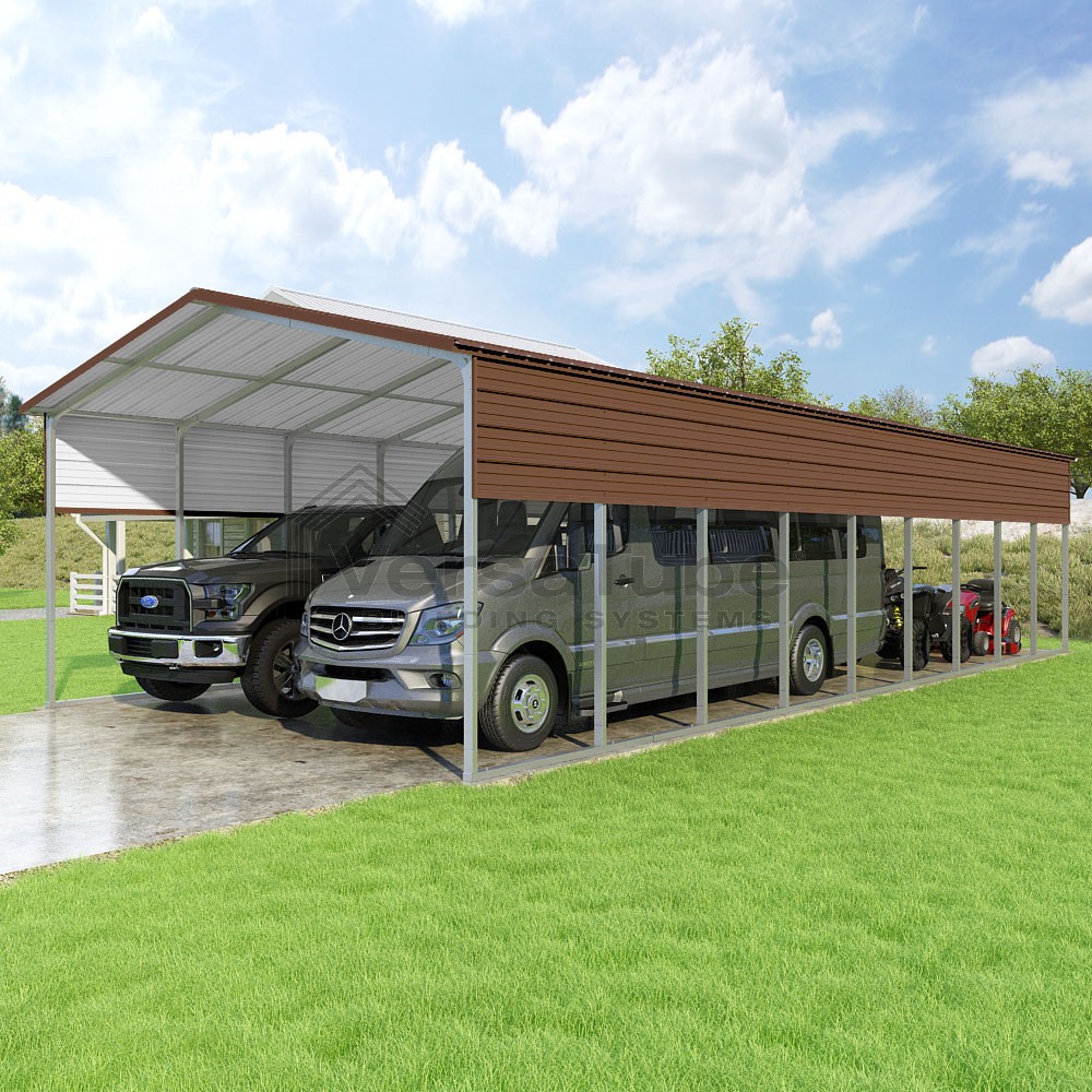 Pinnacle Series DIY carport kit features vertical sheet metal roof panels with ridge cap, gable and eave trim for an A-frame roof style and extended coverage on both ends.