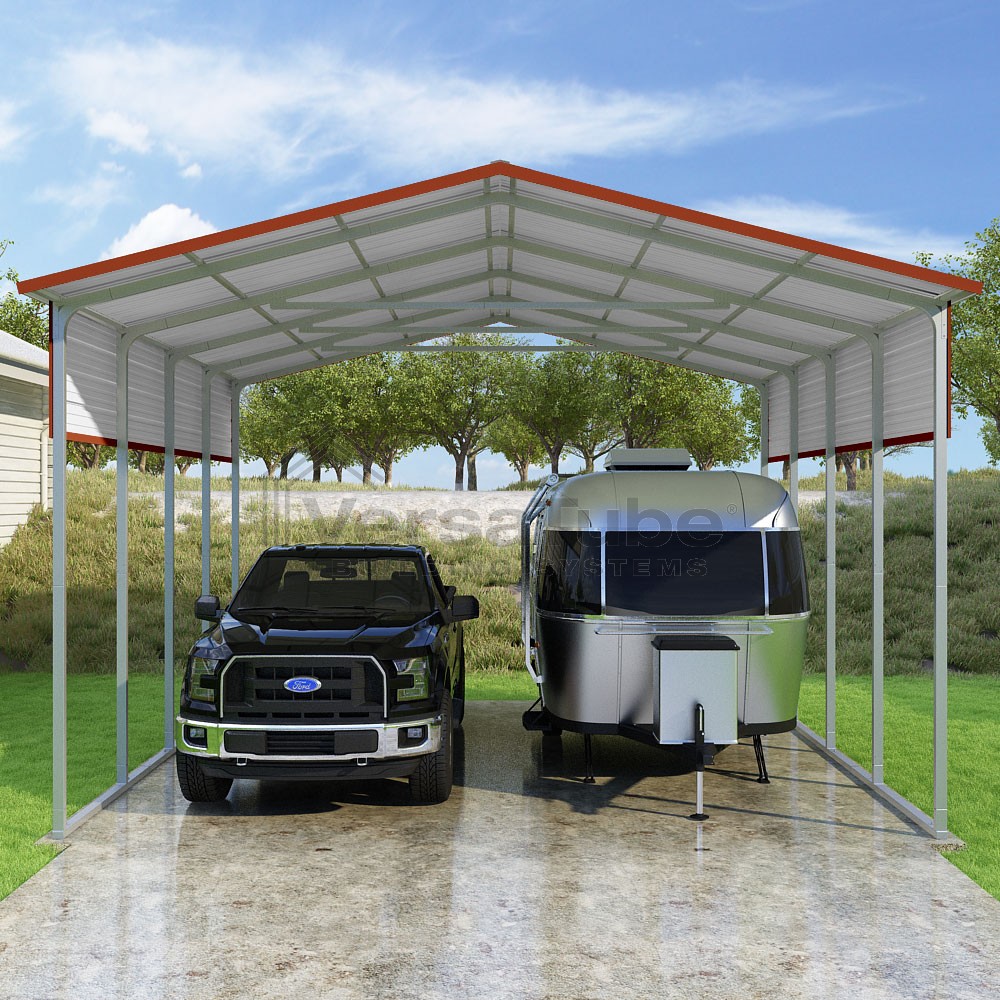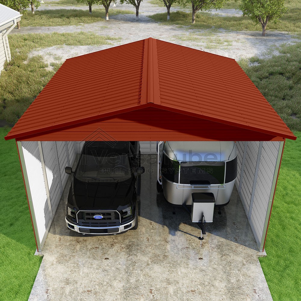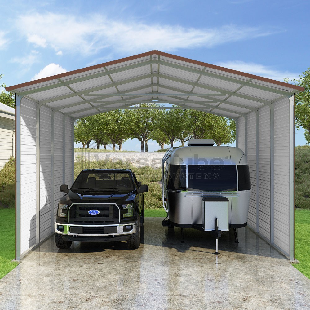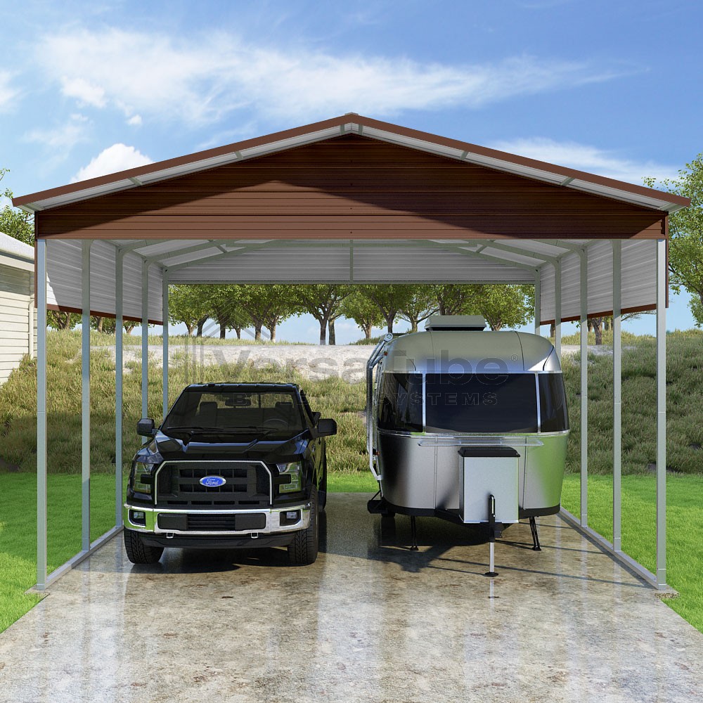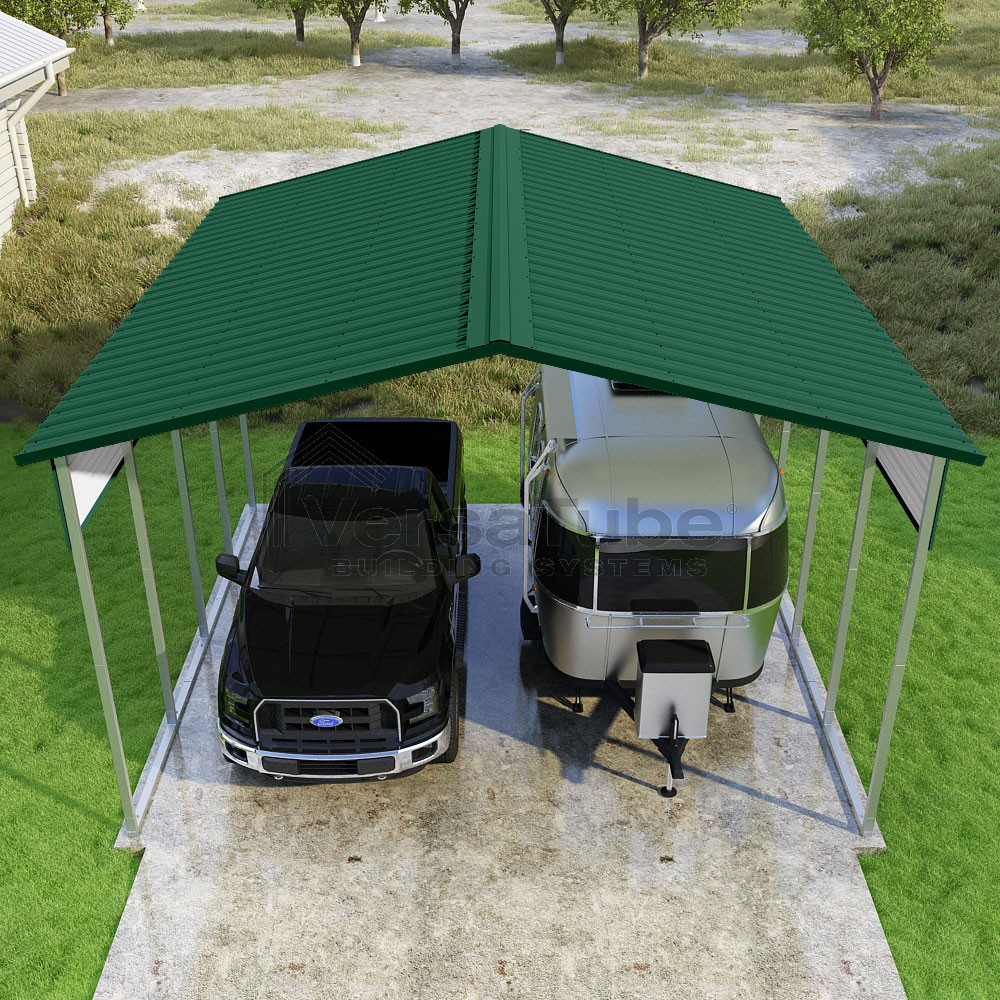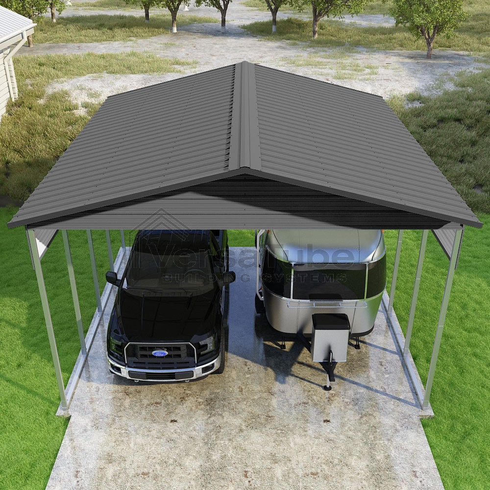 Pinnacle Series DIY carport kit features vertical sheet metal roof panels with ridge cap, gable and eave trim for an A-frame roof style and extended coverage on both ends.