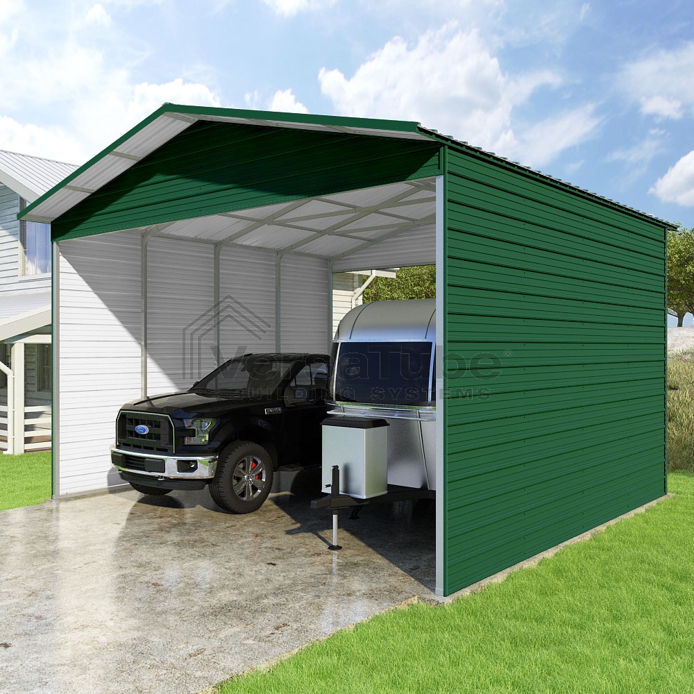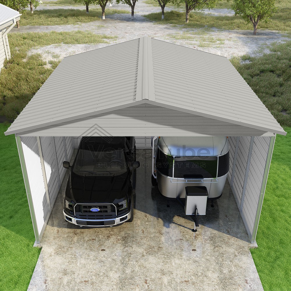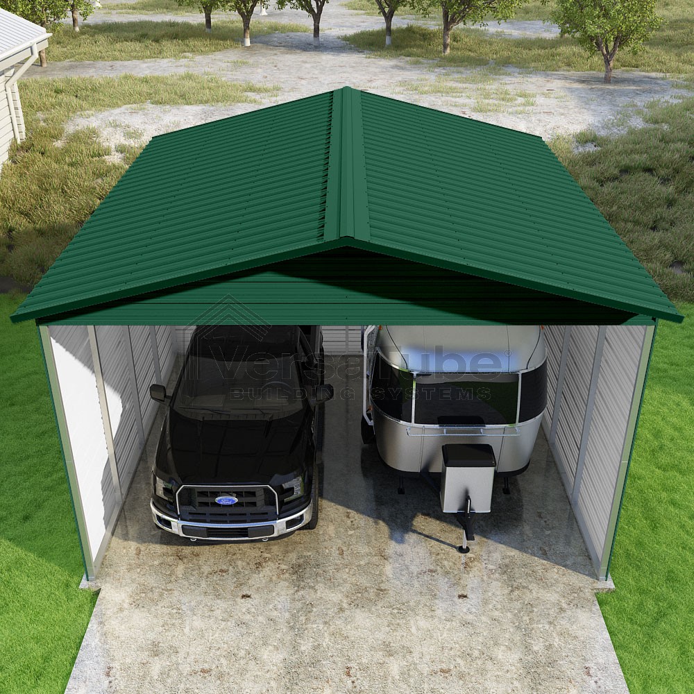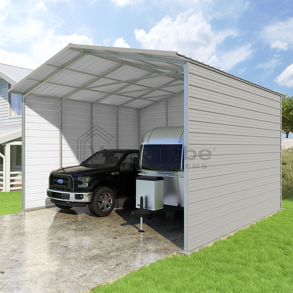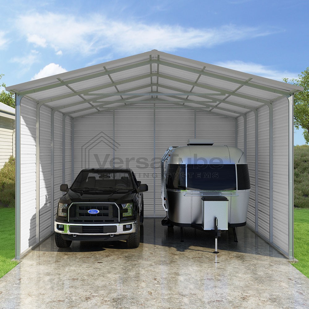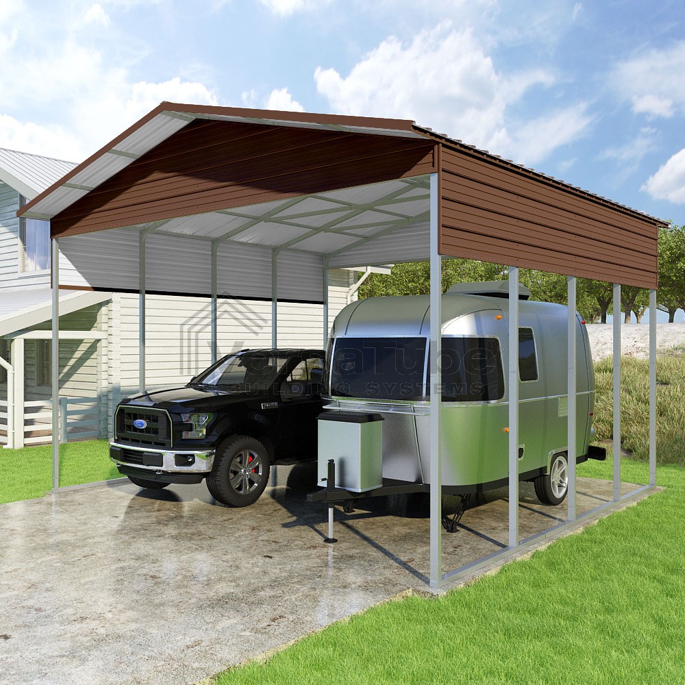 Pinnacle Series DIY carport kit features vertical sheet metal roof panels with ridge cap, gable and eave trim for an A-frame roof style and extended coverage on both ends.