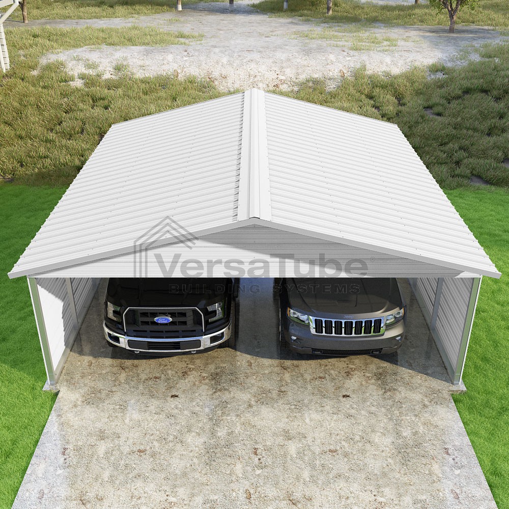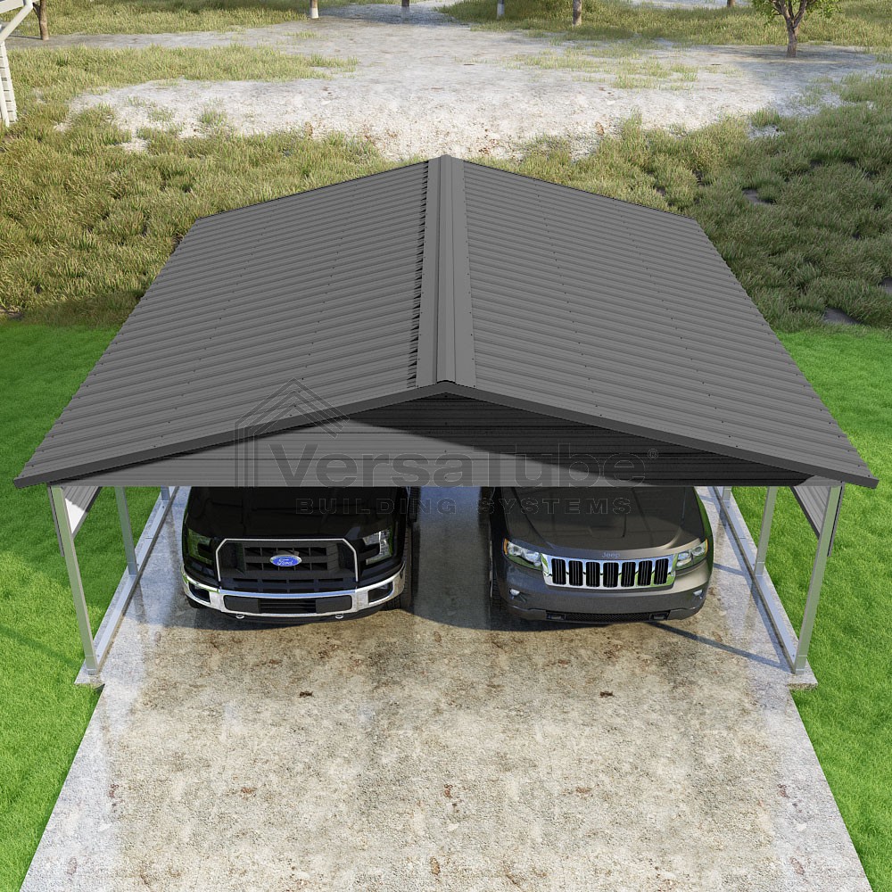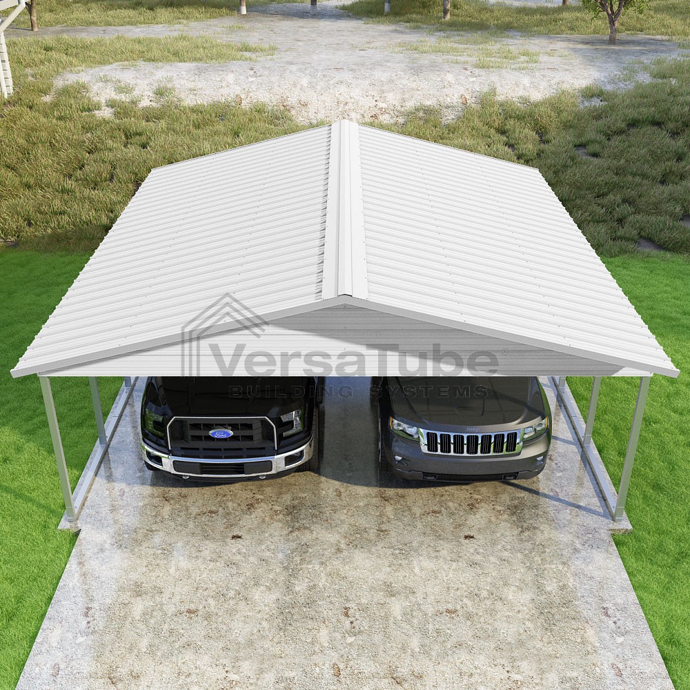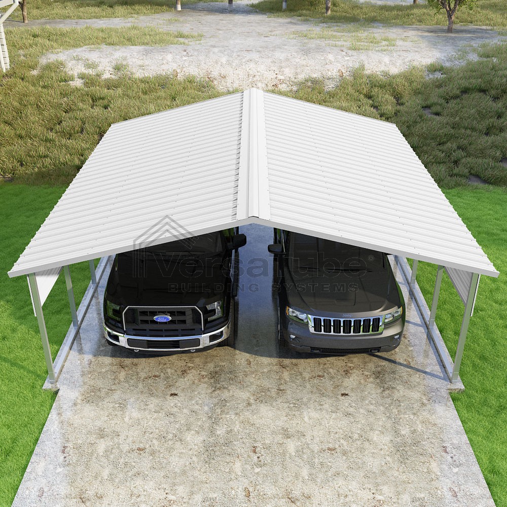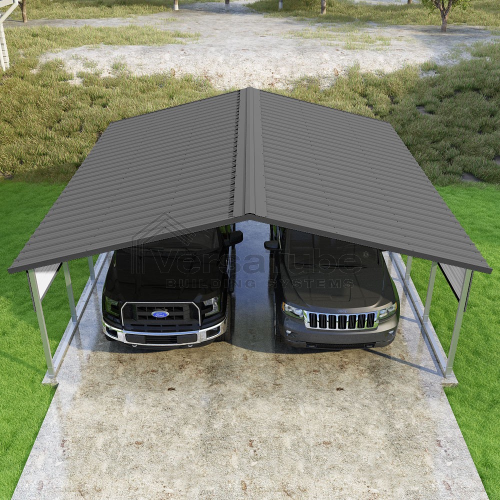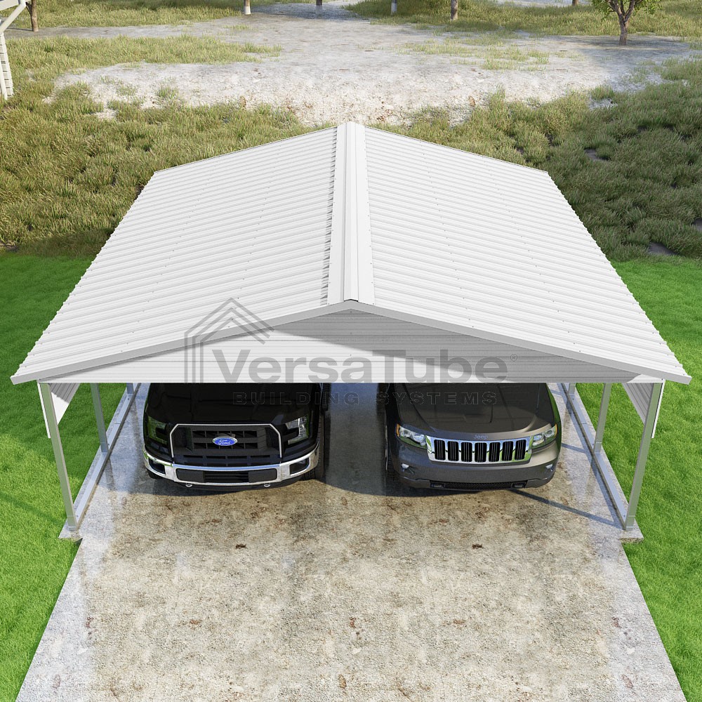 Pinnacle Series DIY carport kit features vertical sheet metal roof panels with ridge cap, gable and eave trim for an A-frame roof style and extended coverage on both ends.