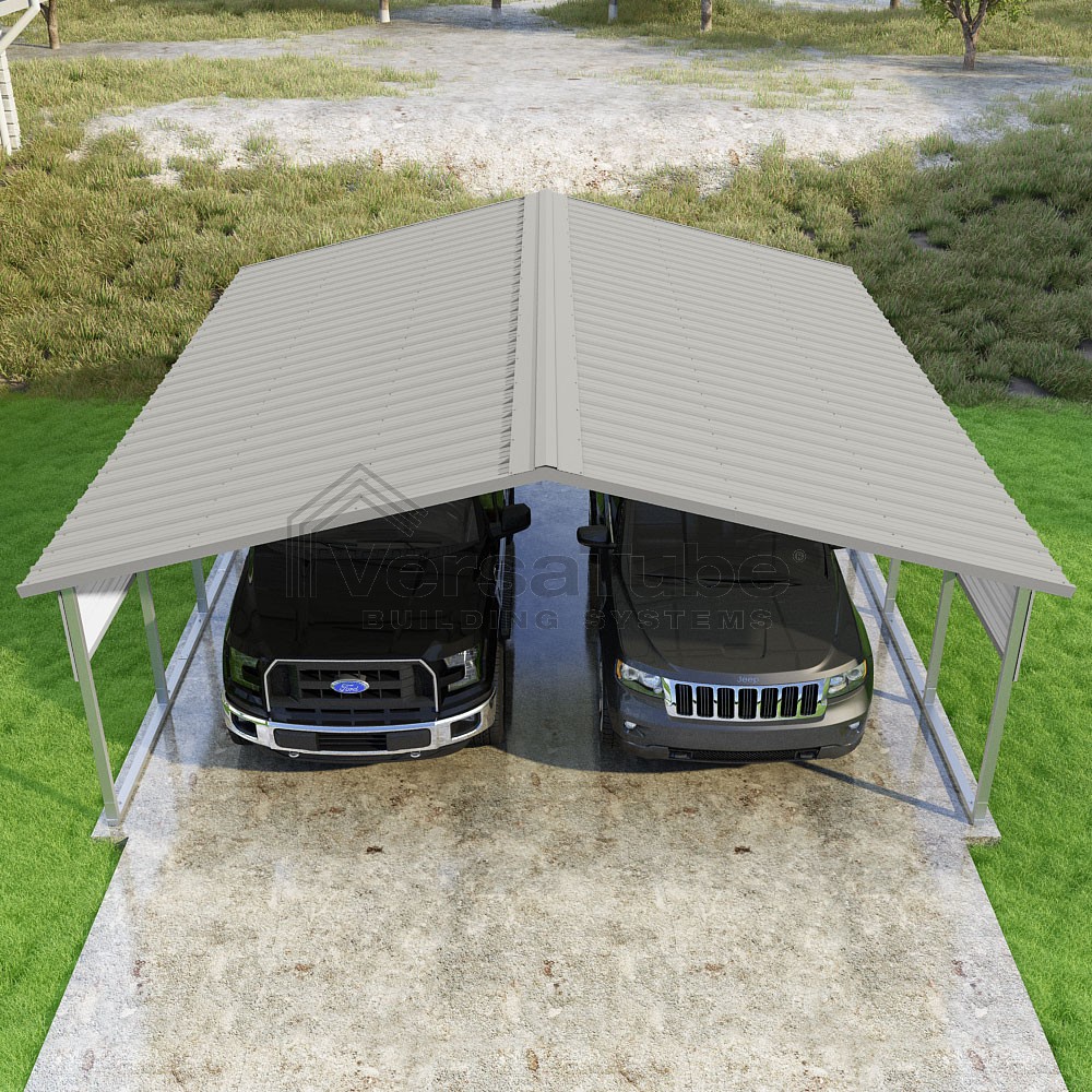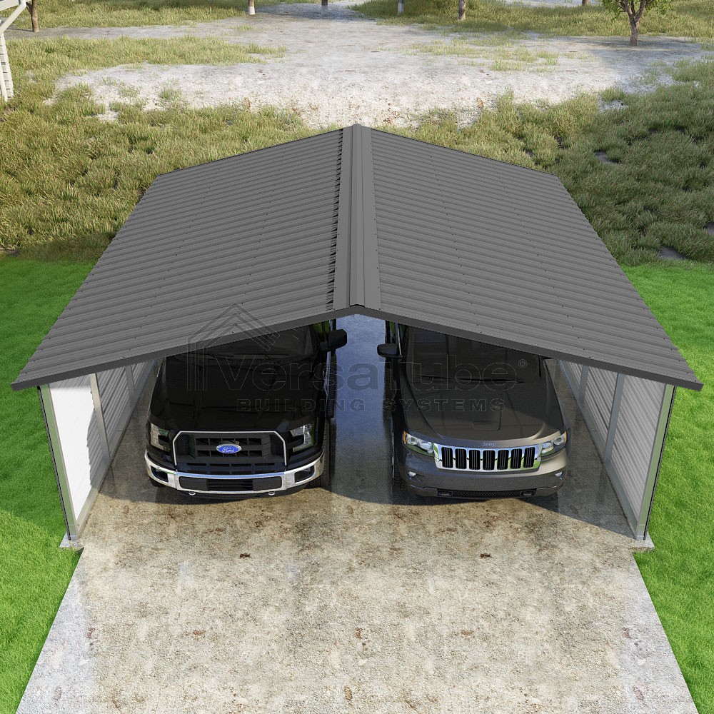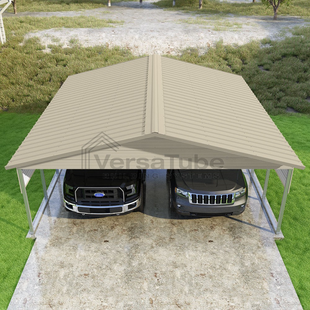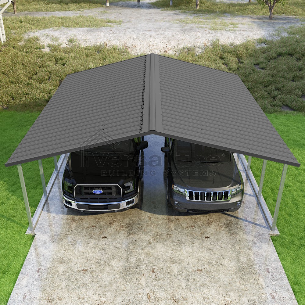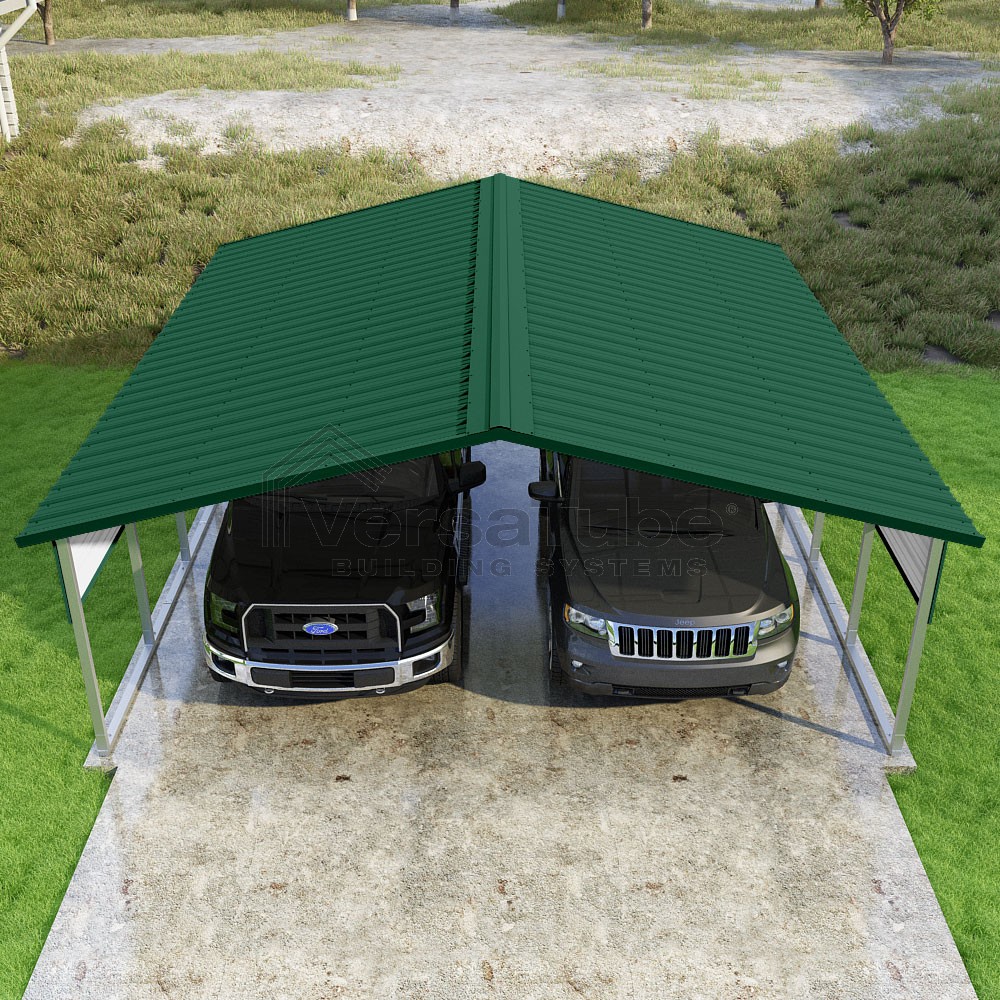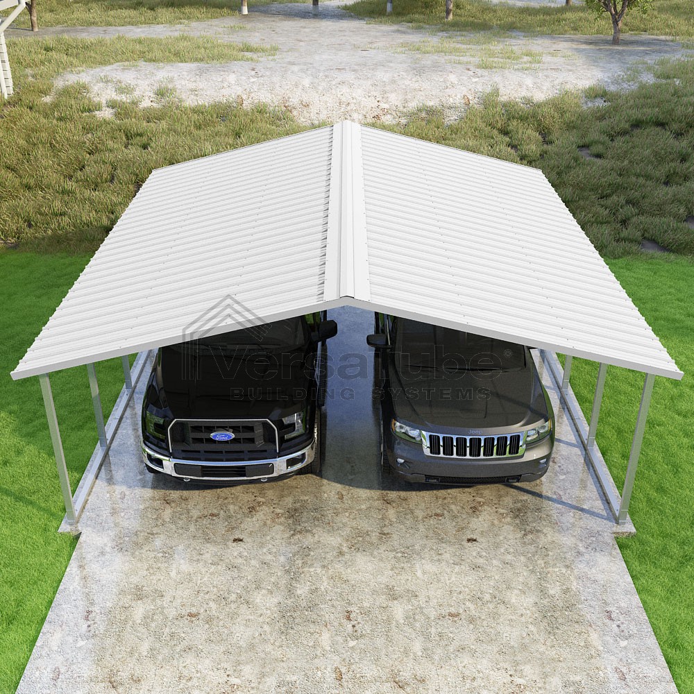 Pinnacle Series DIY carport kit features vertical sheet metal roof panels with ridge cap, gable and eave trim for an A-frame roof style and extended coverage on both ends.