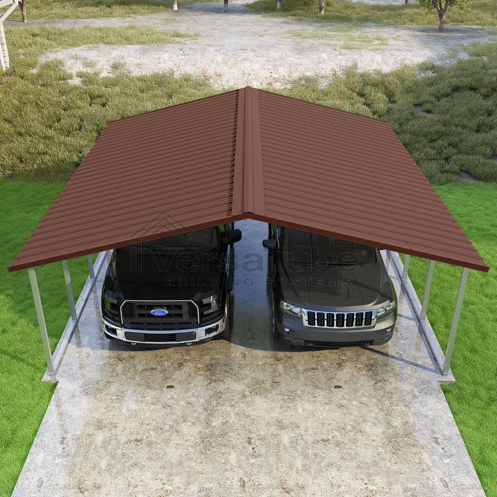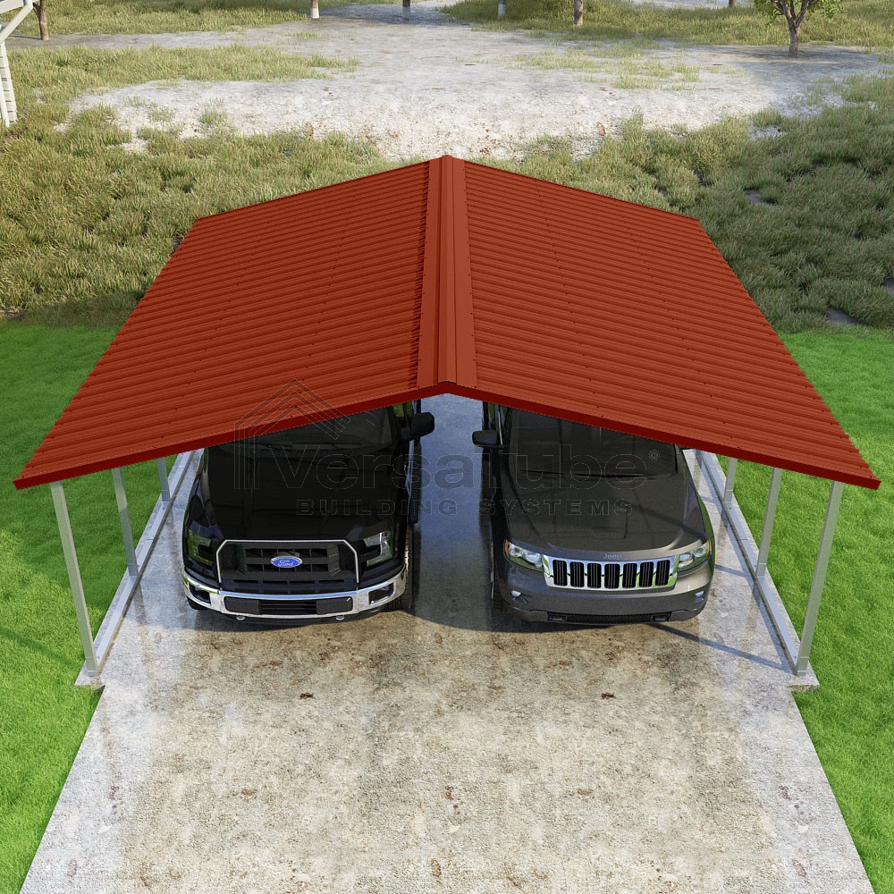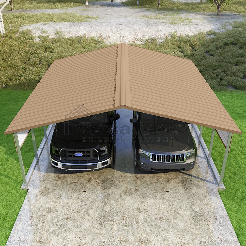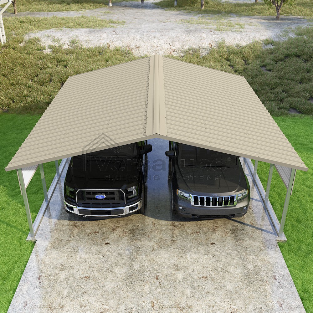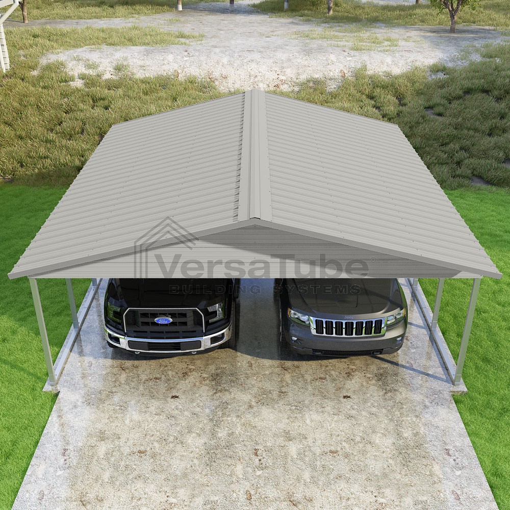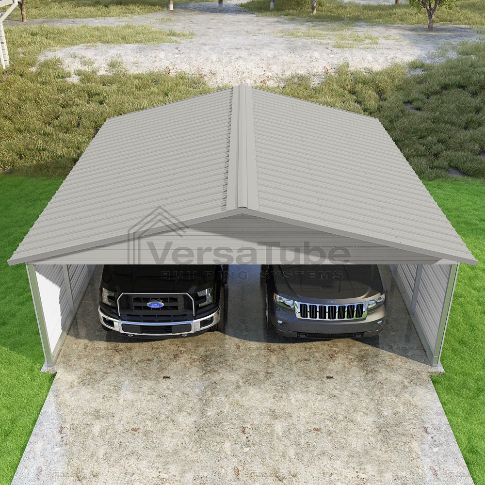Pinnacle Series DIY carport kit features vertical sheet metal roof panels with ridge cap, gable and eave trim for an A-frame roof style and extended coverage on both ends.