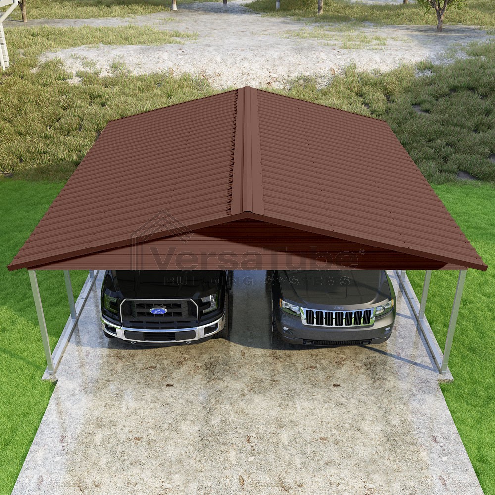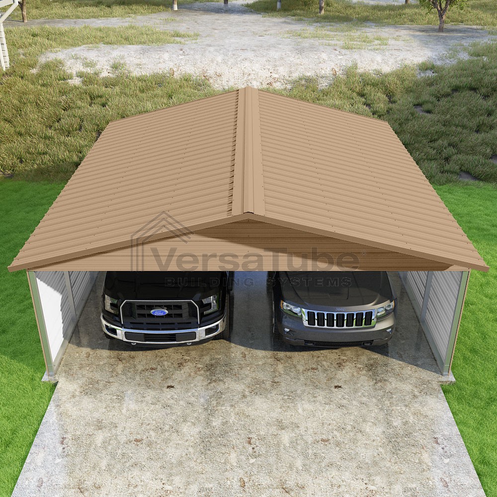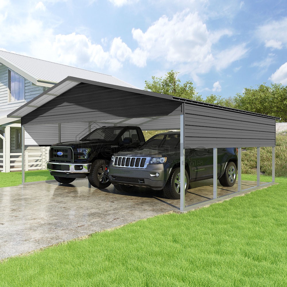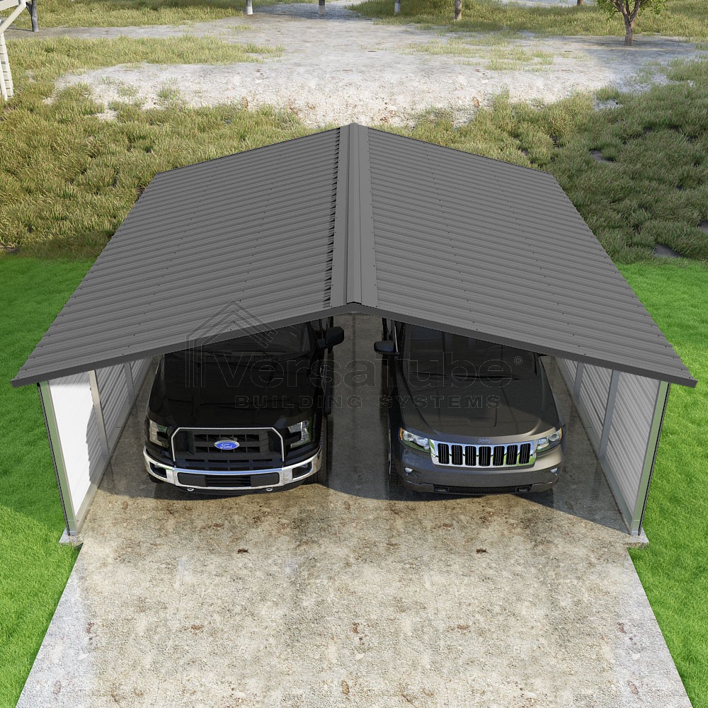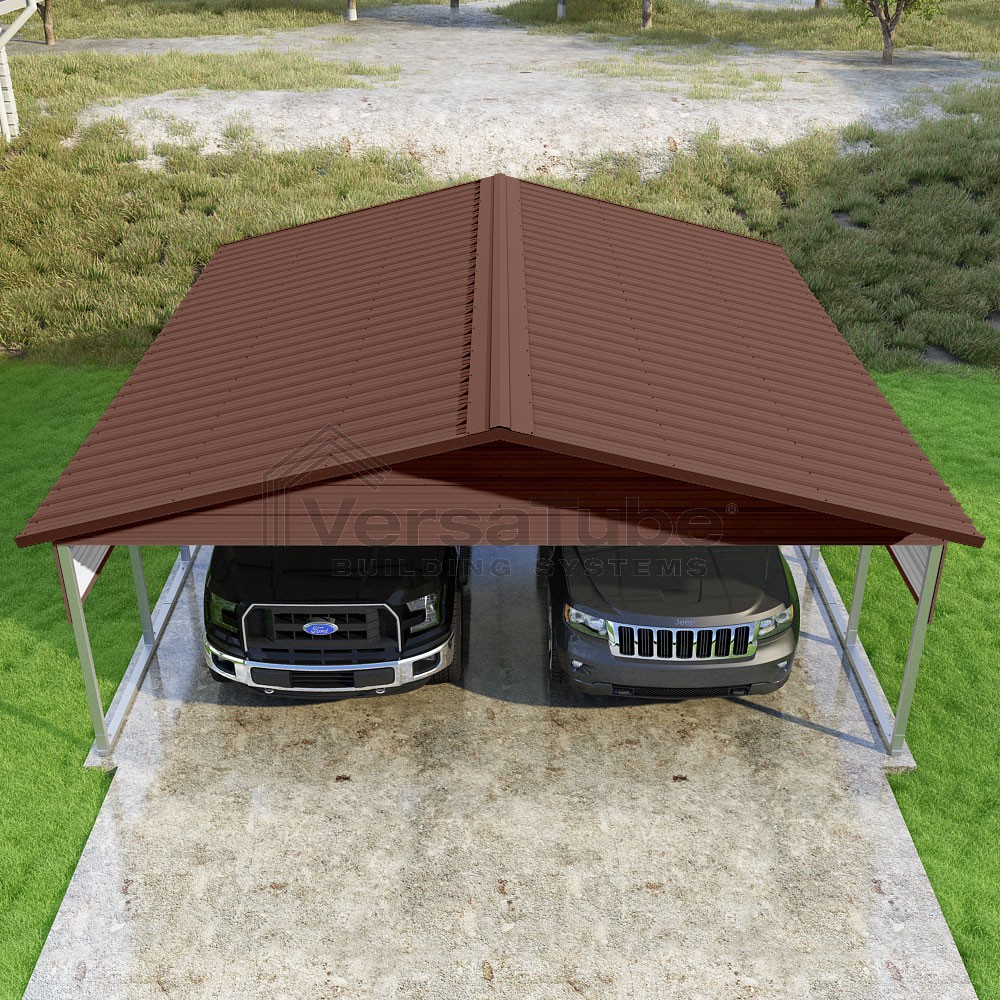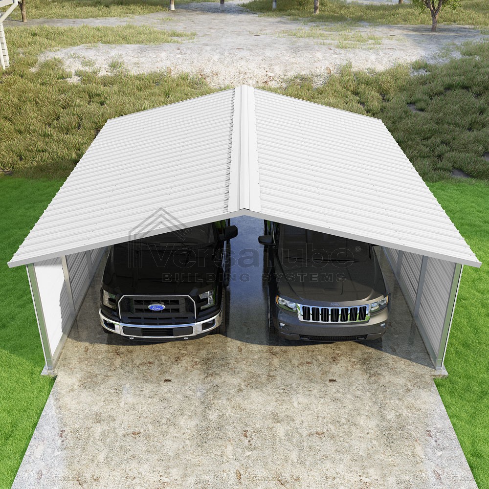 Pinnacle Series DIY carport kit features vertical sheet metal roof panels with ridge cap, gable and eave trim for an A-frame roof style and extended coverage on both ends.