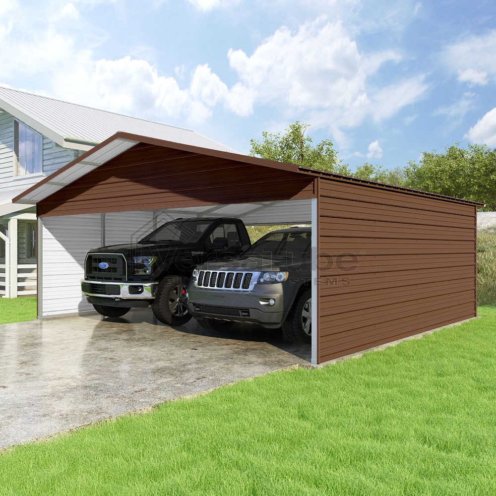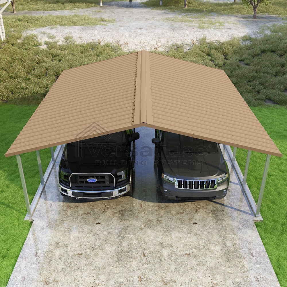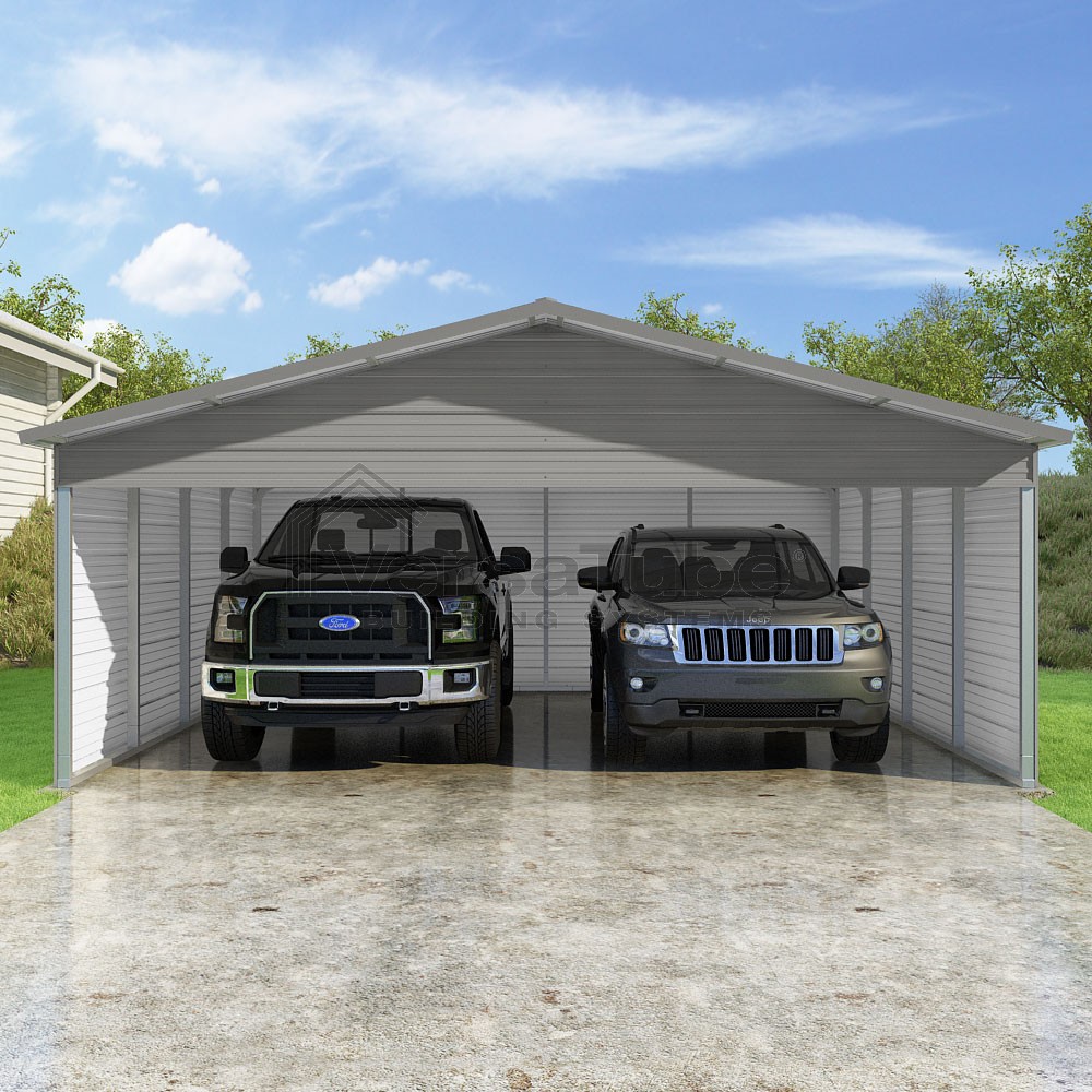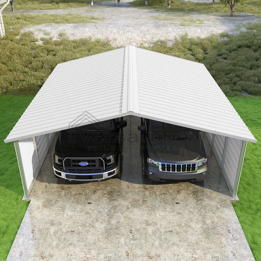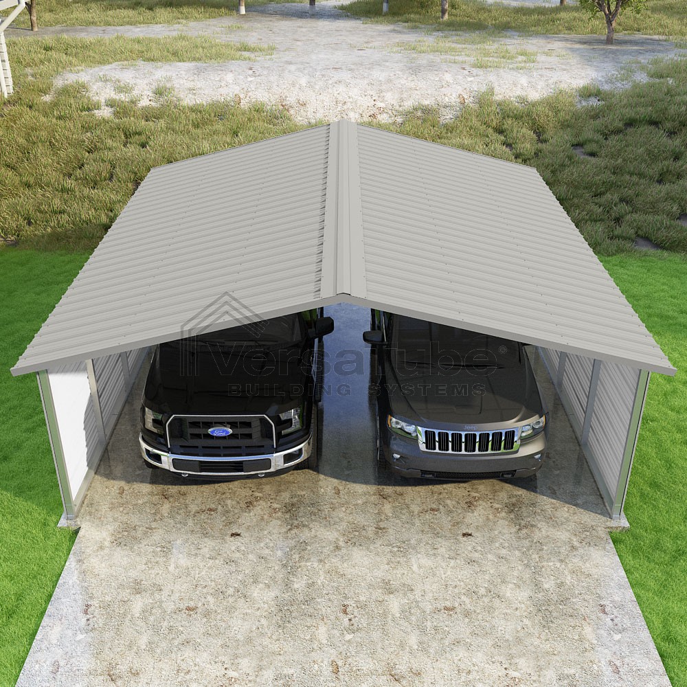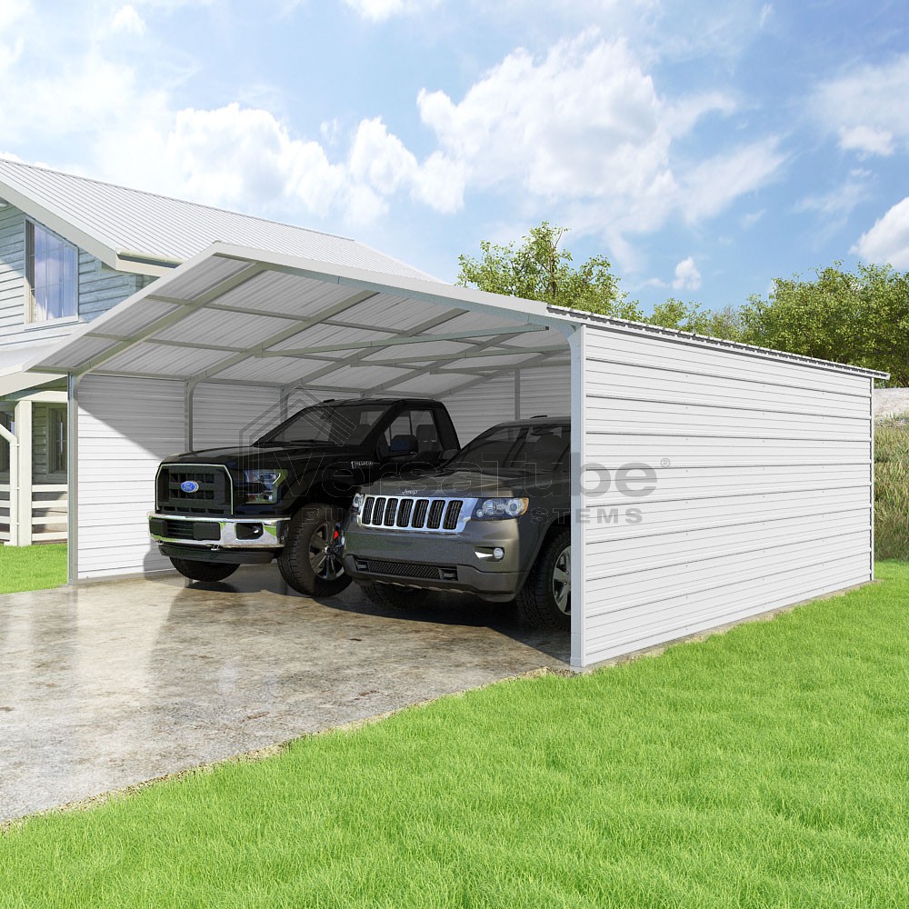 Pinnacle Series DIY carport kit features vertical sheet metal roof panels with ridge cap, gable and eave trim for an A-frame roof style and extended coverage on both ends.