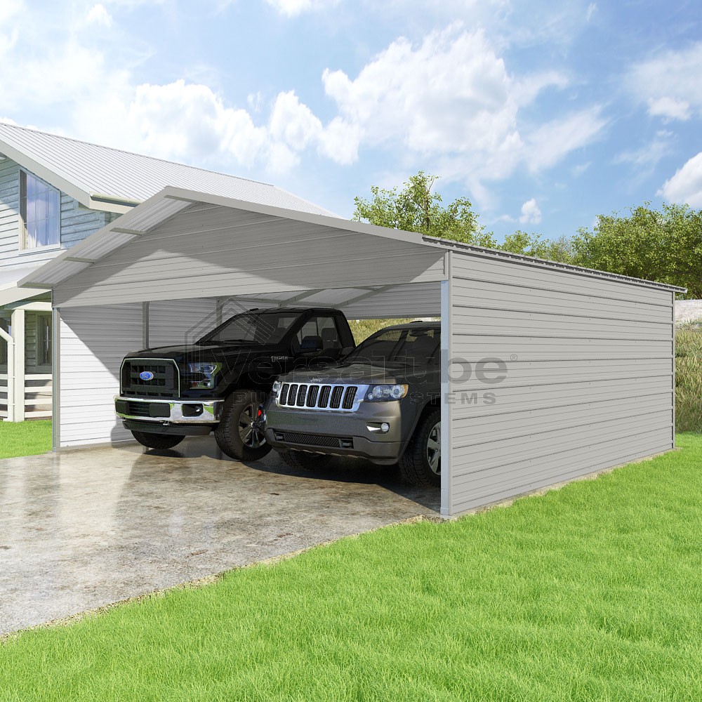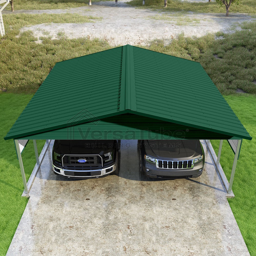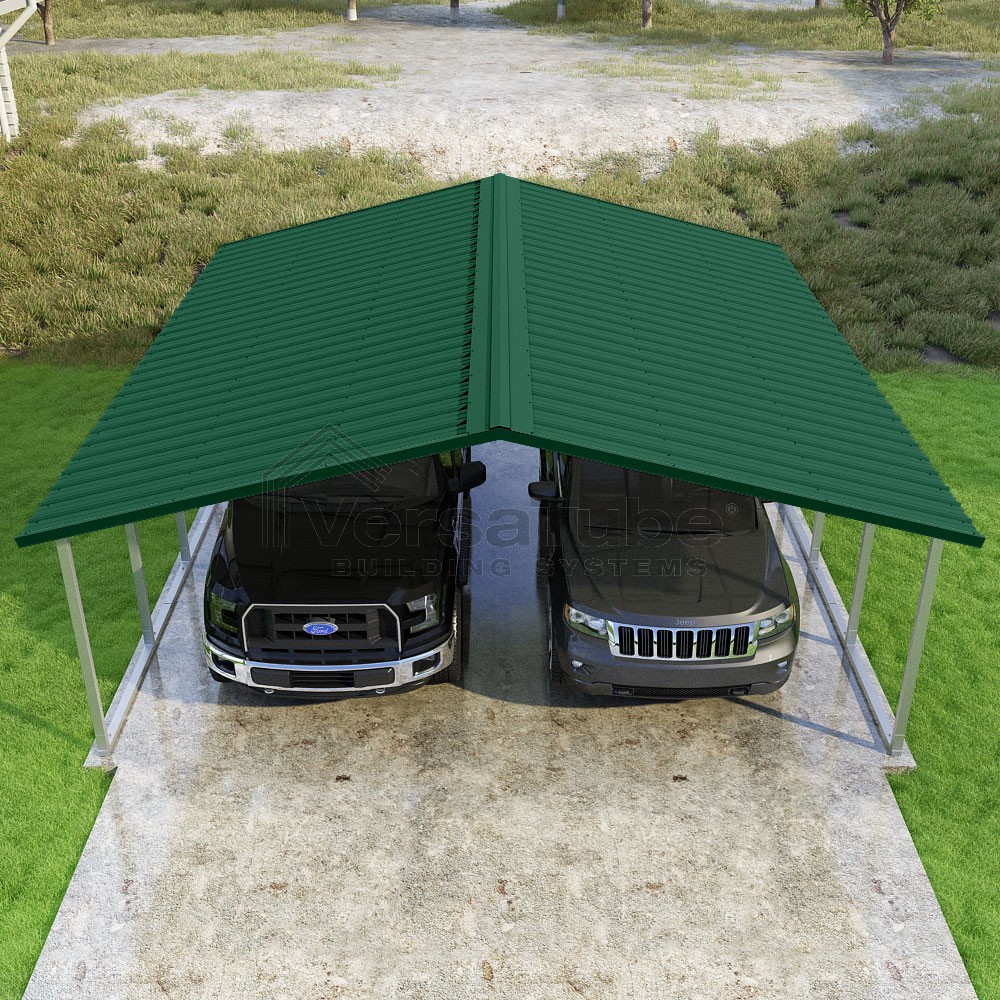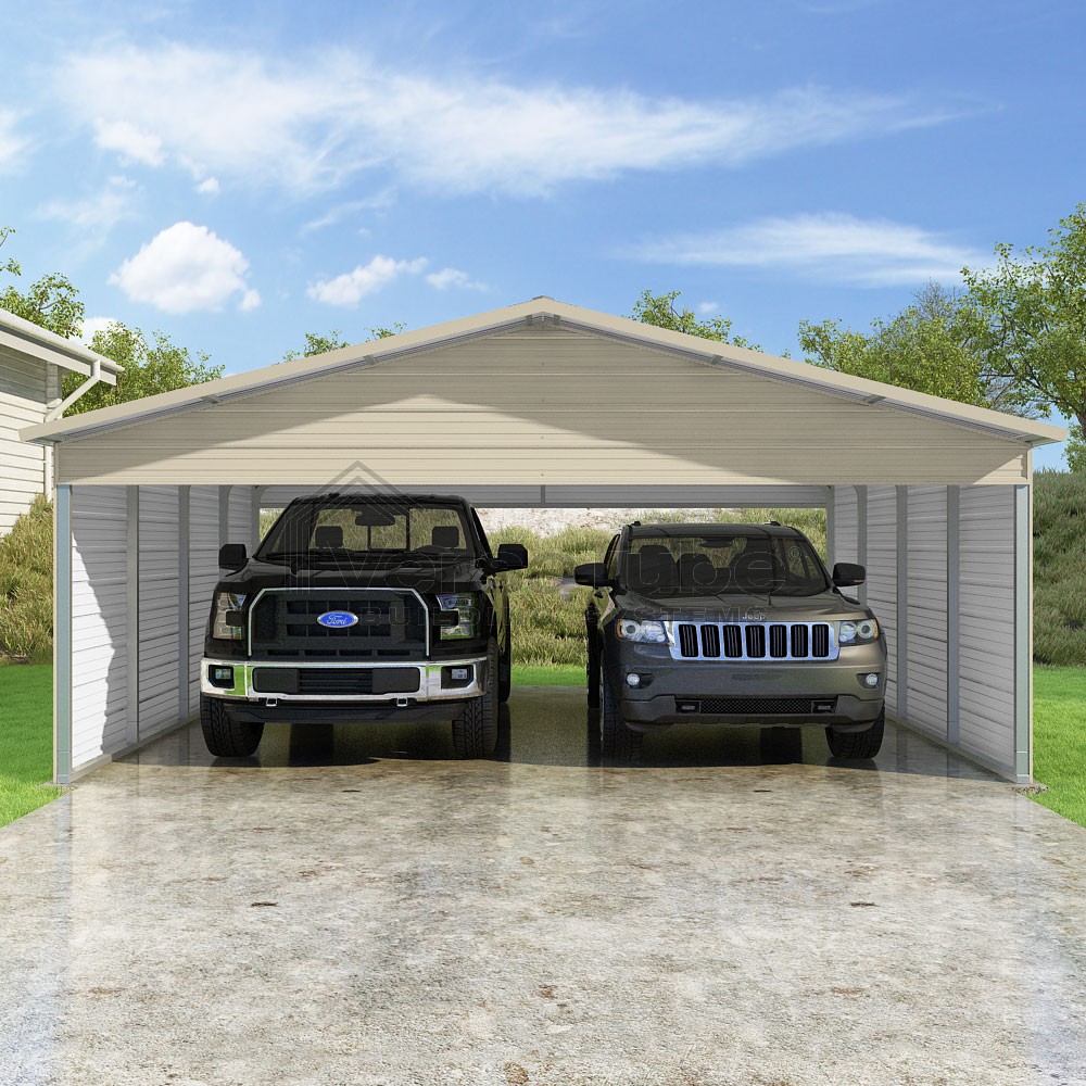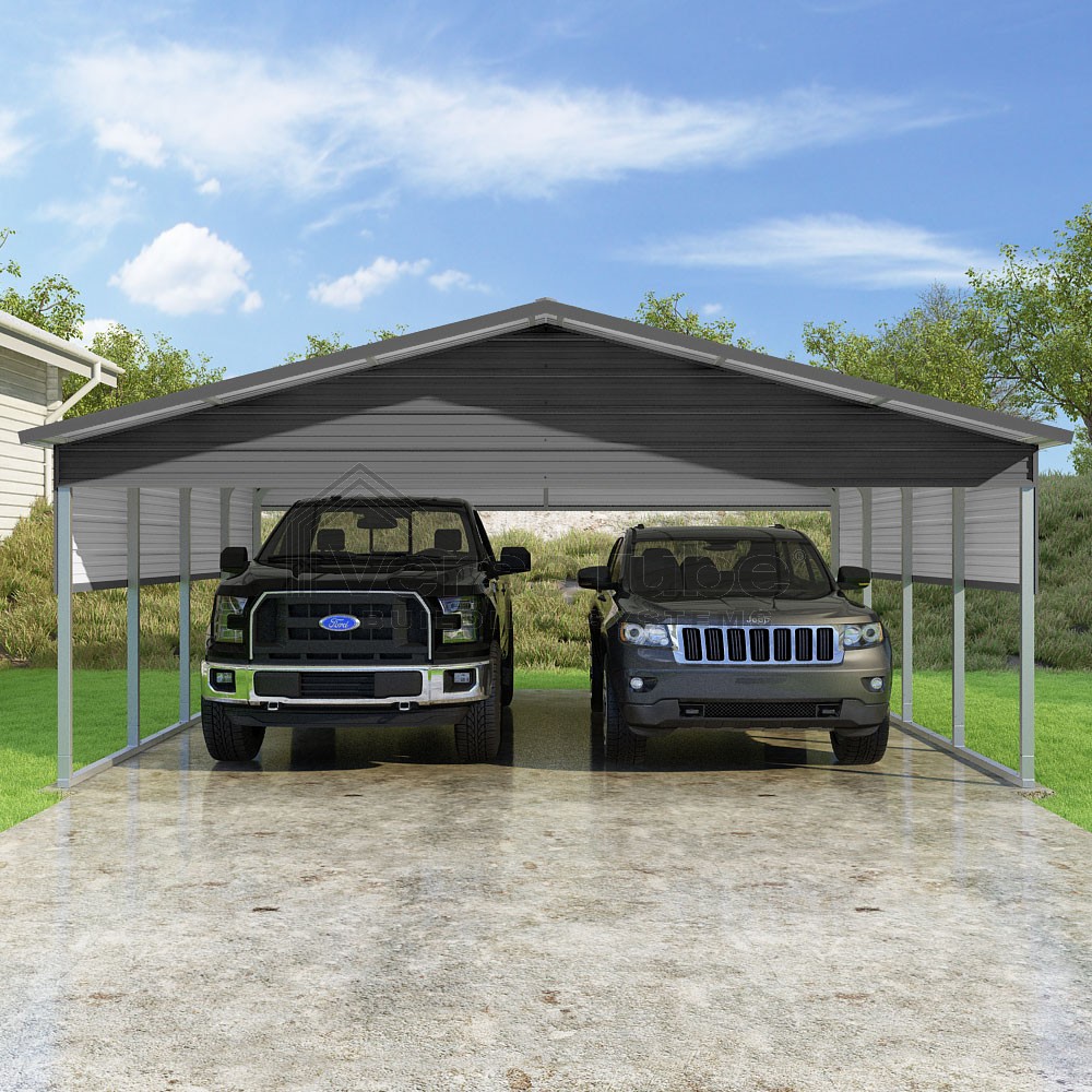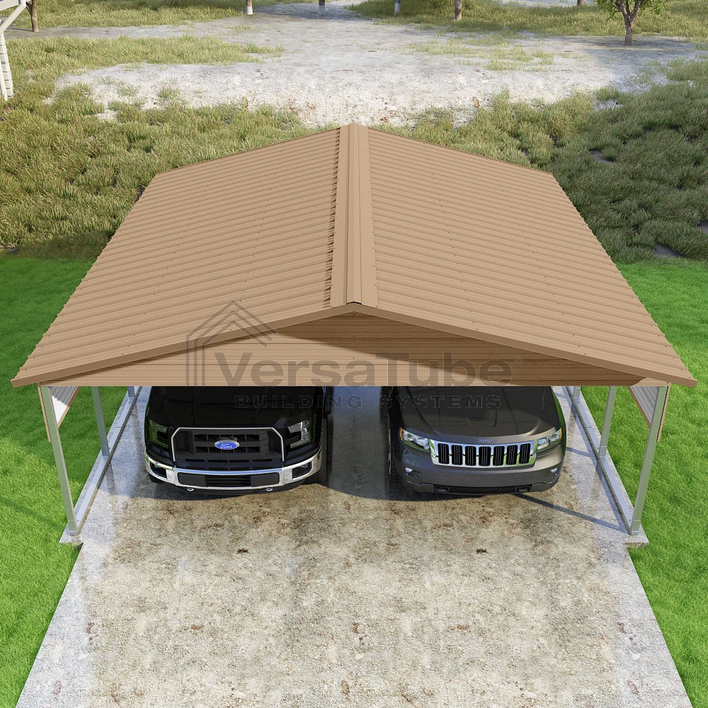 Pinnacle Series DIY carport kit features vertical sheet metal roof panels with ridge cap, gable and eave trim for an A-frame roof style and extended coverage on both ends.