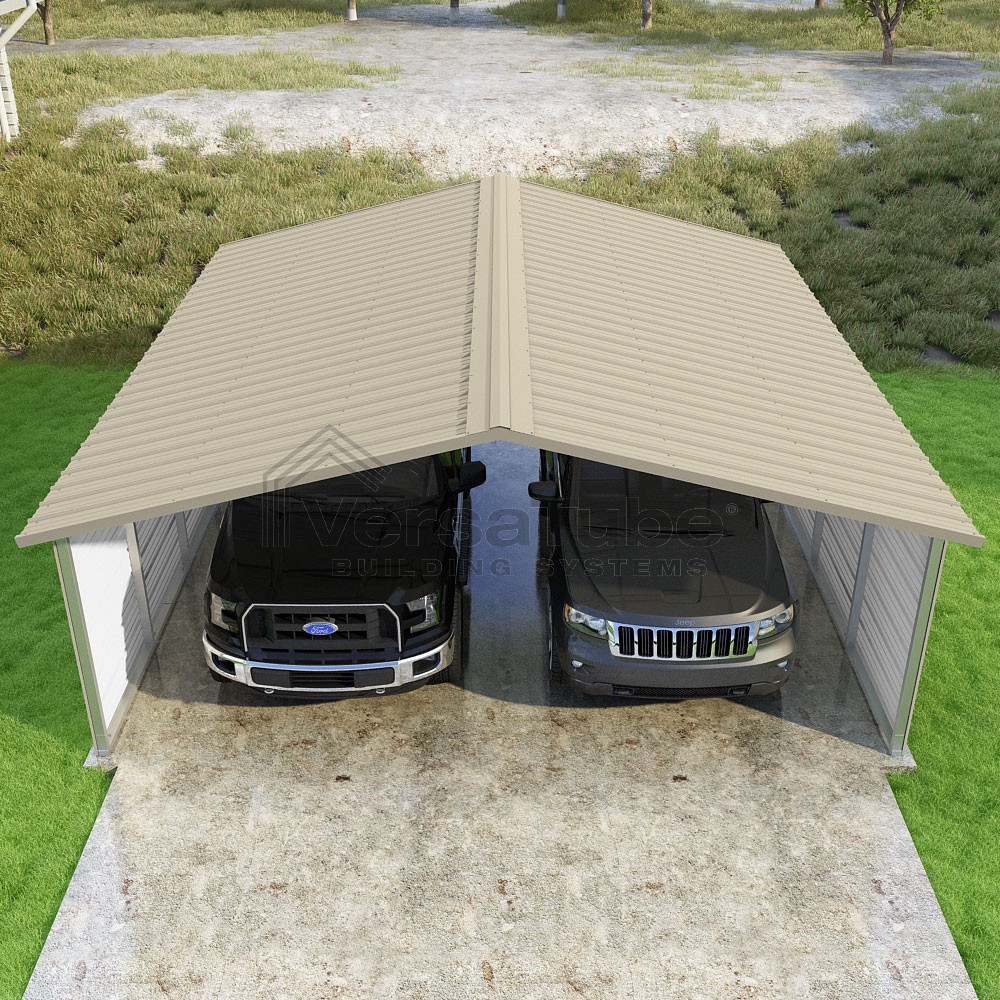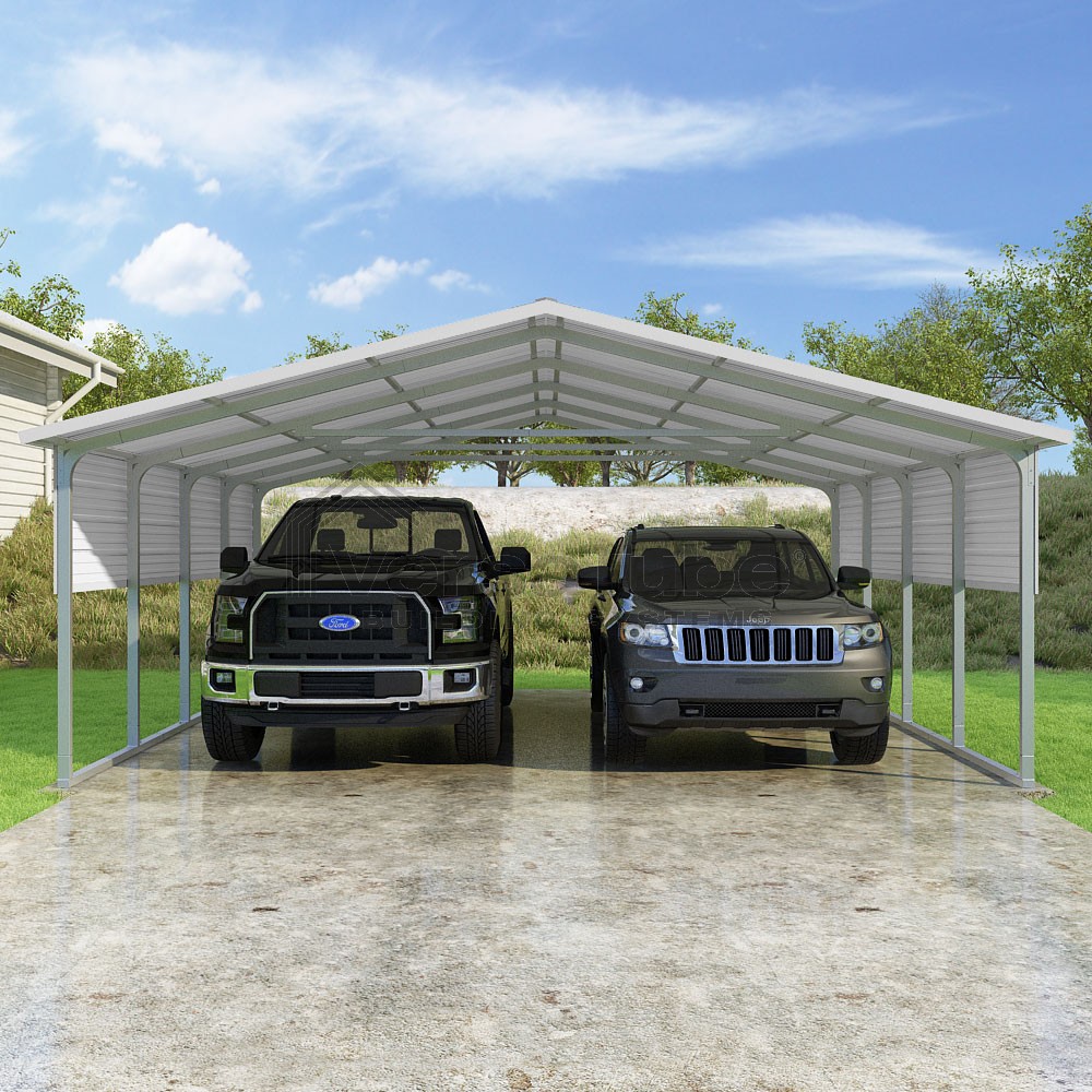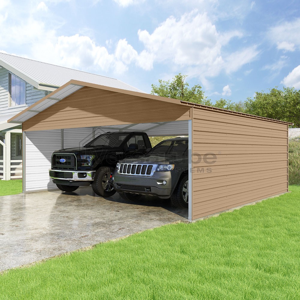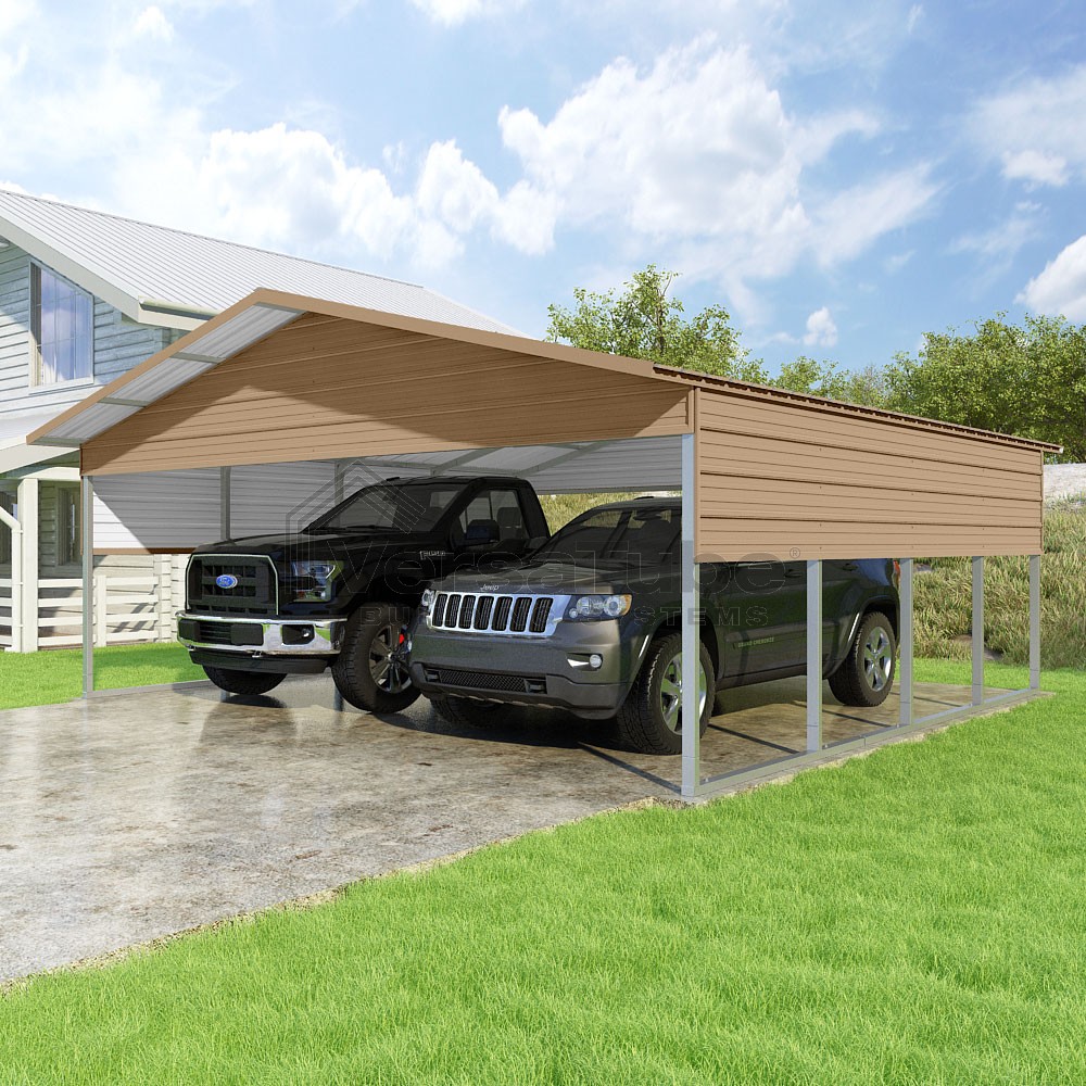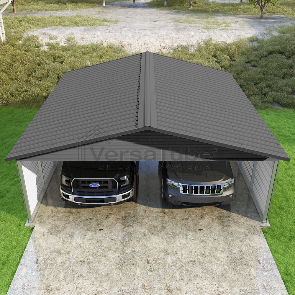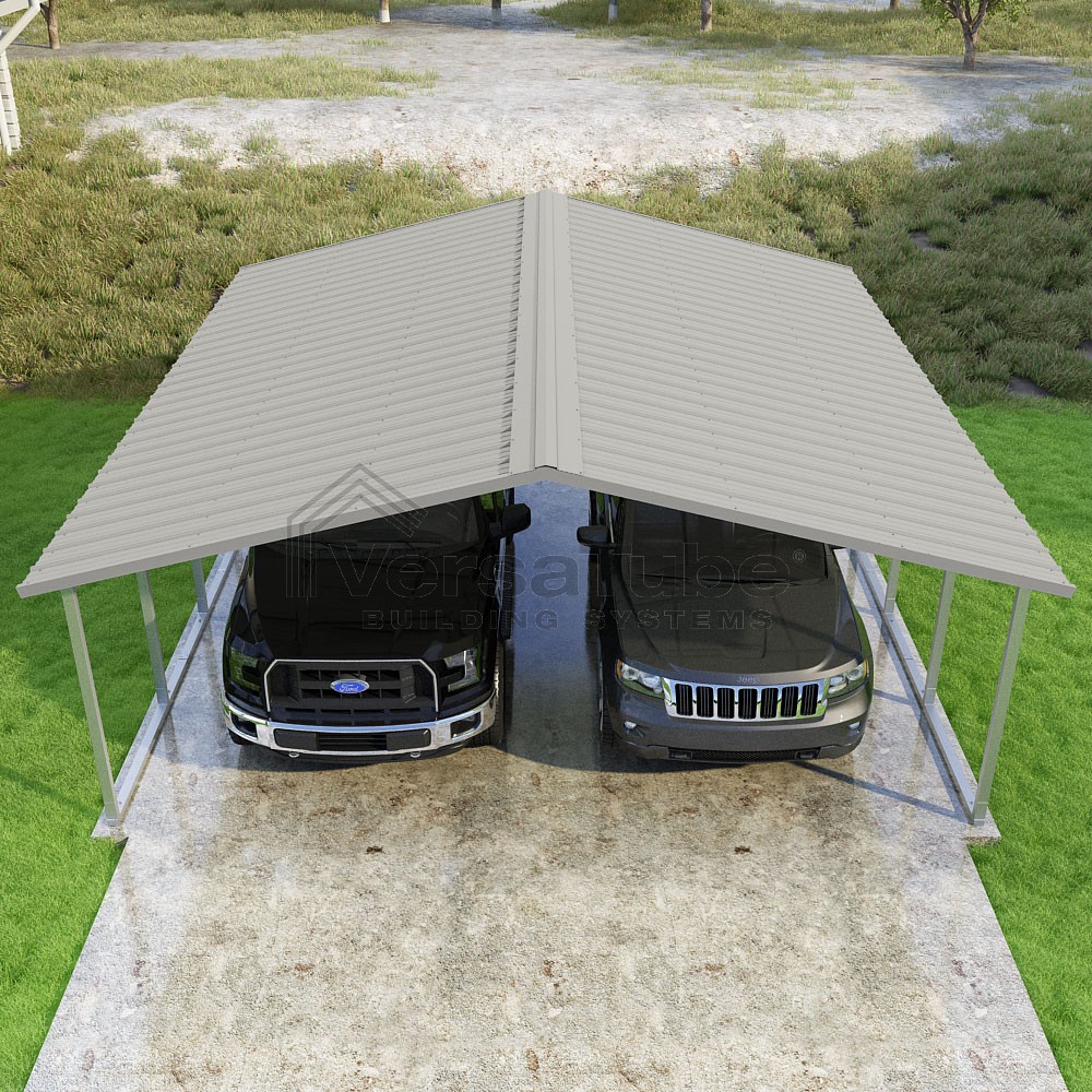 Pinnacle Series DIY carport kit features vertical sheet metal roof panels with ridge cap, gable and eave trim for an A-frame roof style and extended coverage on both ends.