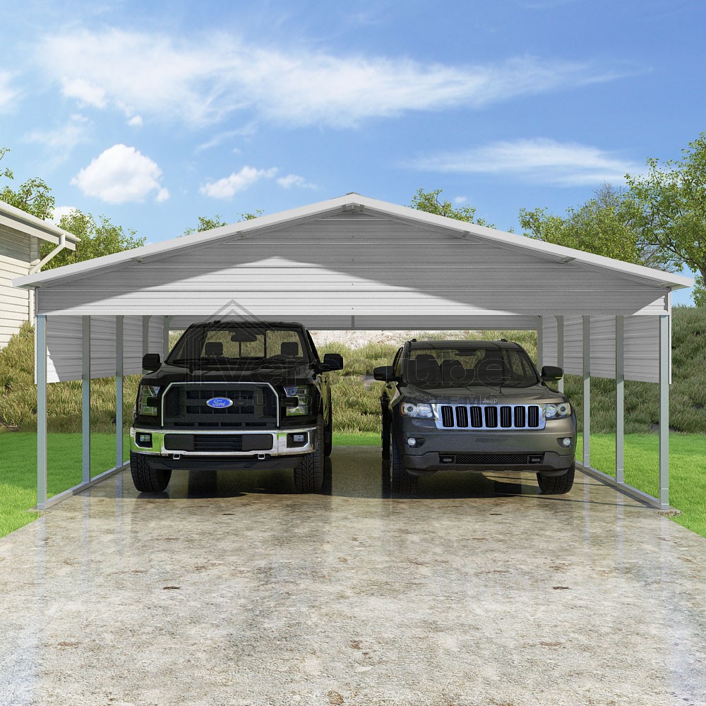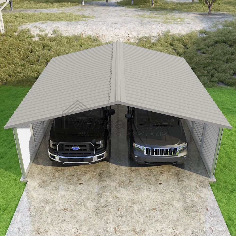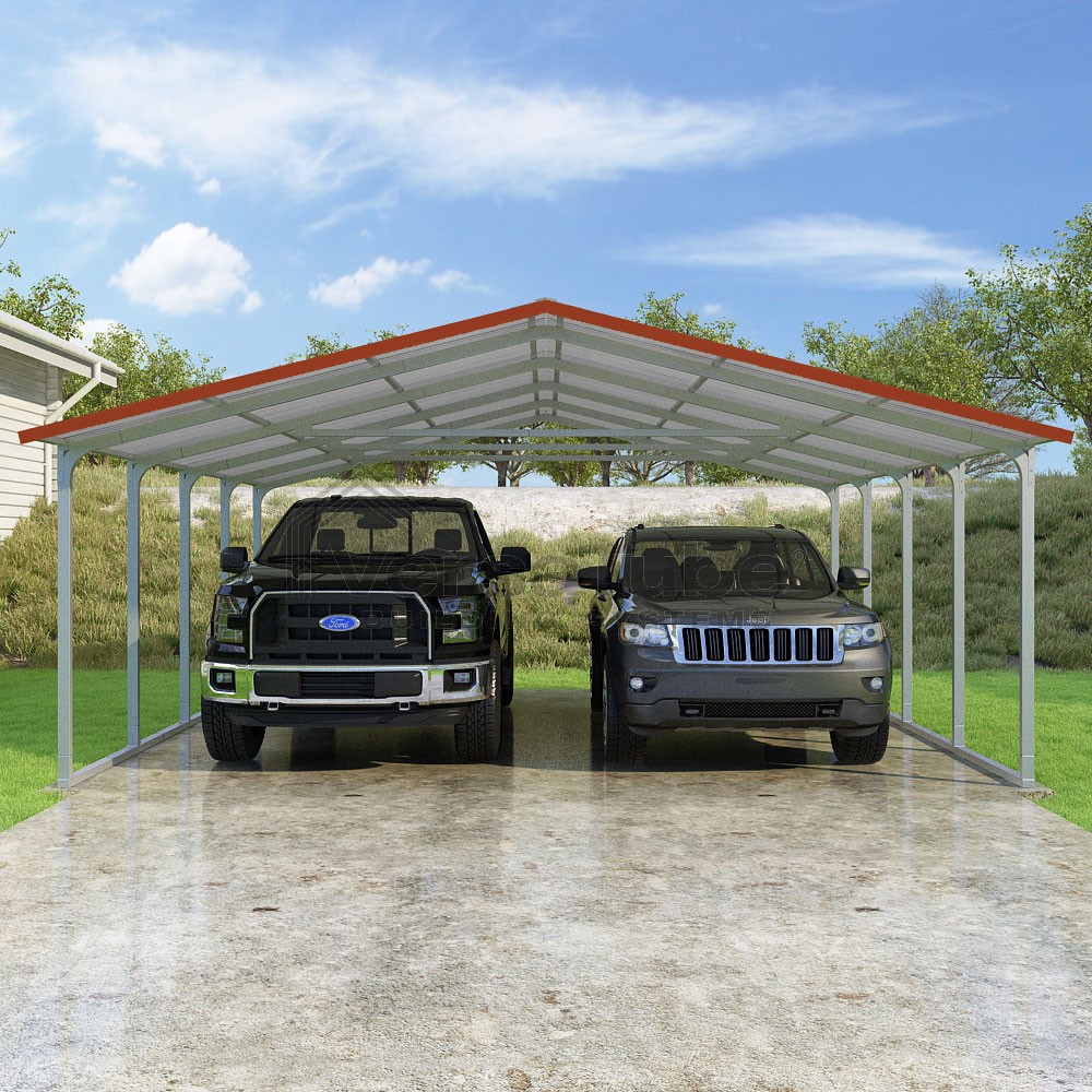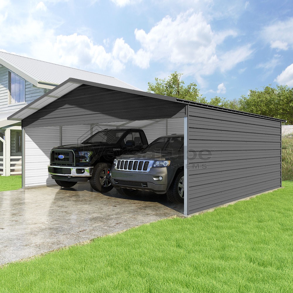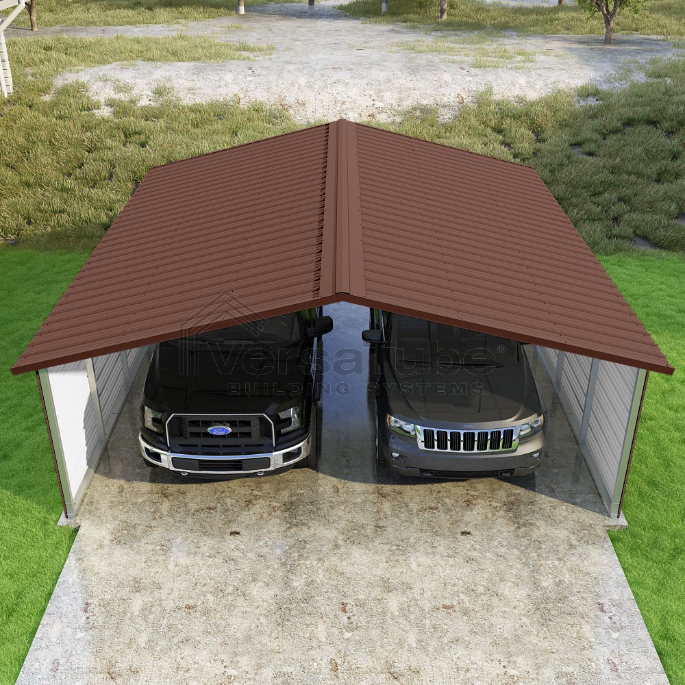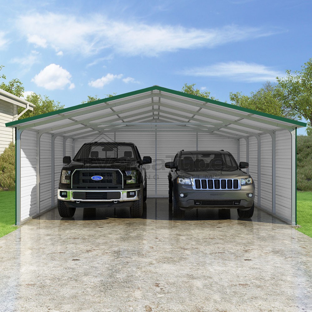 Pinnacle Series DIY carport kit features vertical sheet metal roof panels with ridge cap, gable and eave trim for an A-frame roof style and extended coverage on both ends.