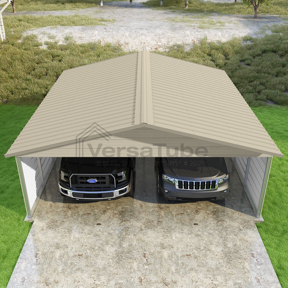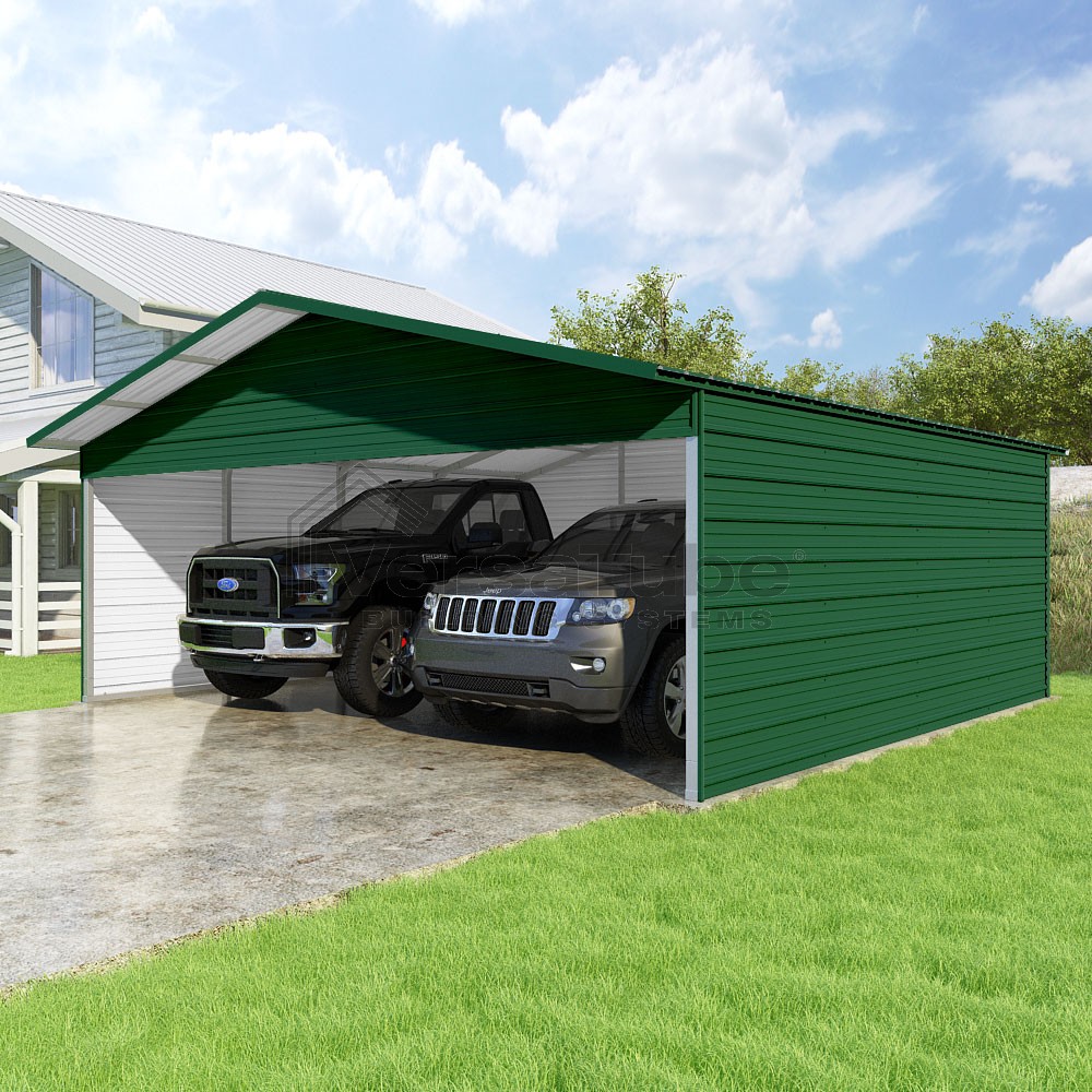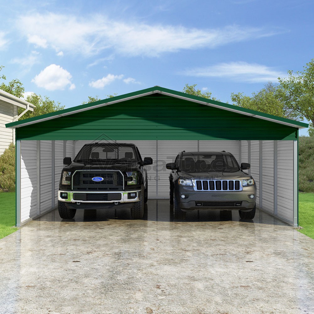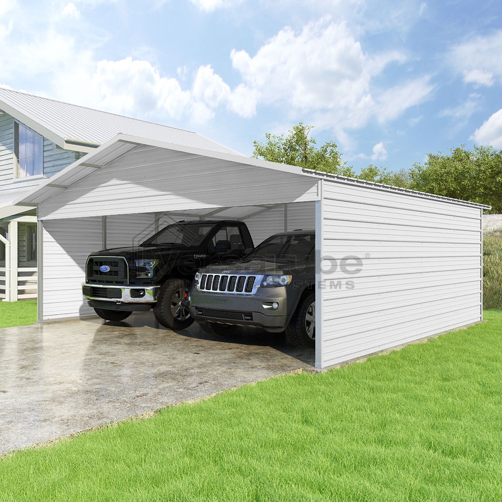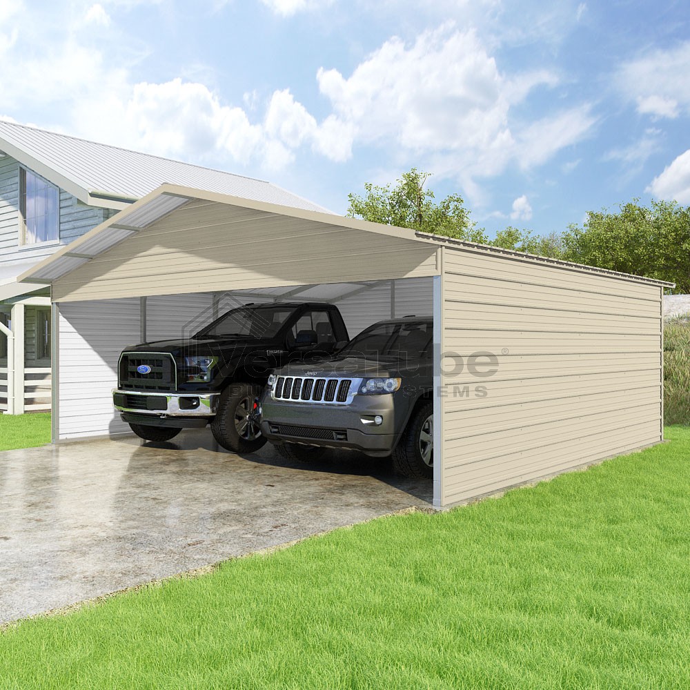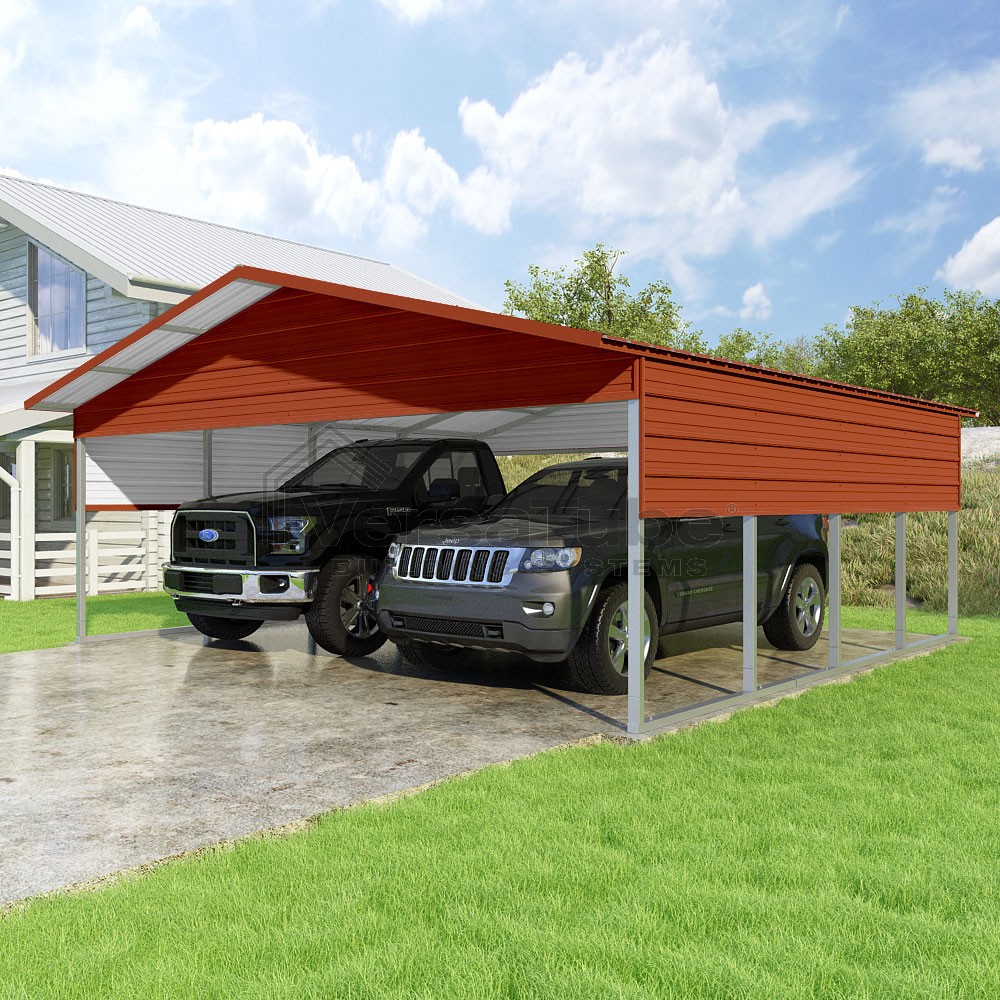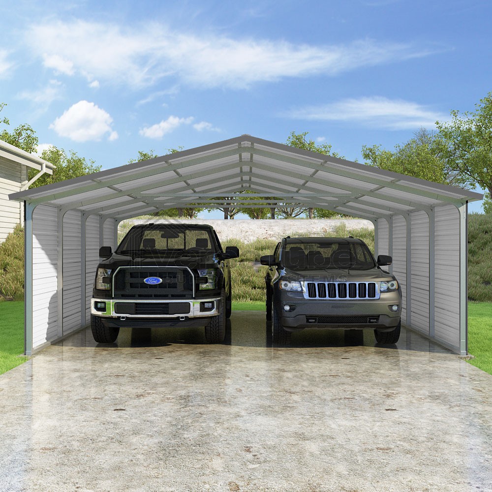 Pinnacle Series DIY carport kit features vertical sheet metal roof panels with ridge cap, gable and eave trim for an A-frame roof style and extended coverage on both ends.