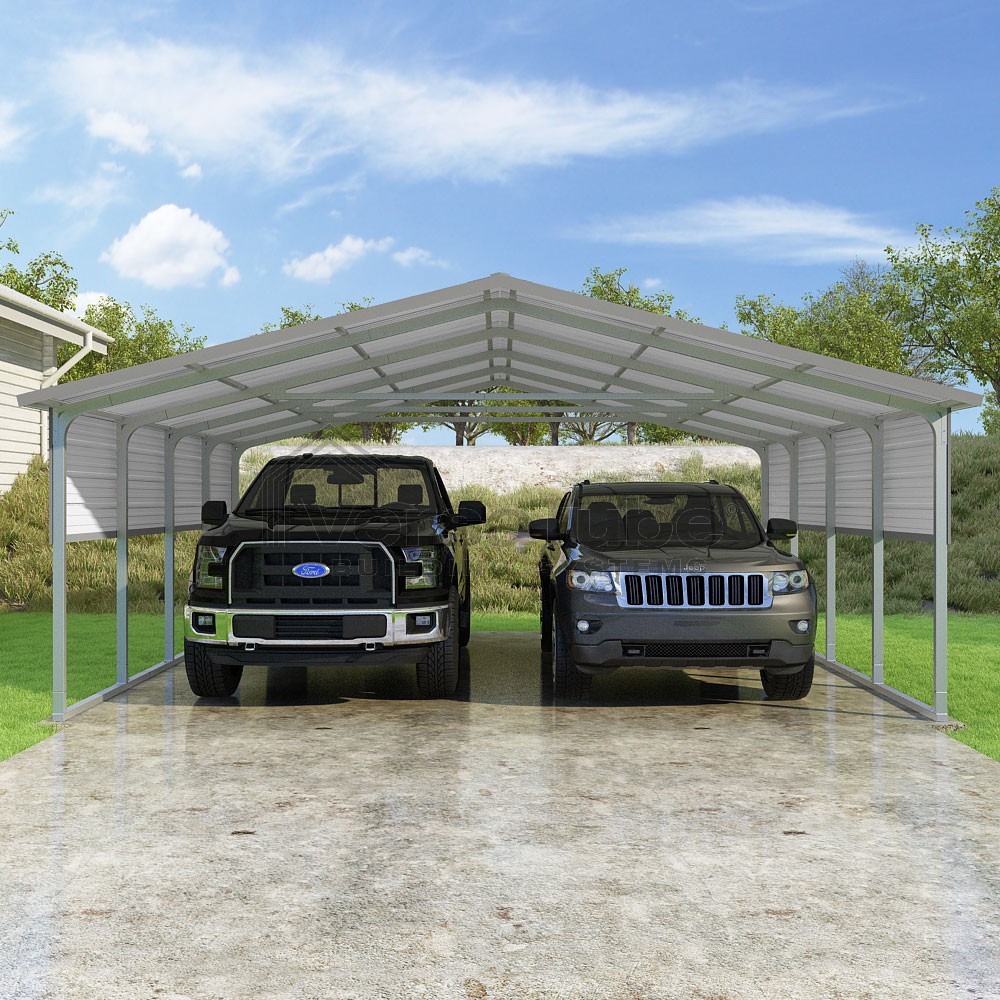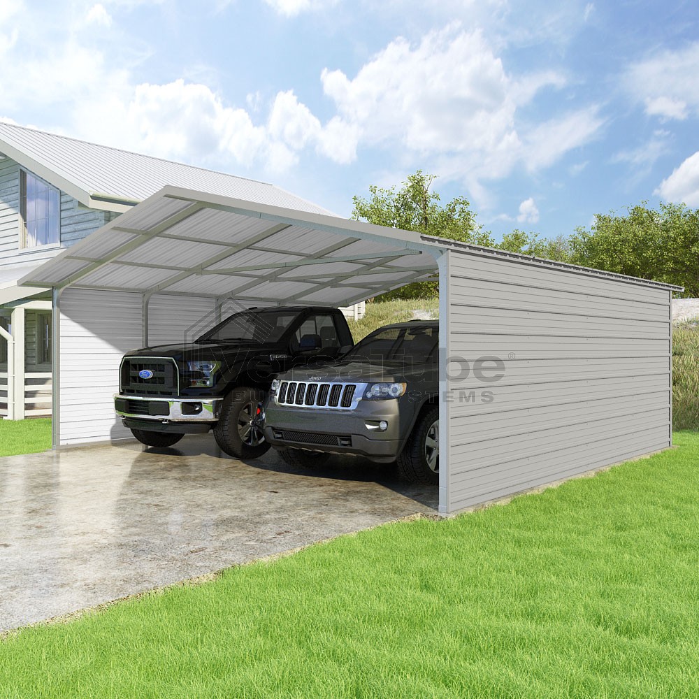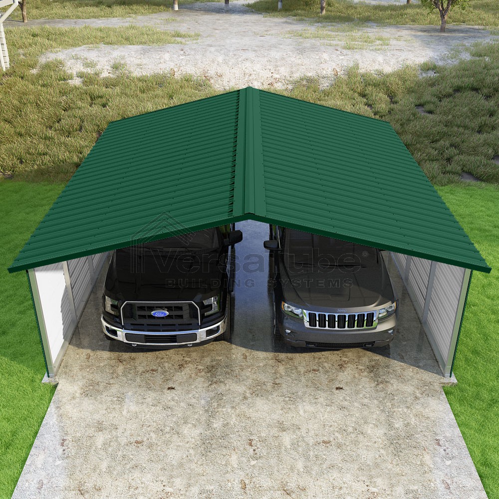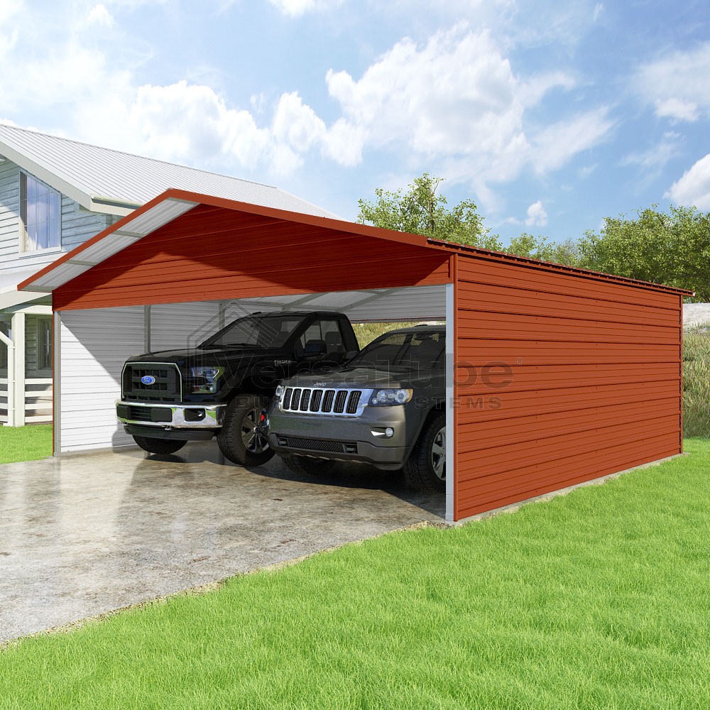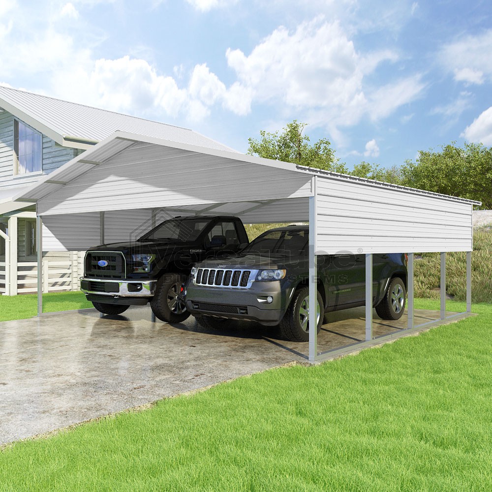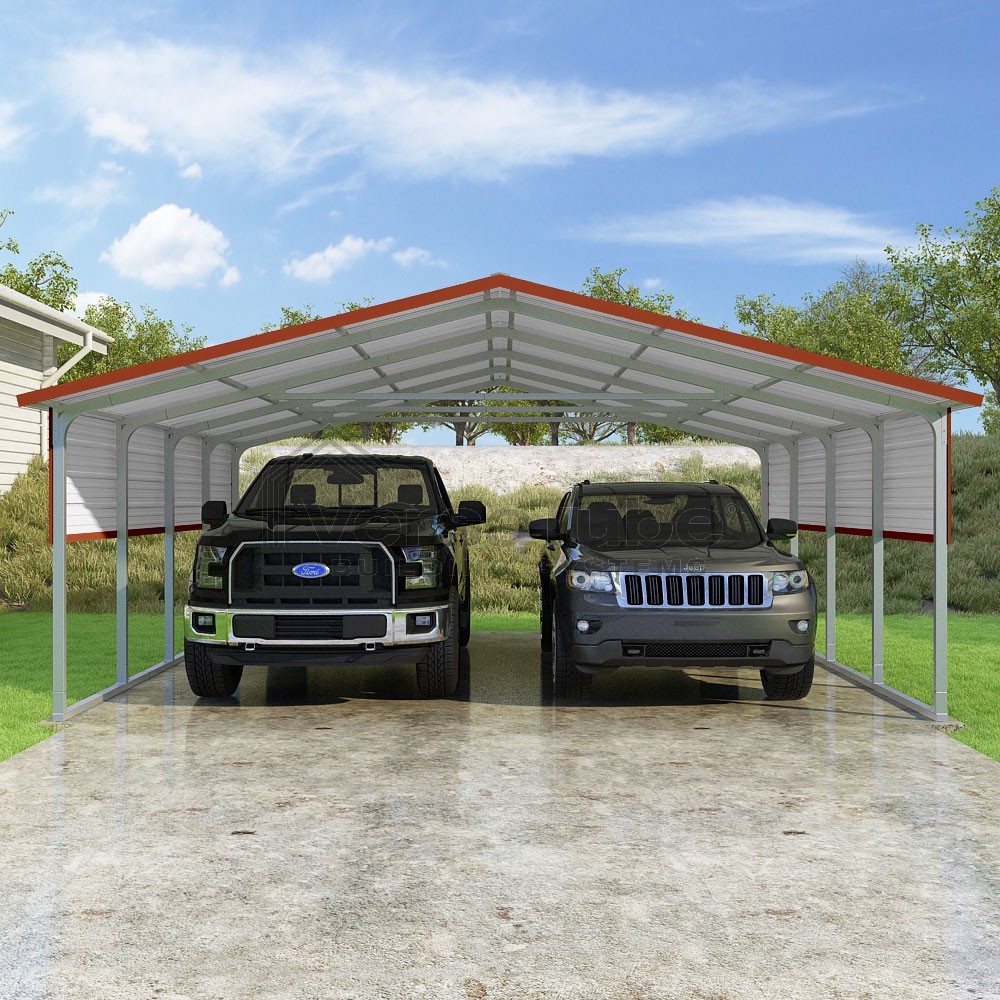 Pinnacle Series DIY carport kit features vertical sheet metal roof panels with ridge cap, gable and eave trim for an A-frame roof style and extended coverage on both ends.