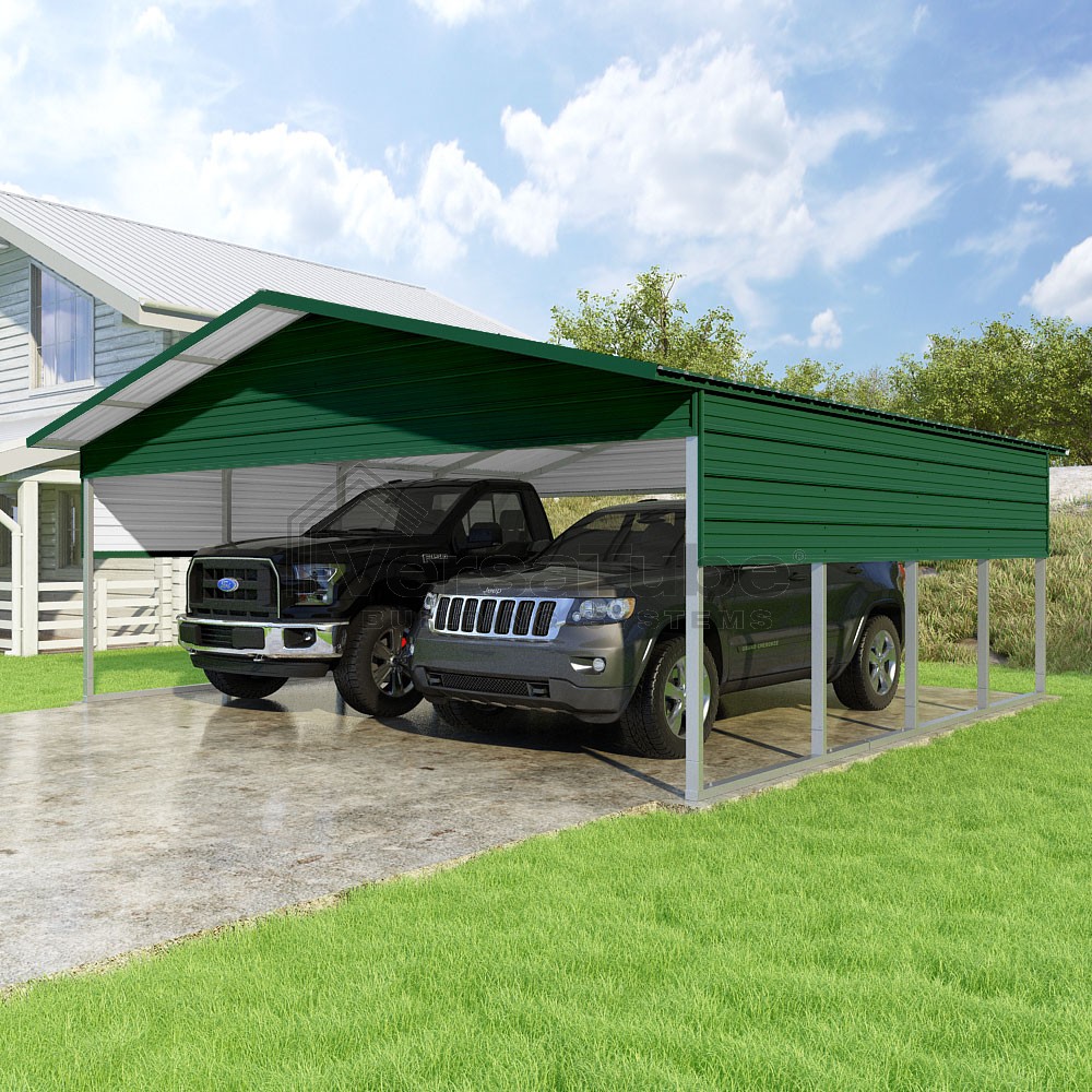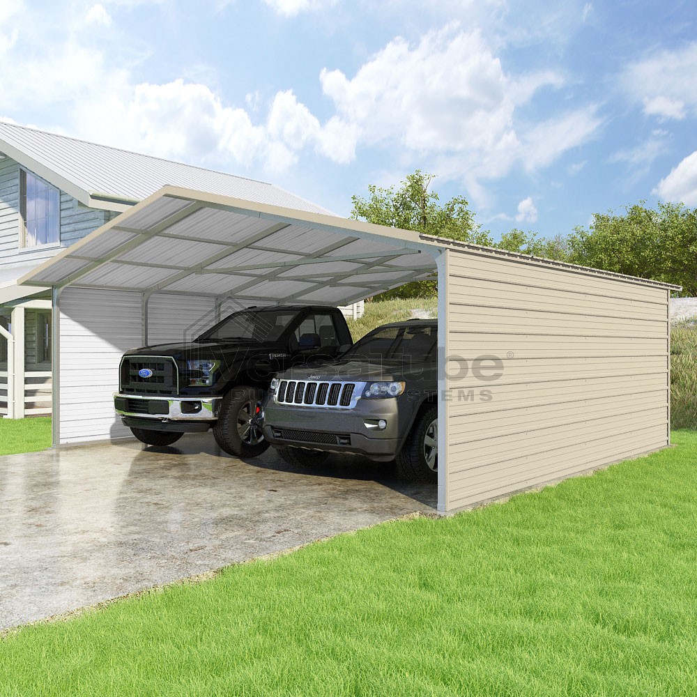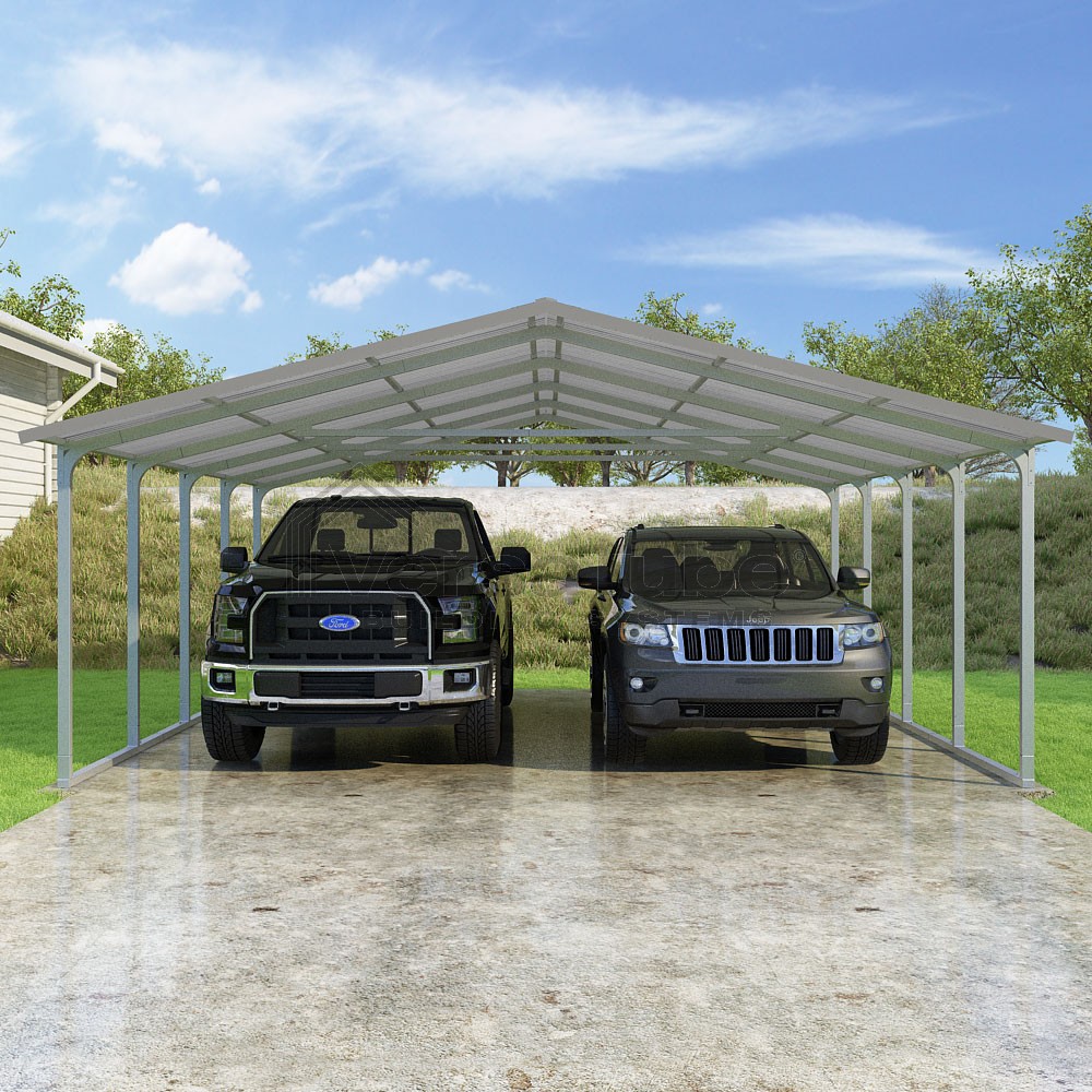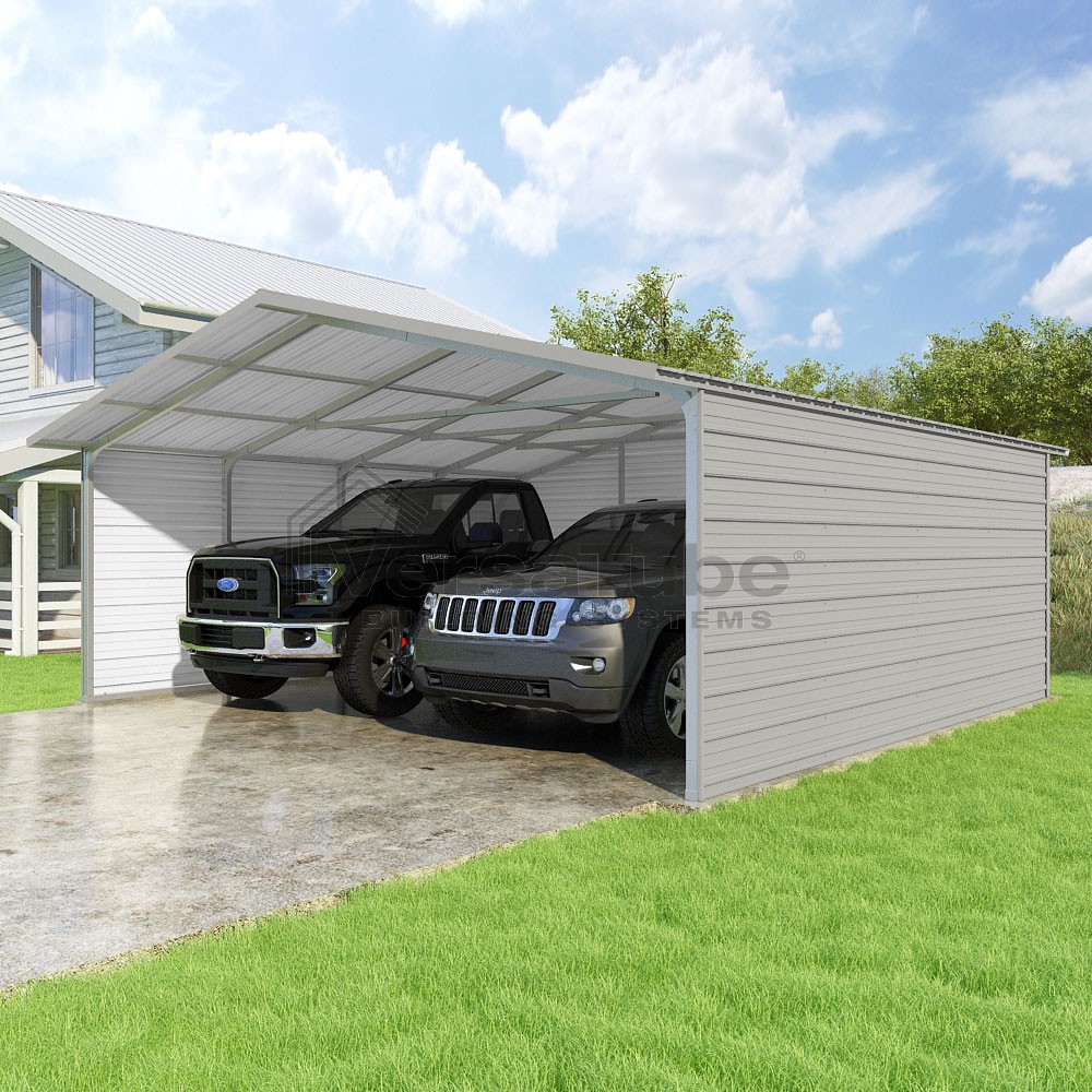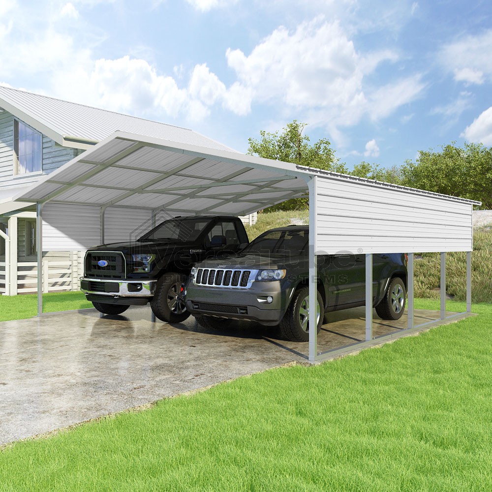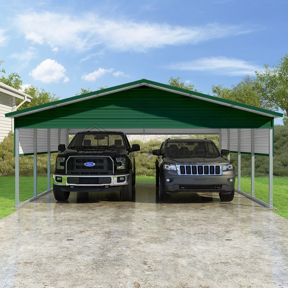 Pinnacle Series DIY carport kit features vertical sheet metal roof panels with ridge cap, gable and eave trim for an A-frame roof style and extended coverage on both ends.