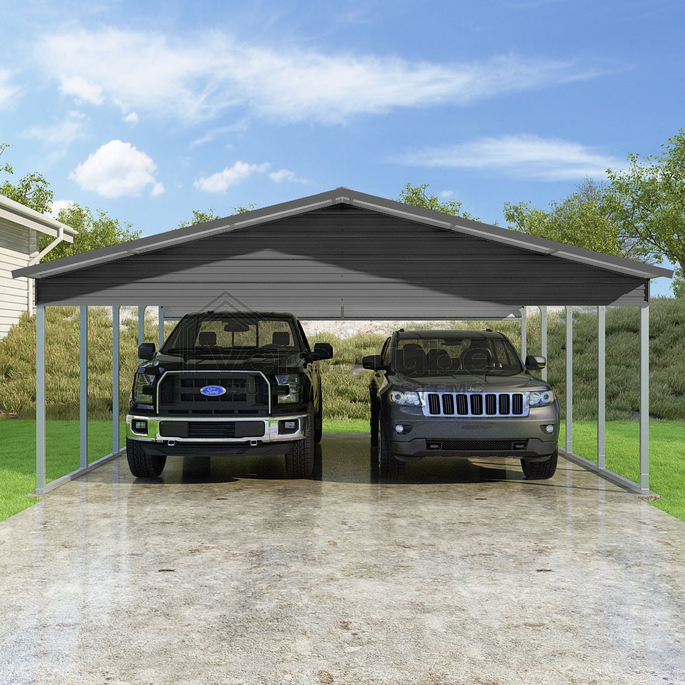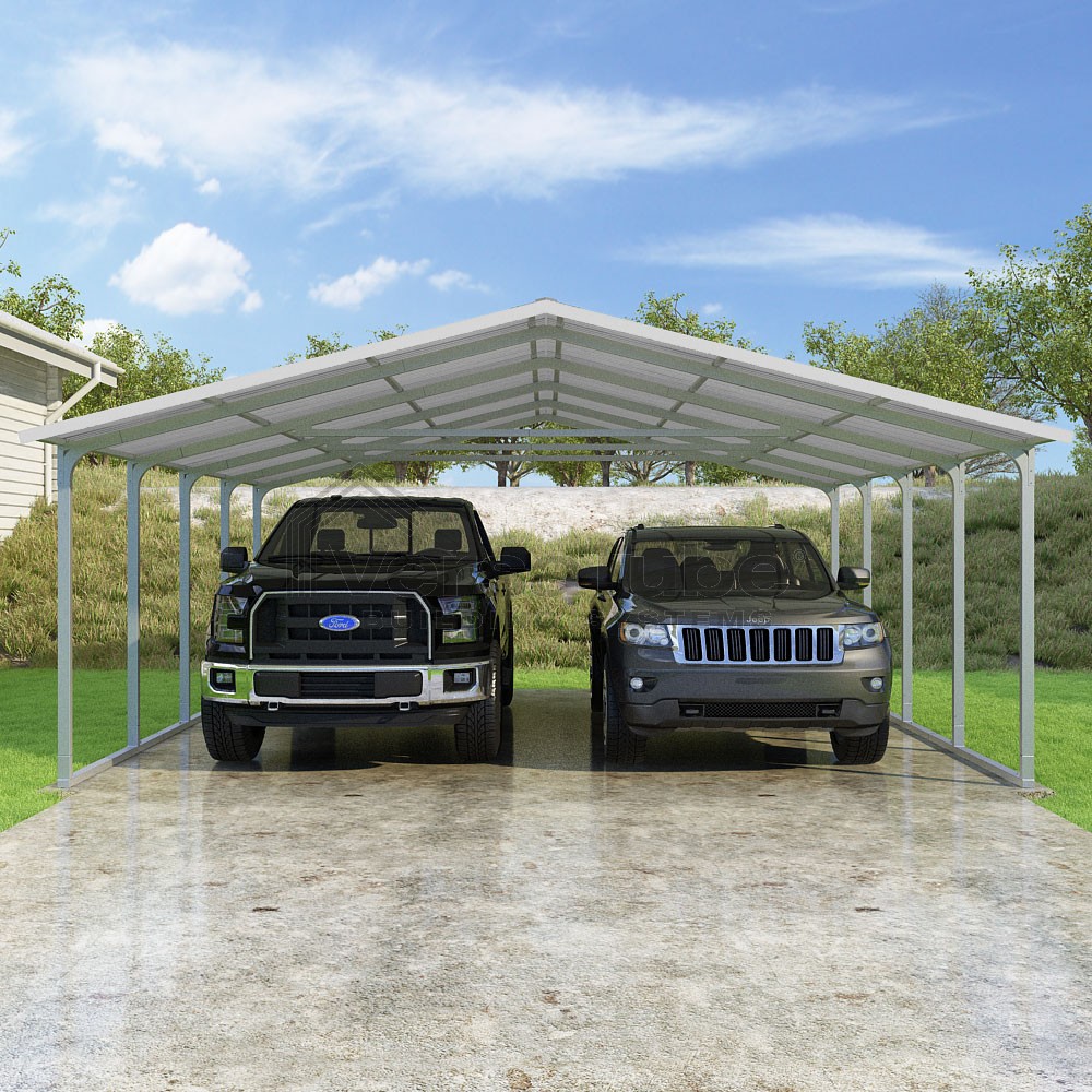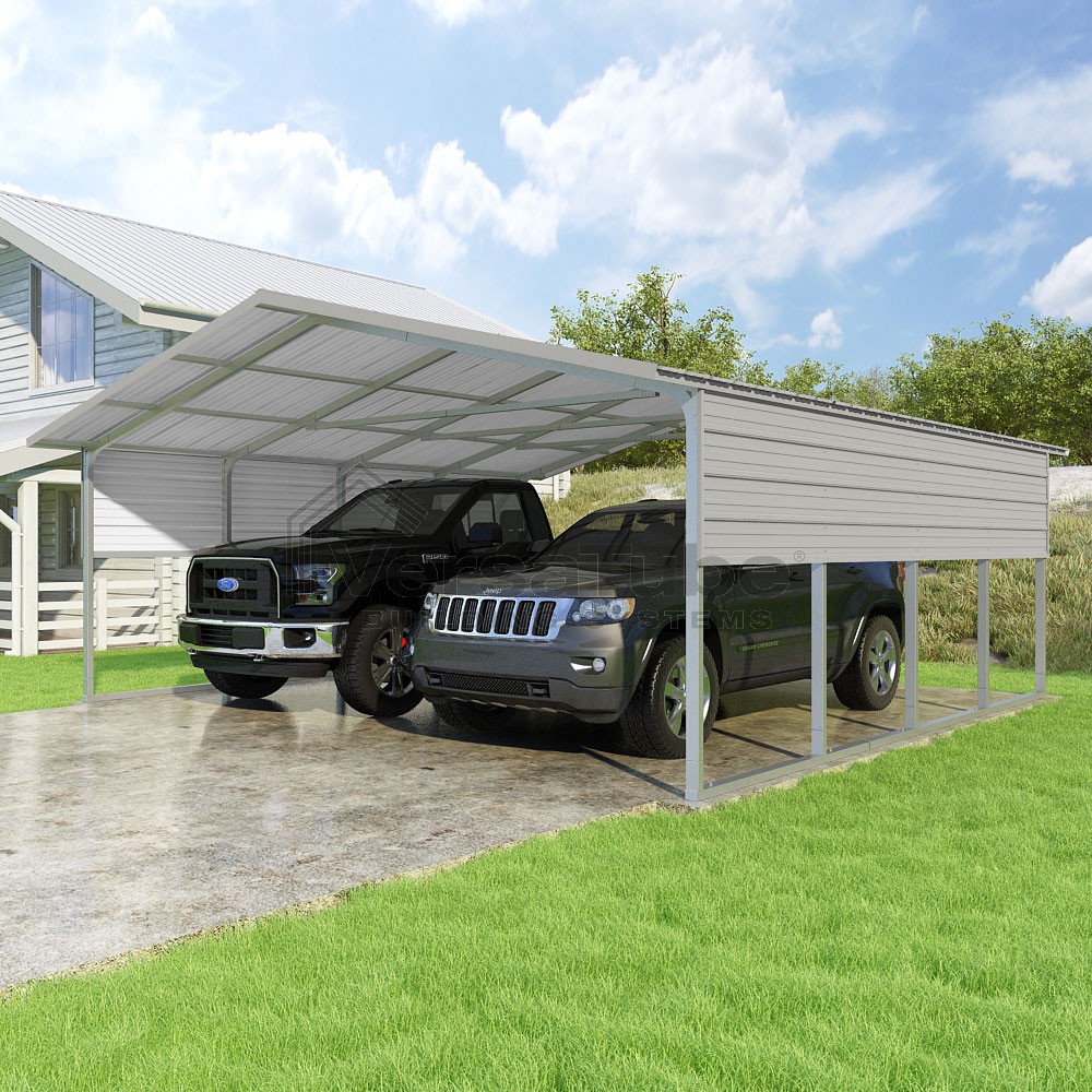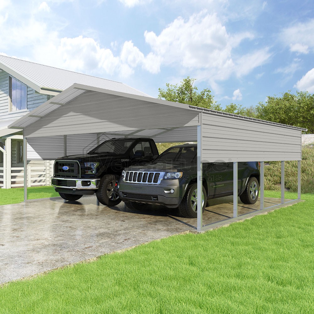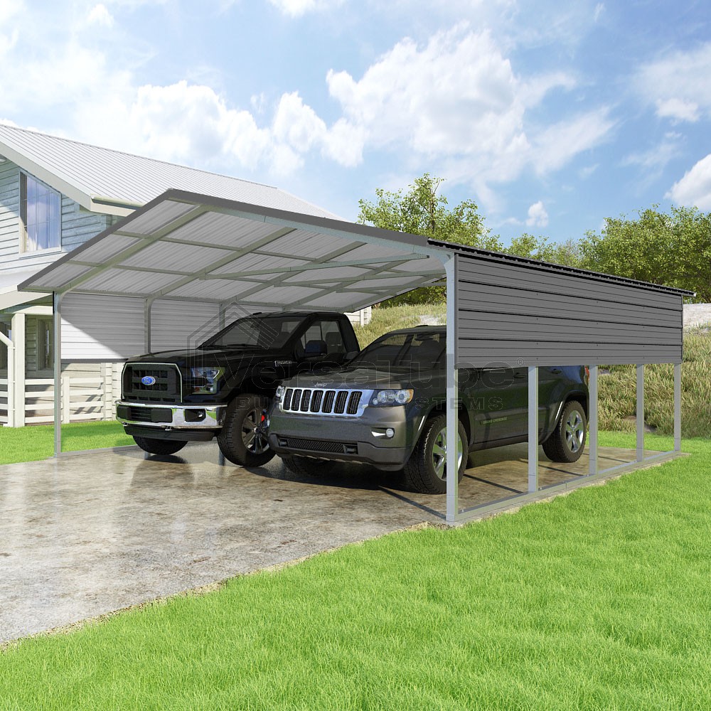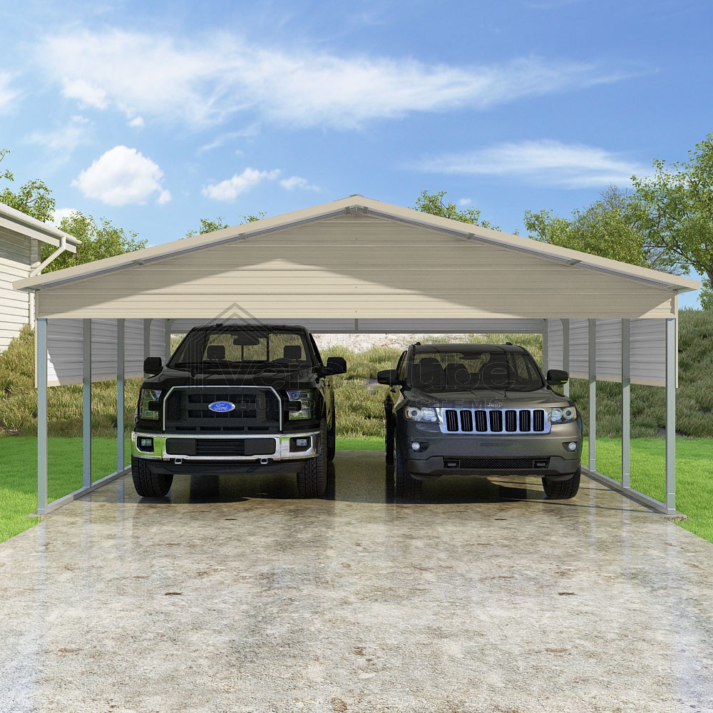 Pinnacle Series DIY carport kit features vertical sheet metal roof panels with ridge cap, gable and eave trim for an A-frame roof style and extended coverage on both ends.