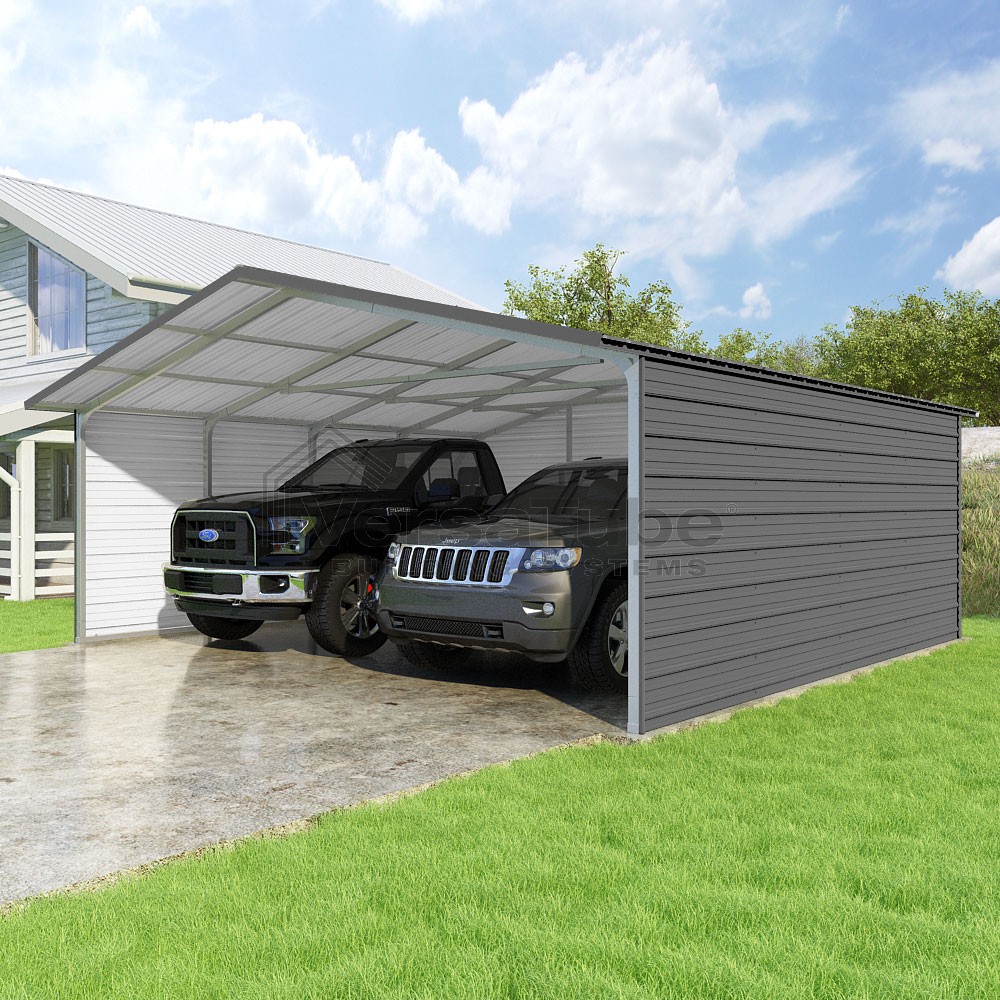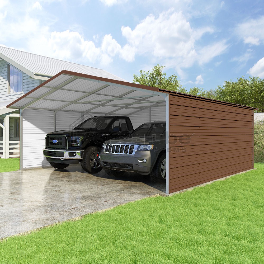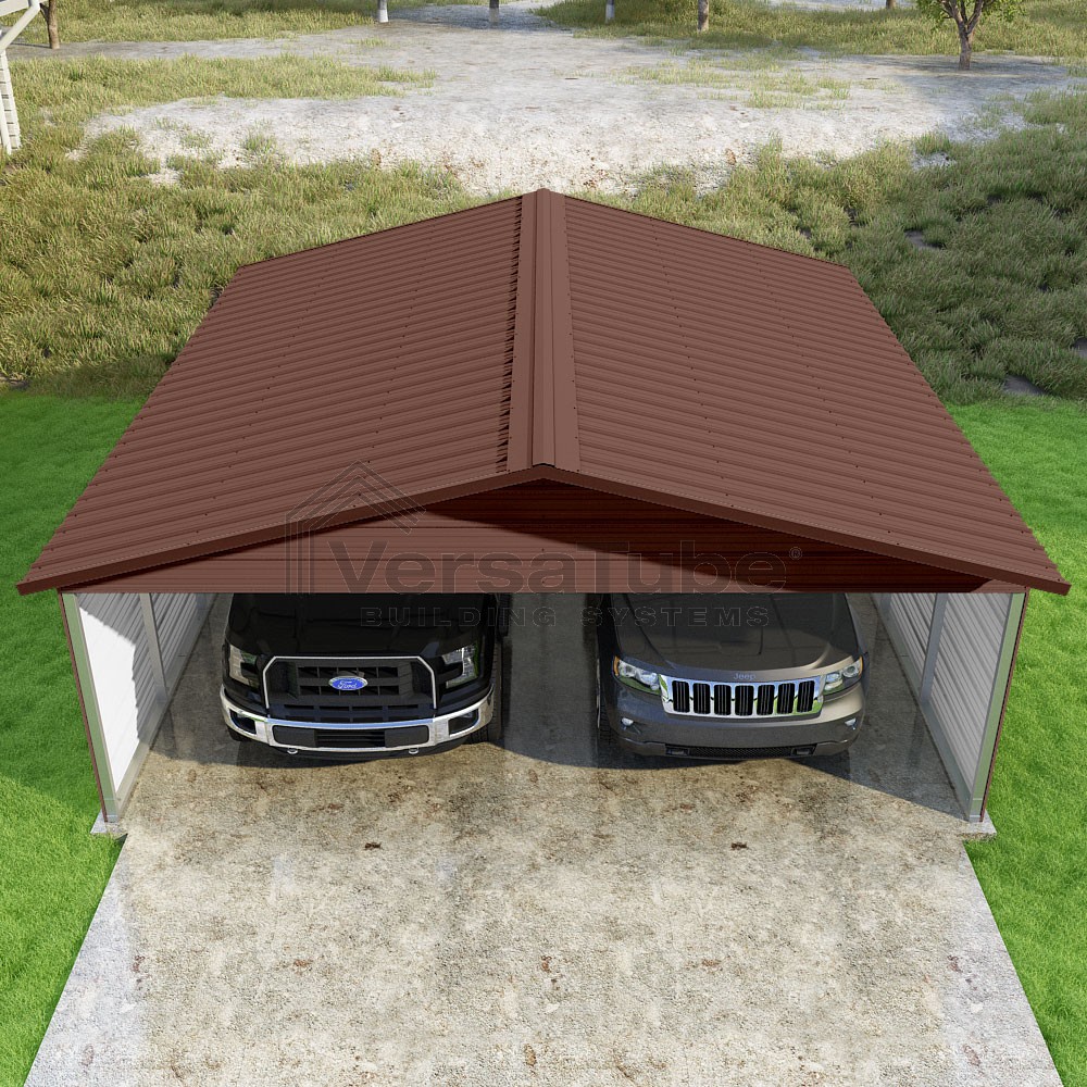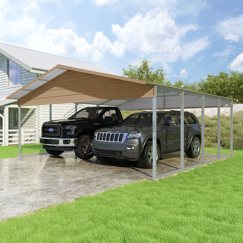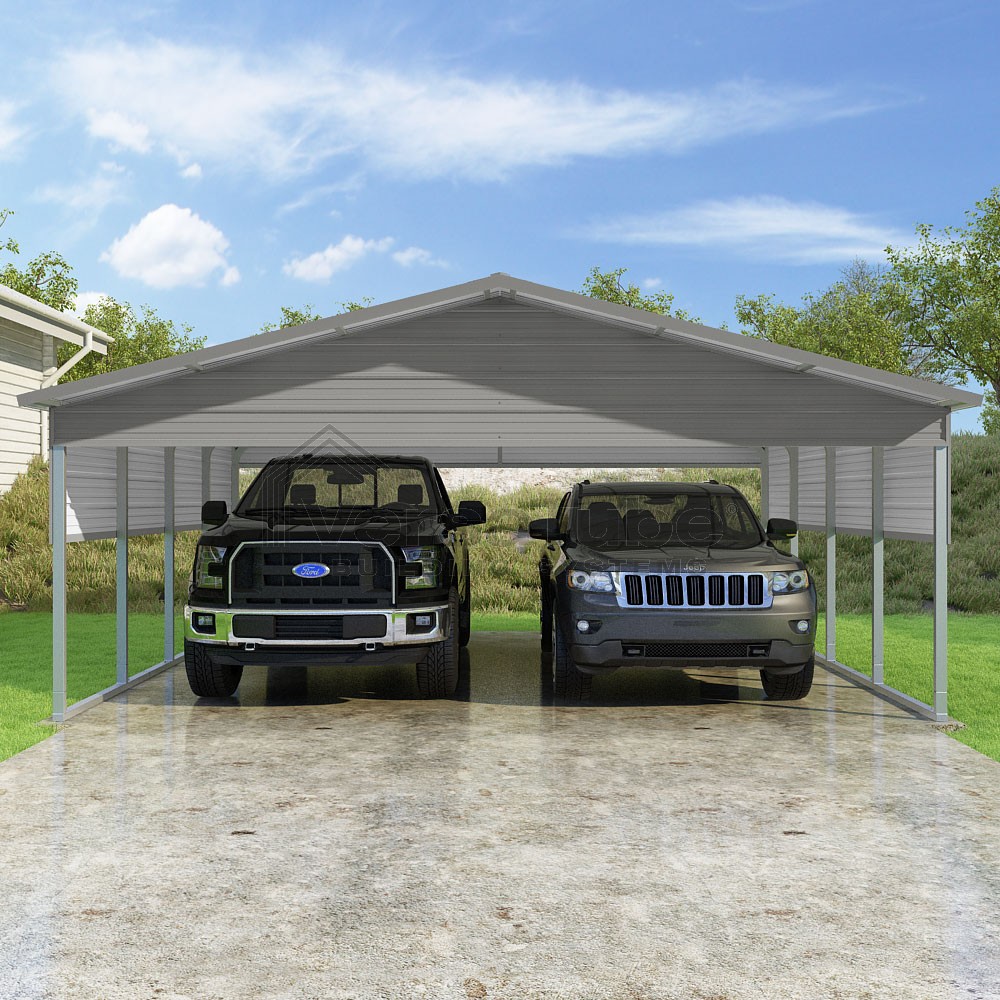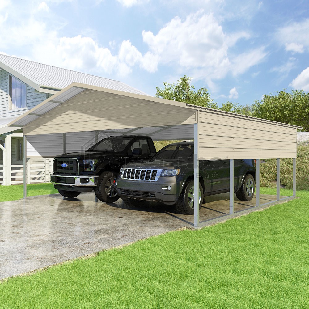 Pinnacle Series DIY carport kit features vertical sheet metal roof panels with ridge cap, gable and eave trim for an A-frame roof style and extended coverage on both ends.