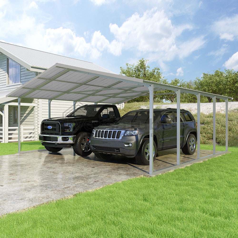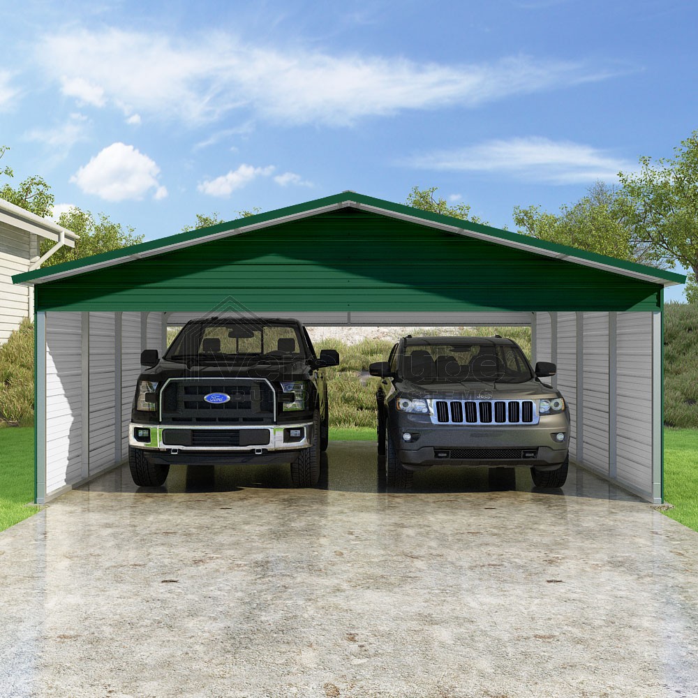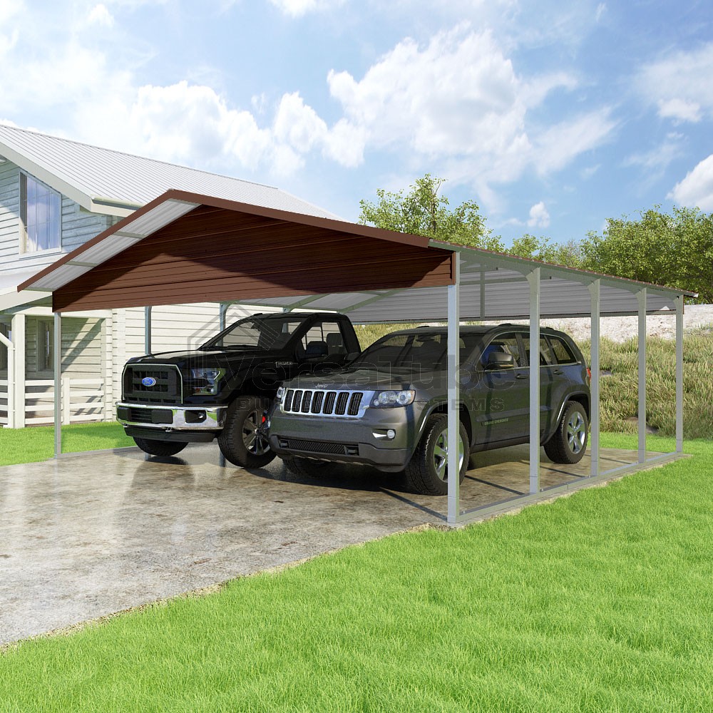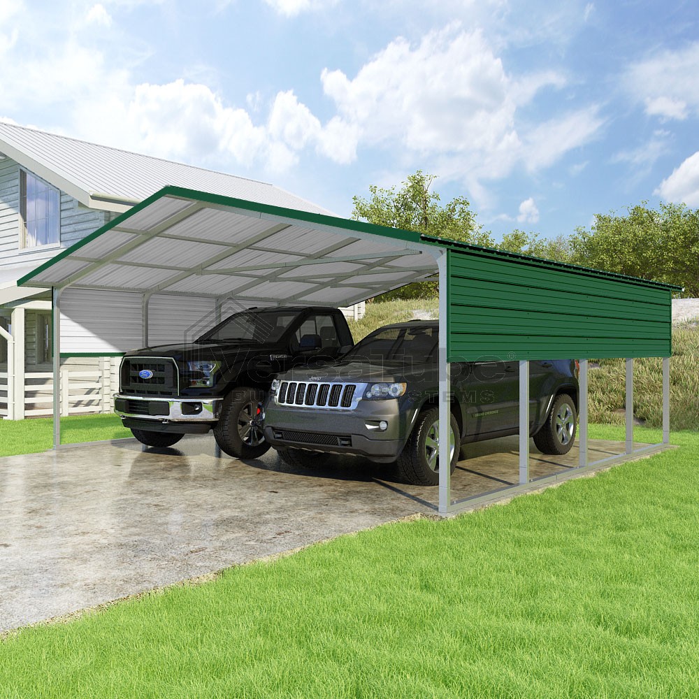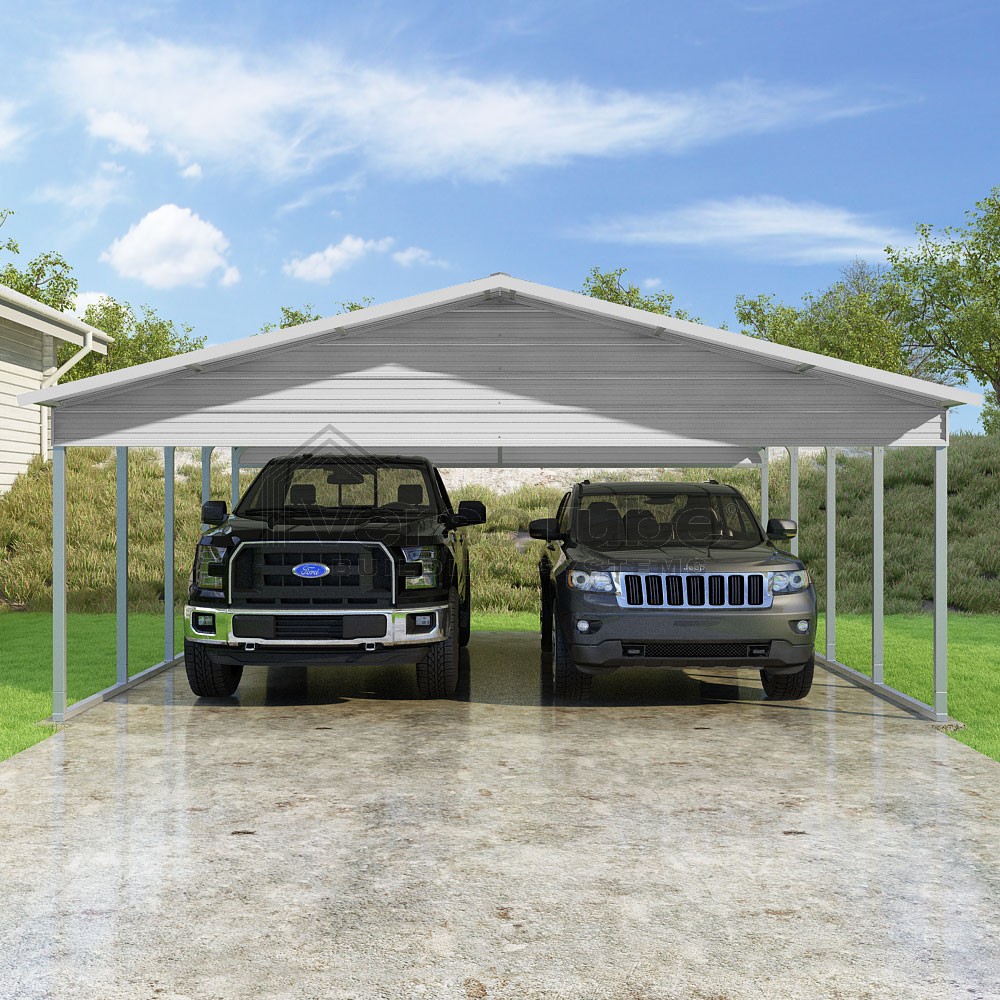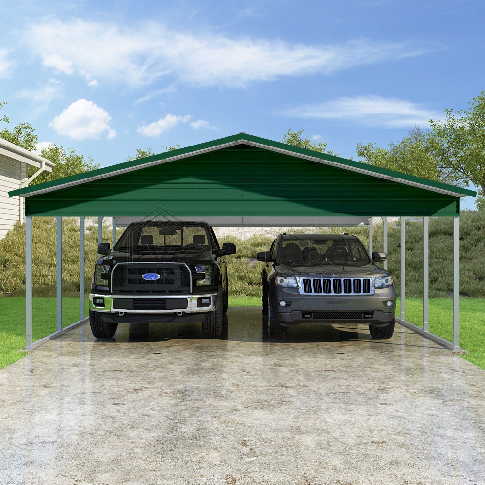 Pinnacle Series DIY carport kit features vertical sheet metal roof panels with ridge cap, gable and eave trim for an A-frame roof style and extended coverage on both ends.
