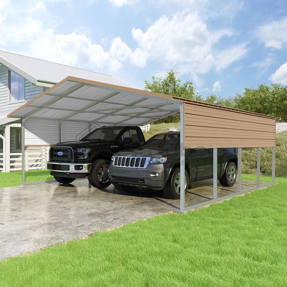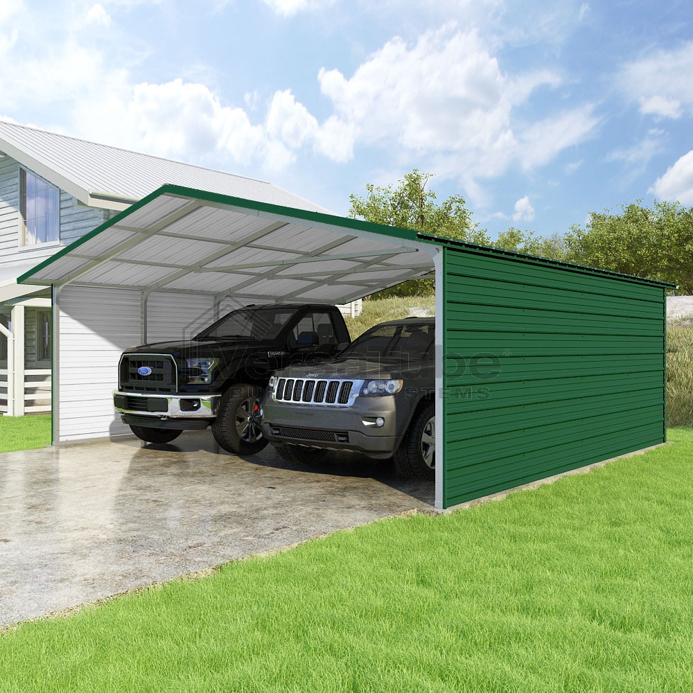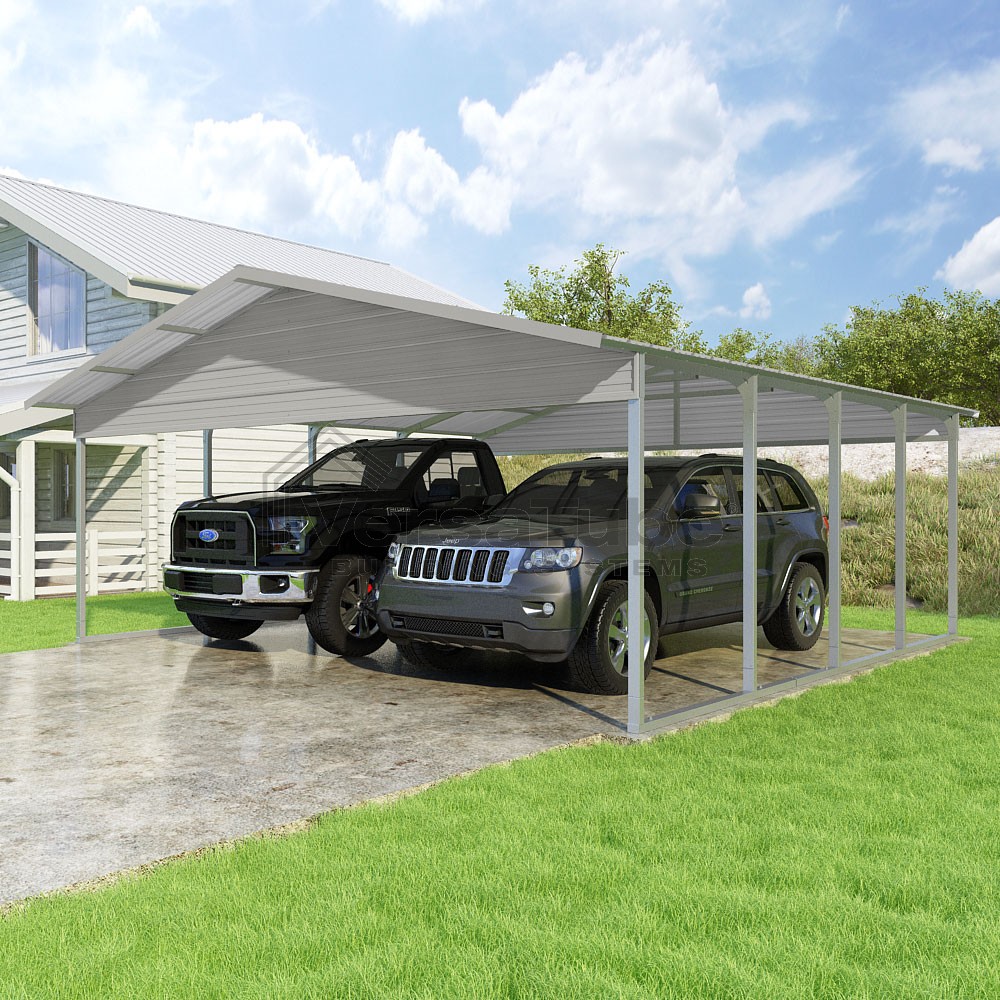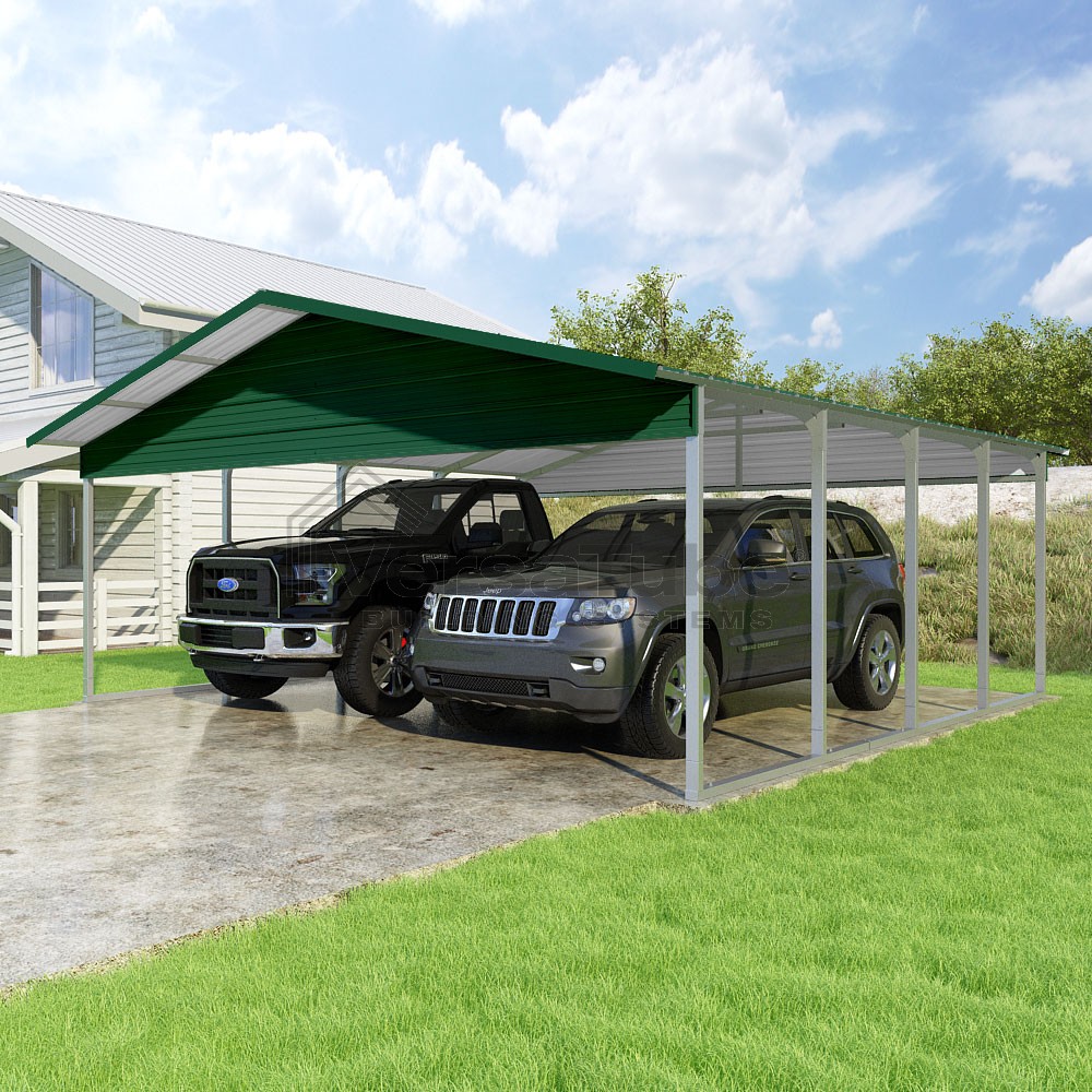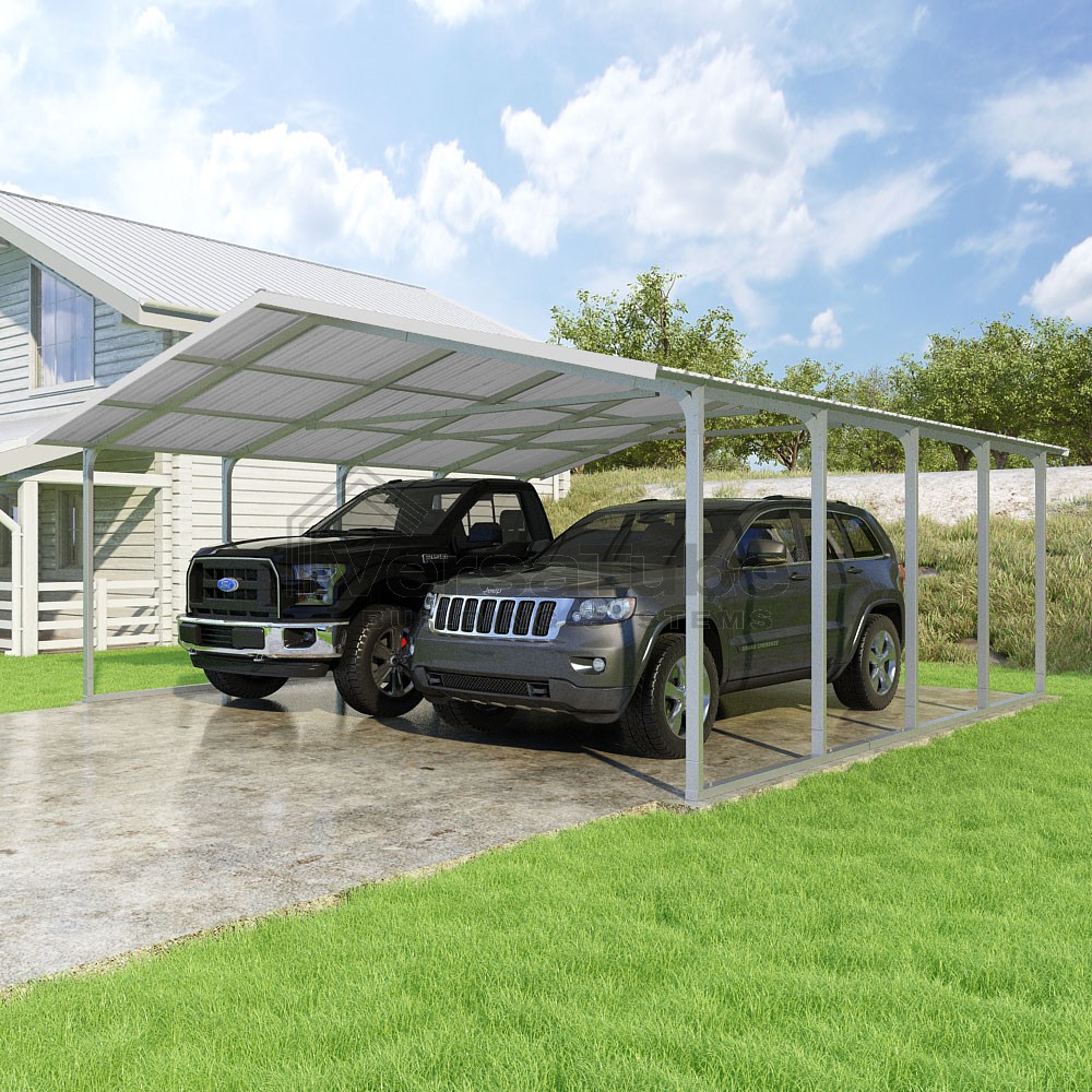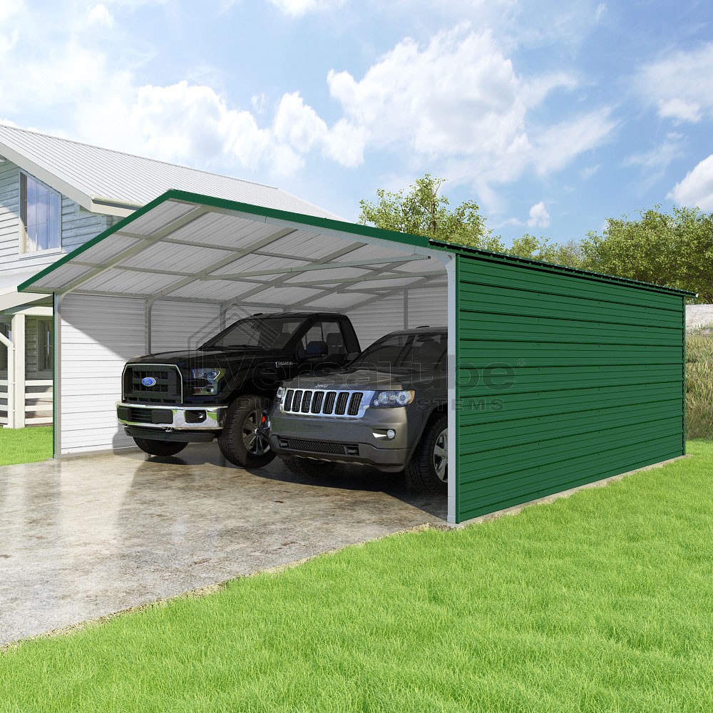 Pinnacle Series DIY carport kit features vertical sheet metal roof panels with ridge cap, gable and eave trim for an A-frame roof style and extended coverage on both ends.