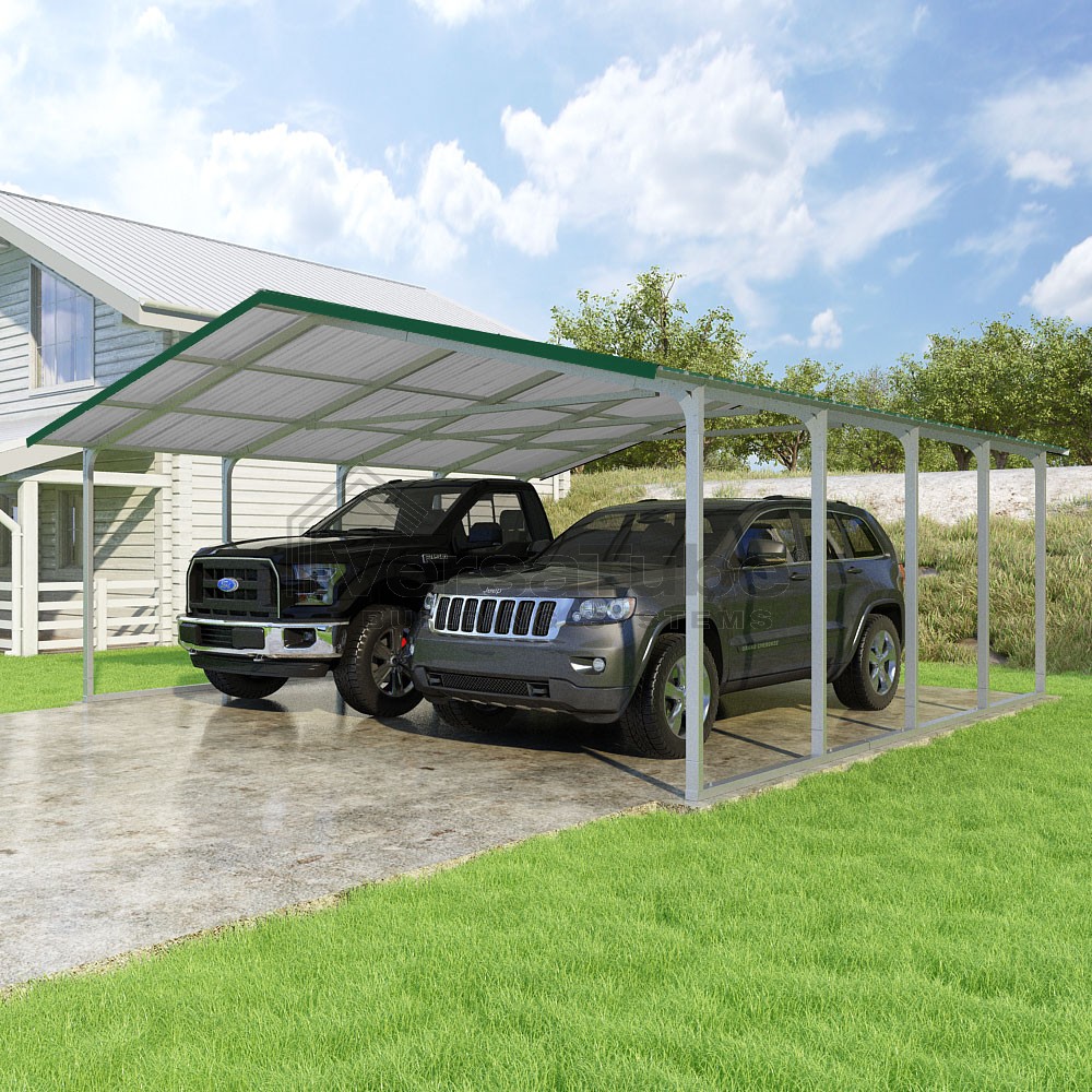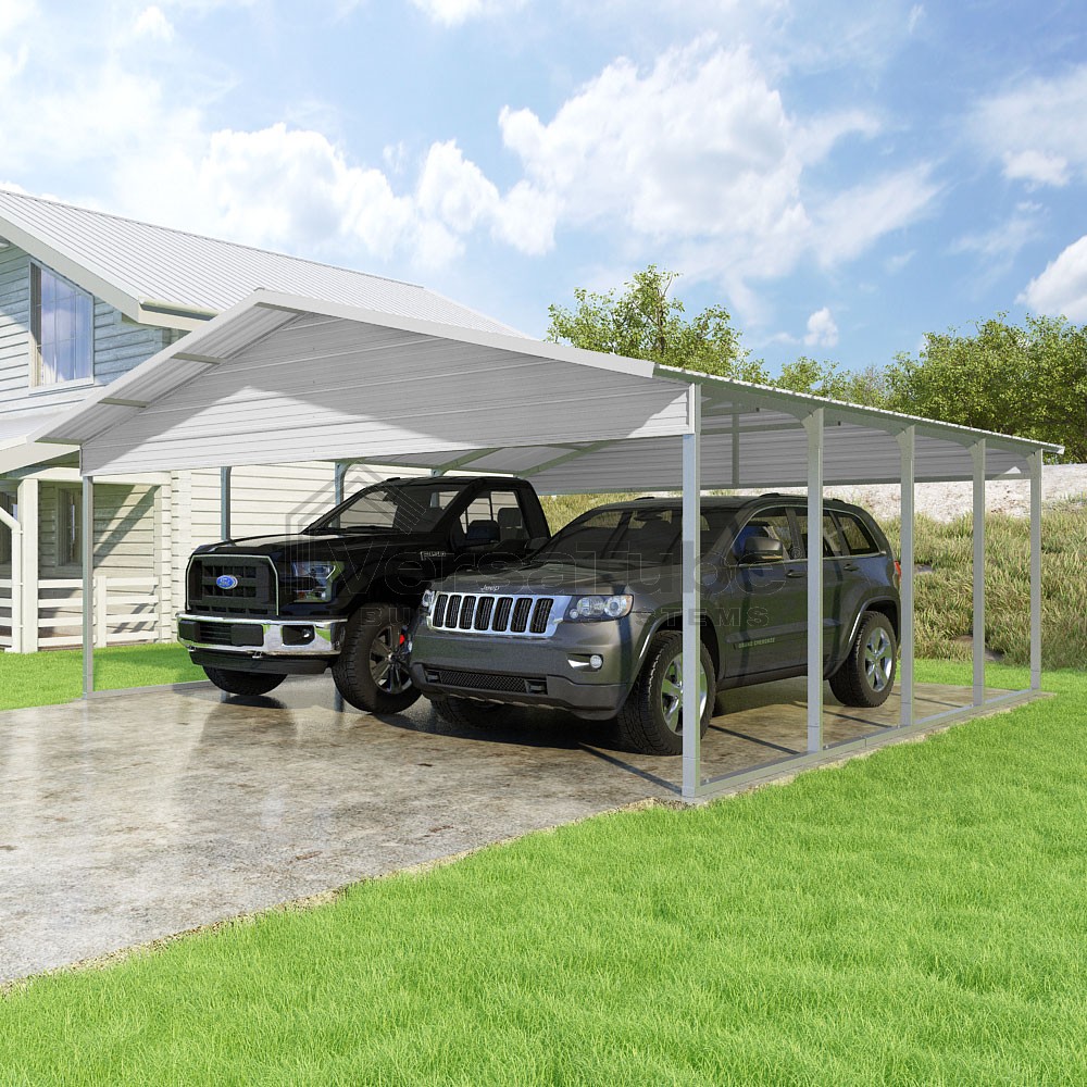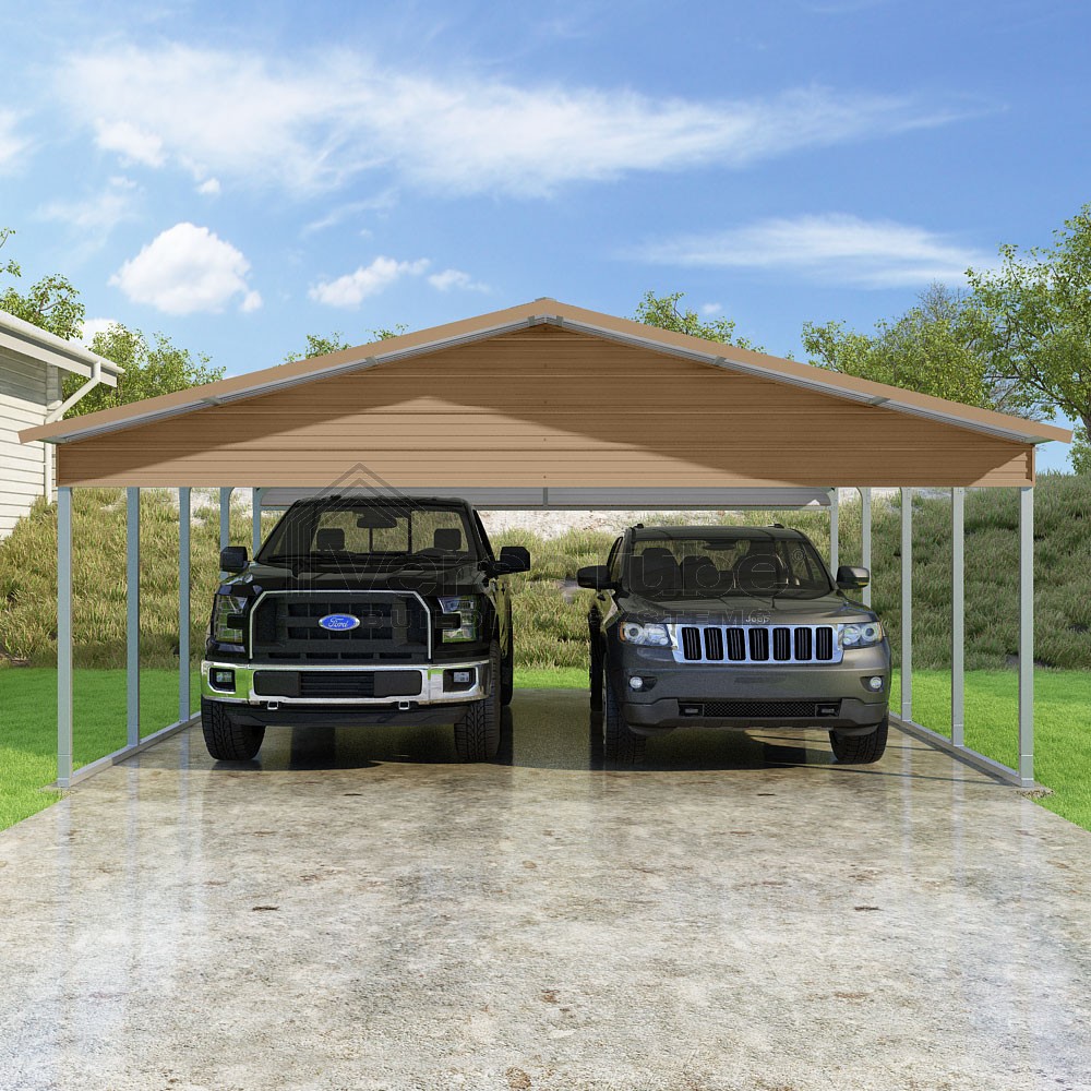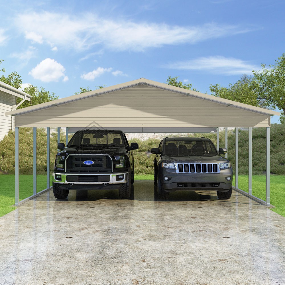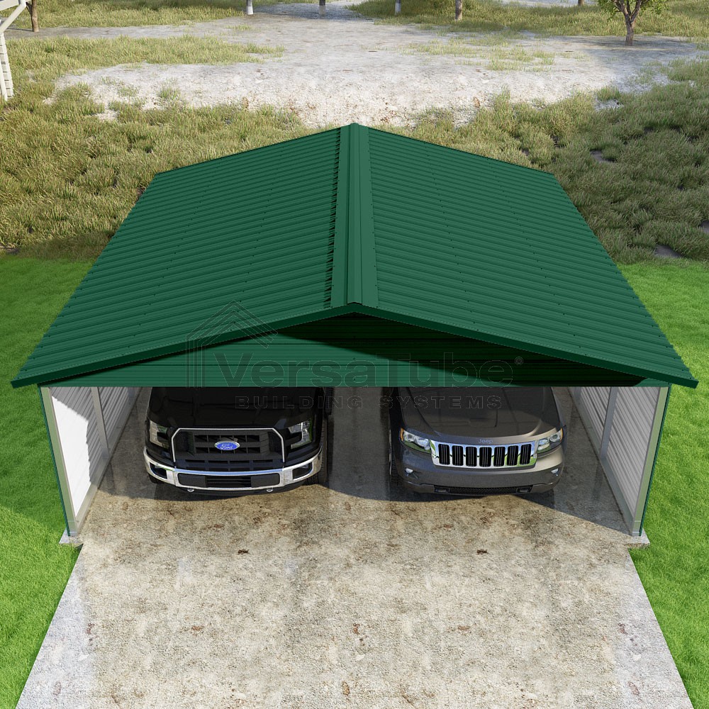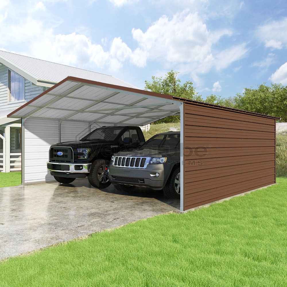 Pinnacle Series DIY carport kit features vertical sheet metal roof panels with ridge cap, gable and eave trim for an A-frame roof style and extended coverage on both ends.