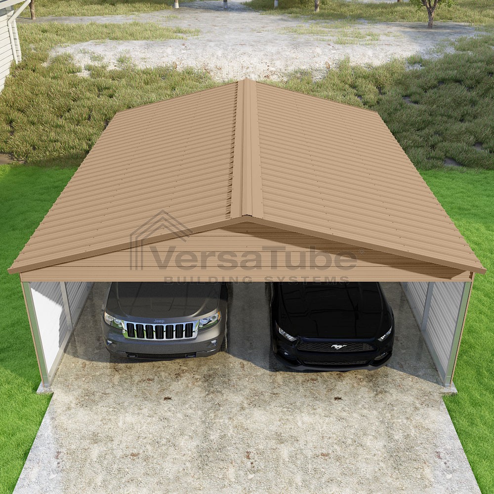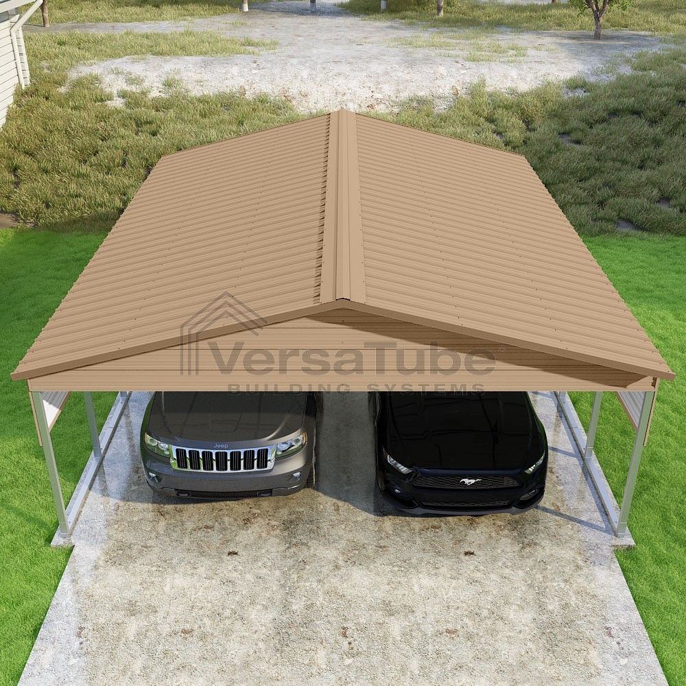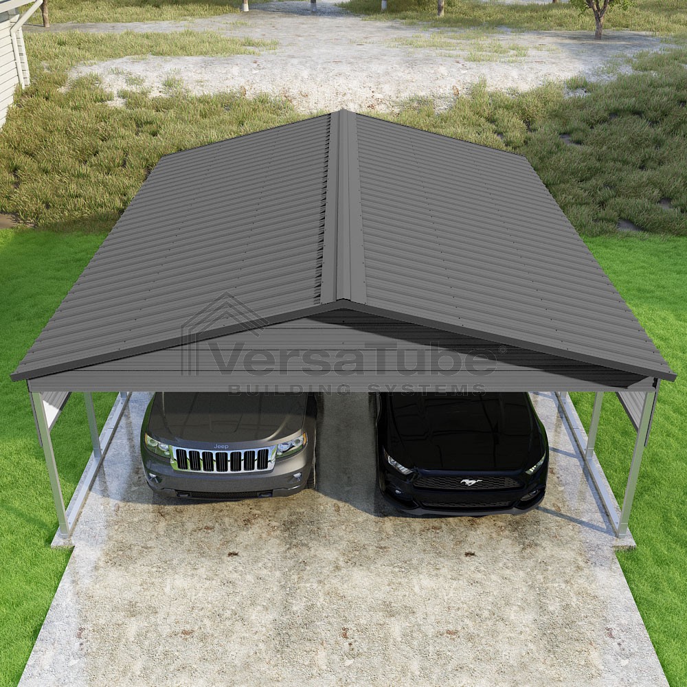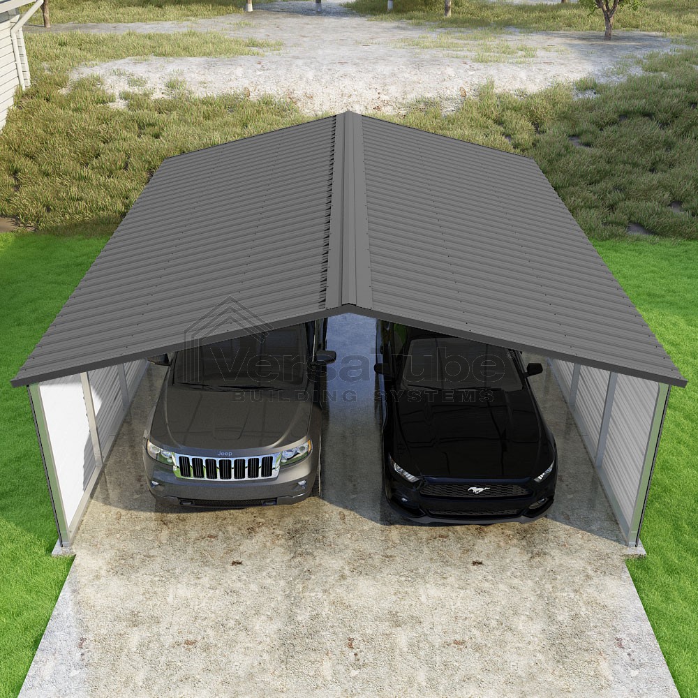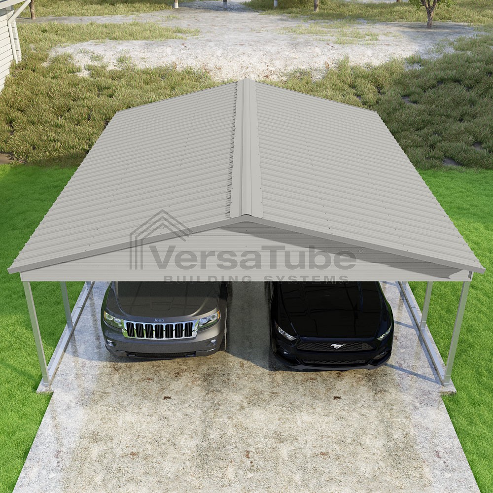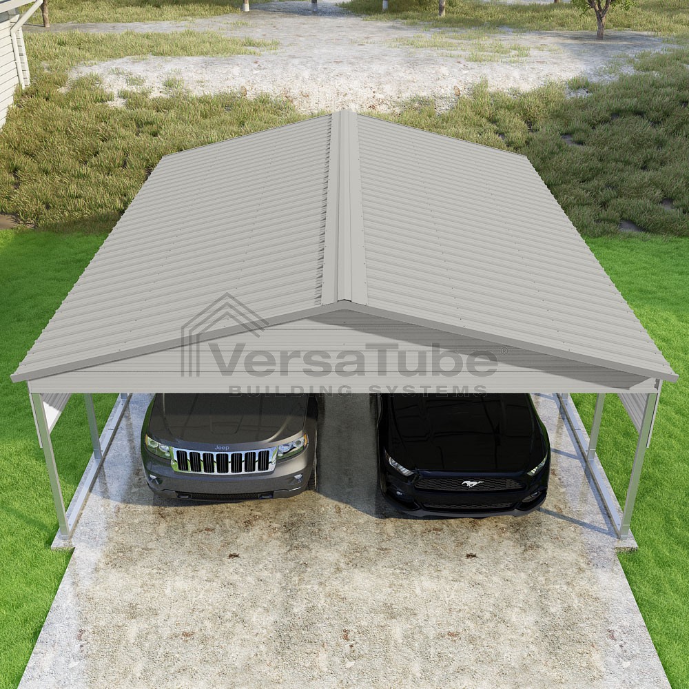 Pinnacle Series DIY carport kit features vertical sheet metal roof panels with ridge cap, gable and eave trim for an A-frame roof style and extended coverage on both ends.