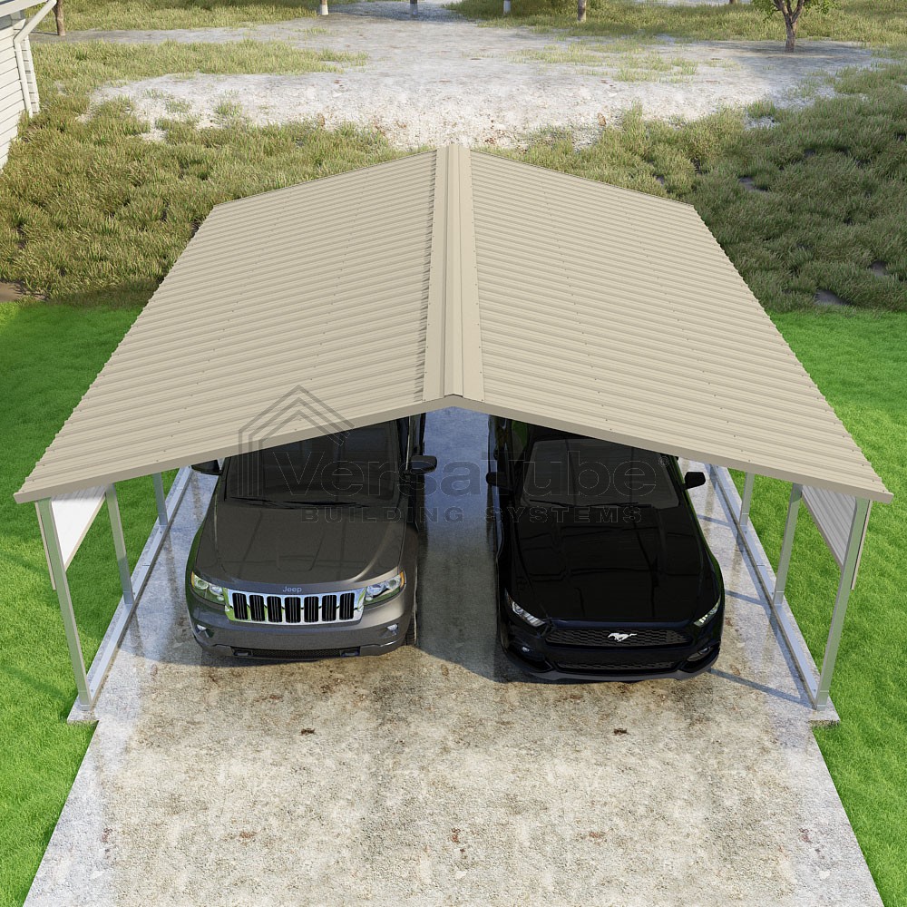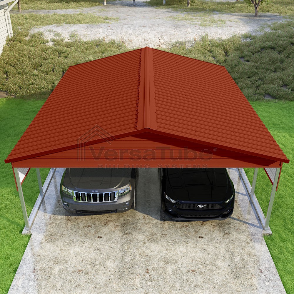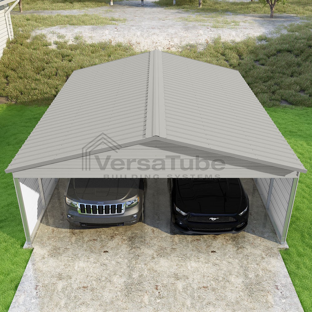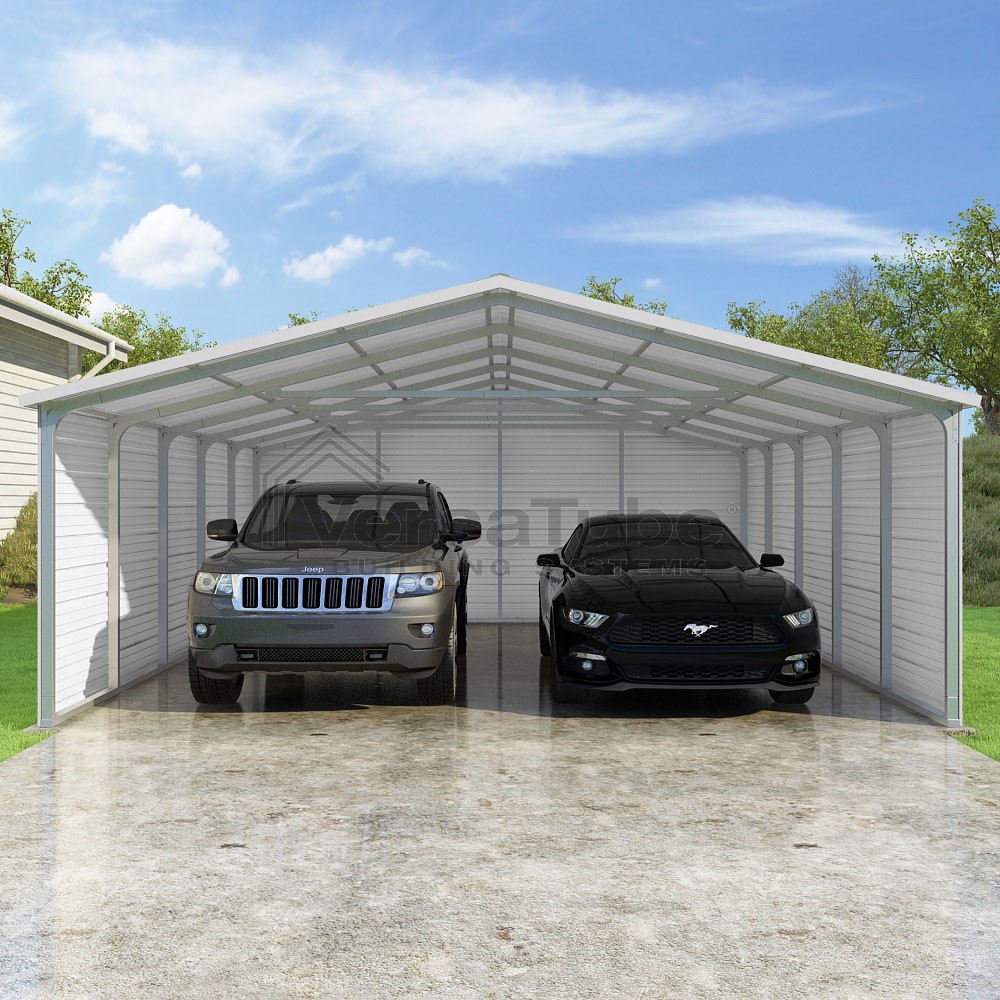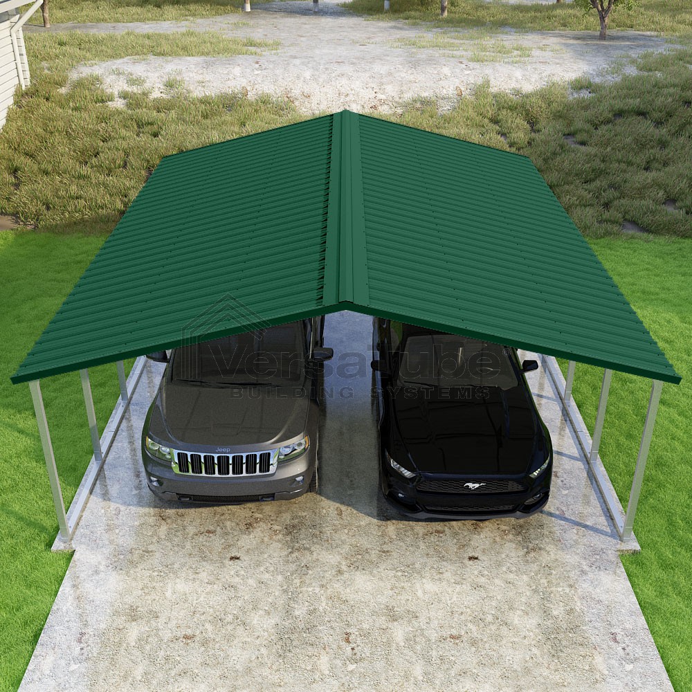 Pinnacle Series DIY carport kit features vertical sheet metal roof panels with ridge cap, gable and eave trim for an A-frame roof style and extended coverage on both ends.