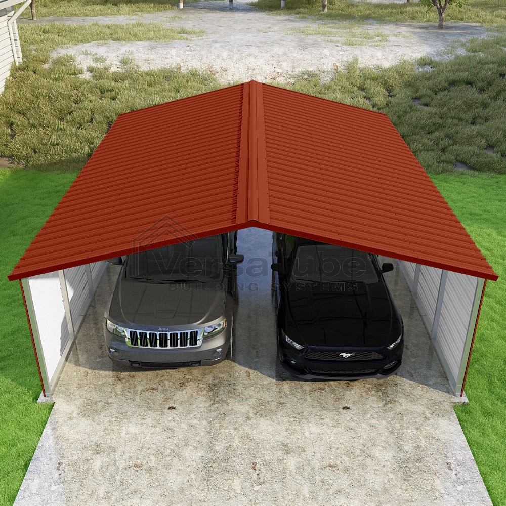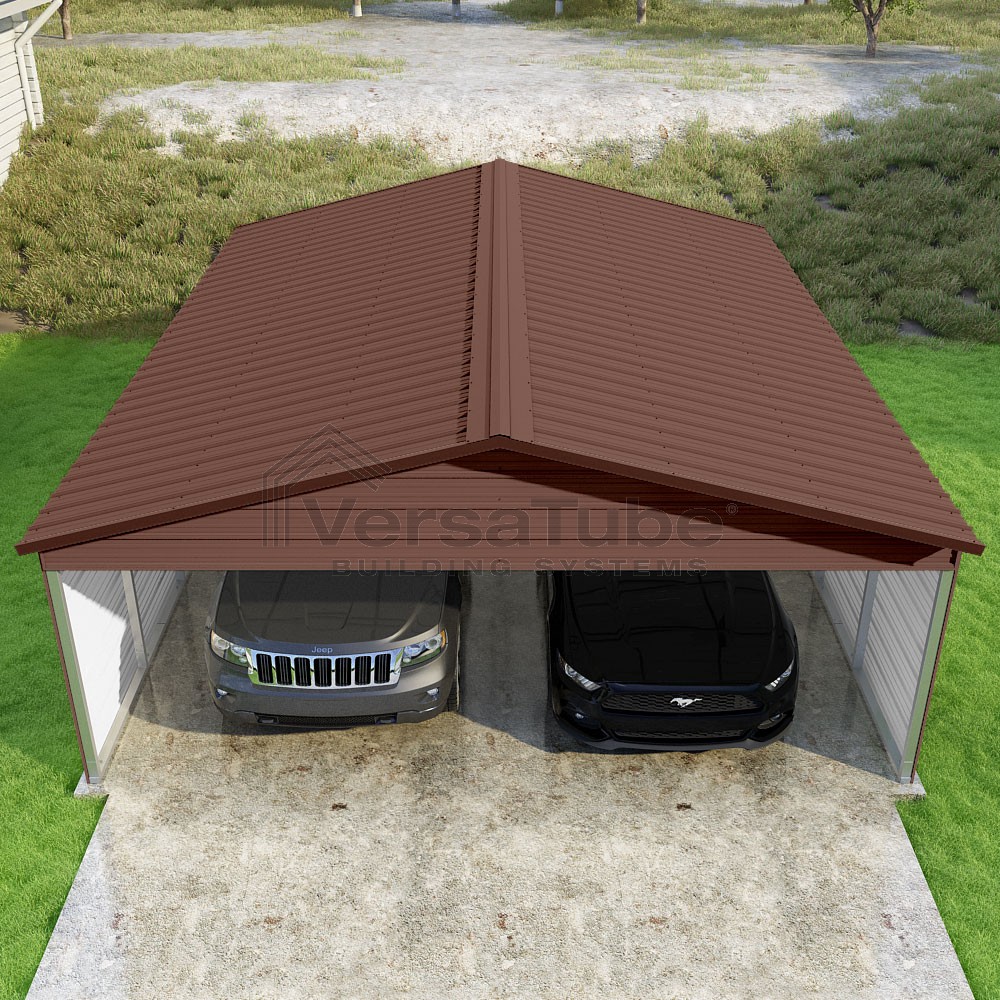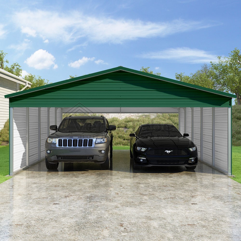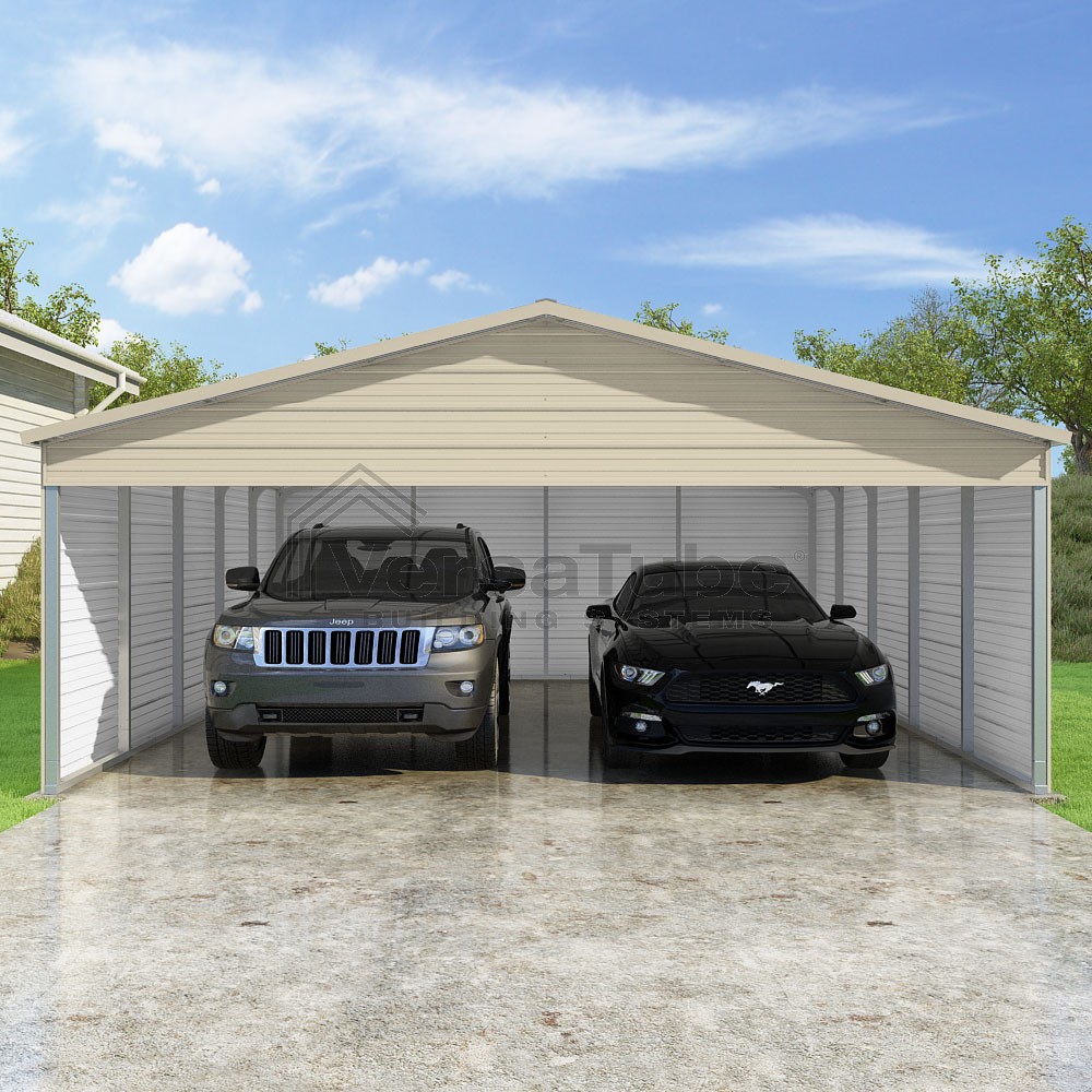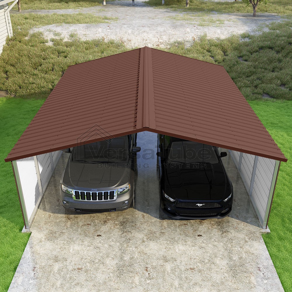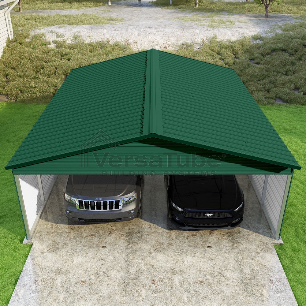 Pinnacle Series DIY carport kit features vertical sheet metal roof panels with ridge cap, gable and eave trim for an A-frame roof style and extended coverage on both ends.