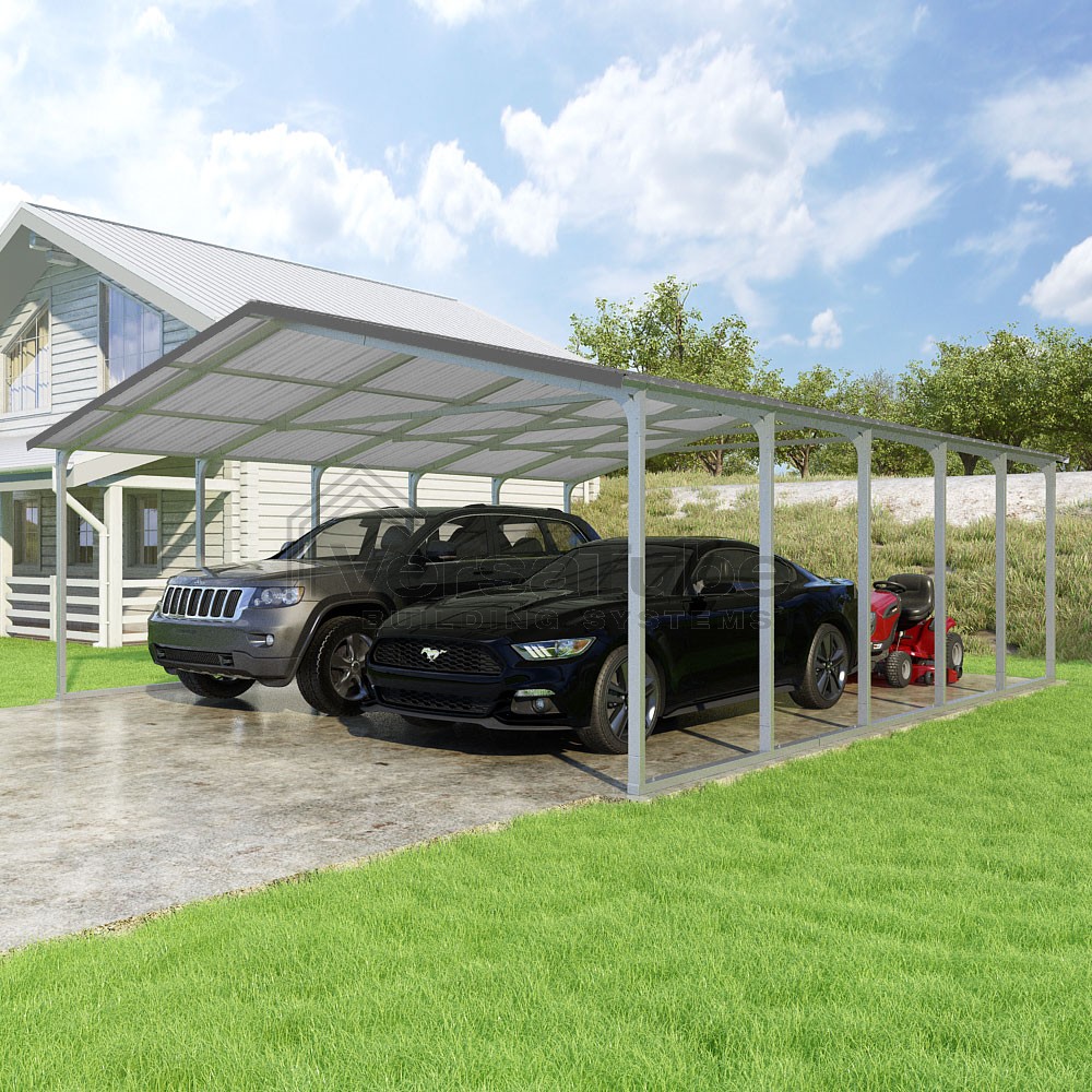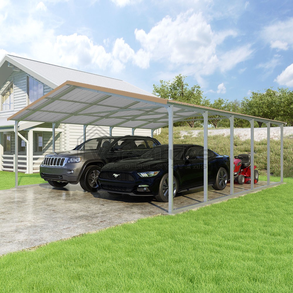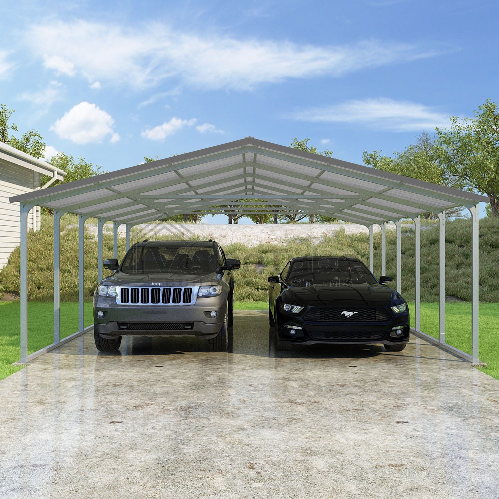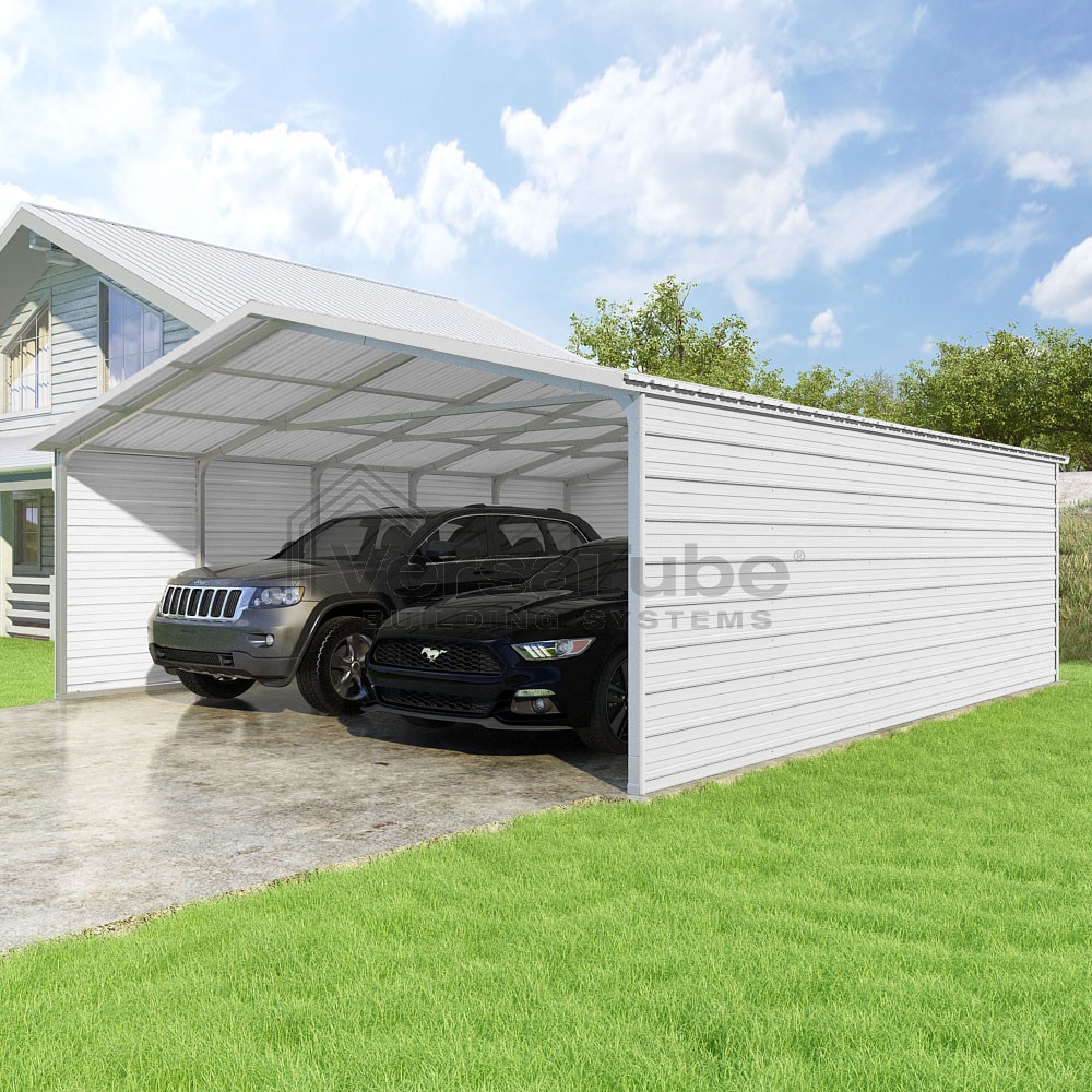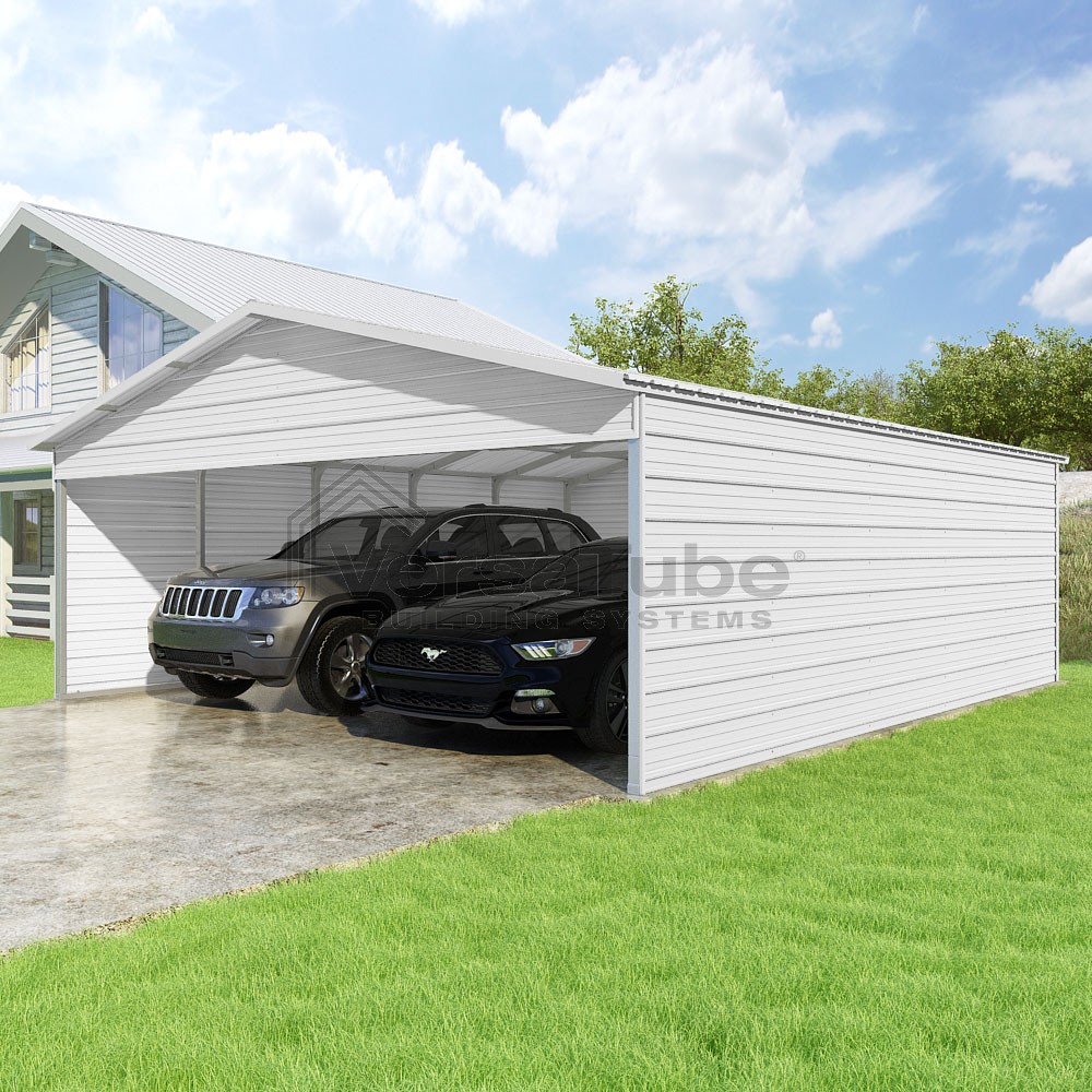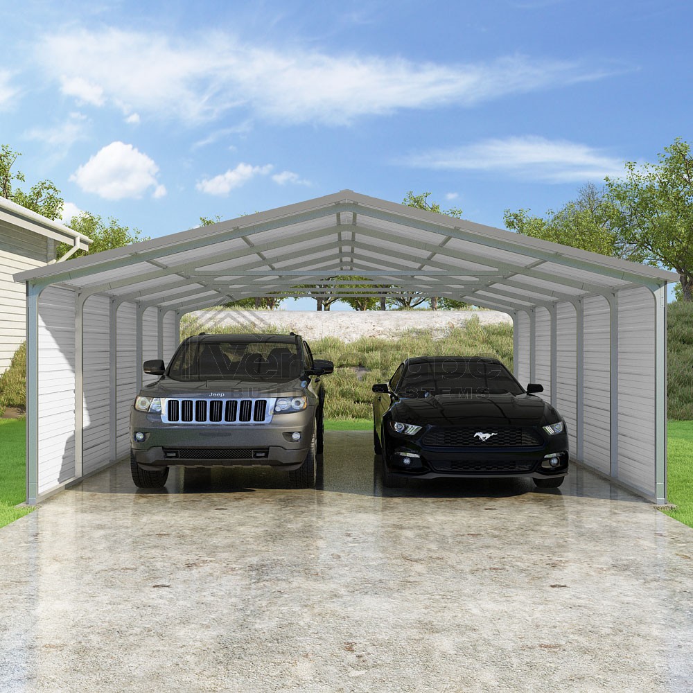 Pinnacle Series DIY carport kit features vertical sheet metal roof panels with ridge cap, gable and eave trim for an A-frame roof style and extended coverage on both ends.