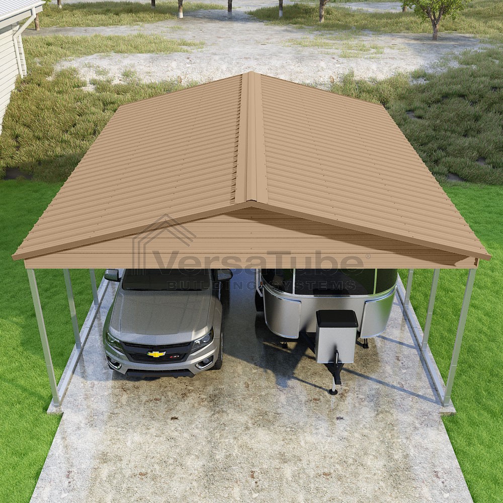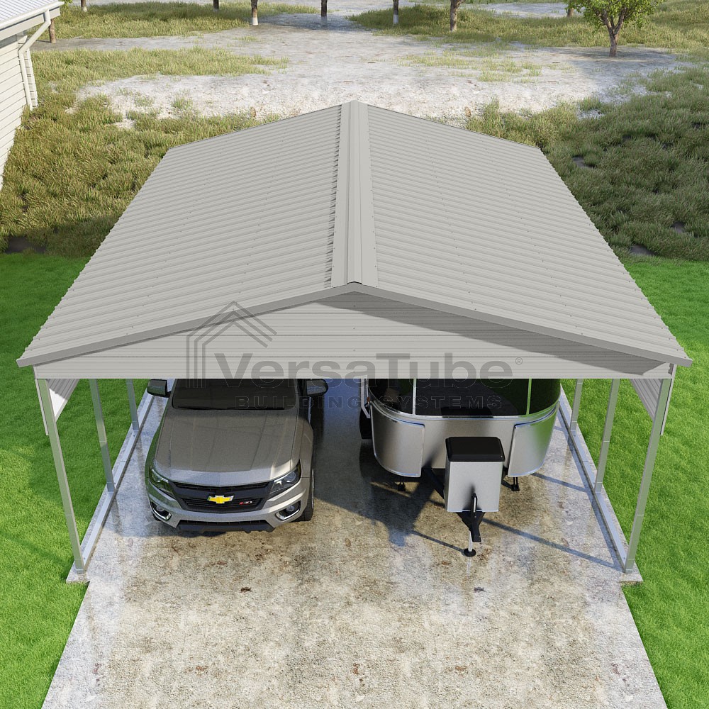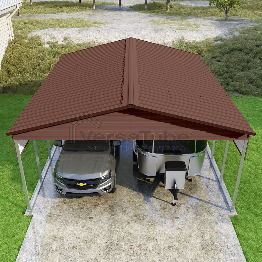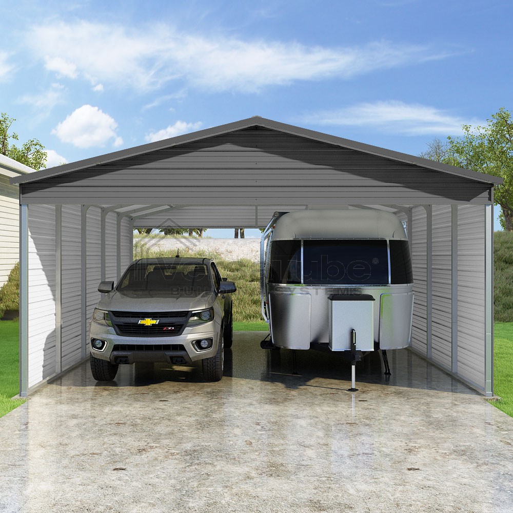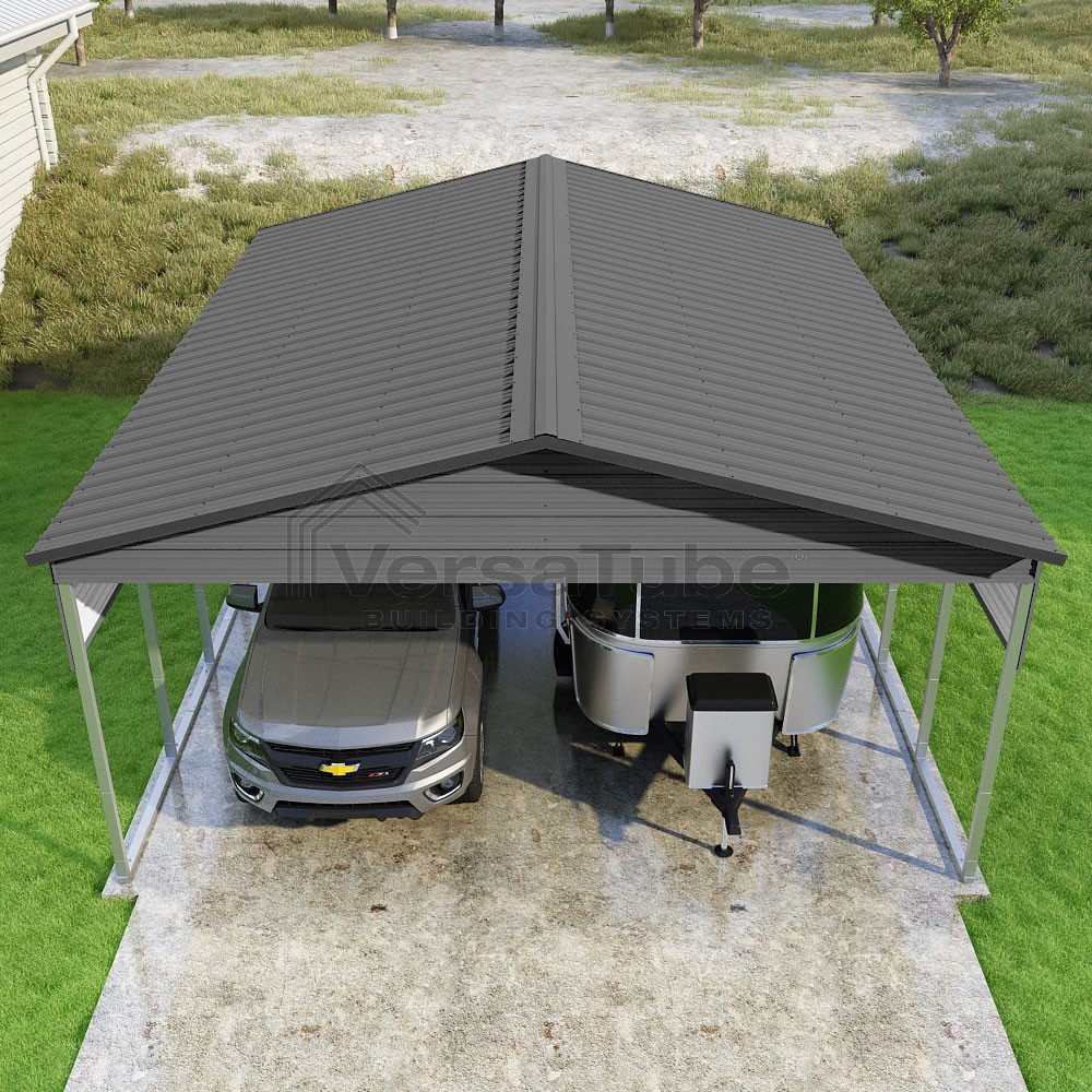 Pinnacle Series DIY carport kit features vertical sheet metal roof panels with ridge cap, gable and eave trim for an A-frame roof style and extended coverage on both ends.