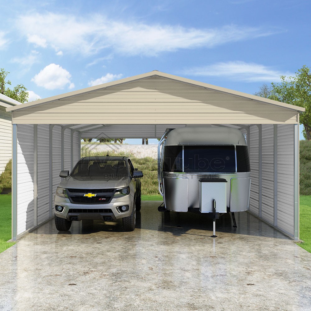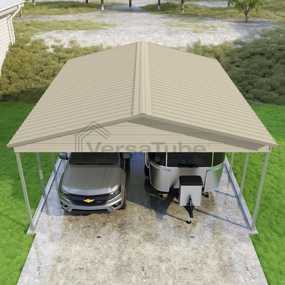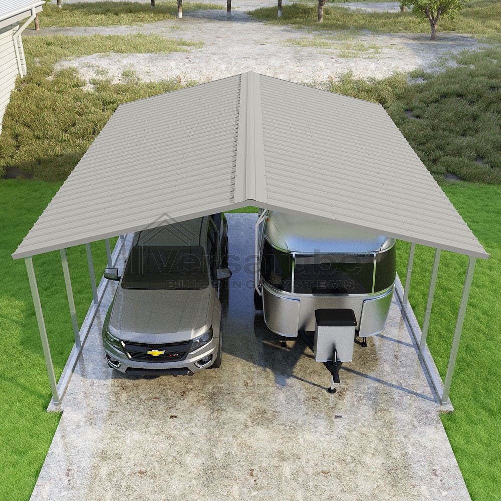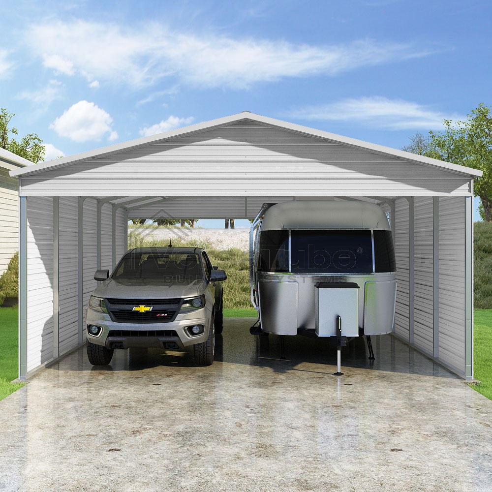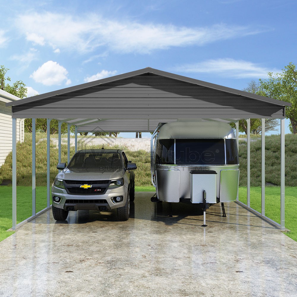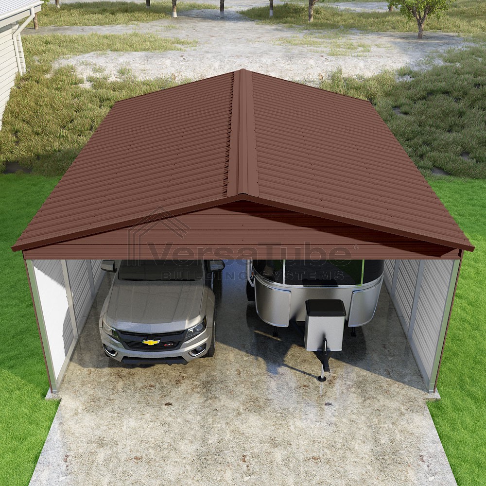 Pinnacle Series DIY carport kit features vertical sheet metal roof panels with ridge cap, gable and eave trim for an A-frame roof style and extended coverage on both ends.