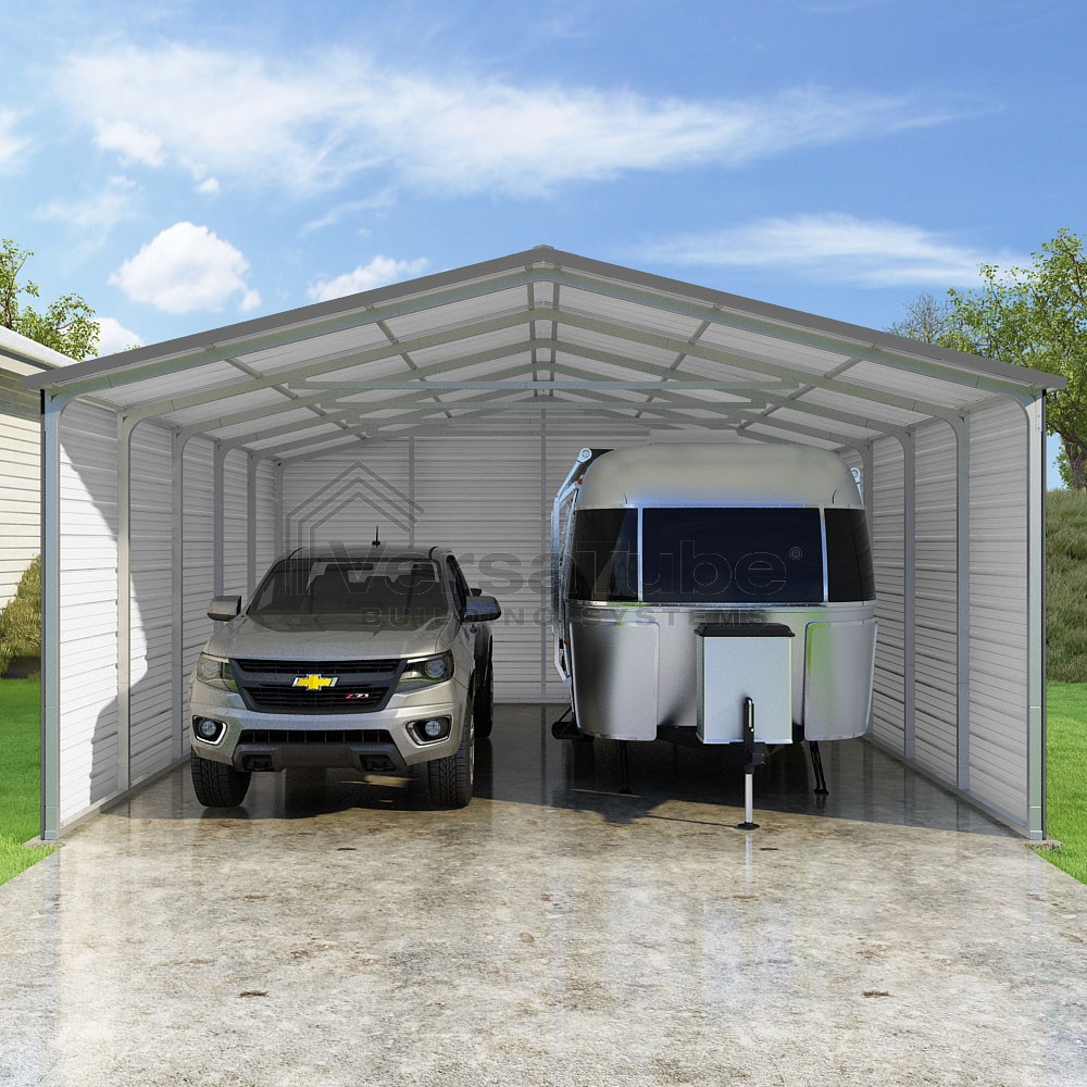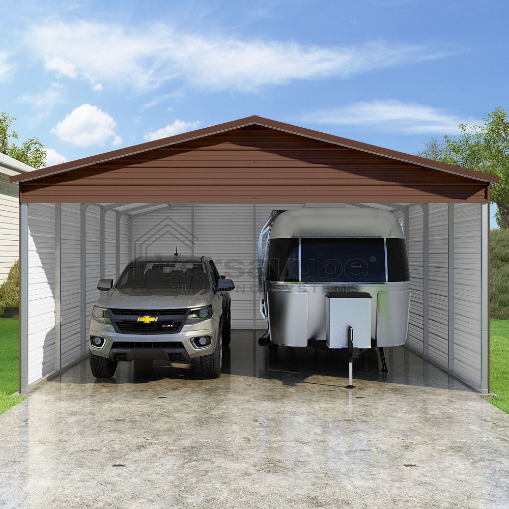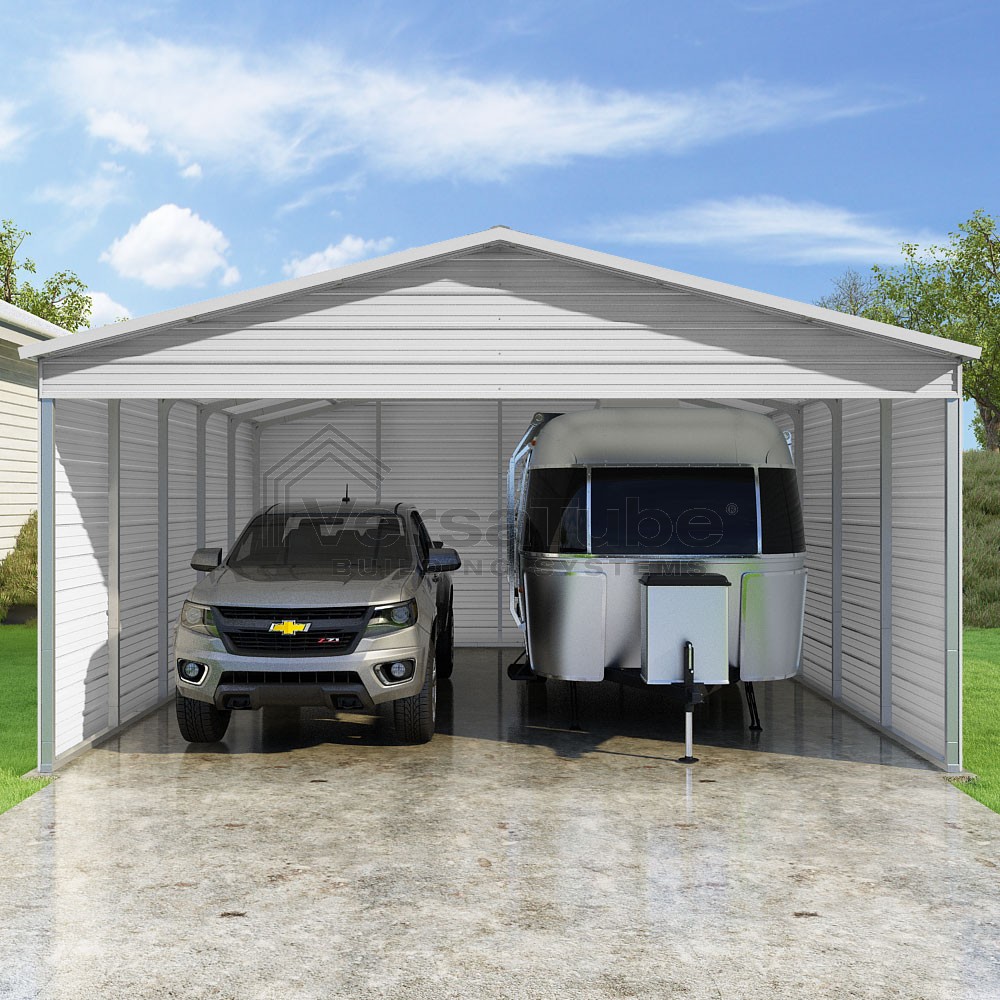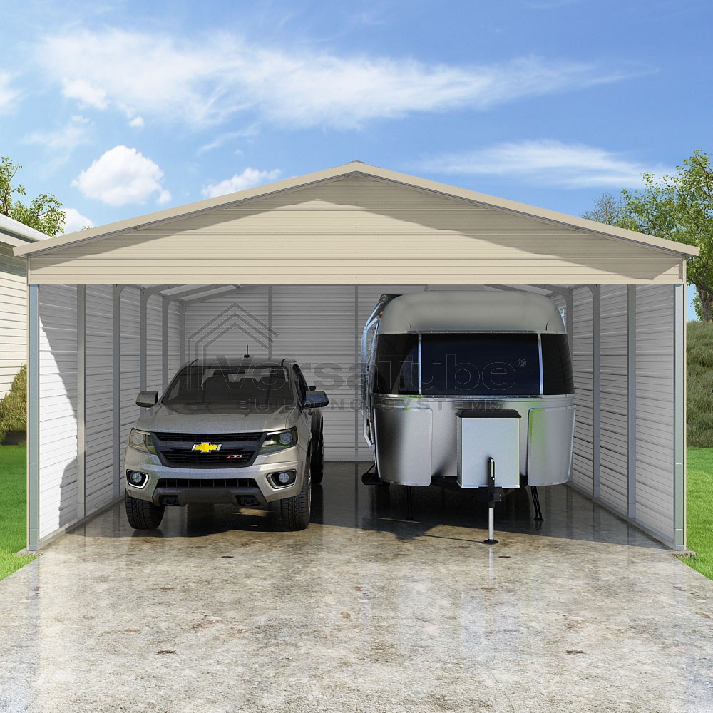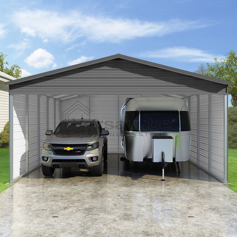 Pinnacle Series DIY carport kit features vertical sheet metal roof panels with ridge cap, gable and eave trim for an A-frame roof style and extended coverage on both ends.