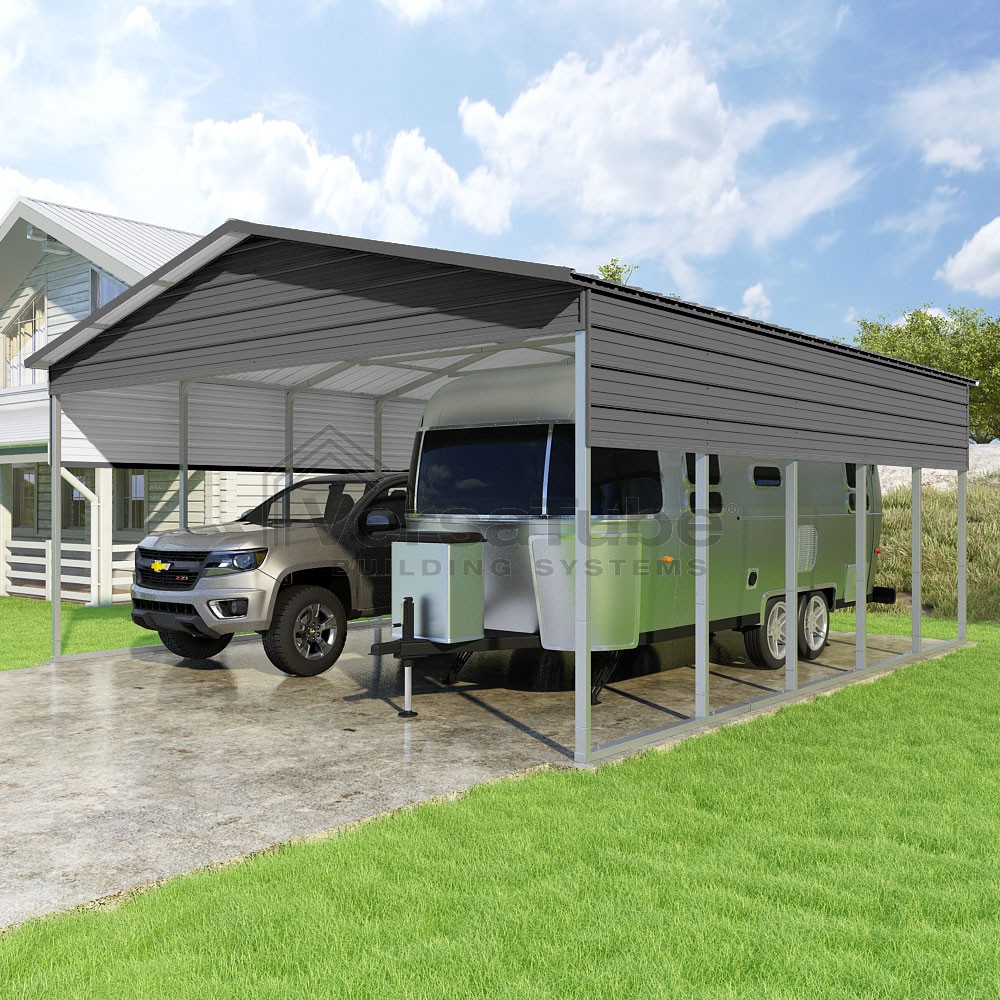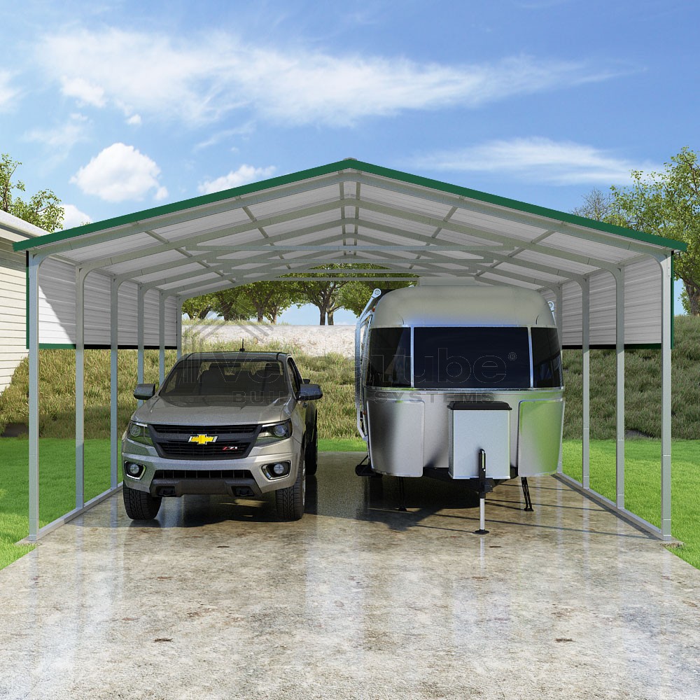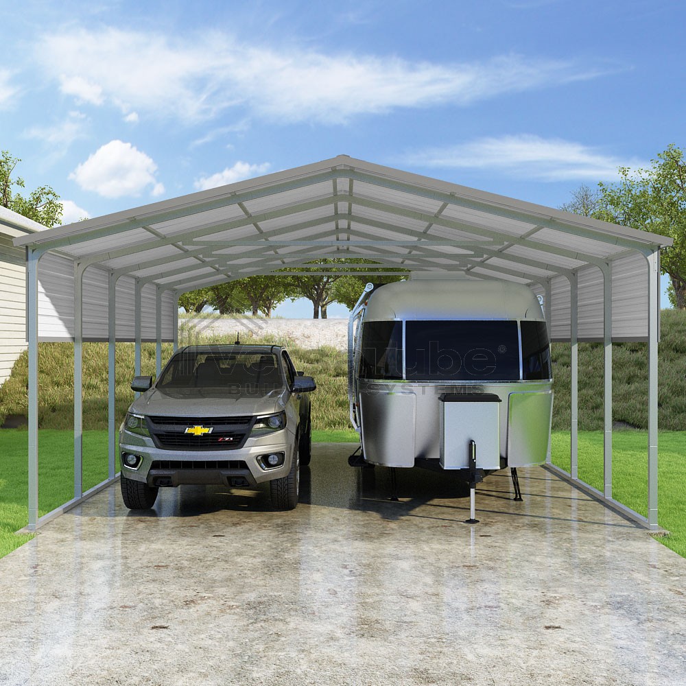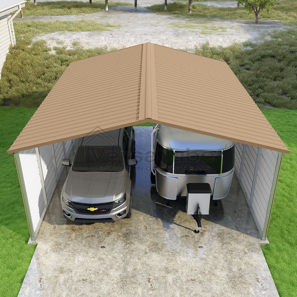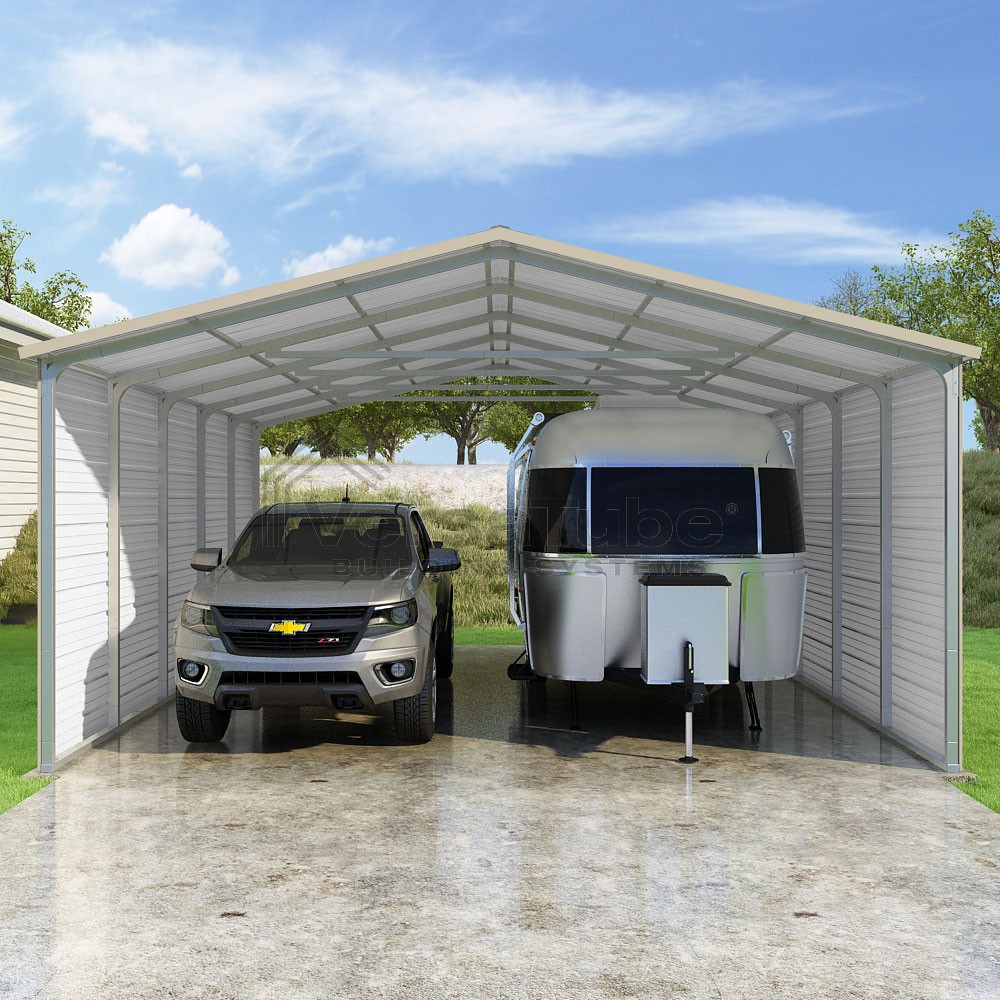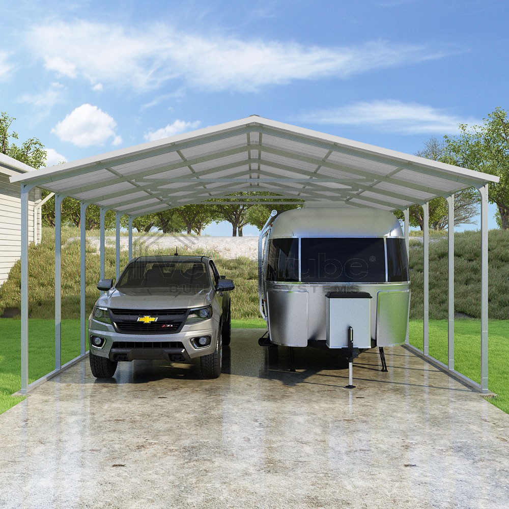 Pinnacle Series DIY carport kit features vertical sheet metal roof panels with ridge cap, gable and eave trim for an A-frame roof style and extended coverage on both ends.