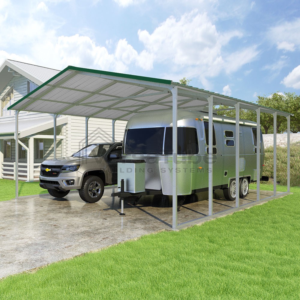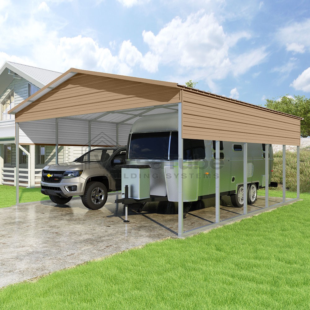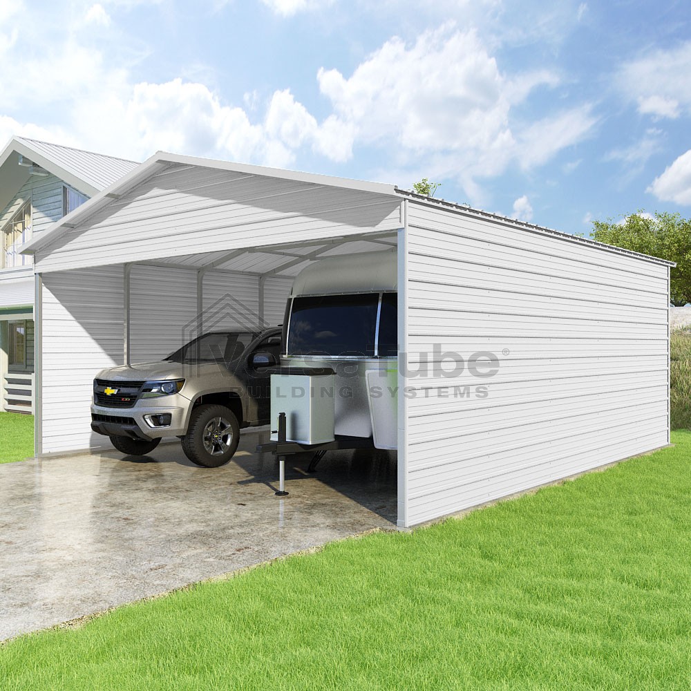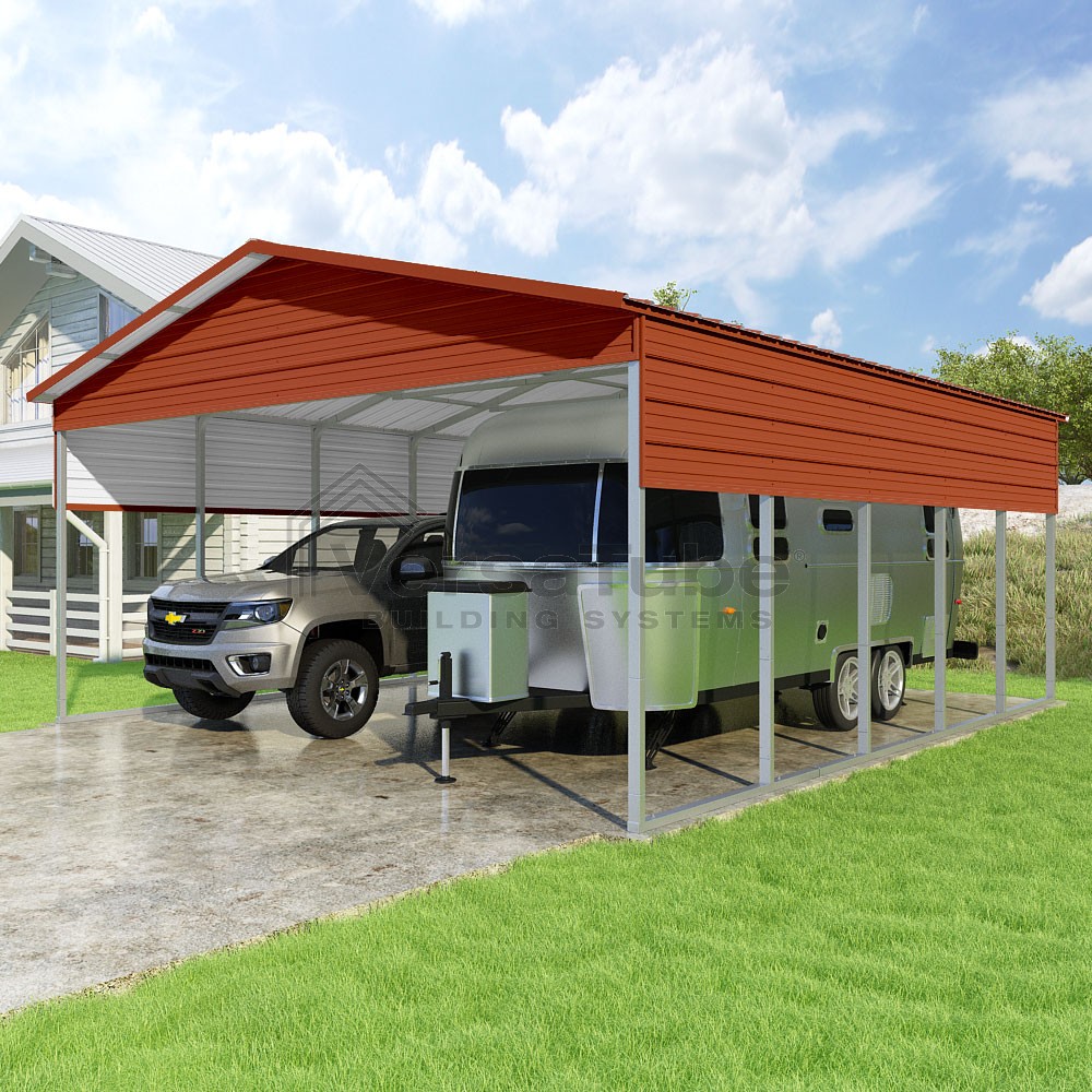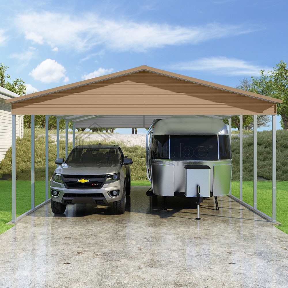 Pinnacle Series DIY carport kit features vertical sheet metal roof panels with ridge cap, gable and eave trim for an A-frame roof style and extended coverage on both ends.