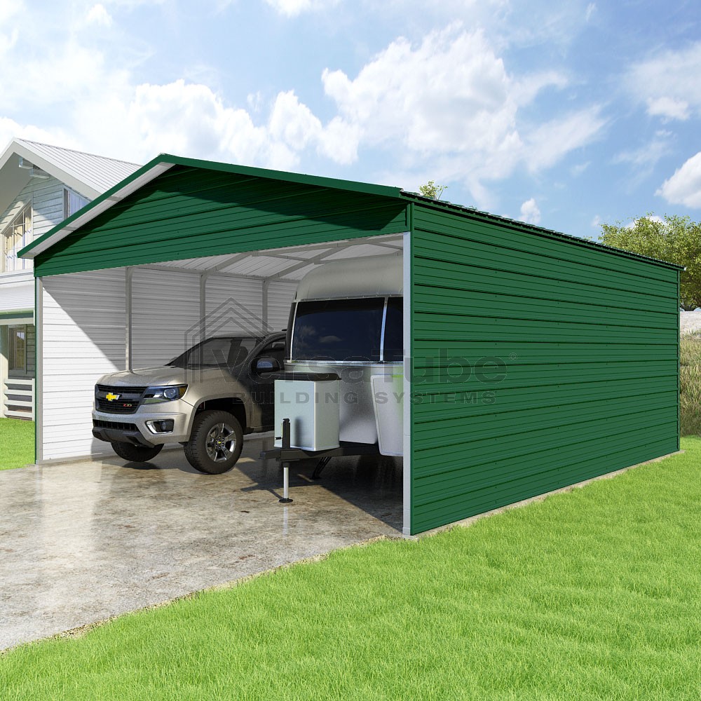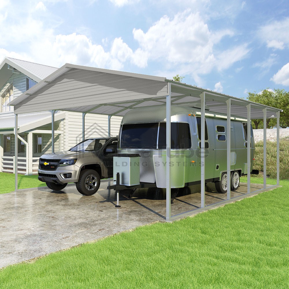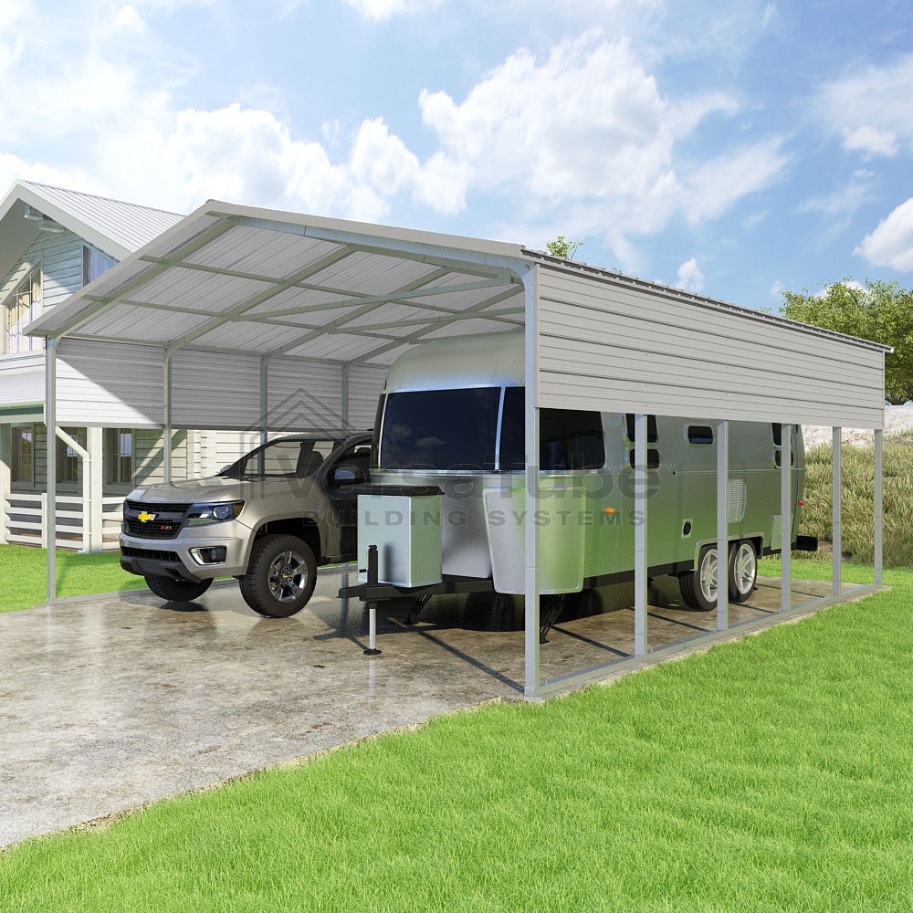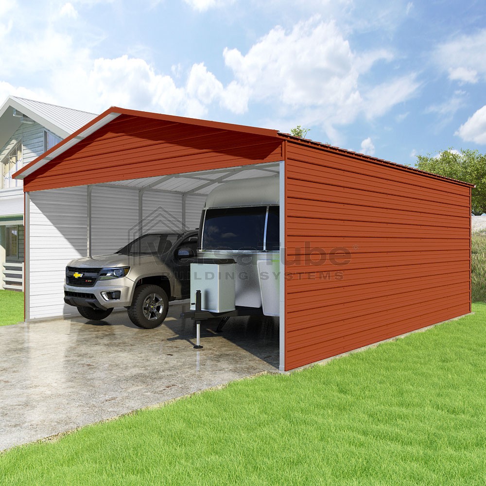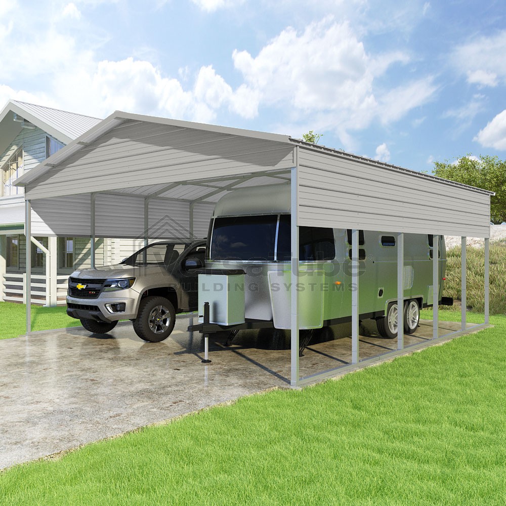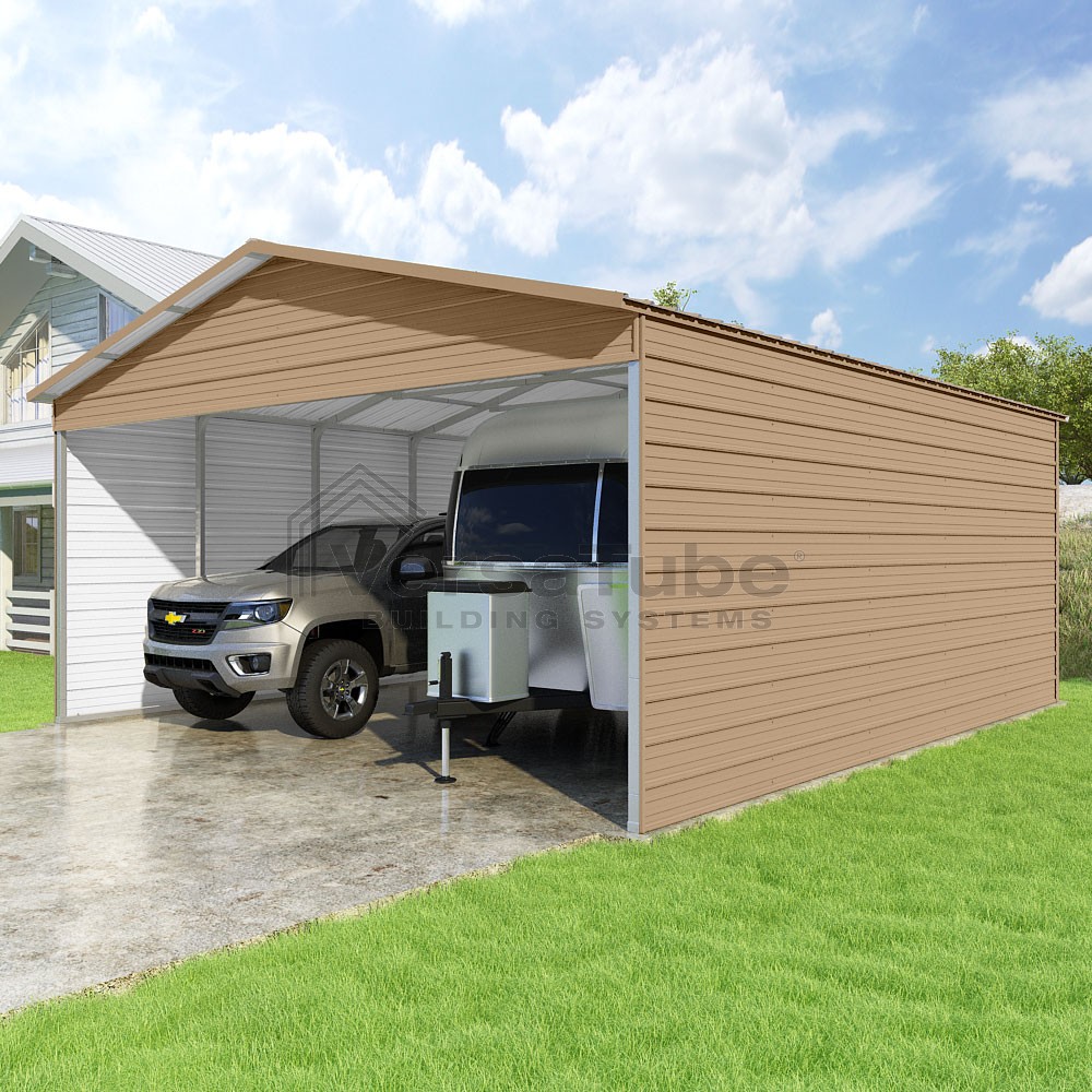 Pinnacle Series DIY carport kit features vertical sheet metal roof panels with ridge cap, gable and eave trim for an A-frame roof style and extended coverage on both ends.
