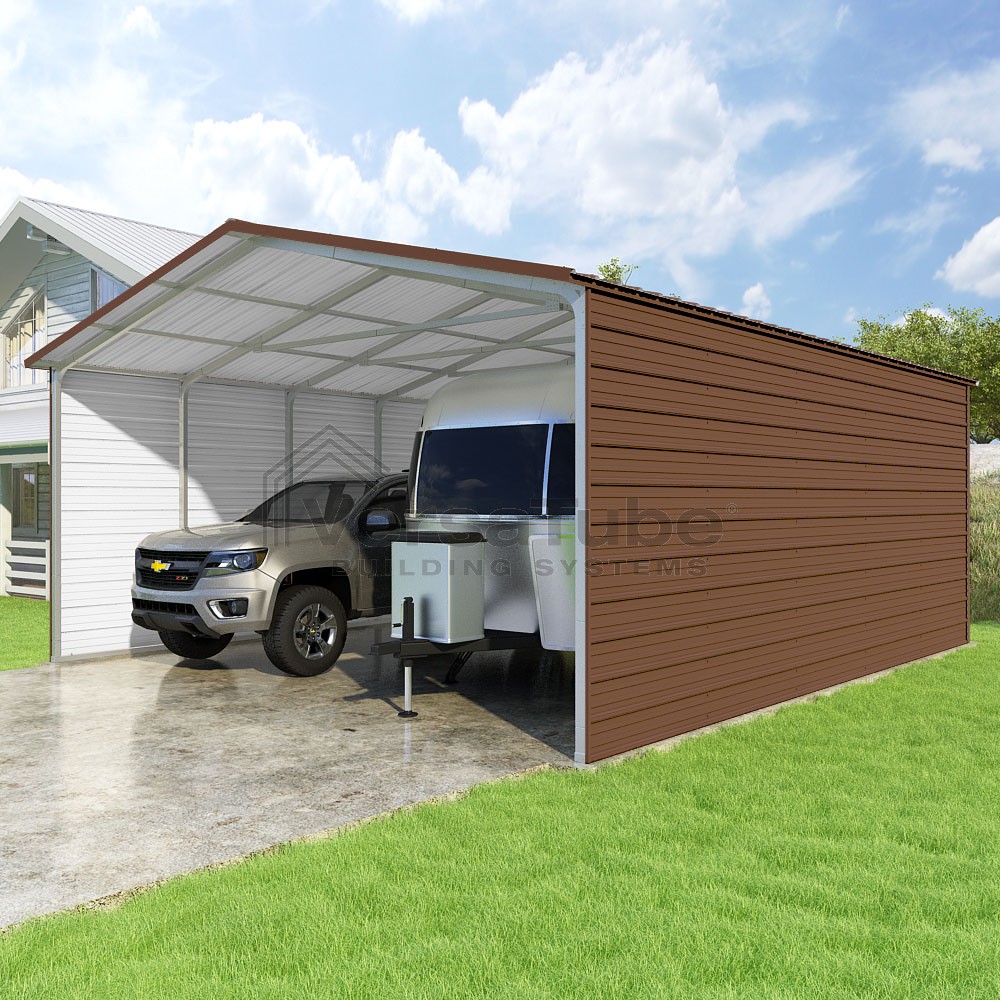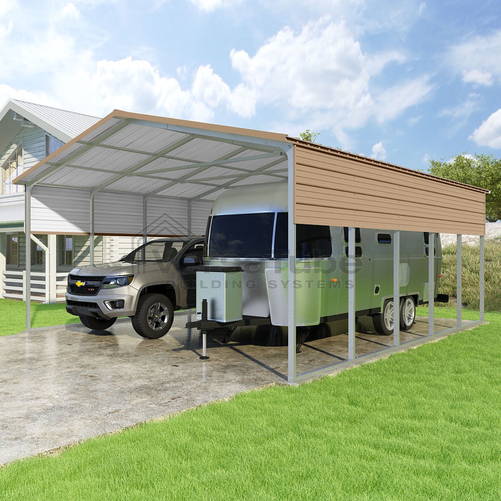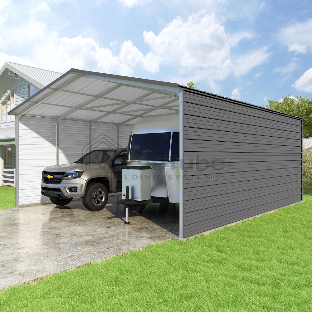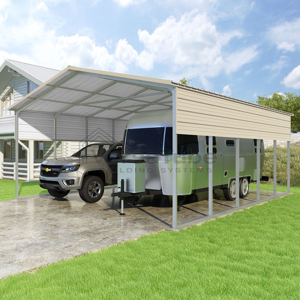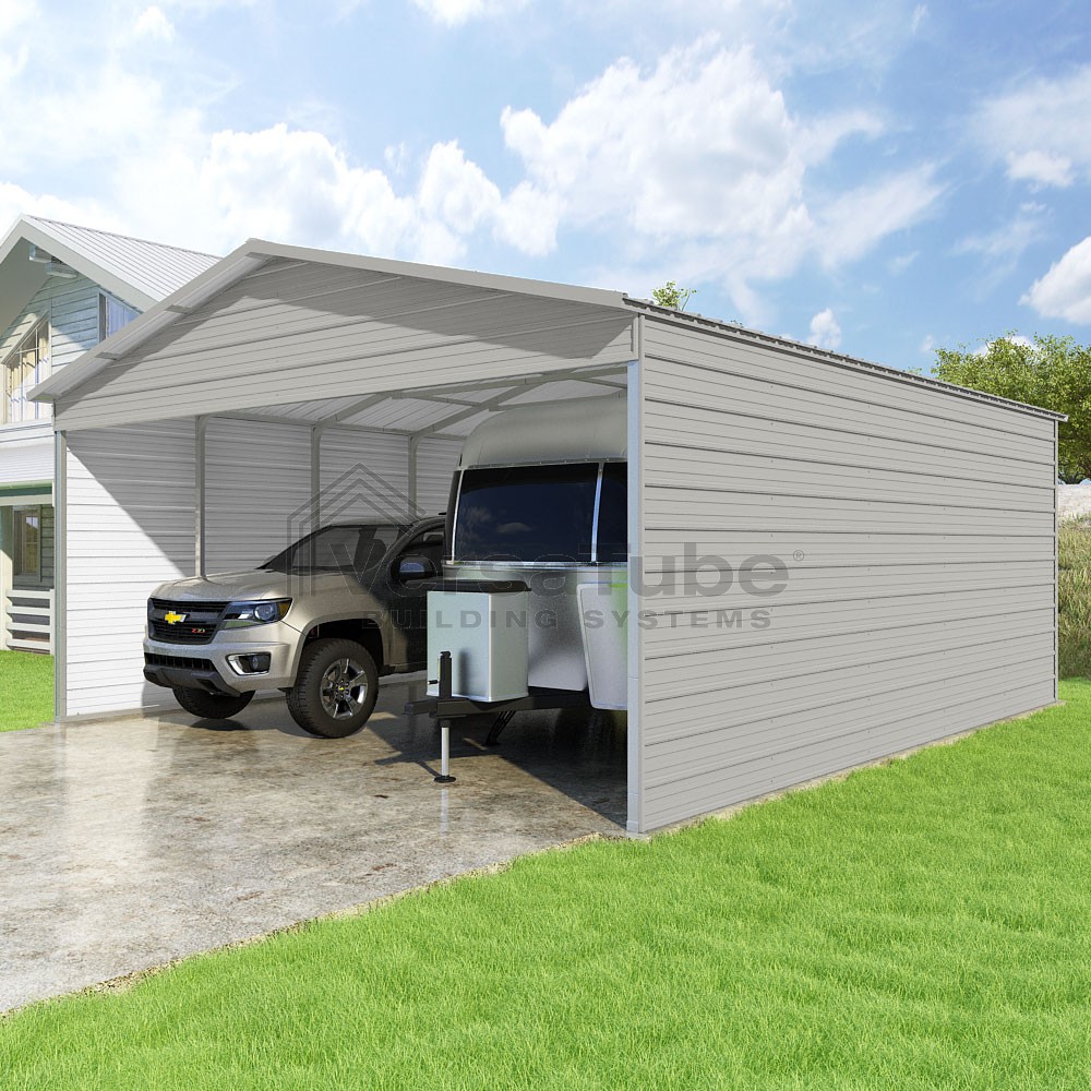 Pinnacle Series DIY carport kit features vertical sheet metal roof panels with ridge cap, gable and eave trim for an A-frame roof style and extended coverage on both ends.