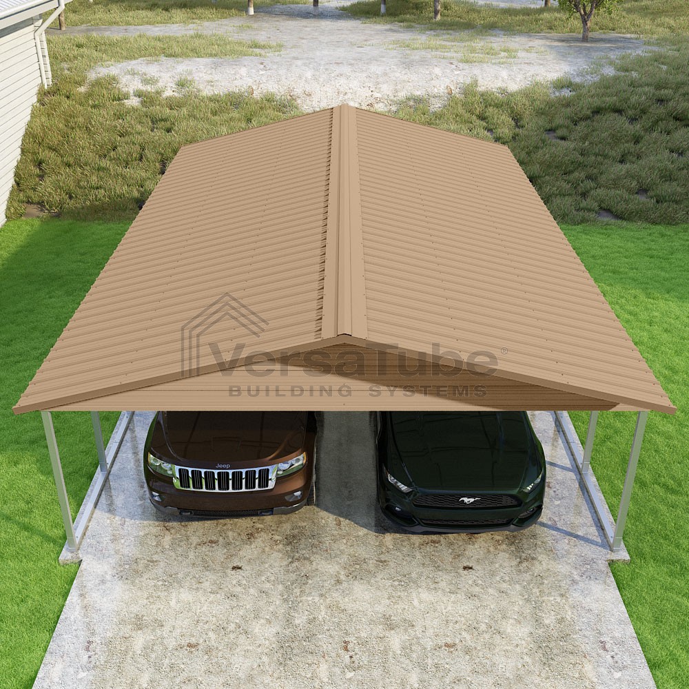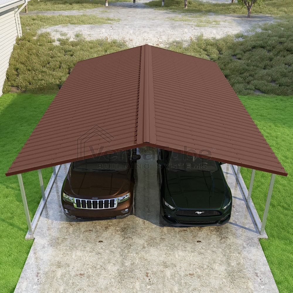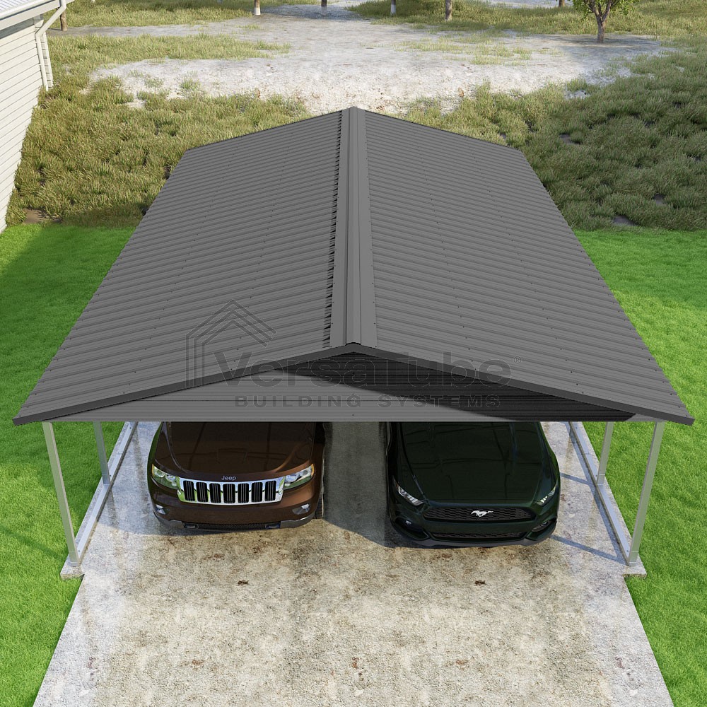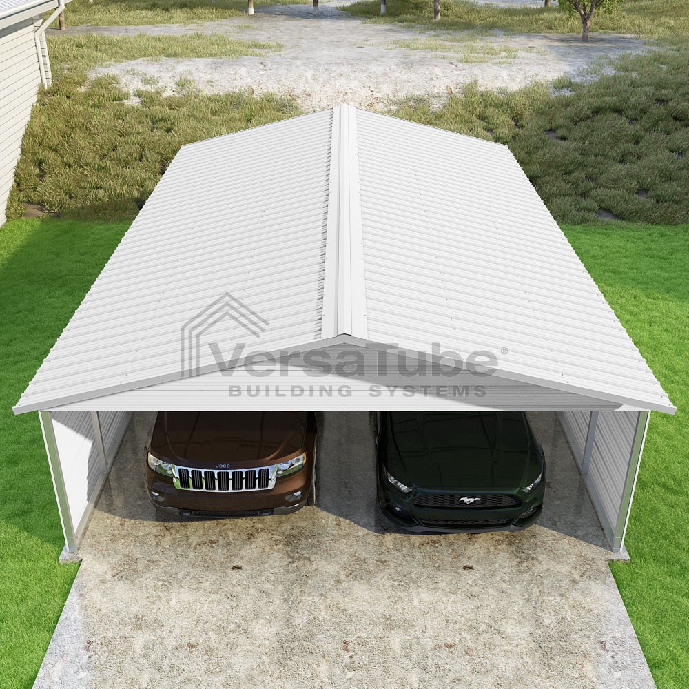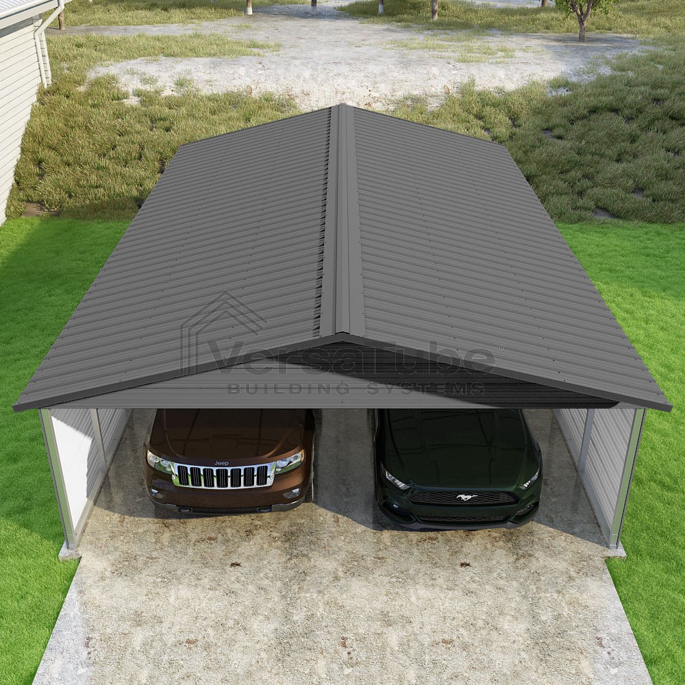 Pinnacle Series DIY carport kit features vertical sheet metal roof panels with ridge cap, gable and eave trim for an A-frame roof style and extended coverage on both ends.