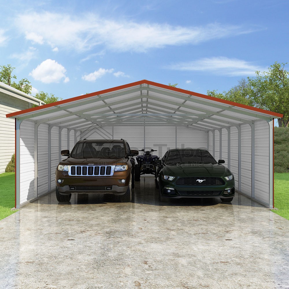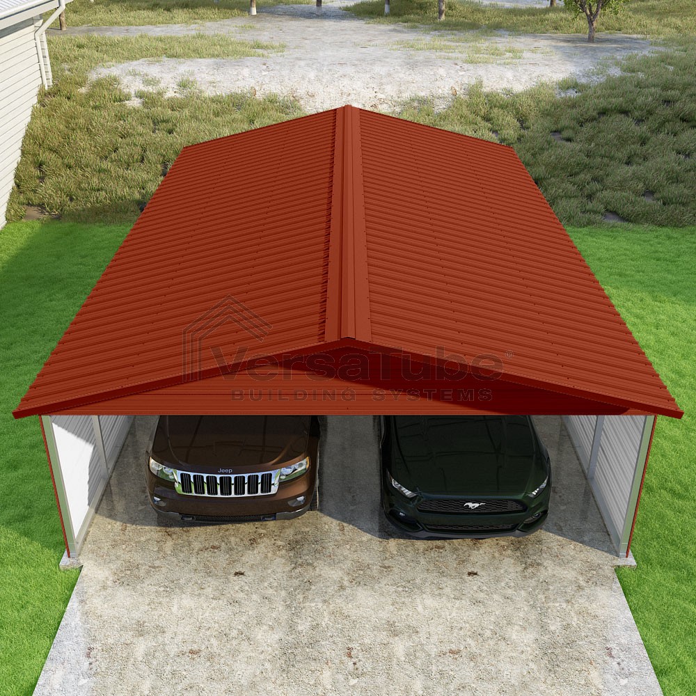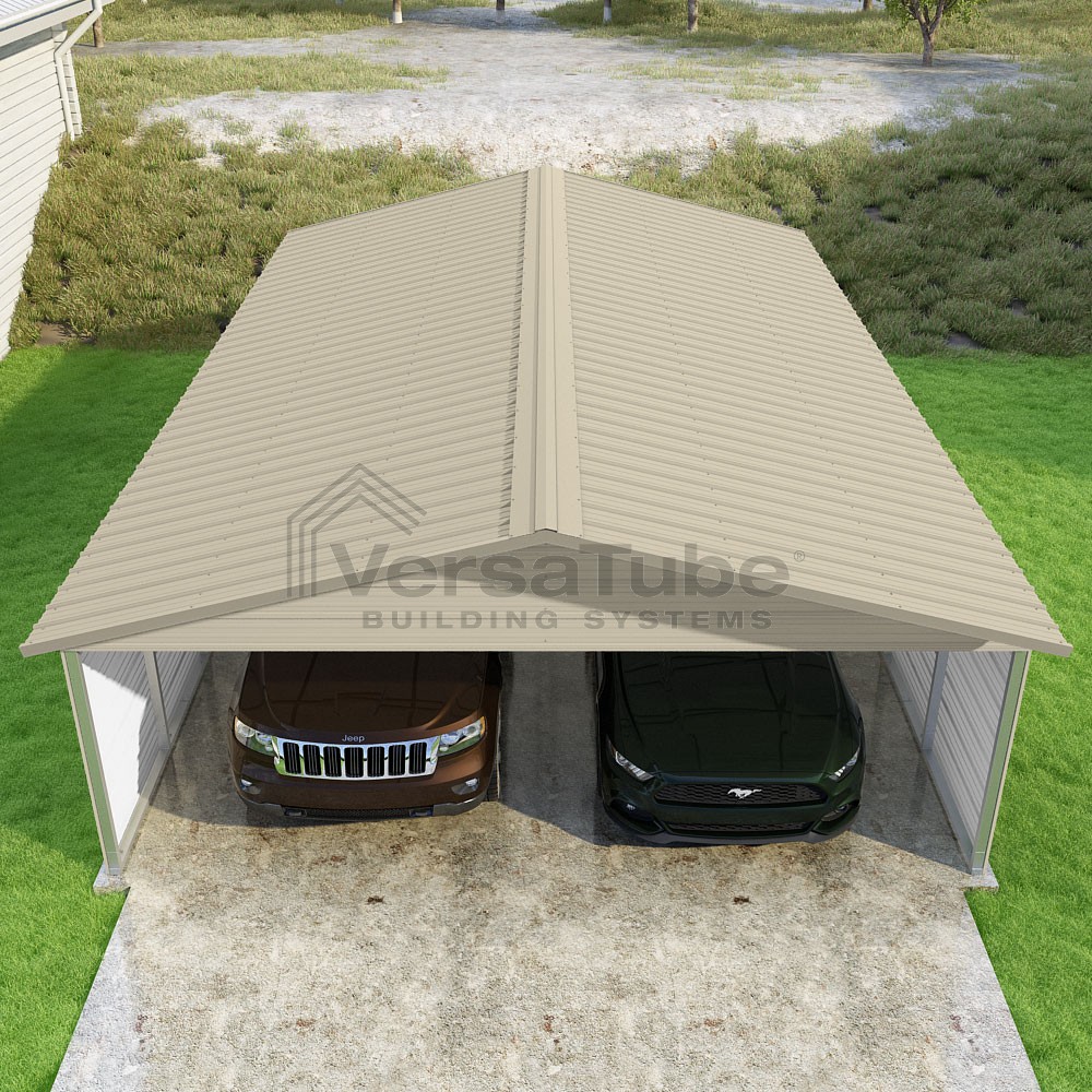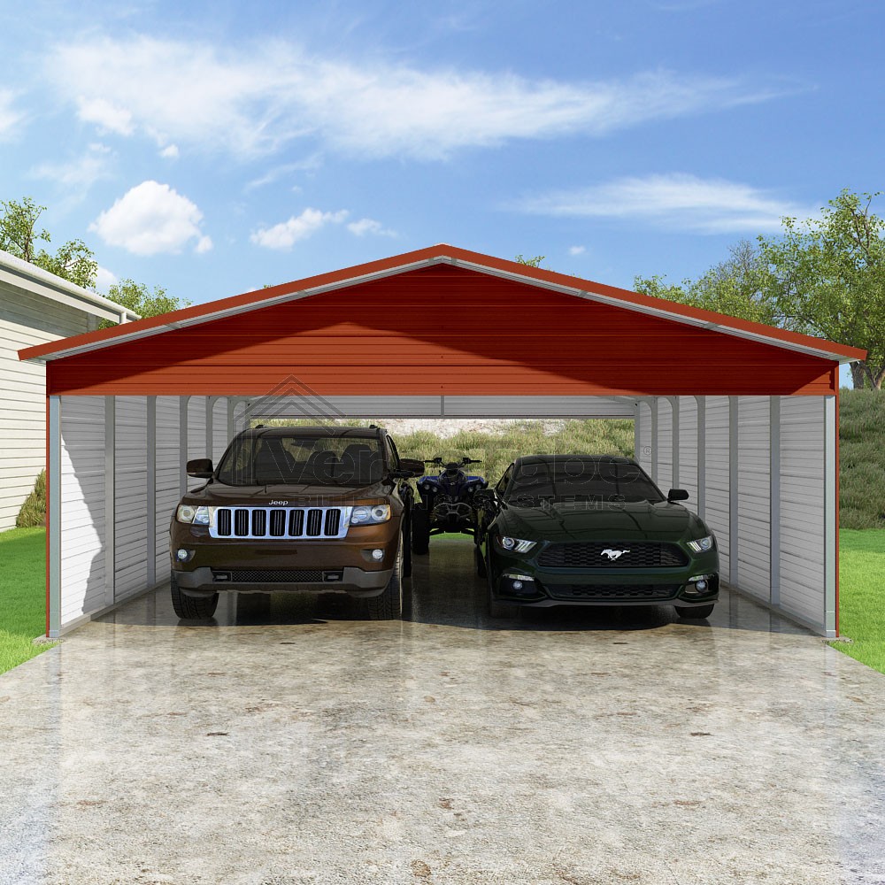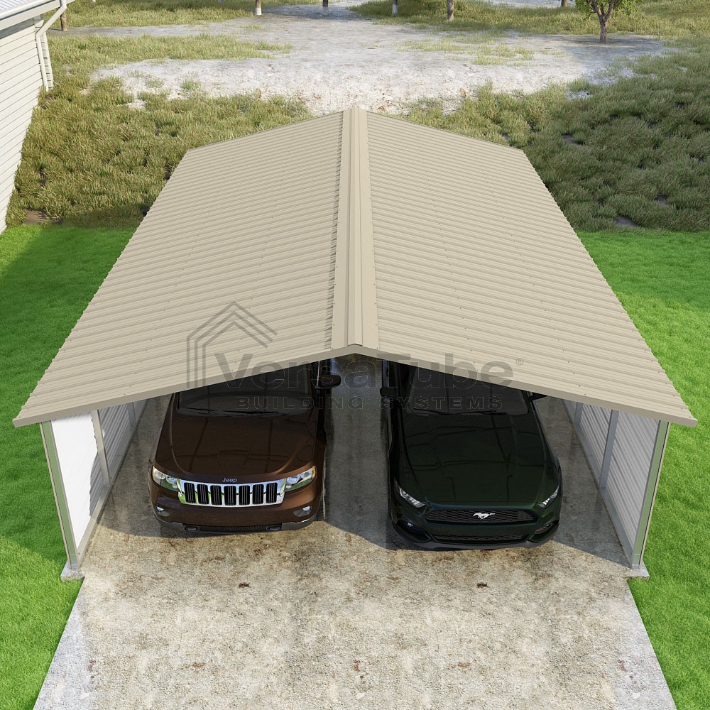 Pinnacle Series DIY carport kit features vertical sheet metal roof panels with ridge cap, gable and eave trim for an A-frame roof style and extended coverage on both ends.