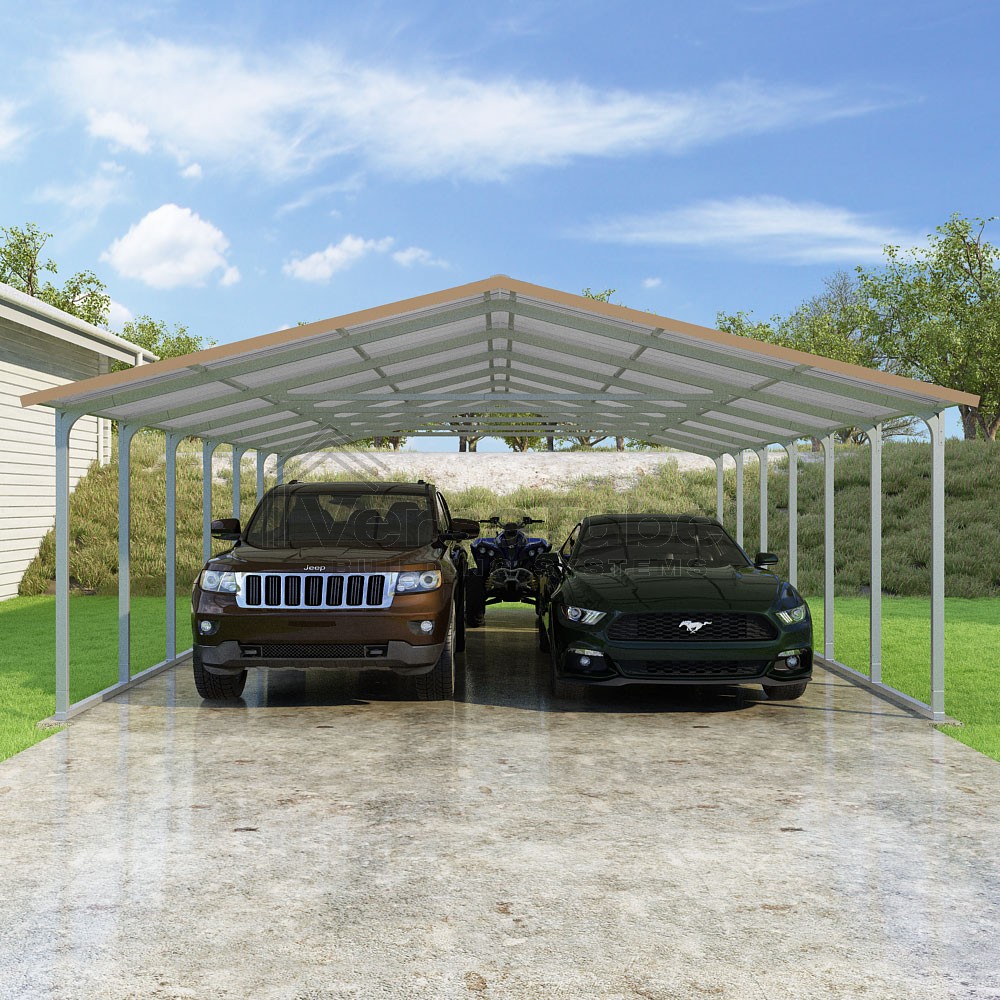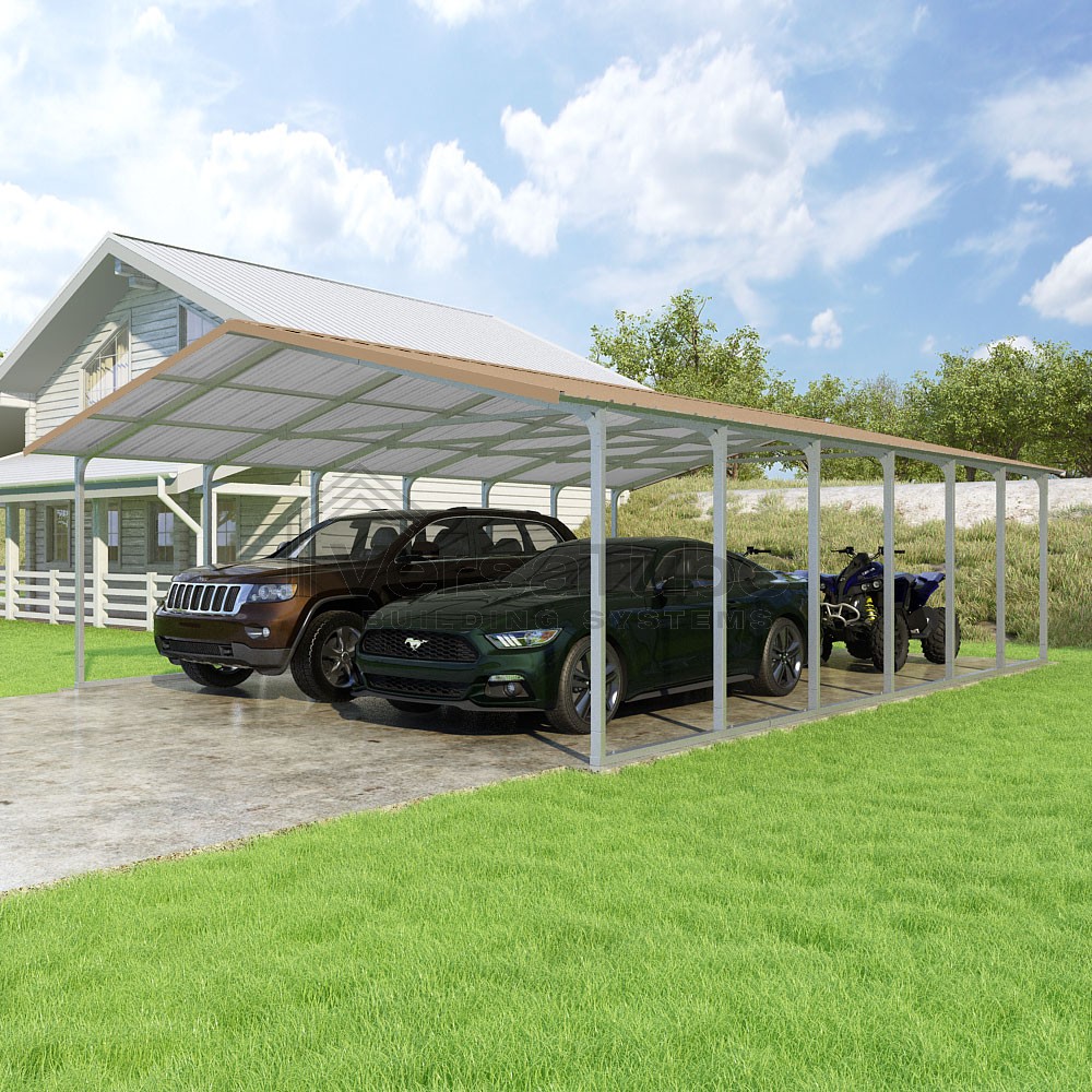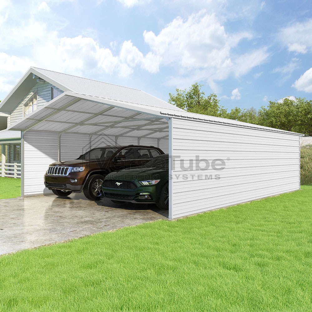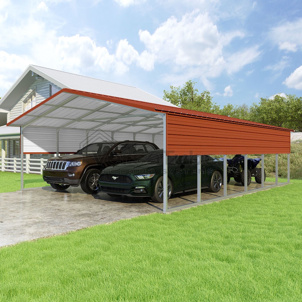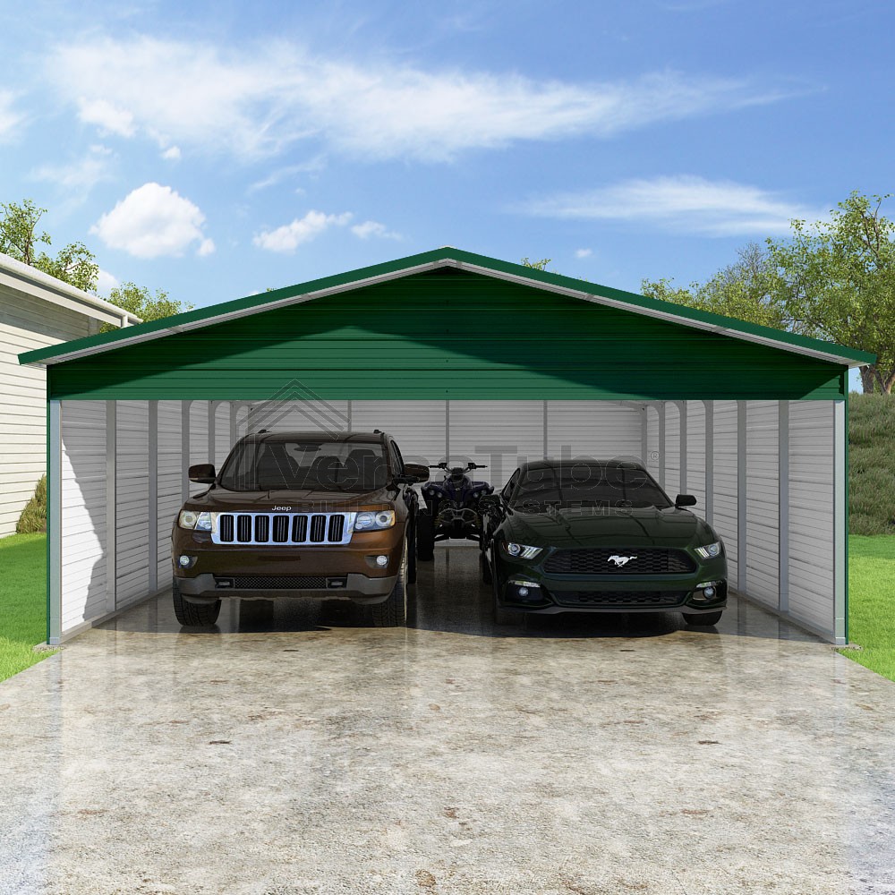 Pinnacle Series DIY carport kit features vertical sheet metal roof panels with ridge cap, gable and eave trim for an A-frame roof style and extended coverage on both ends.